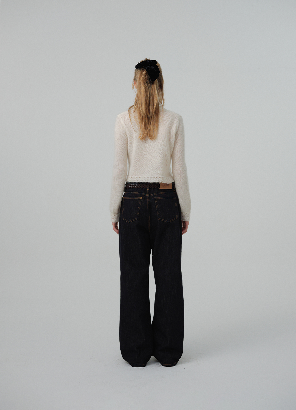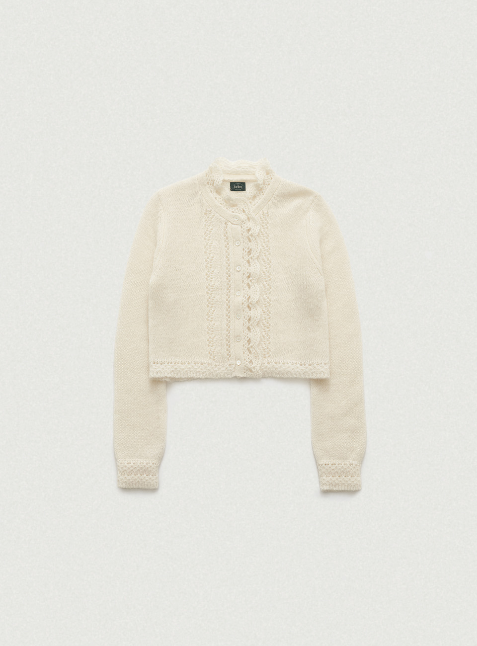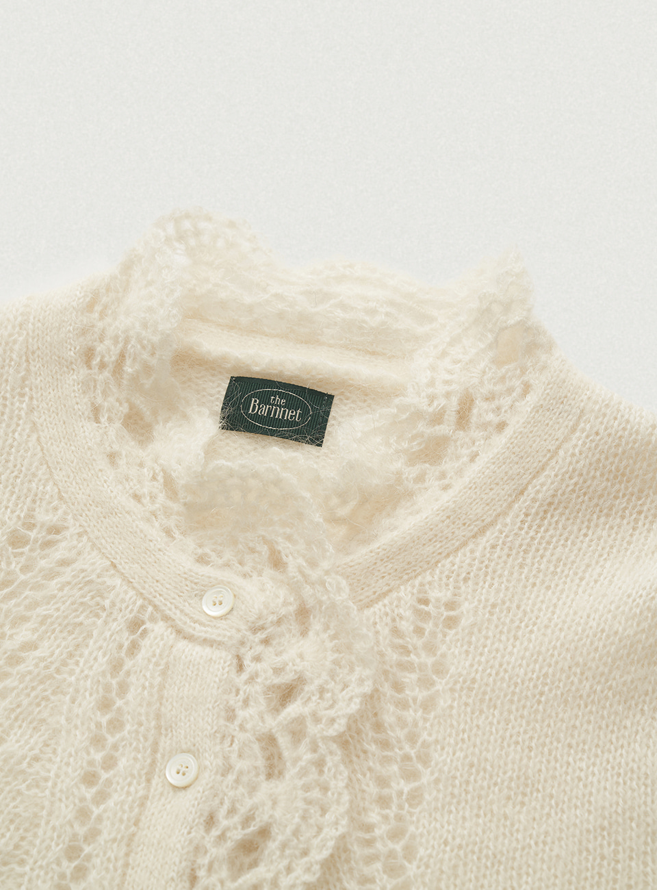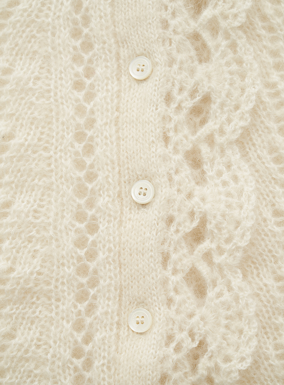 アイボリーカラーの、柔らかなテクスチャーが特徴のモヘアウール混紡ニットファブリックを使用。
