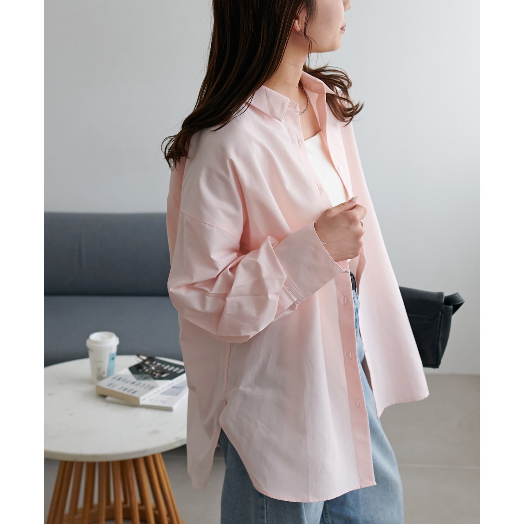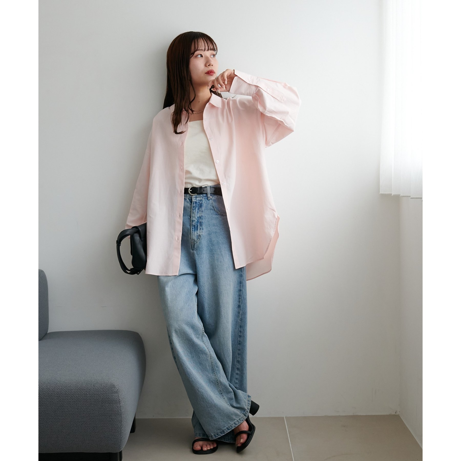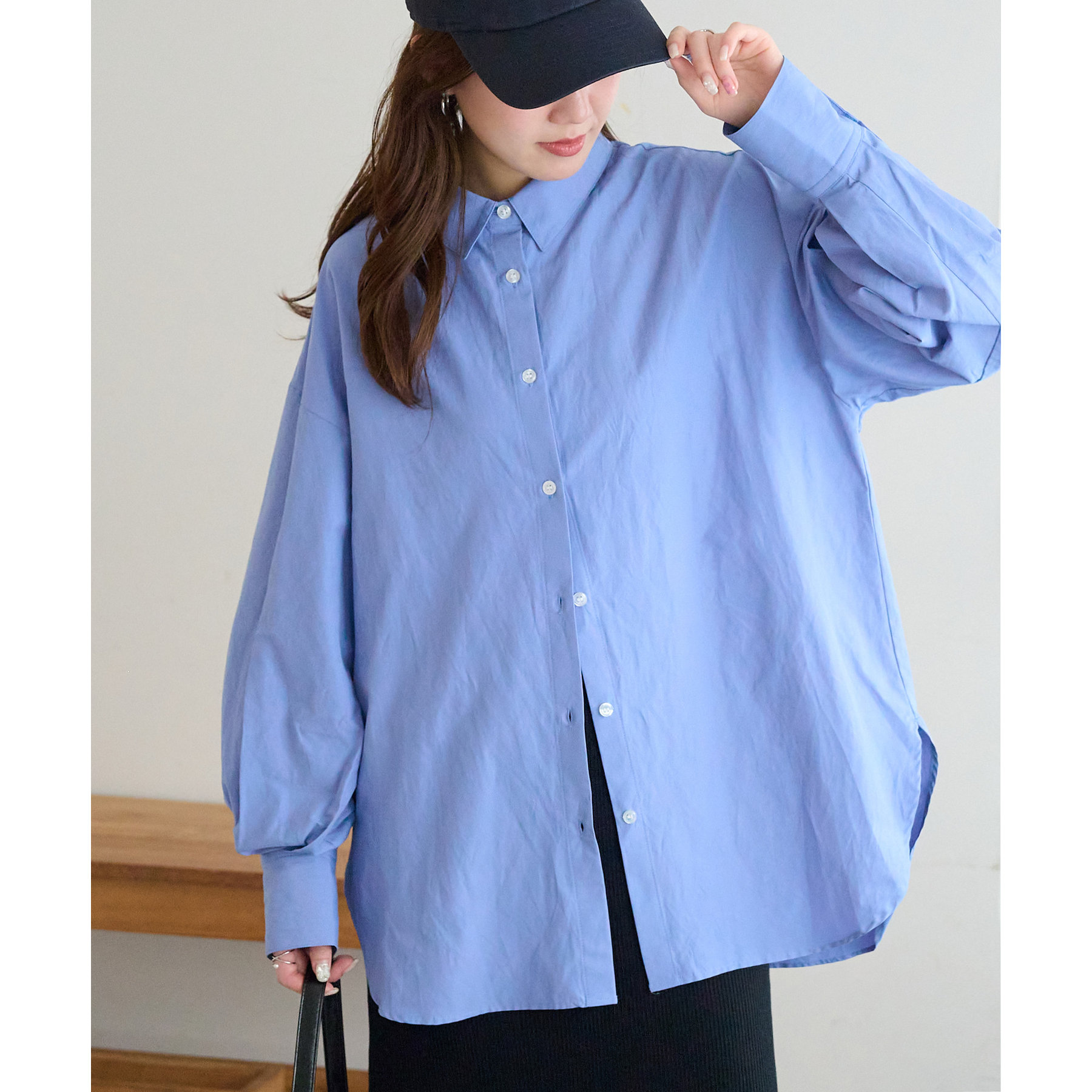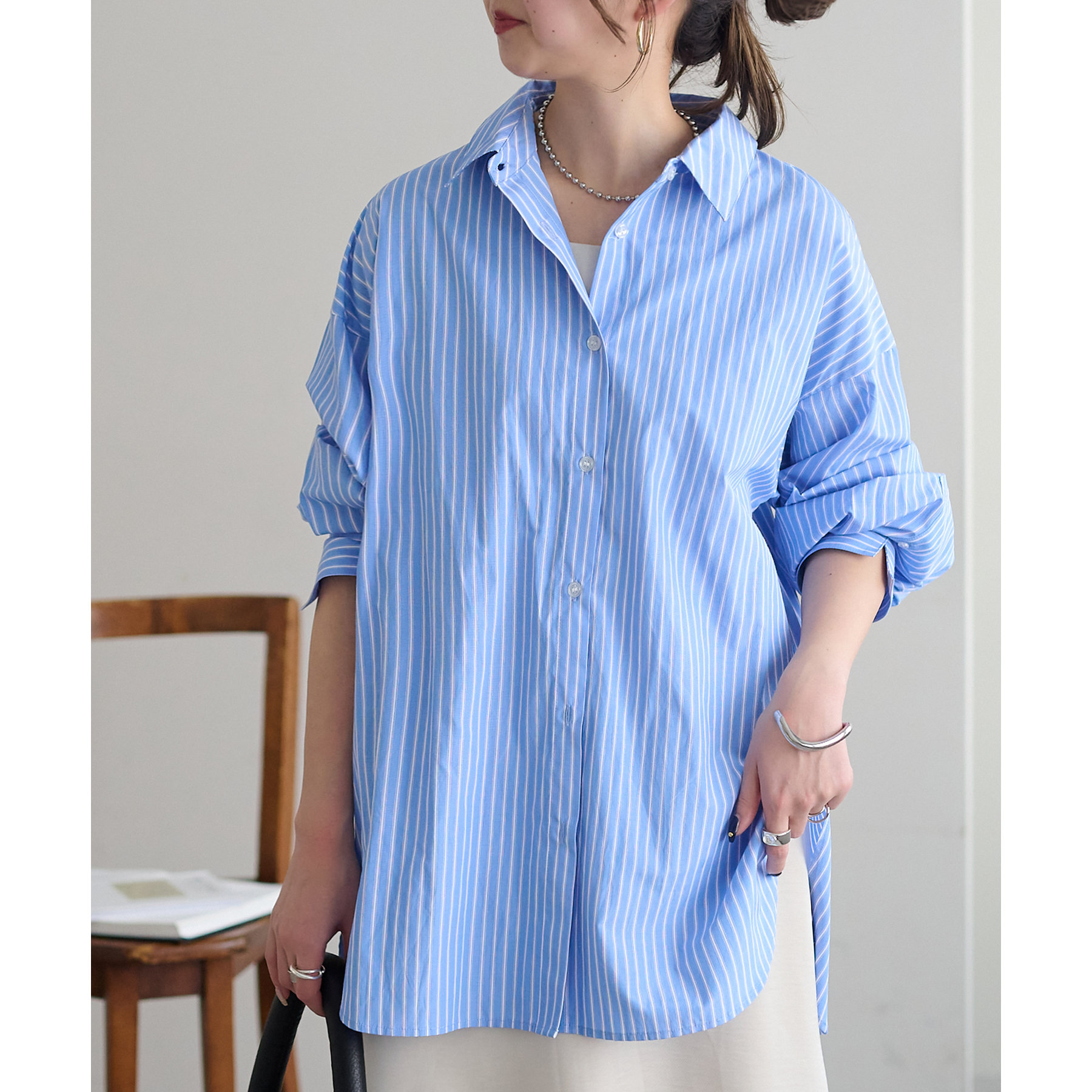 153cmスタッフ:腰回りが隠れる着丈です。低身長の方は袖口をロールアップしたり、首元のボタンを開けたりすると抜け感が出てこなれ感を楽しめます♪