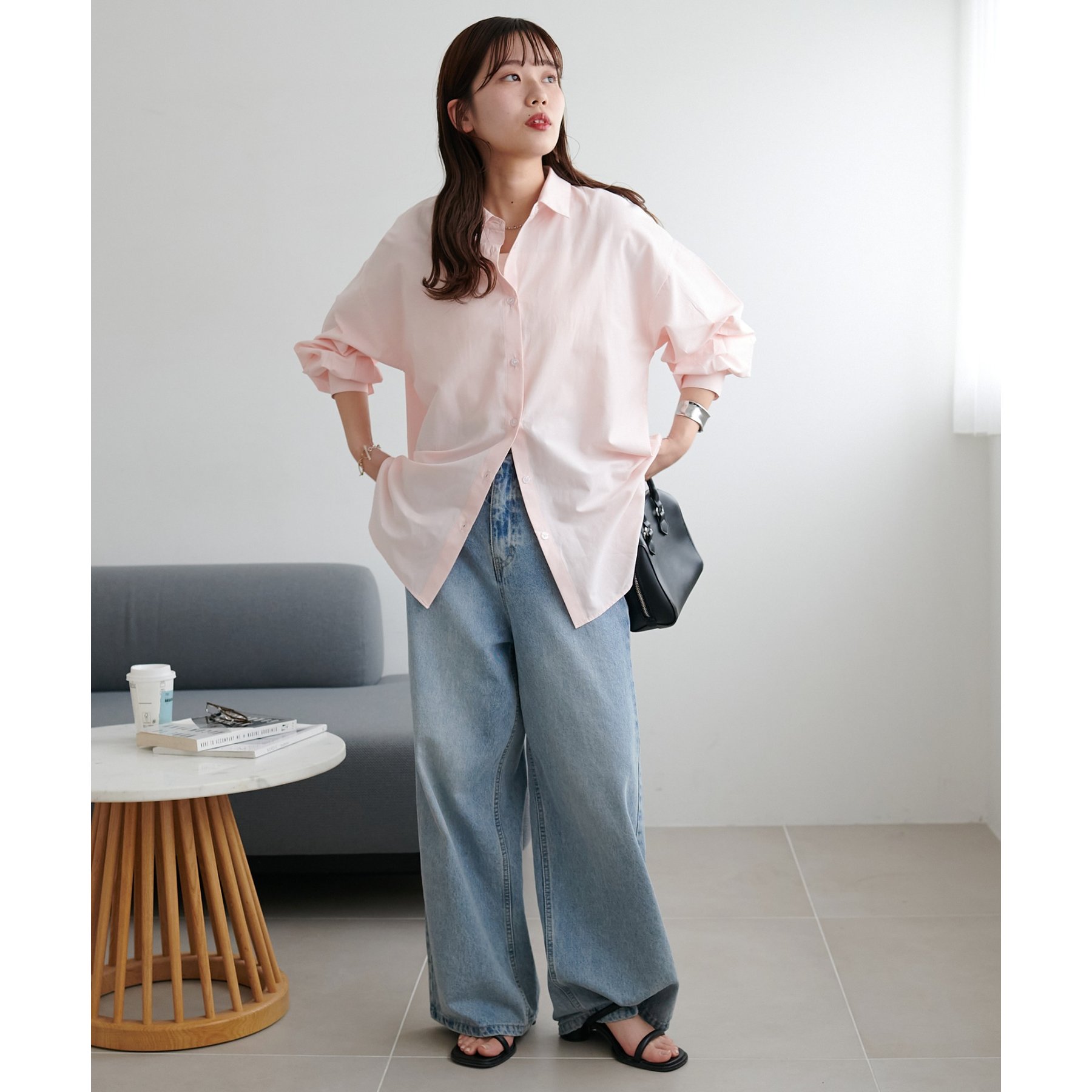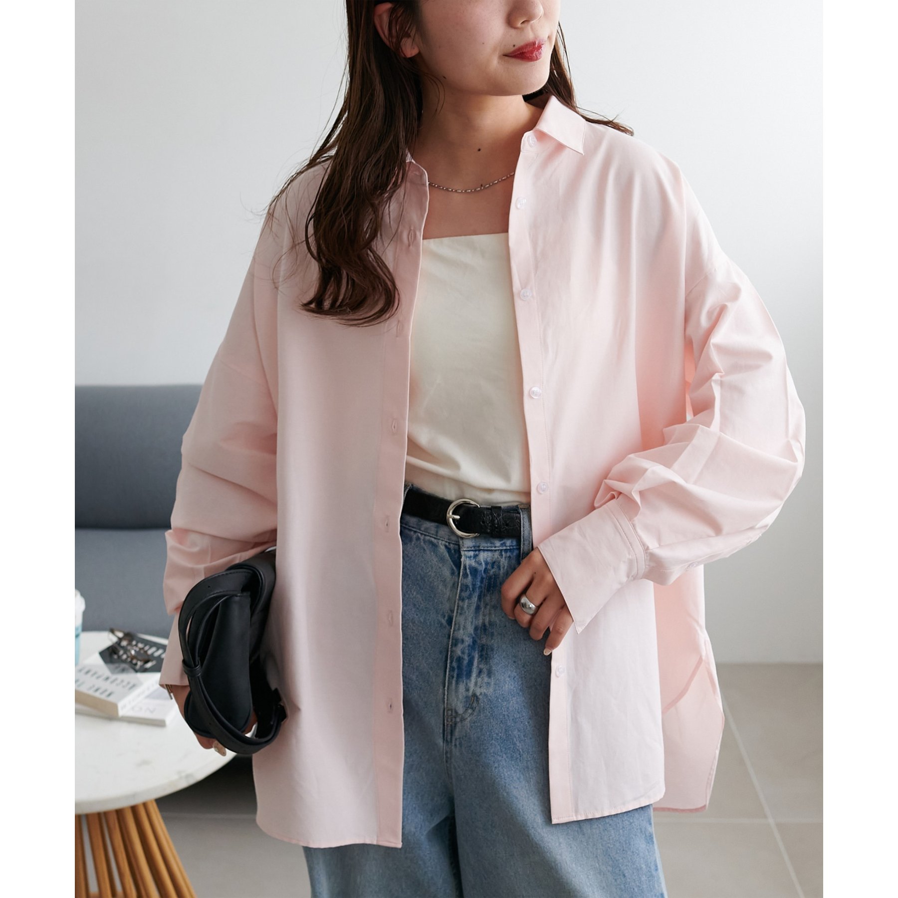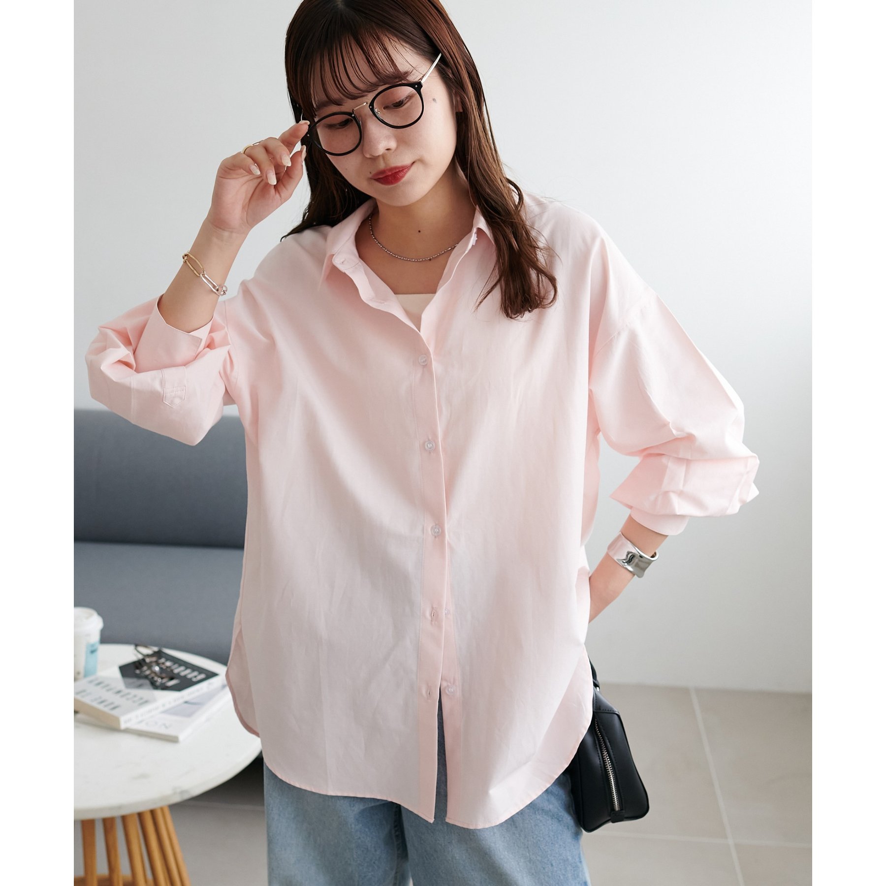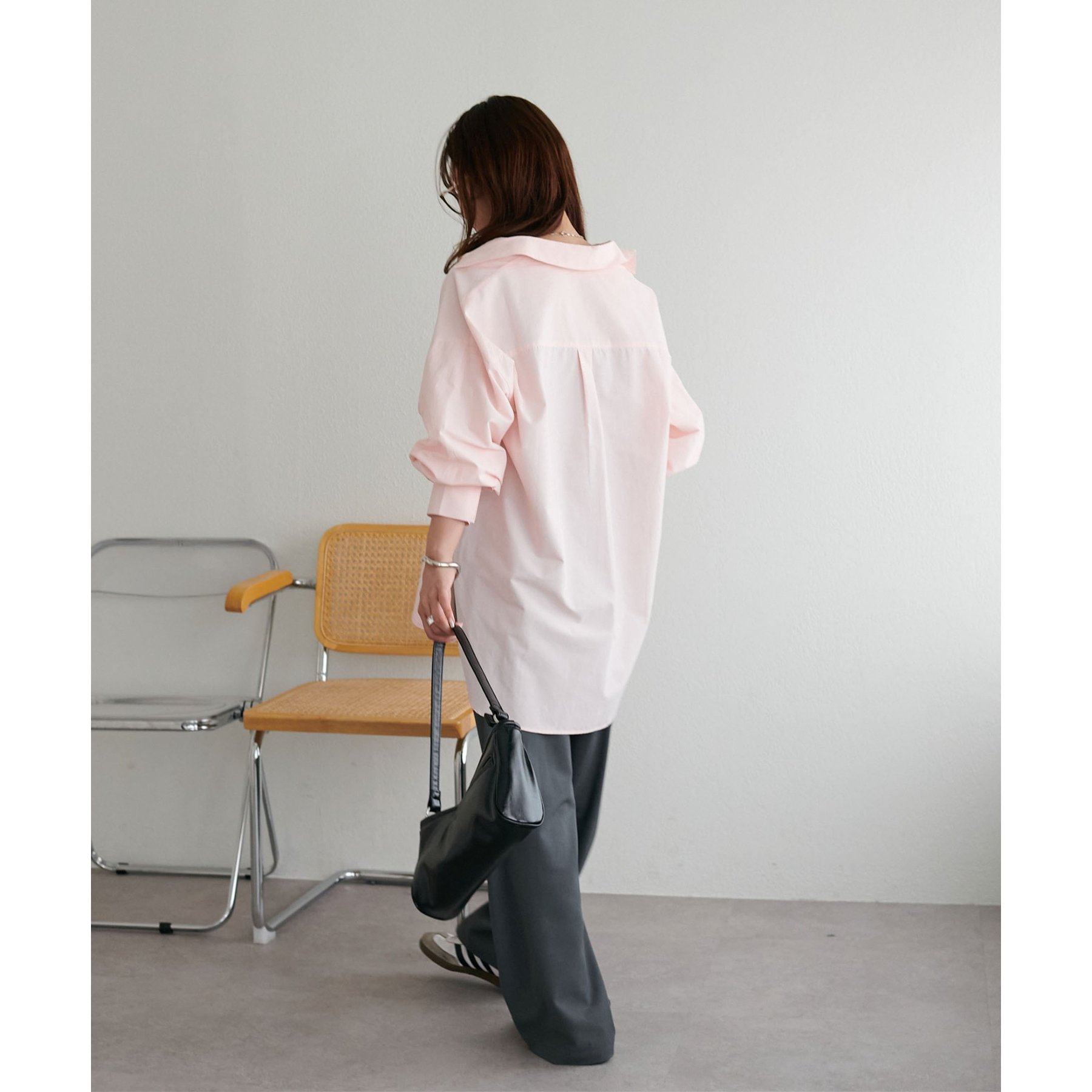 153cmスタッフ:腰回りが隠れる着丈です。低身長の方は袖口をロールアップしたり、首元のボタンを開けたりすると抜け感が出てこなれ感を楽しめます♪