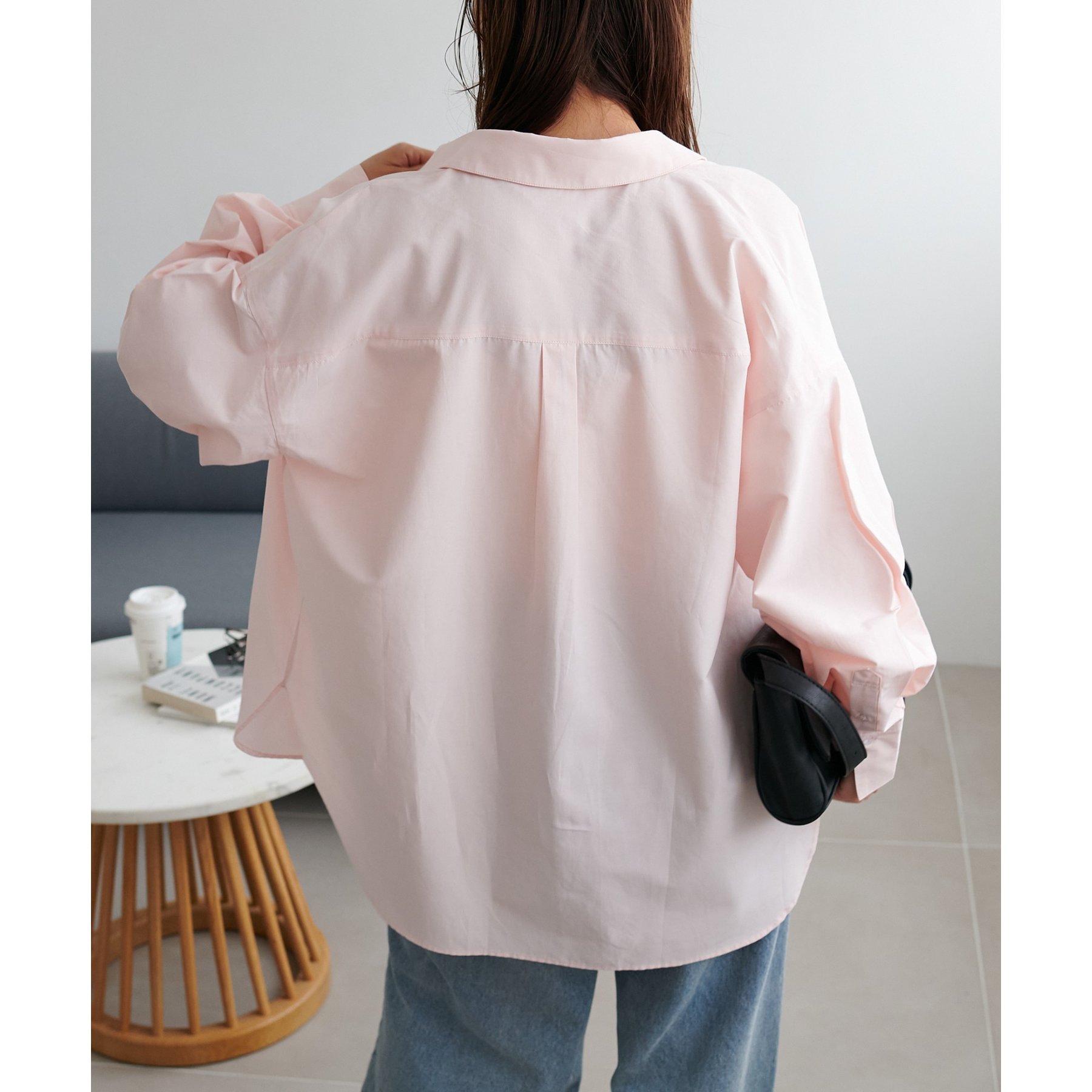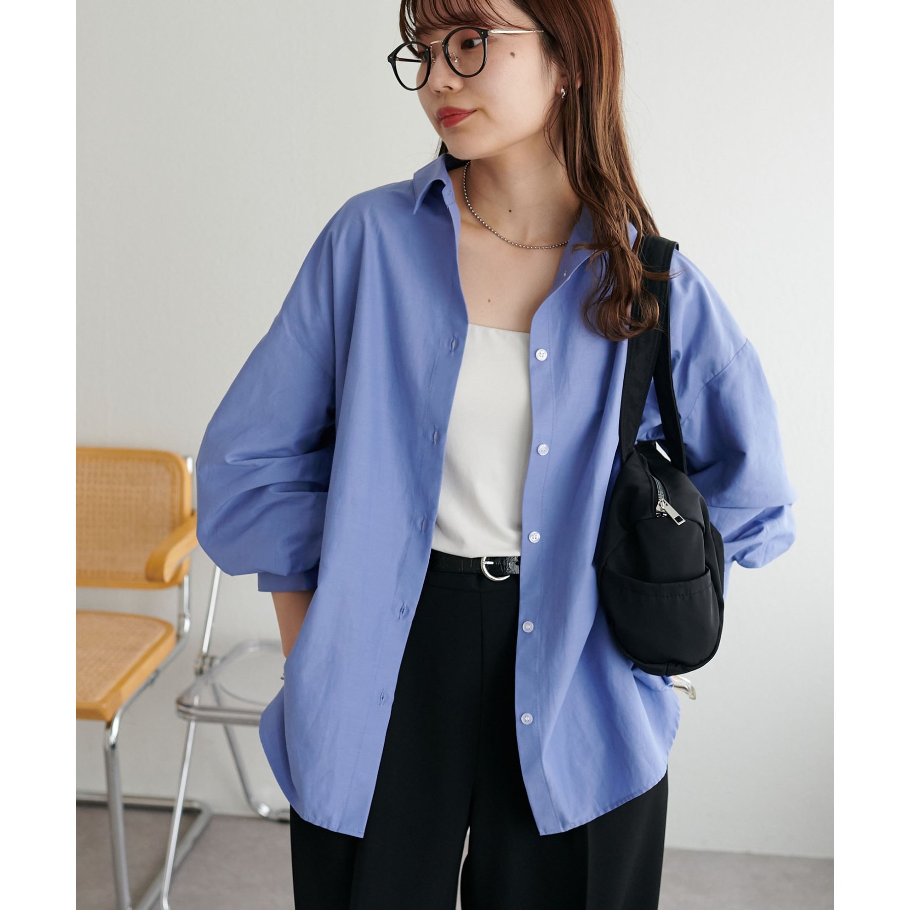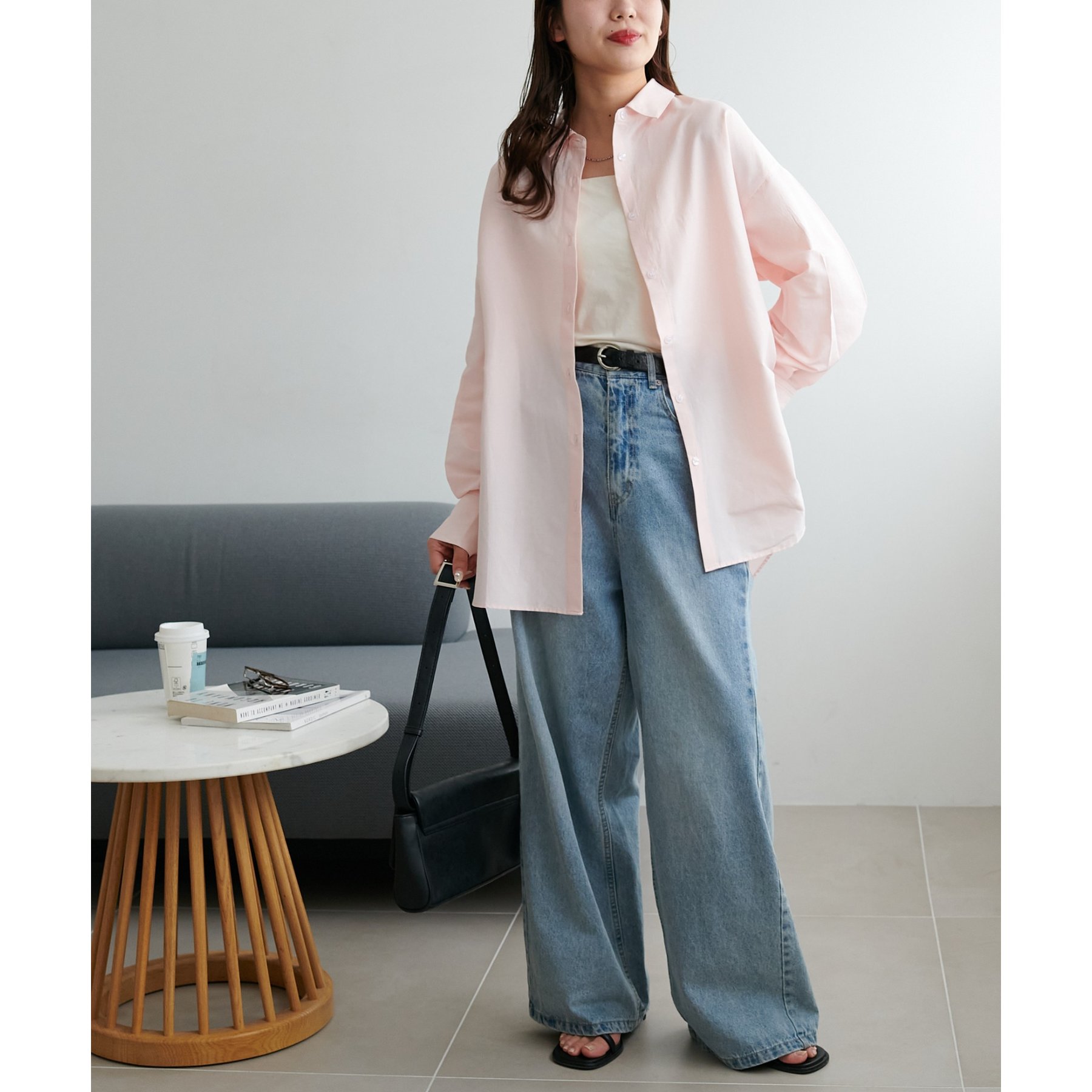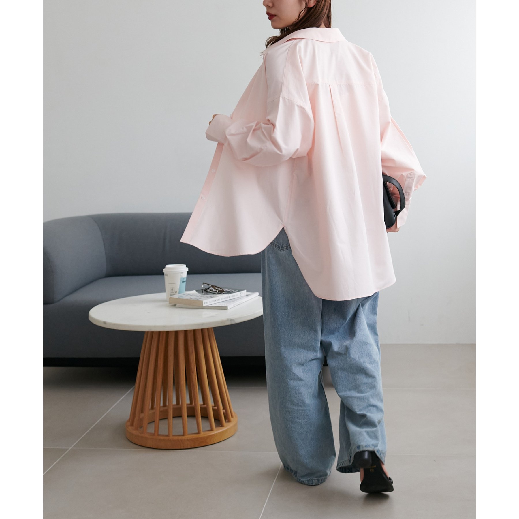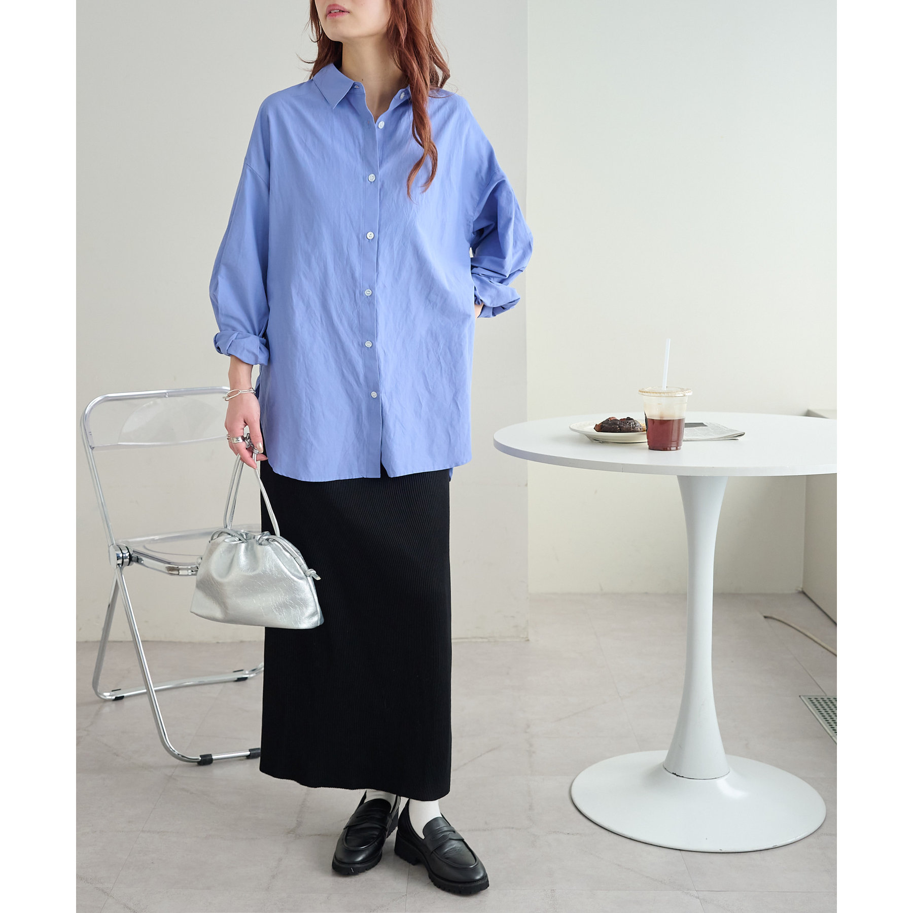 153cmスタッフ:腰回りが隠れる着丈です。低身長の方は袖口をロールアップしたり、首元のボタンを開けたりすると抜け感が出てこなれ感を楽しめます♪