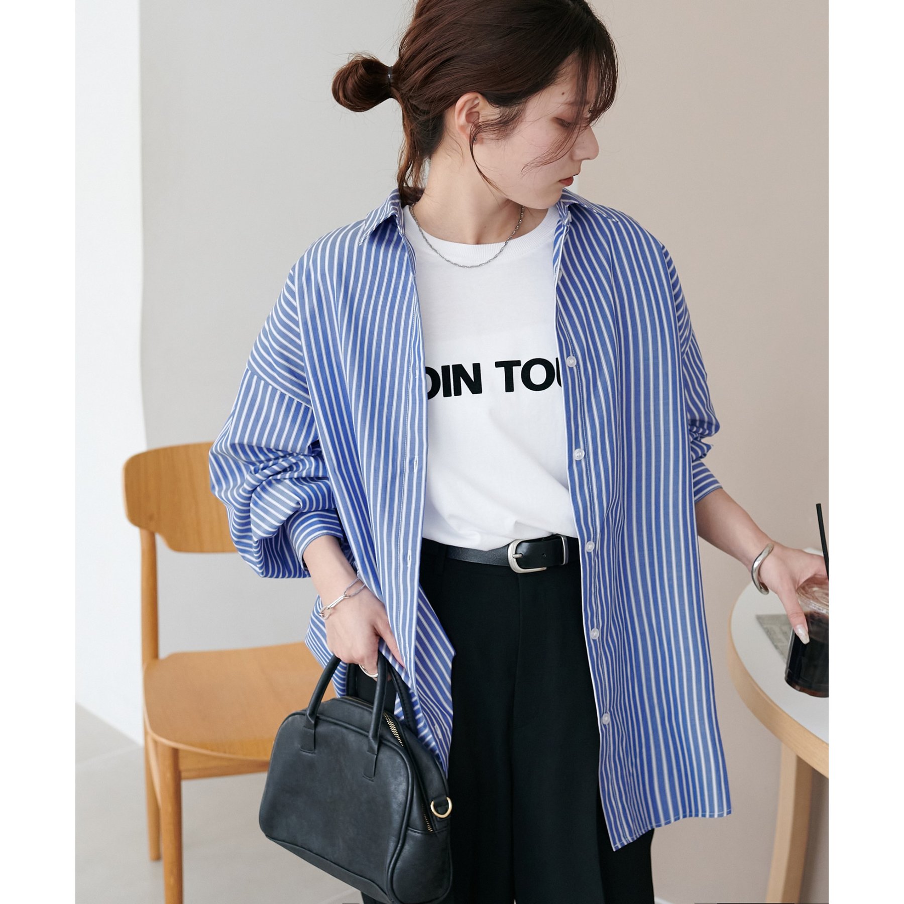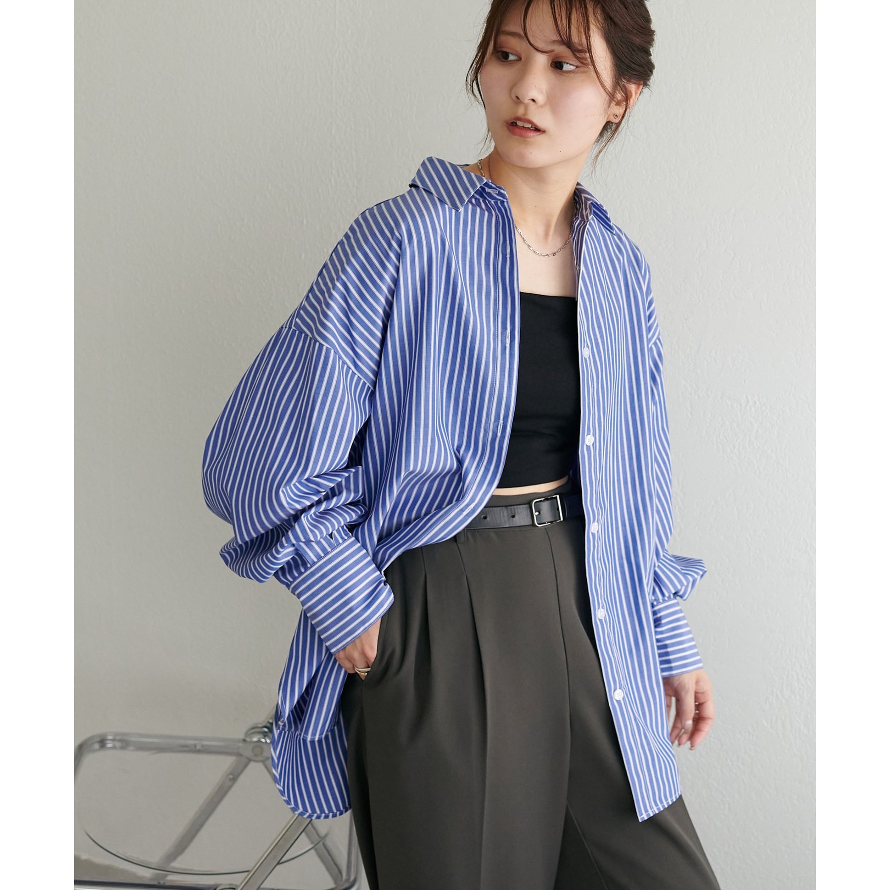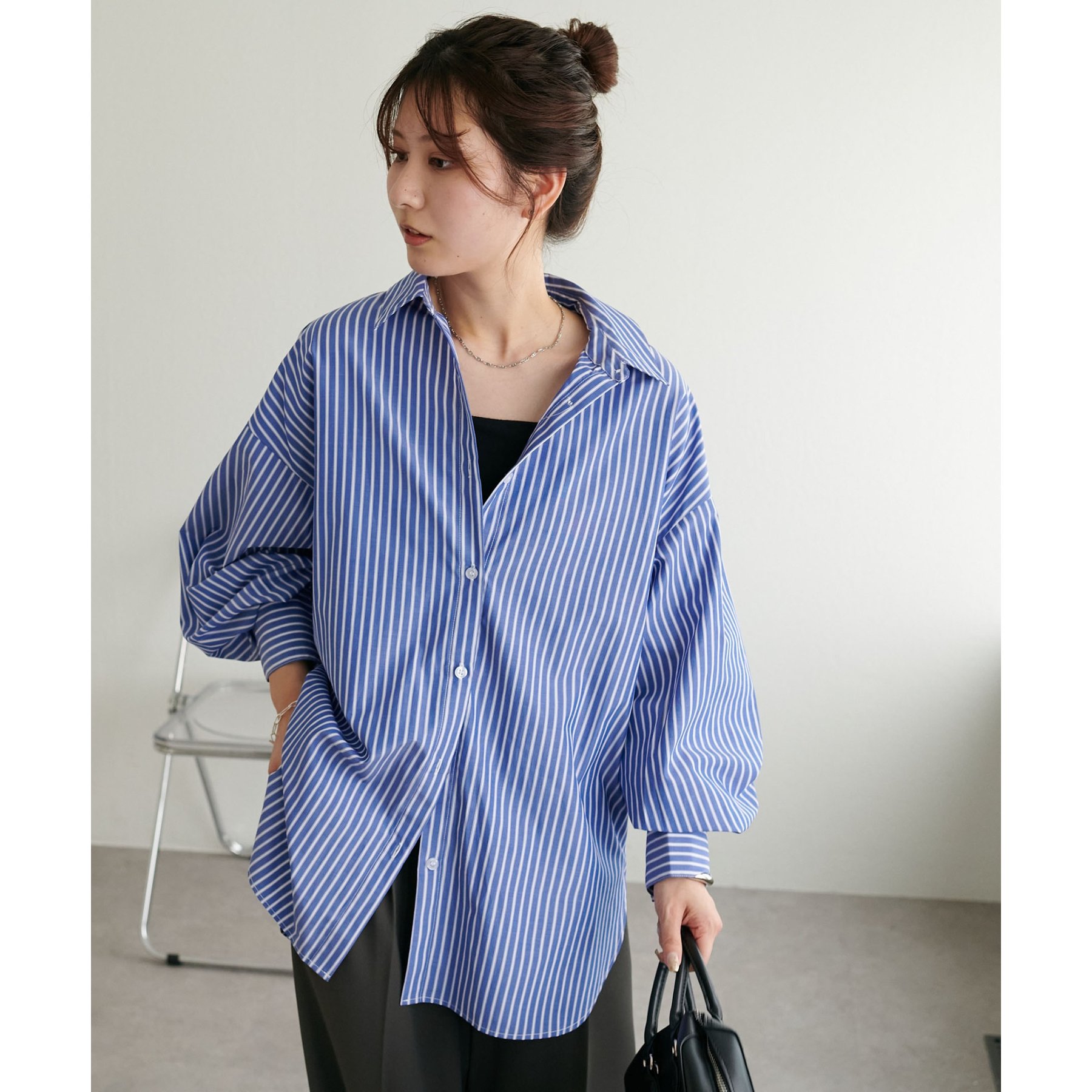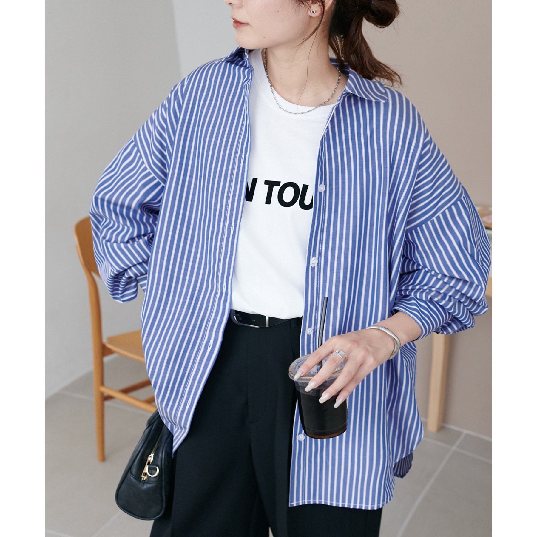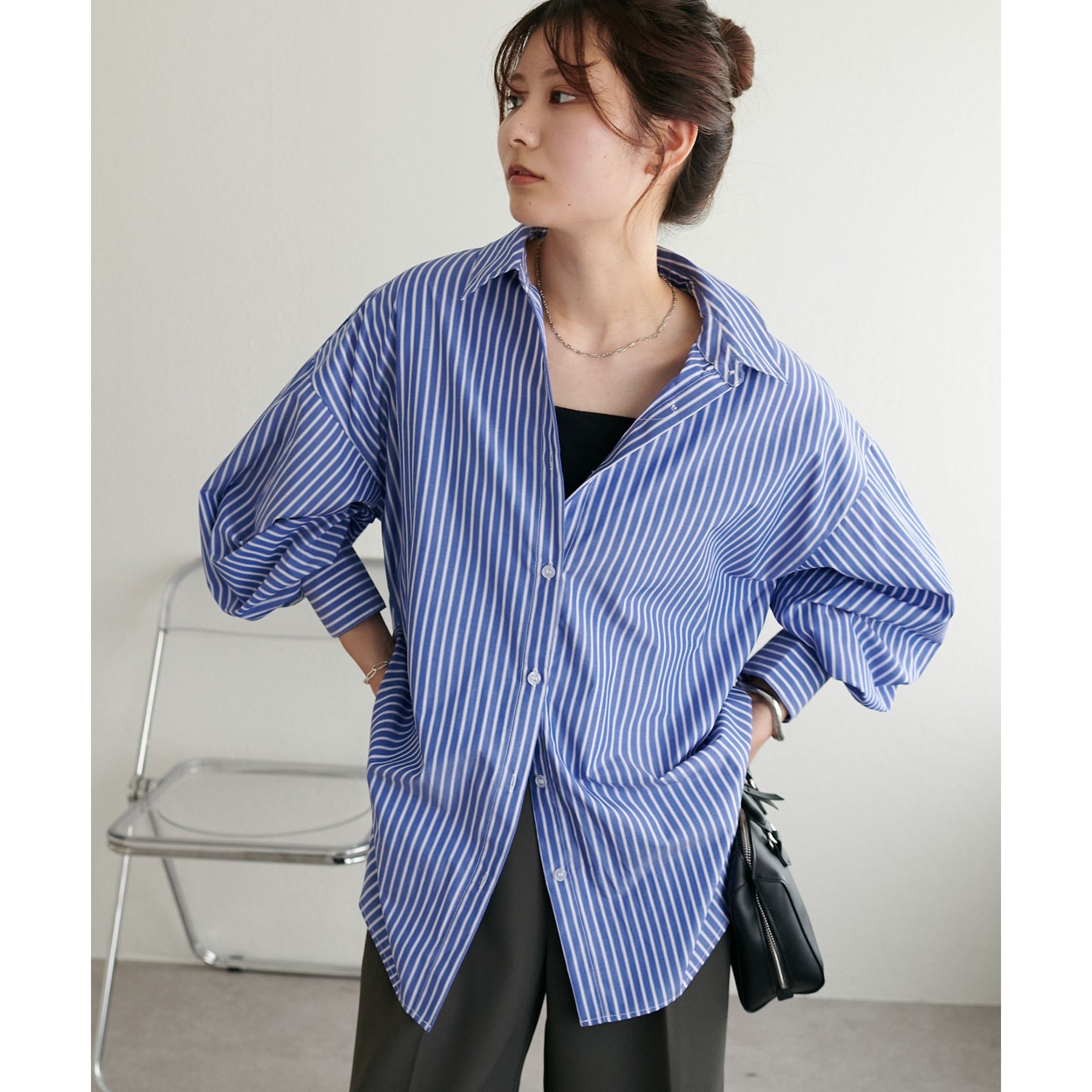 158cmスタッフ:ブルーシャツ、ストライプシャツは毎年人気なので一枚あるとトレンド問わず楽しめます◎