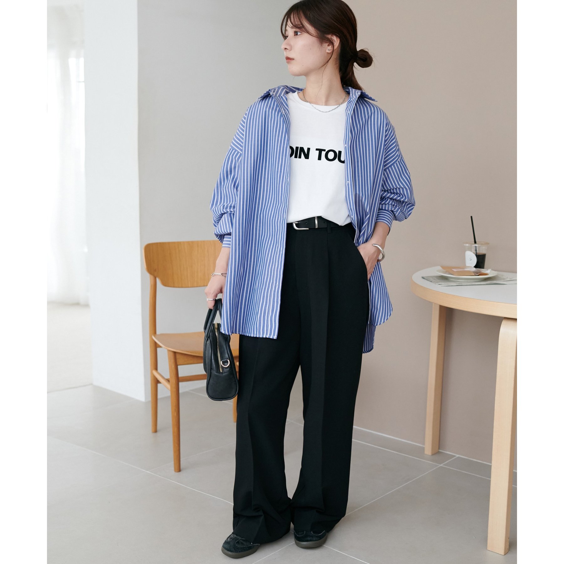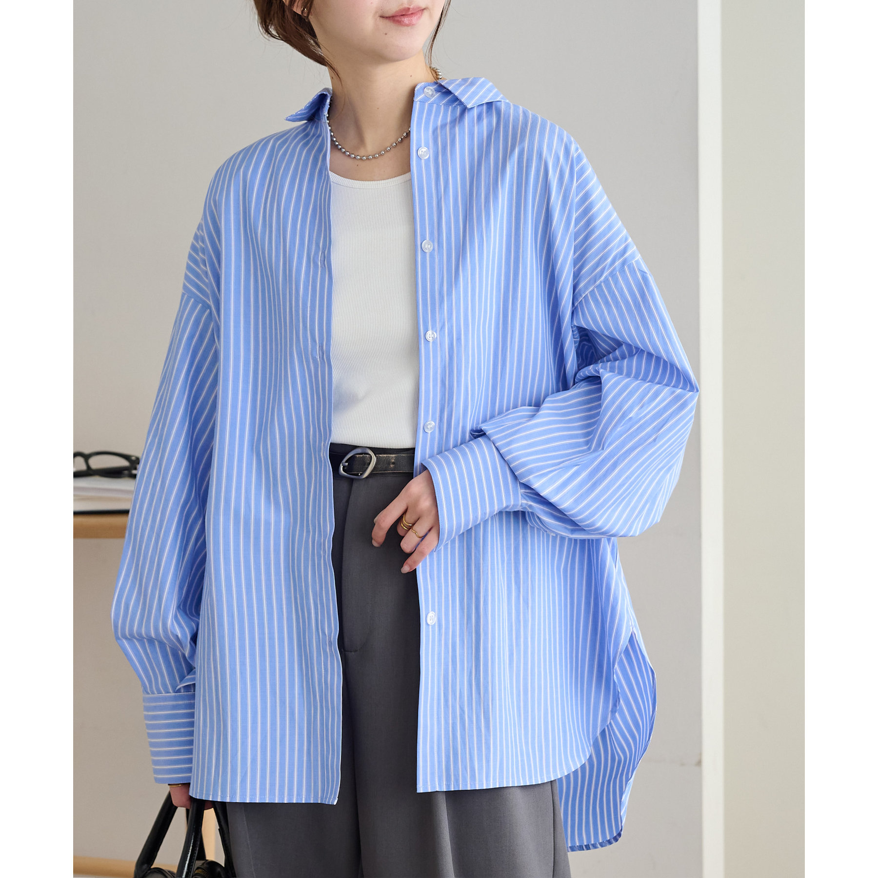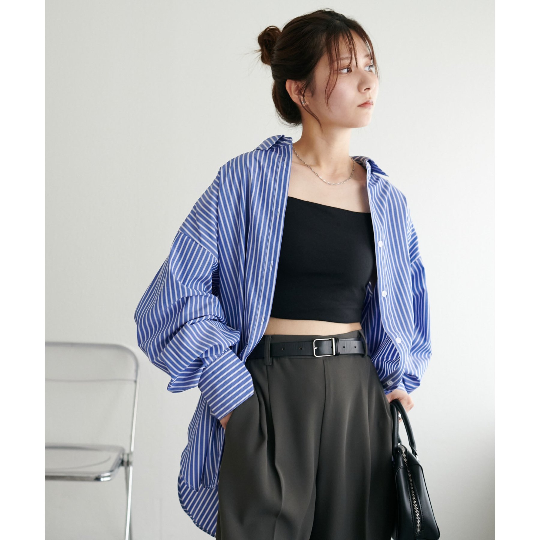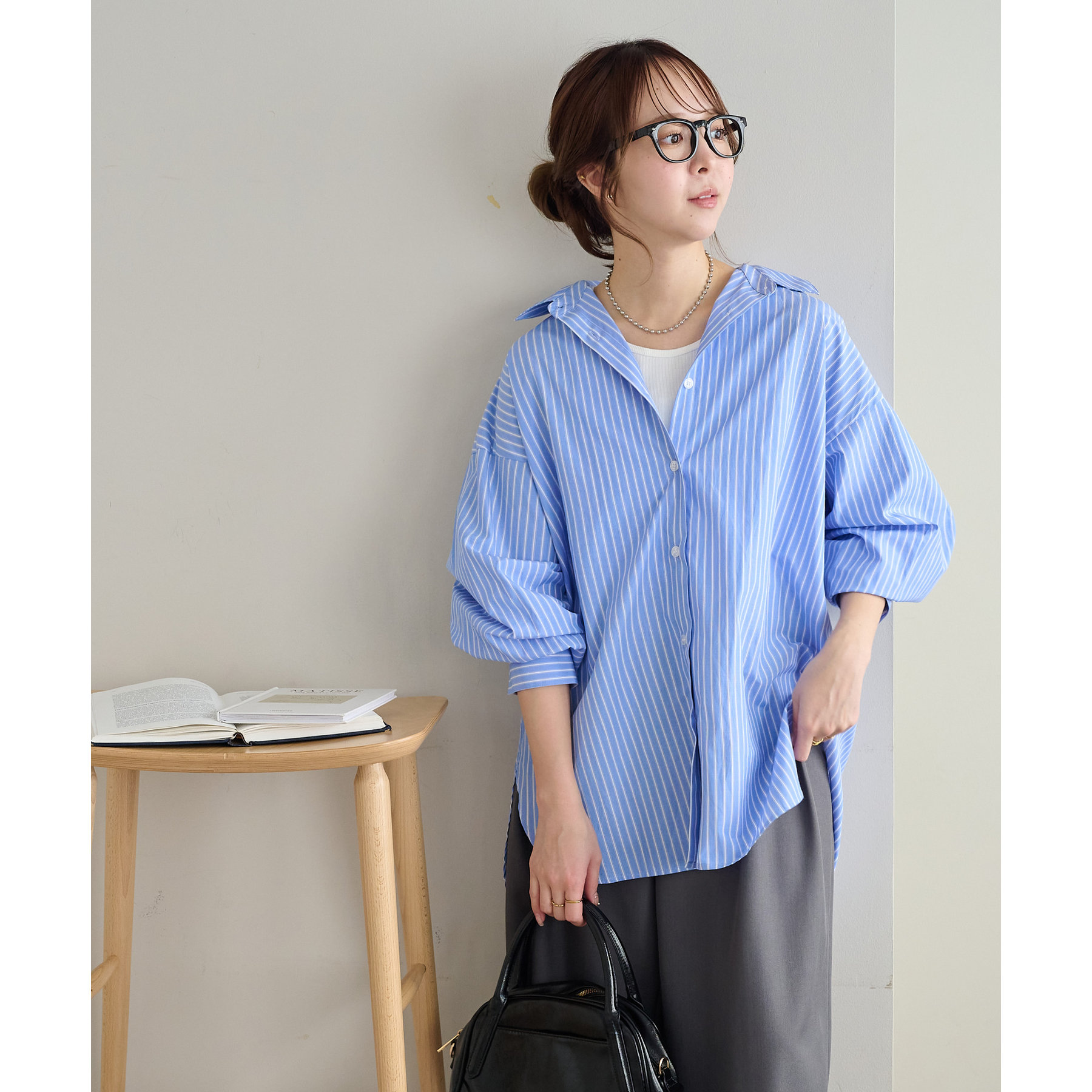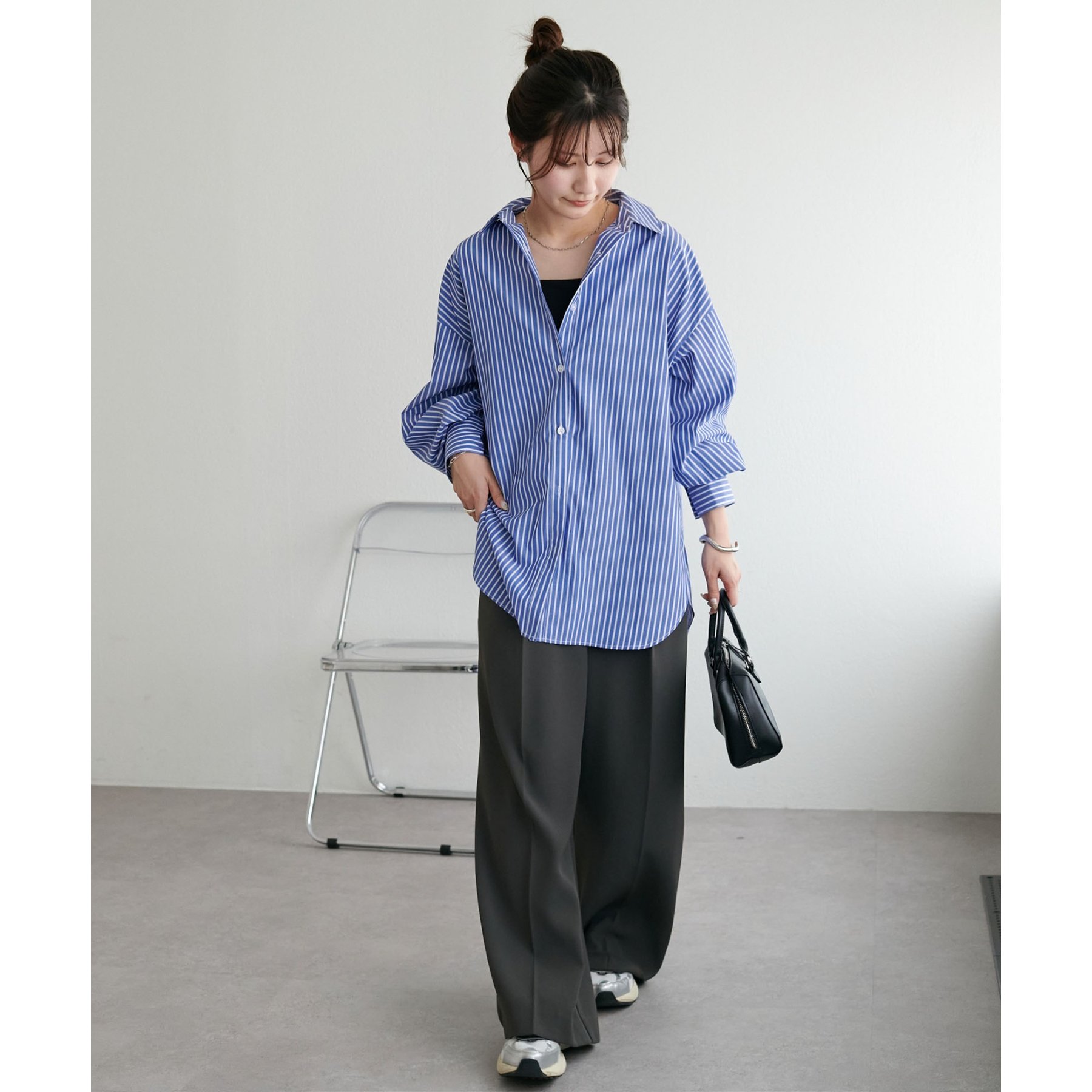 158cmスタッフ:ブルーシャツ、ストライプシャツは毎年人気なので一枚あるとトレンド問わず楽しめます◎