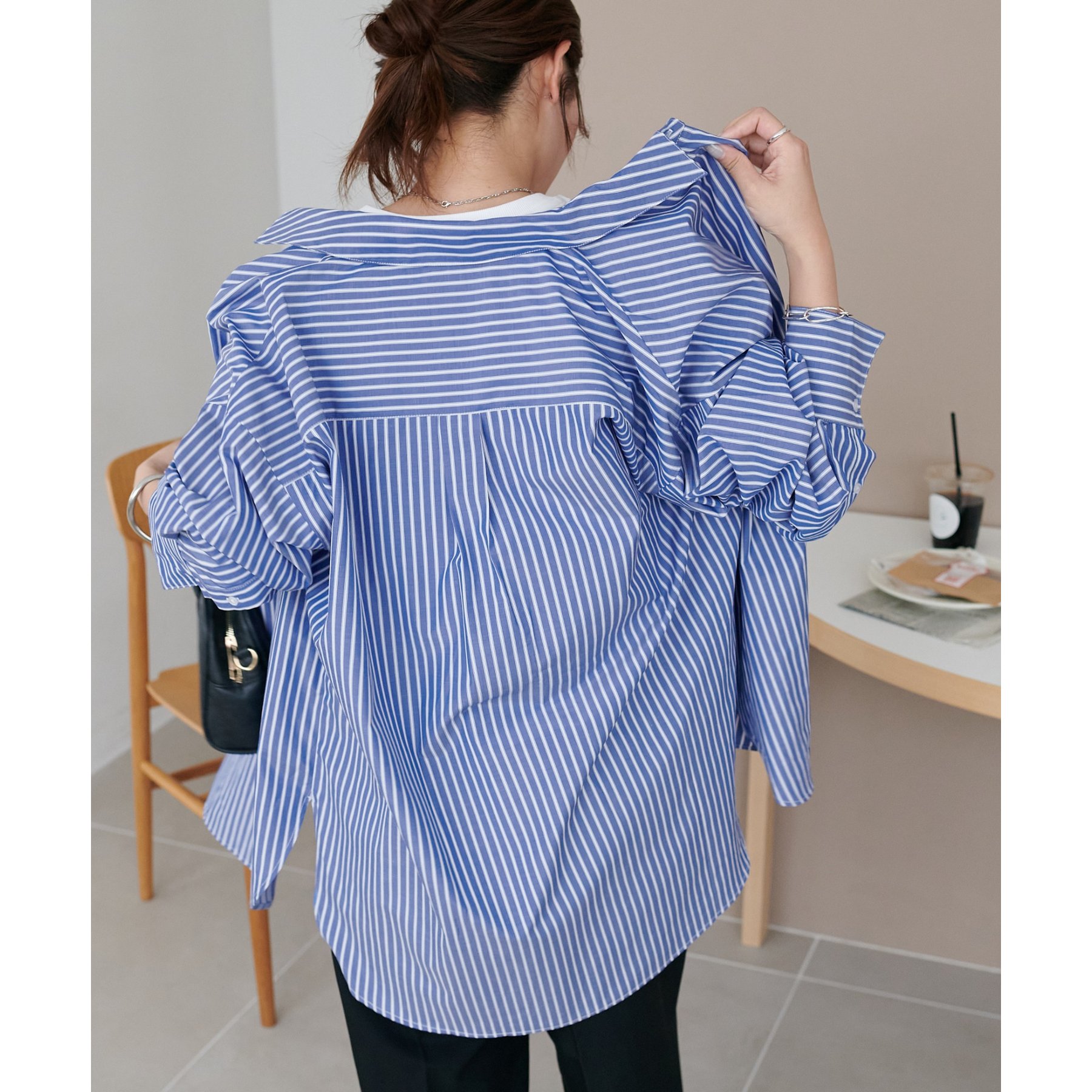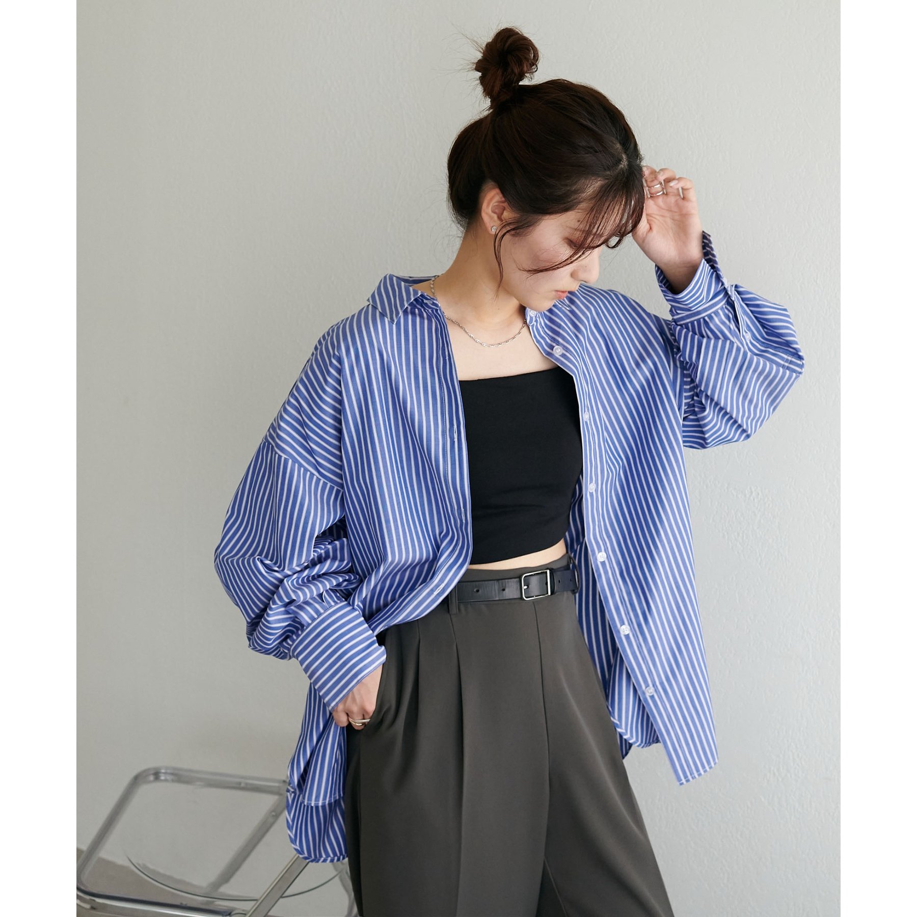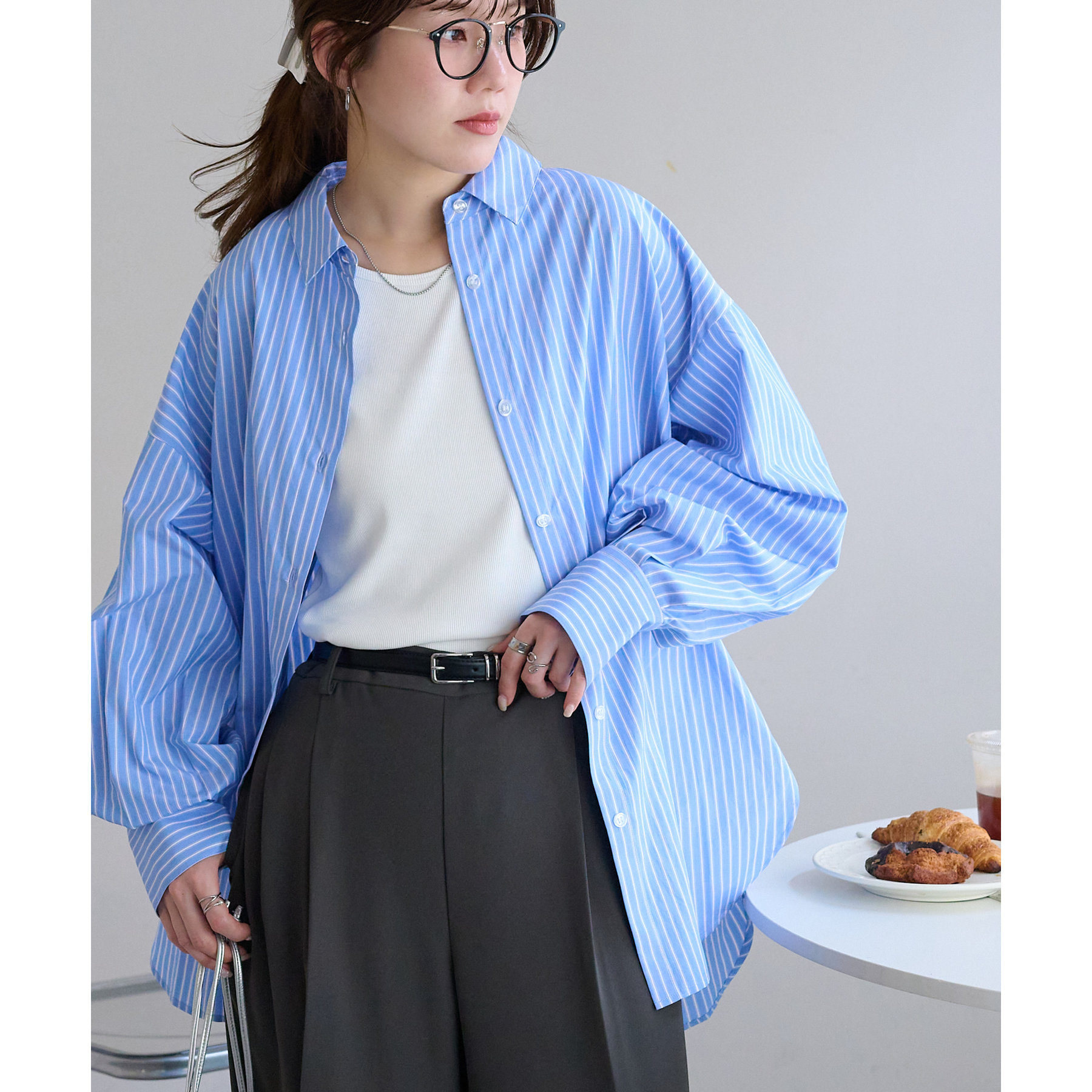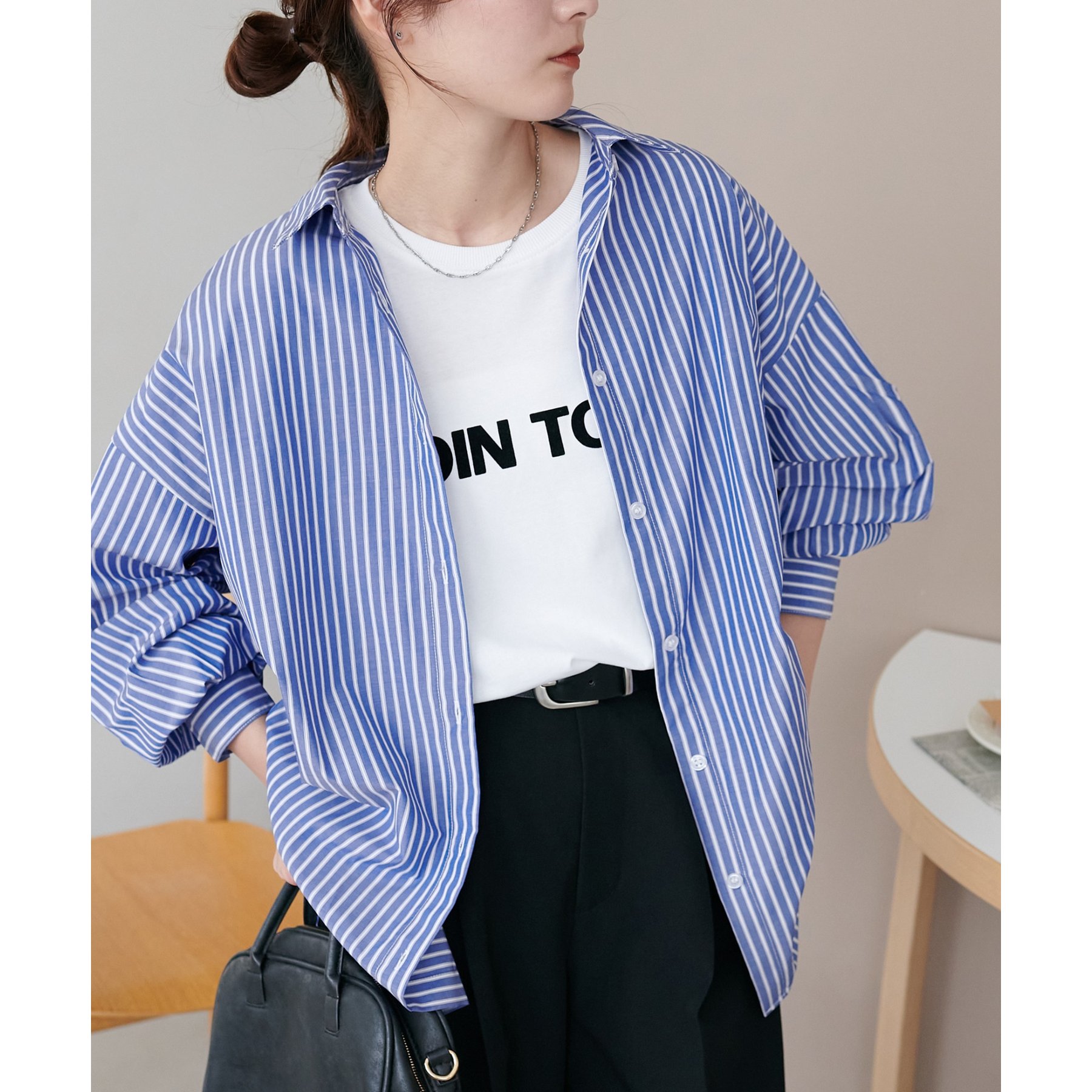 158cmスタッフ:ブルーシャツ、ストライプシャツは毎年人気なので一枚あるとトレンド問わず楽しめます◎