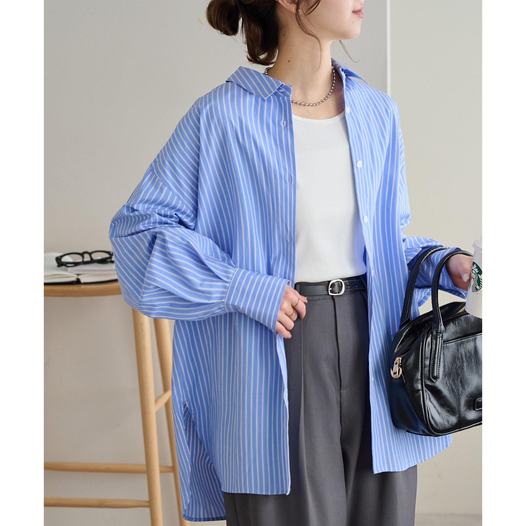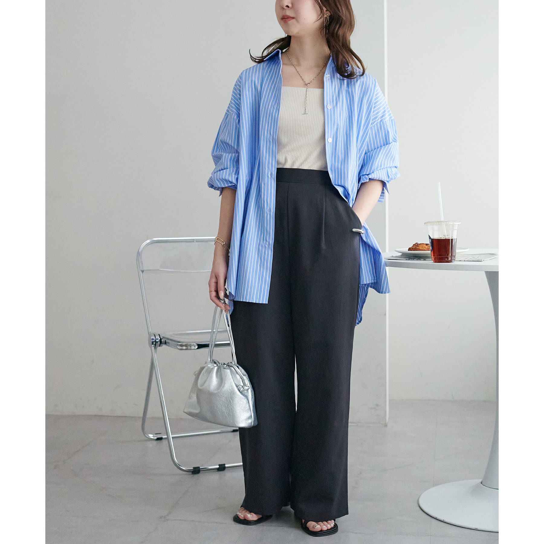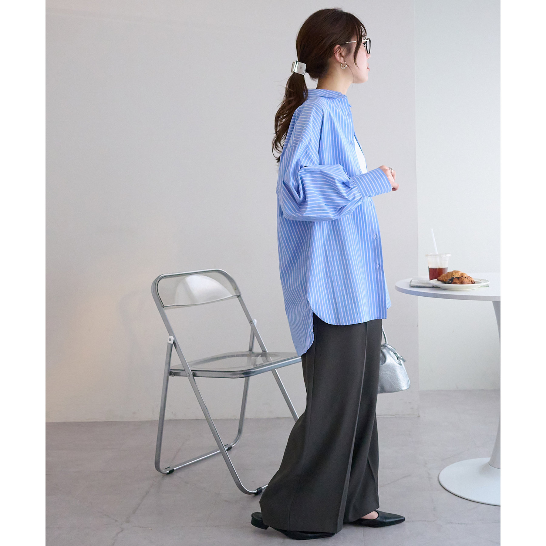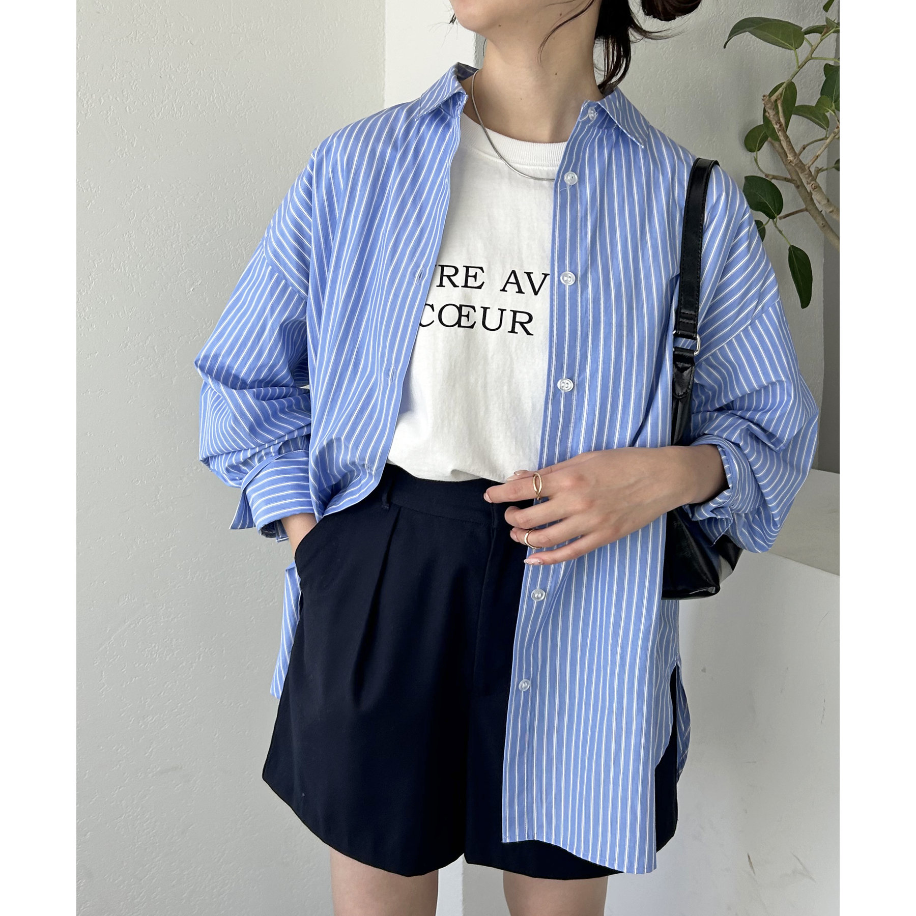 158cmスタッフ:ブルーシャツ、ストライプシャツは毎年人気なので一枚あるとトレンド問わず楽しめます◎