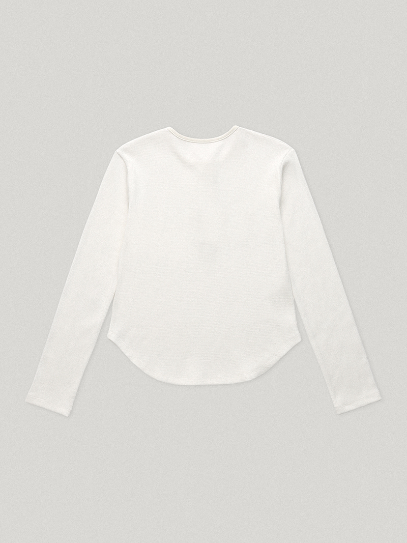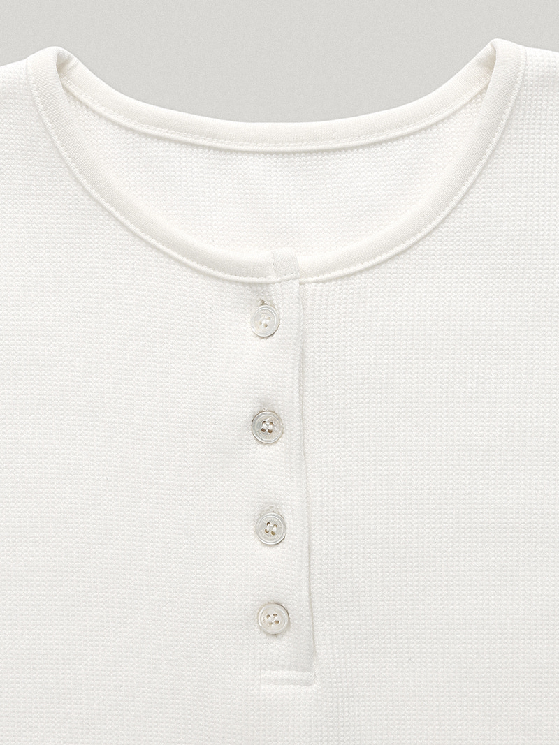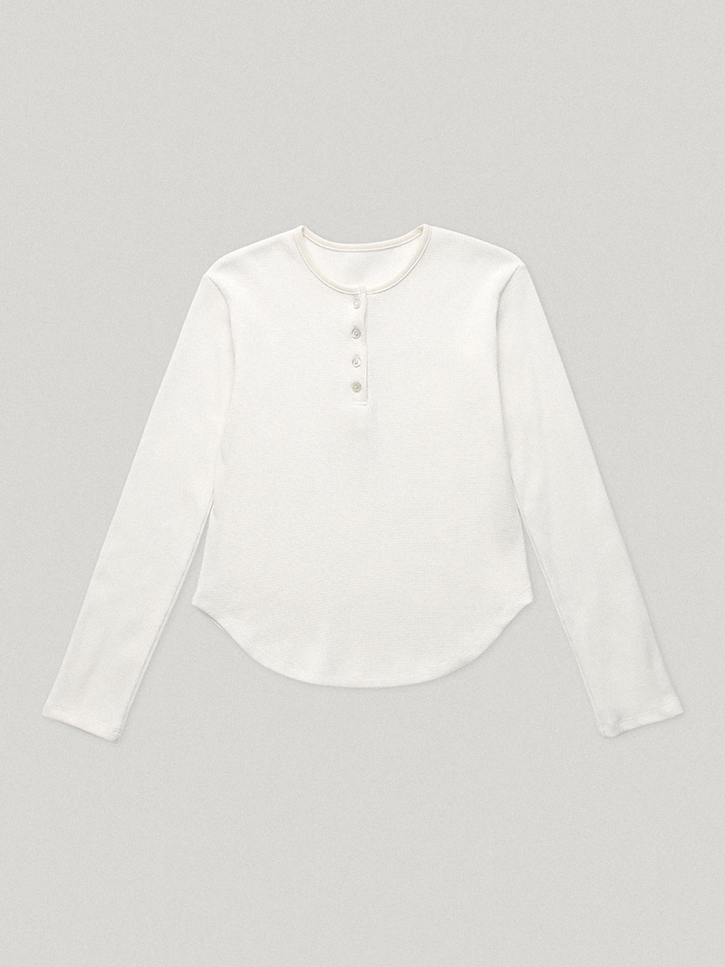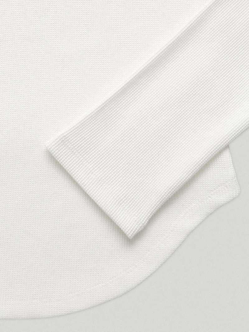 ミニマルでシンプルなムードのレンワッフルTシャツこれはモダンなヘンリーネックラインのTシャツデザイン。密度の高いワッフルテクスチャー生地がそれにマッチするスタイリッシュなアイテムです。コットン、ポリエステル、スパンデックスは綿、ポリエステル、スパンデックスのブレンドで、ワッフルのテクスチャーが自然にシルエットを保っています。控えめなレギュラーフィットでシンプルな服装スムームムードロゴのボタンがネックラインに付けられ、裾は自然に合う丸い形でデザインされています。様々なボトムトと自然に合うように、単独でも重ね着もでき、スムームードの冬アイテムすべてにスタイルのセンスを合わせています。柔らかくシンプルなアイボリーカラー、コットン75%ポリエステル、20%スパンデックス、5%ワッフルネックデザインラウンドヘム、スムームードロゴボタン