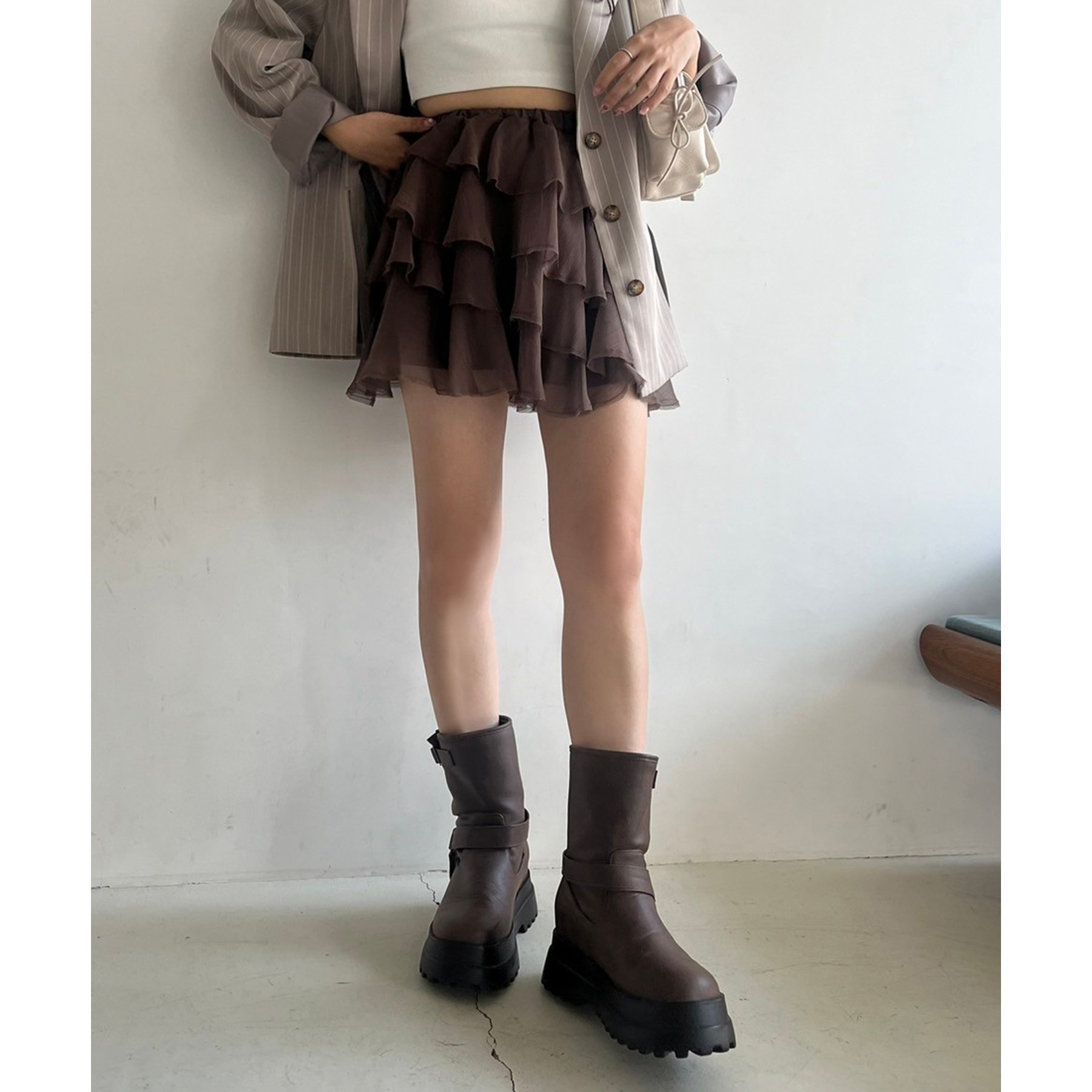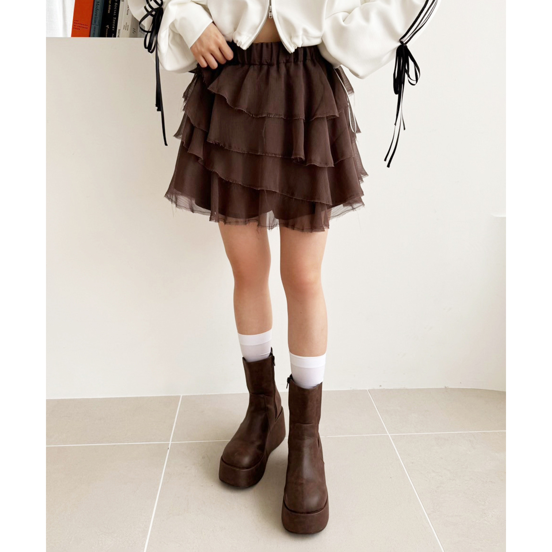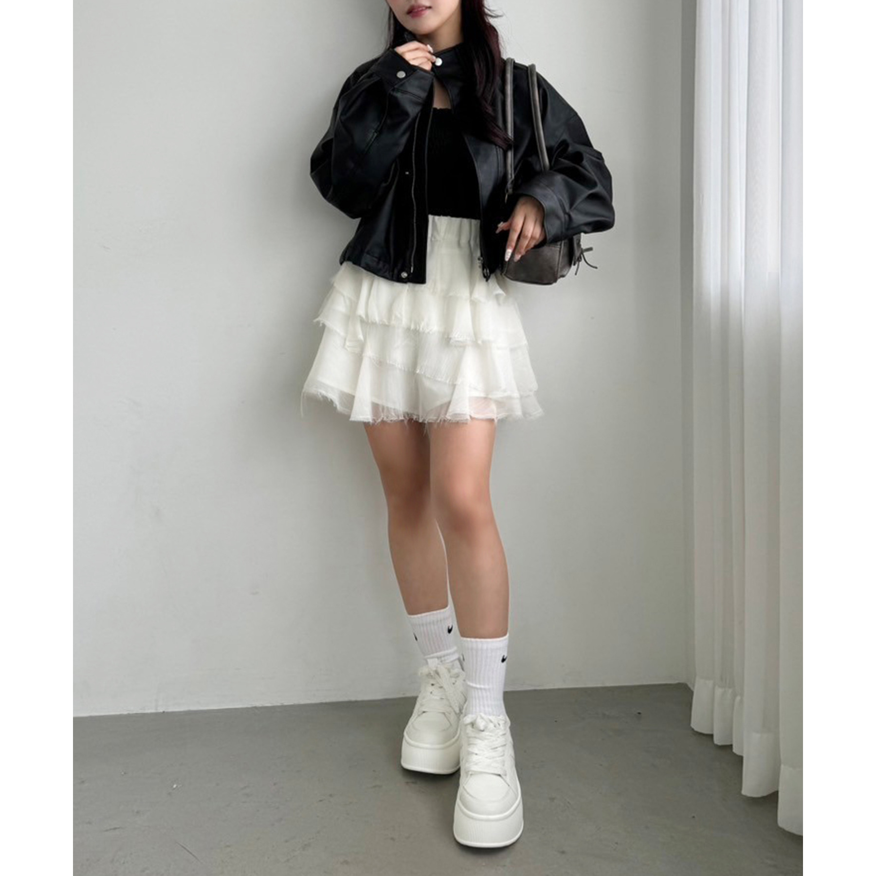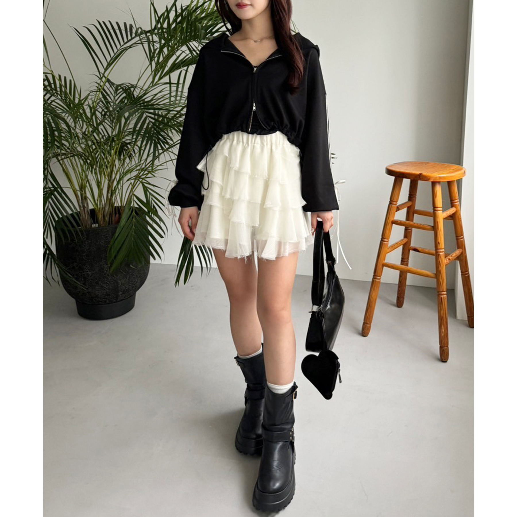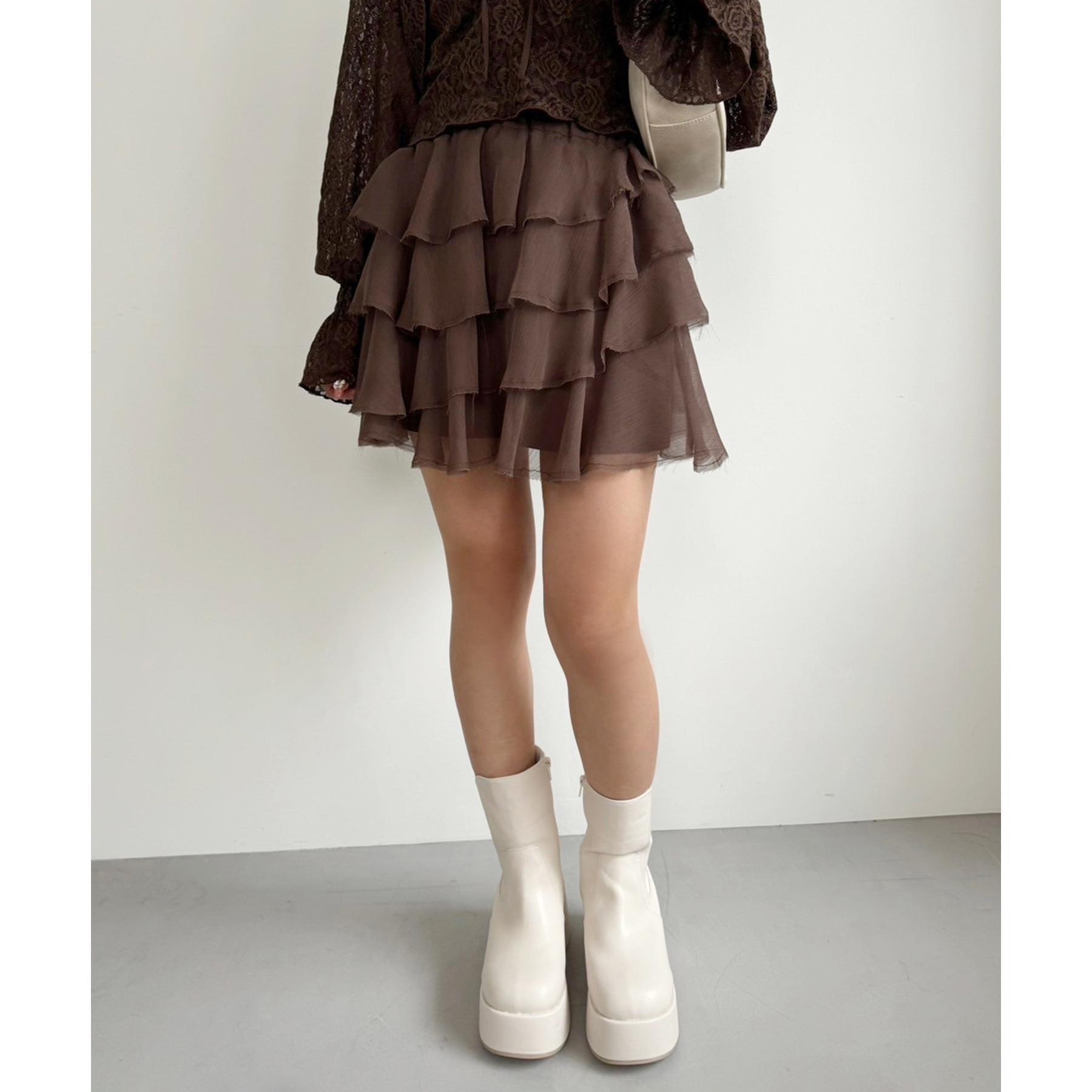 1枚で主役級のフリルスカートなのでシンプルなトップスと合わせていただくのがオススメです。