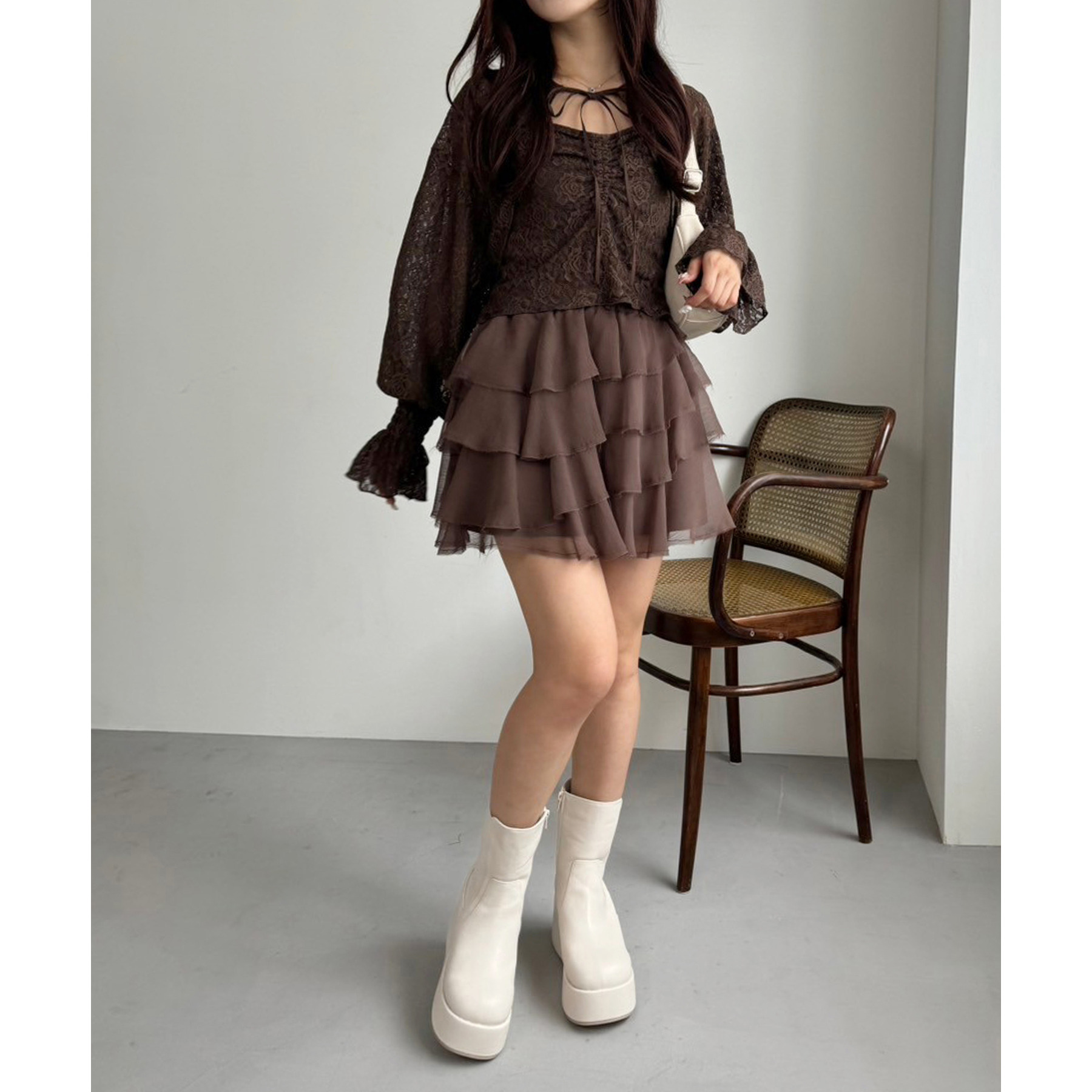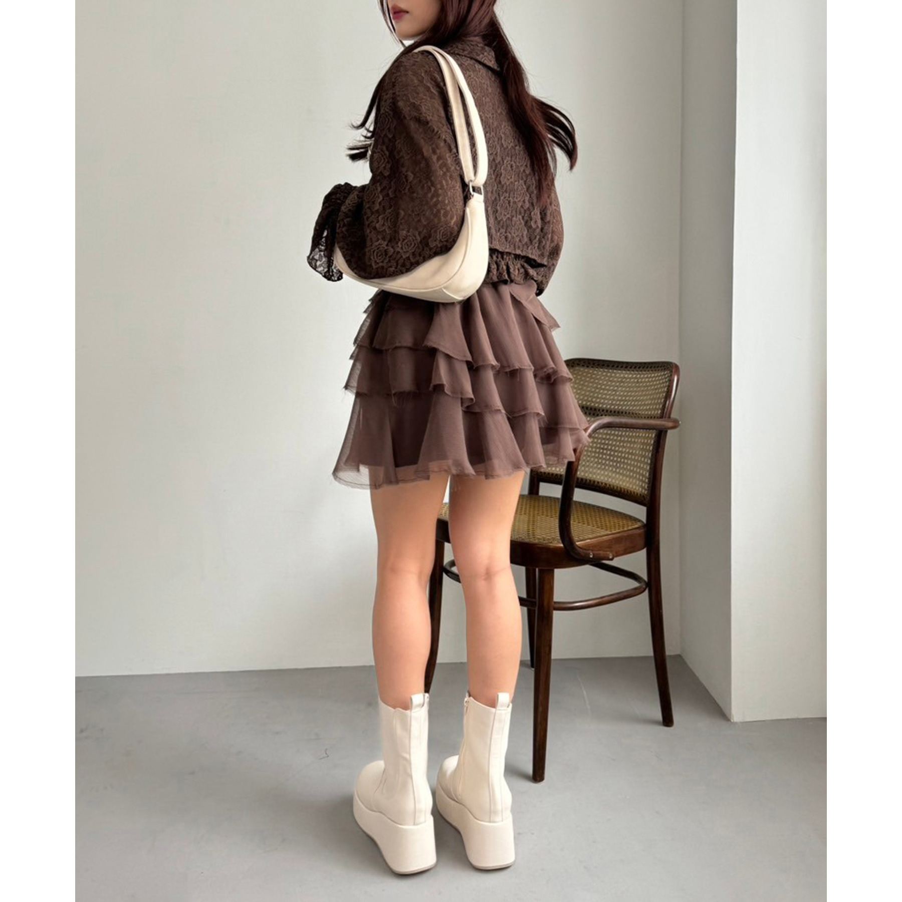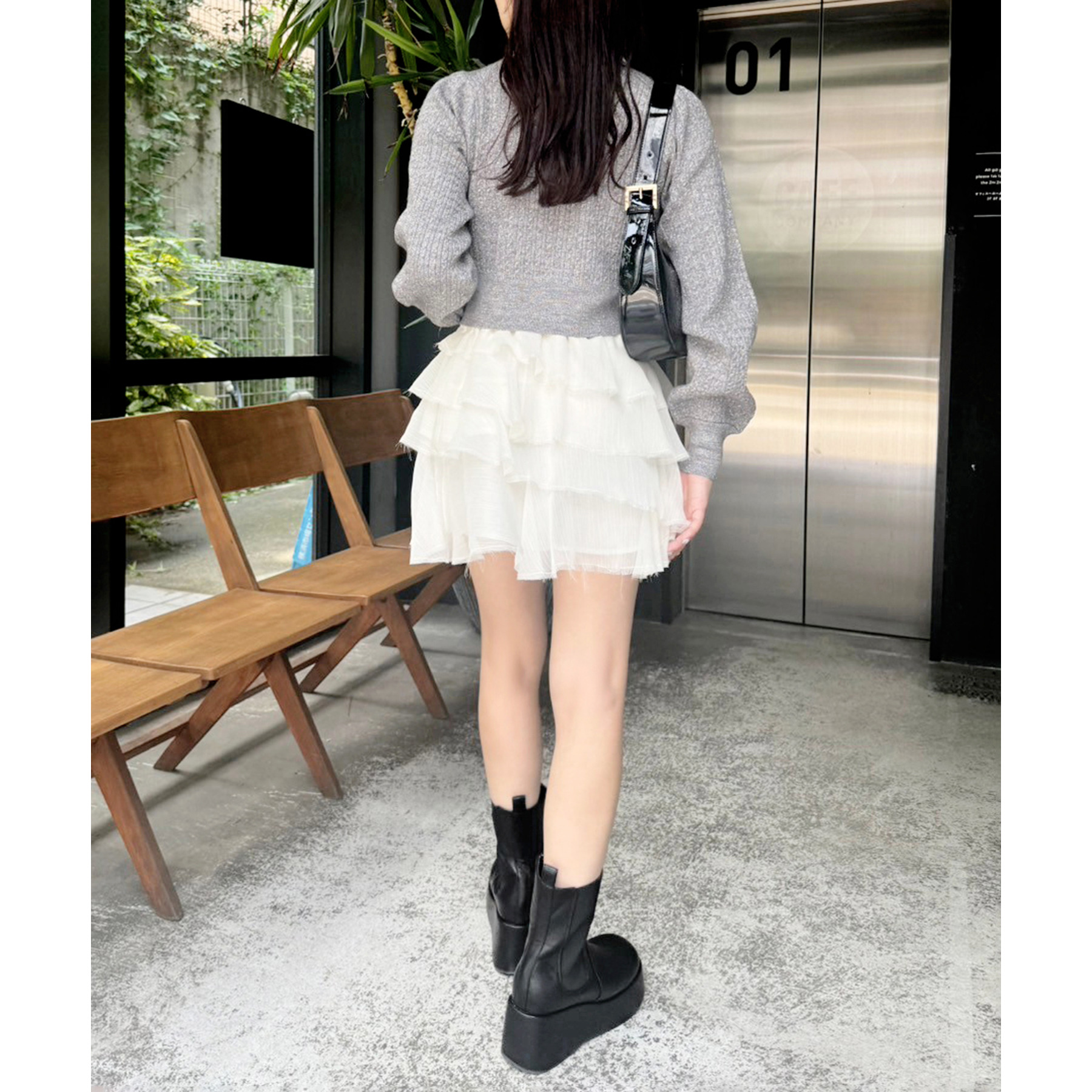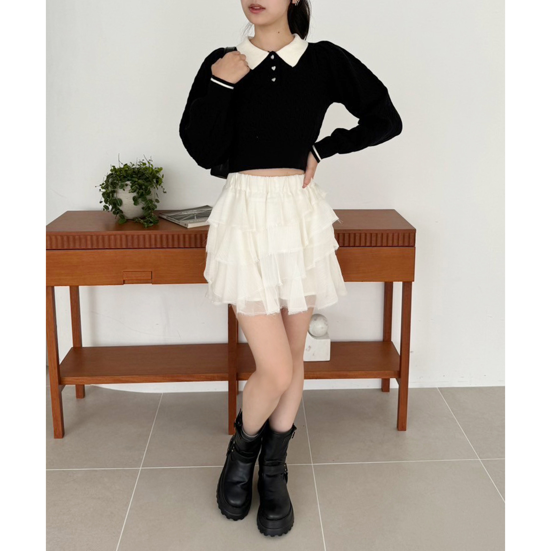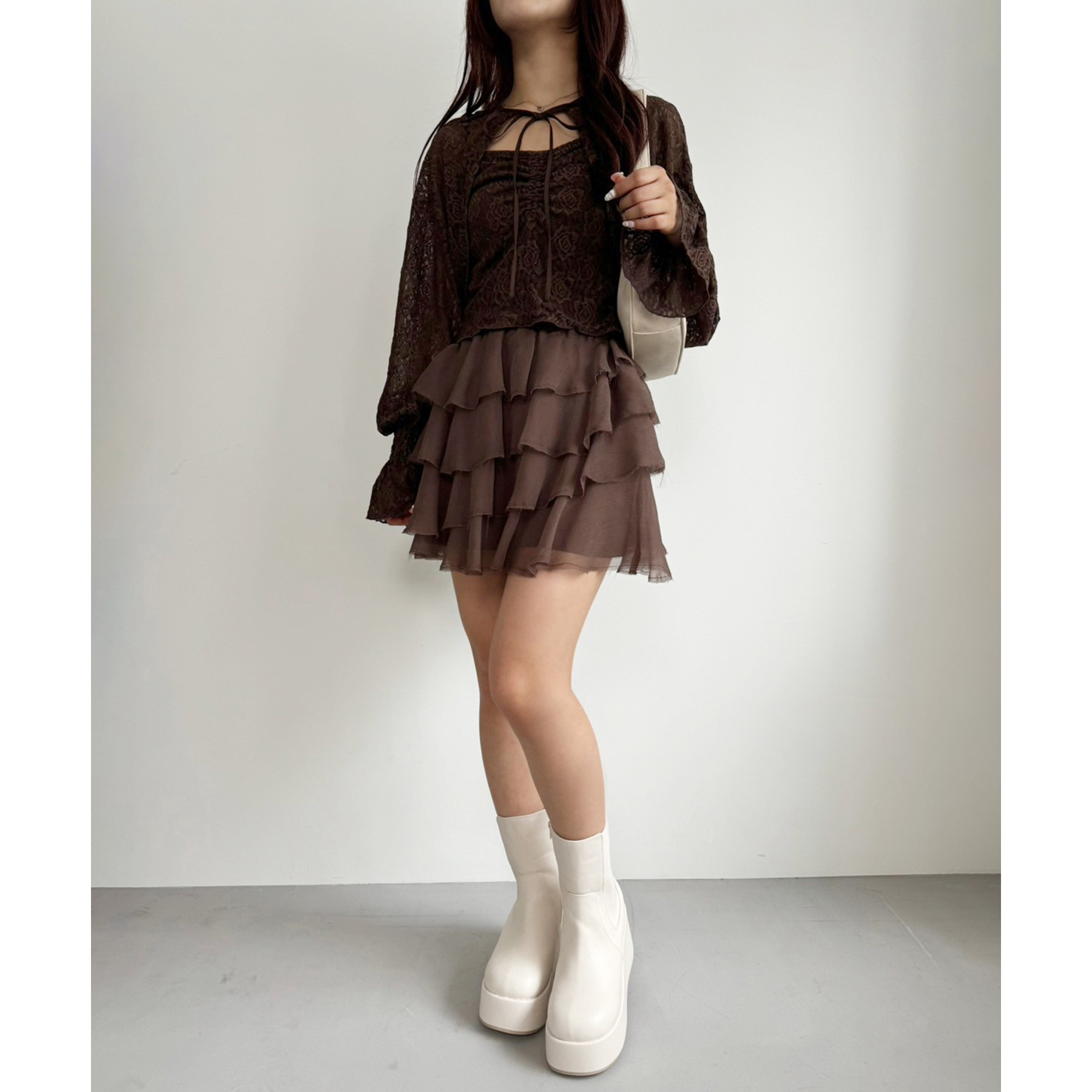 1枚で主役級のフリルスカートなのでシンプルなトップスと合わせていただくのがオススメです。