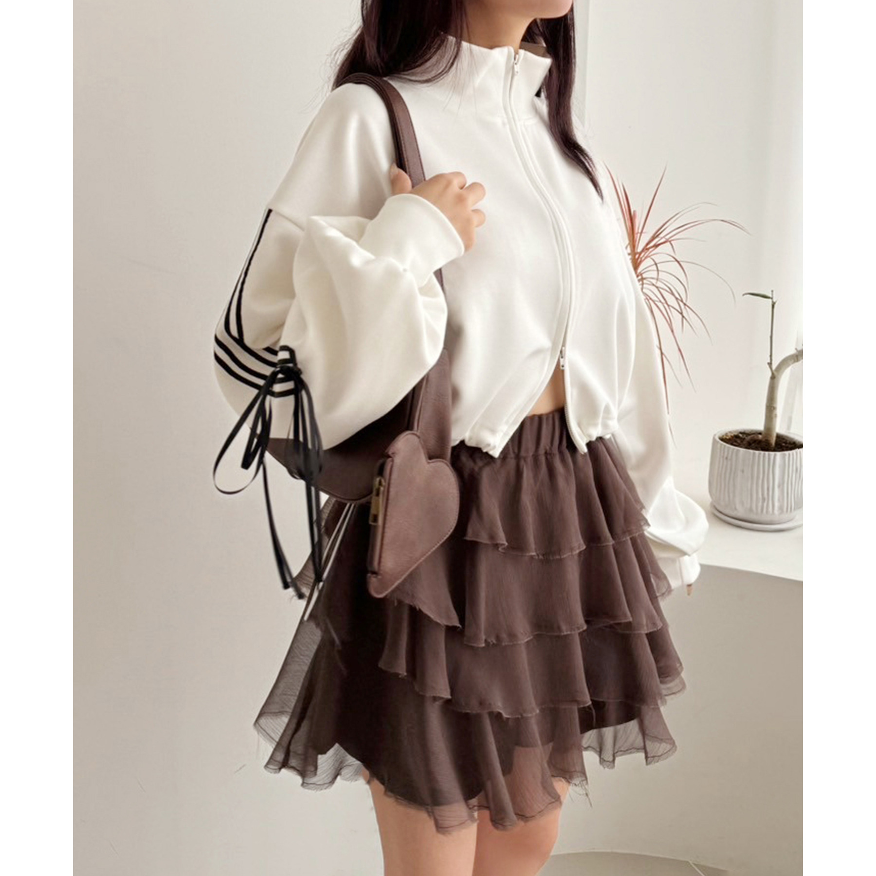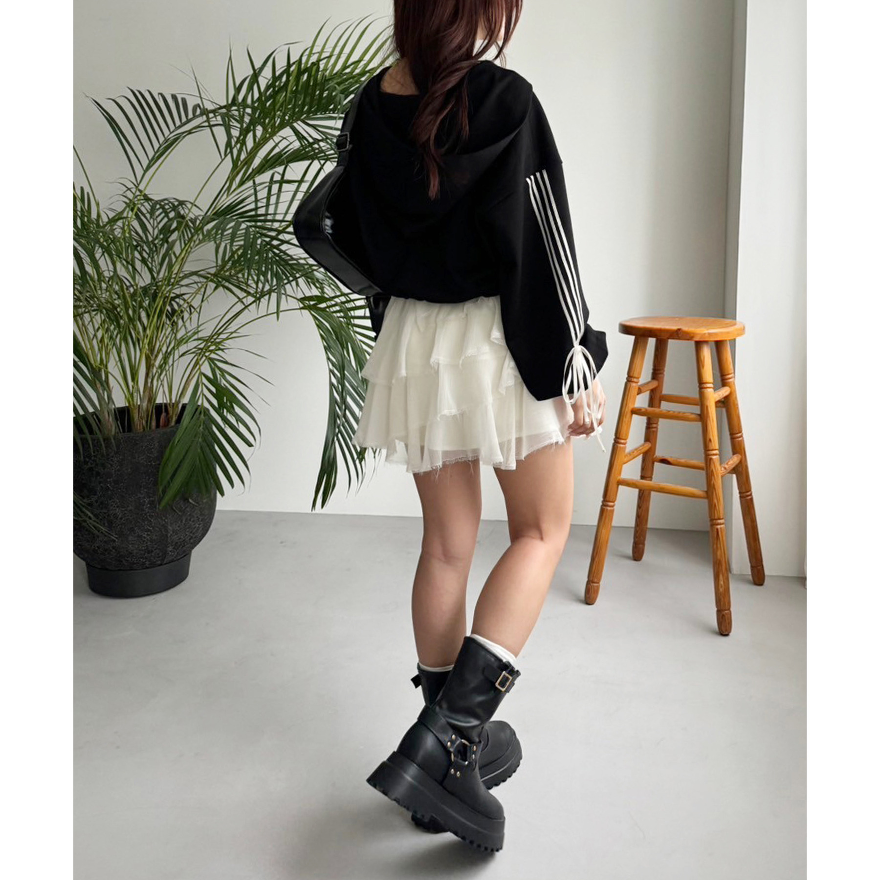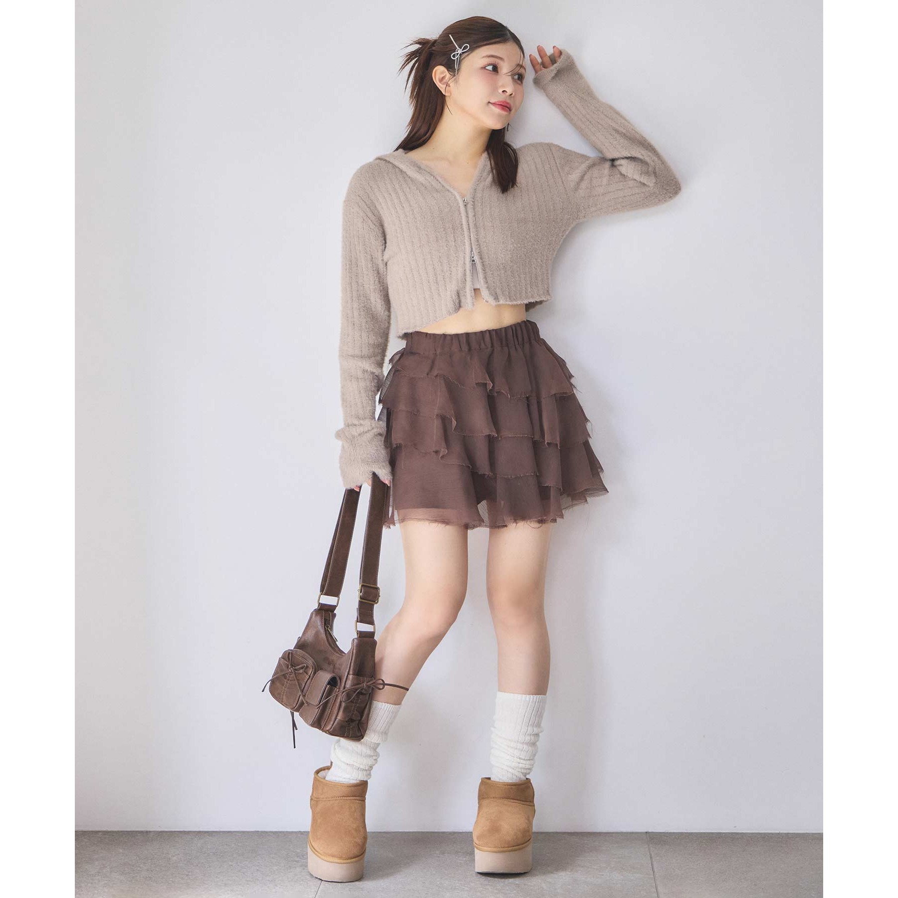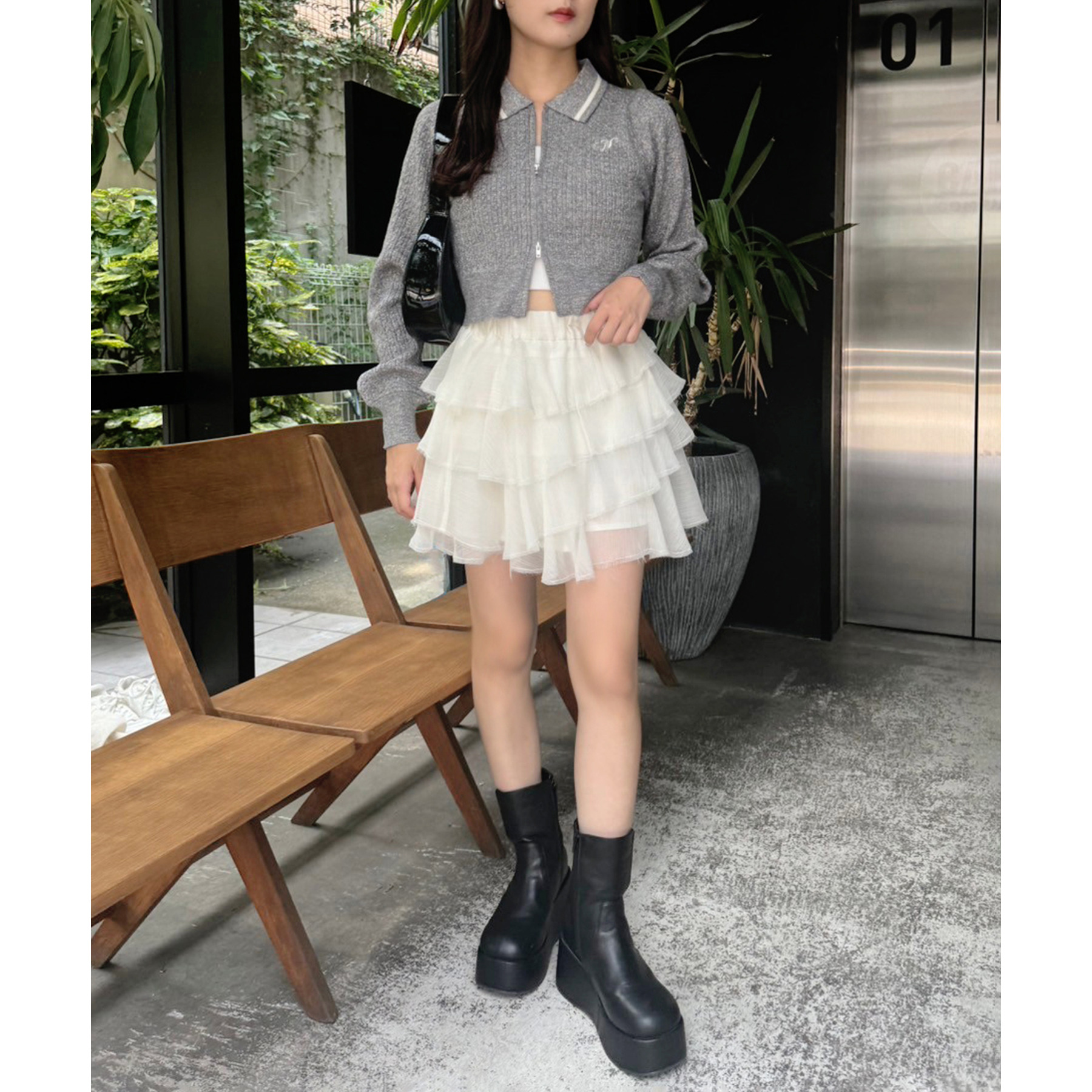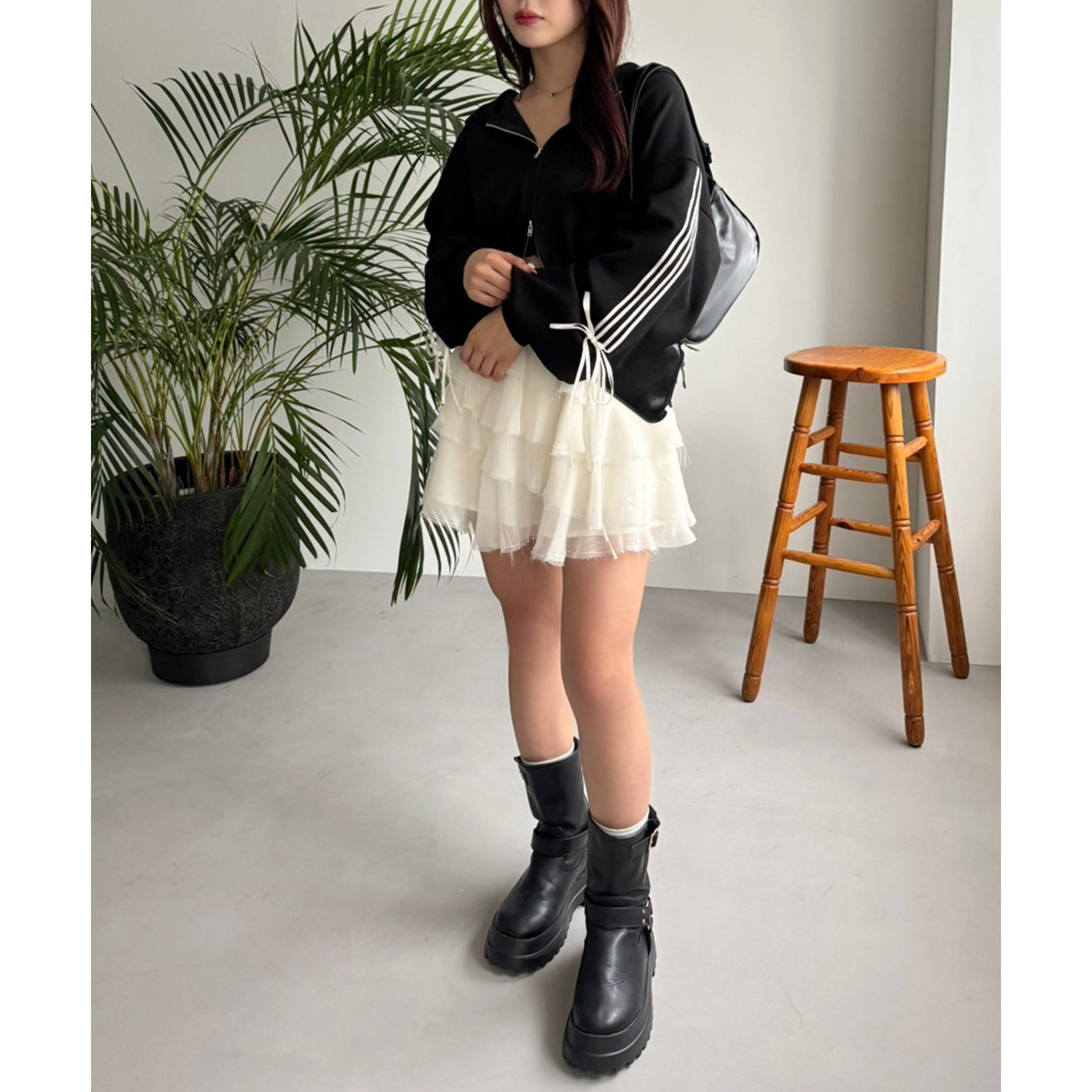 1枚で主役級のフリルスカートなのでシンプルなトップスと合わせていただくのがオススメです。