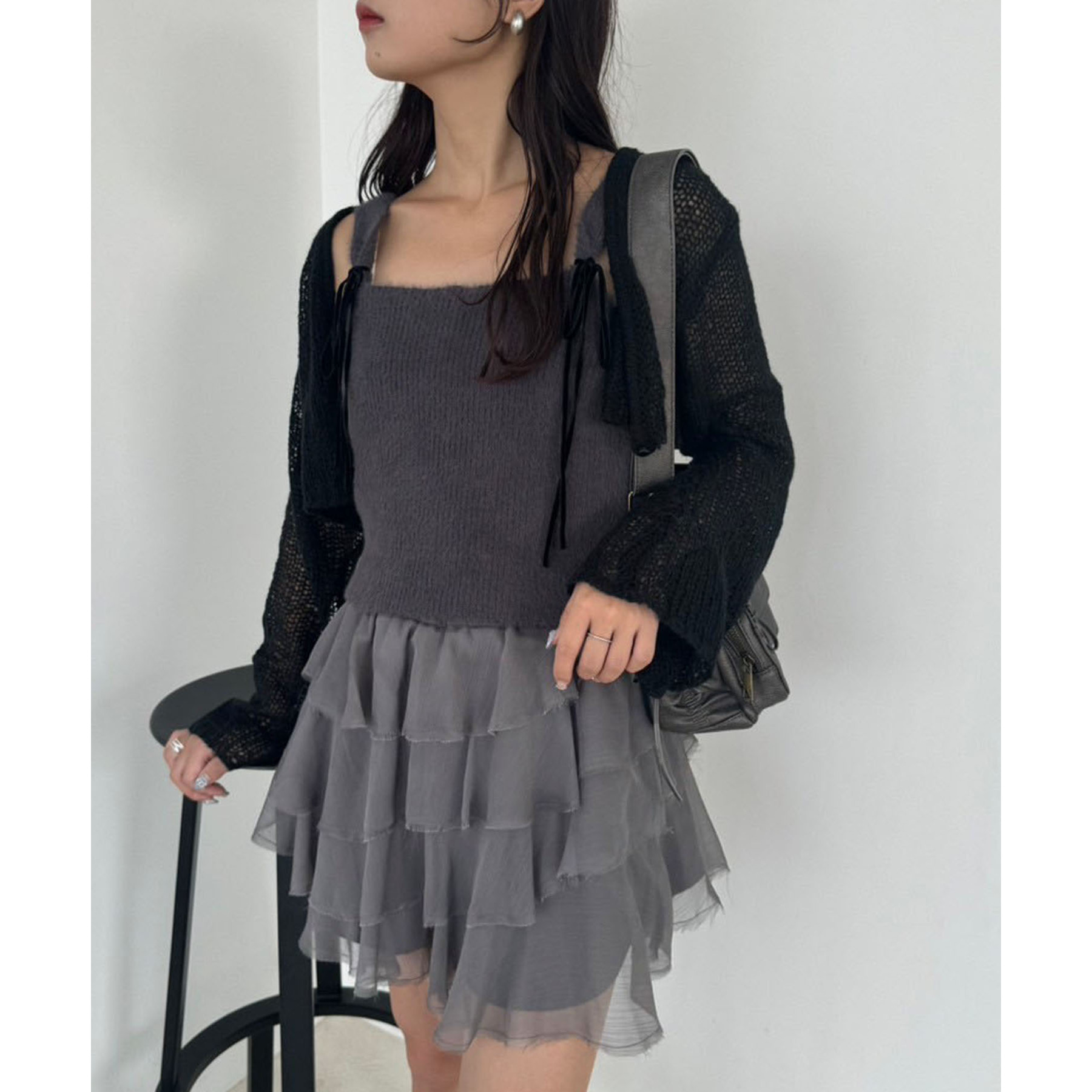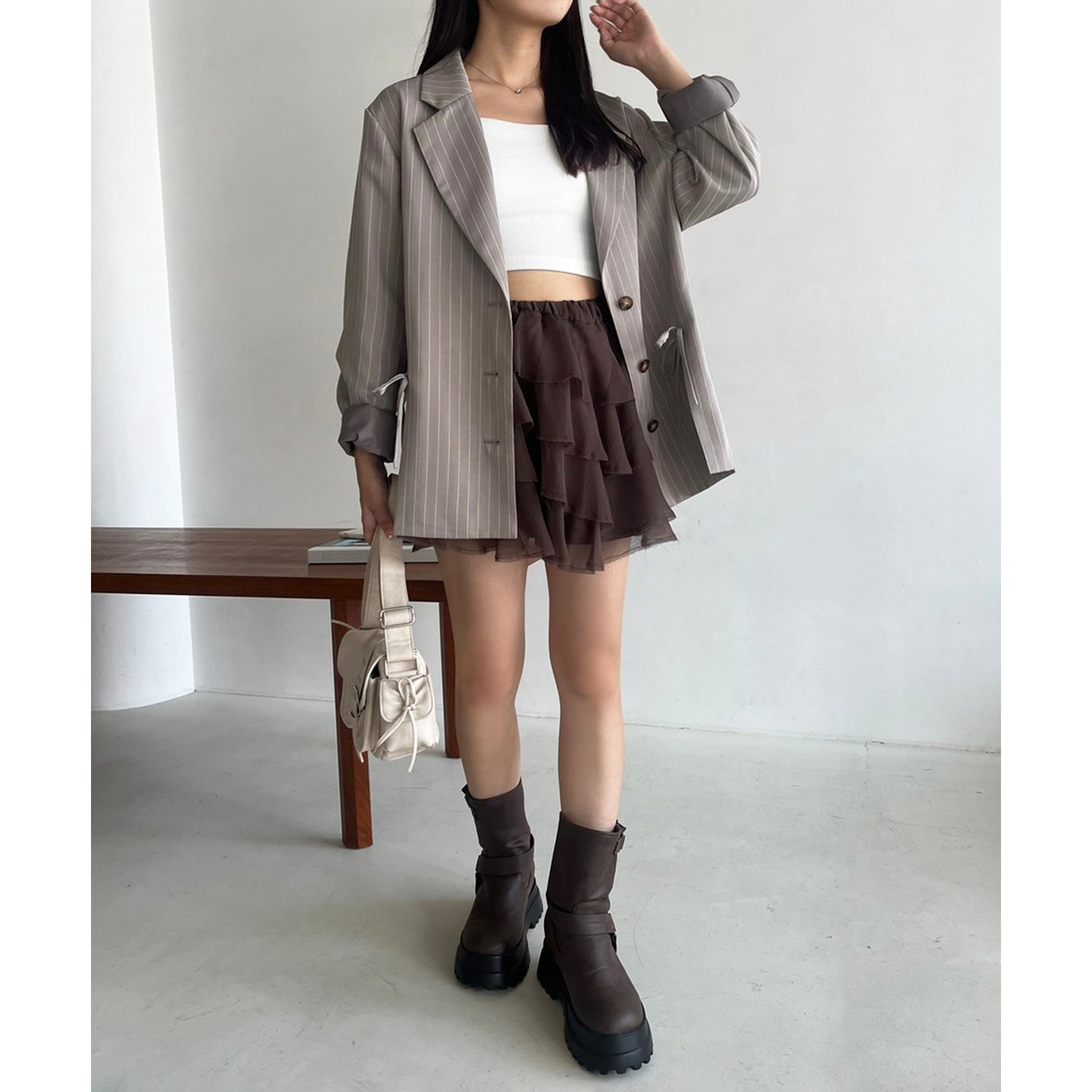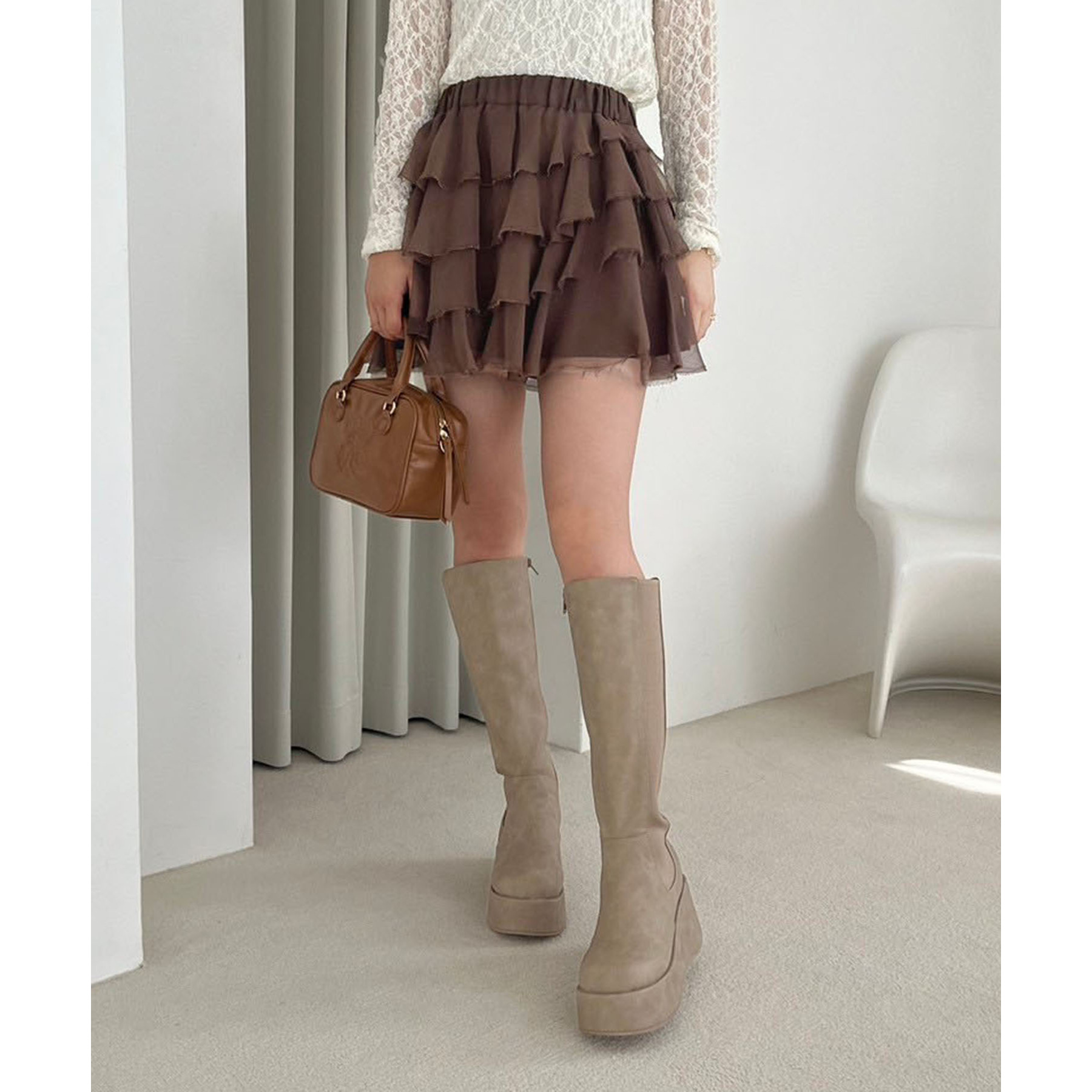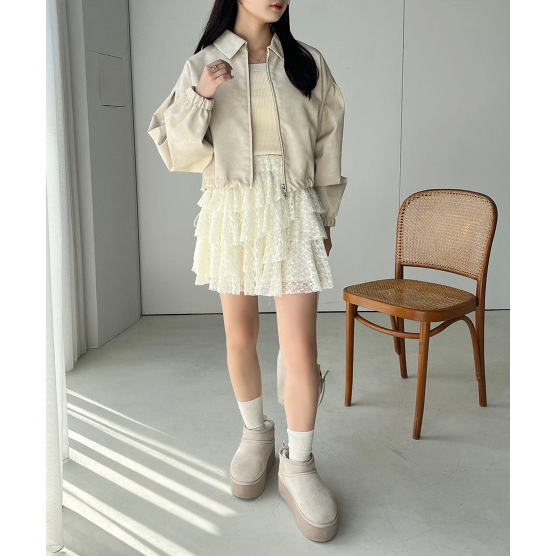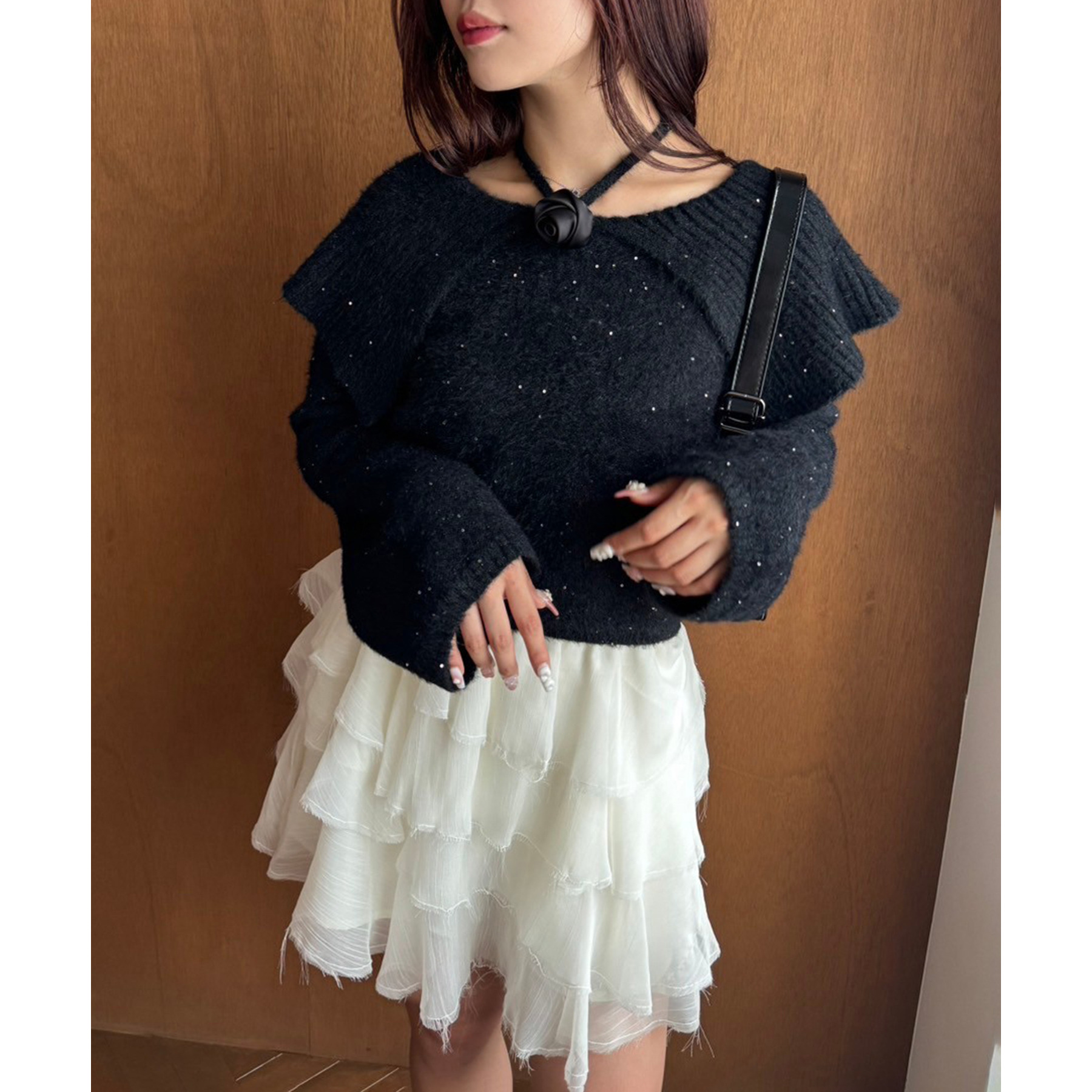 1枚で主役級のフリルスカートなのでシンプルなトップスと合わせていただくのがオススメです。
