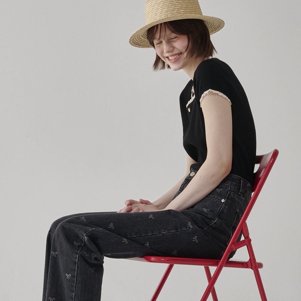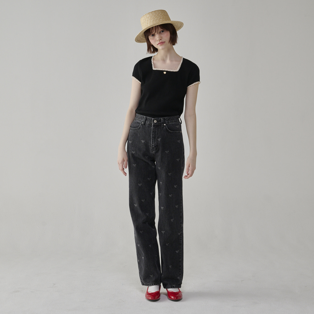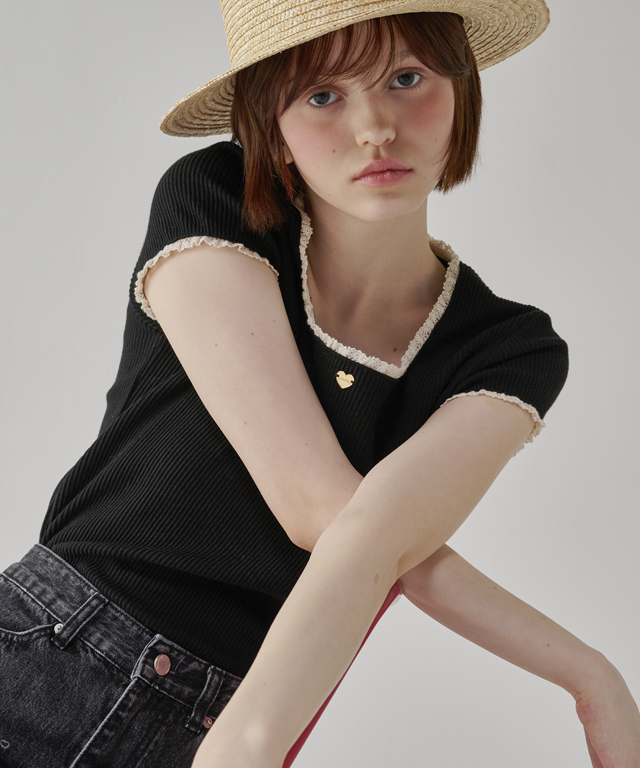 LACE SQUARE HEART NECK SHORT SLEEVE BLACK