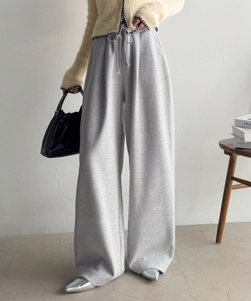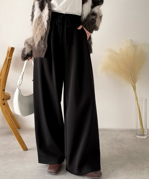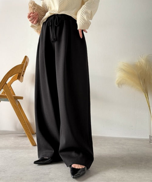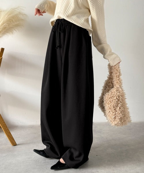 ゆったりとしたワイドシルエットが脚のラインを拾わず、動くたびに空気を含むような流れるドレープ感を演出。
