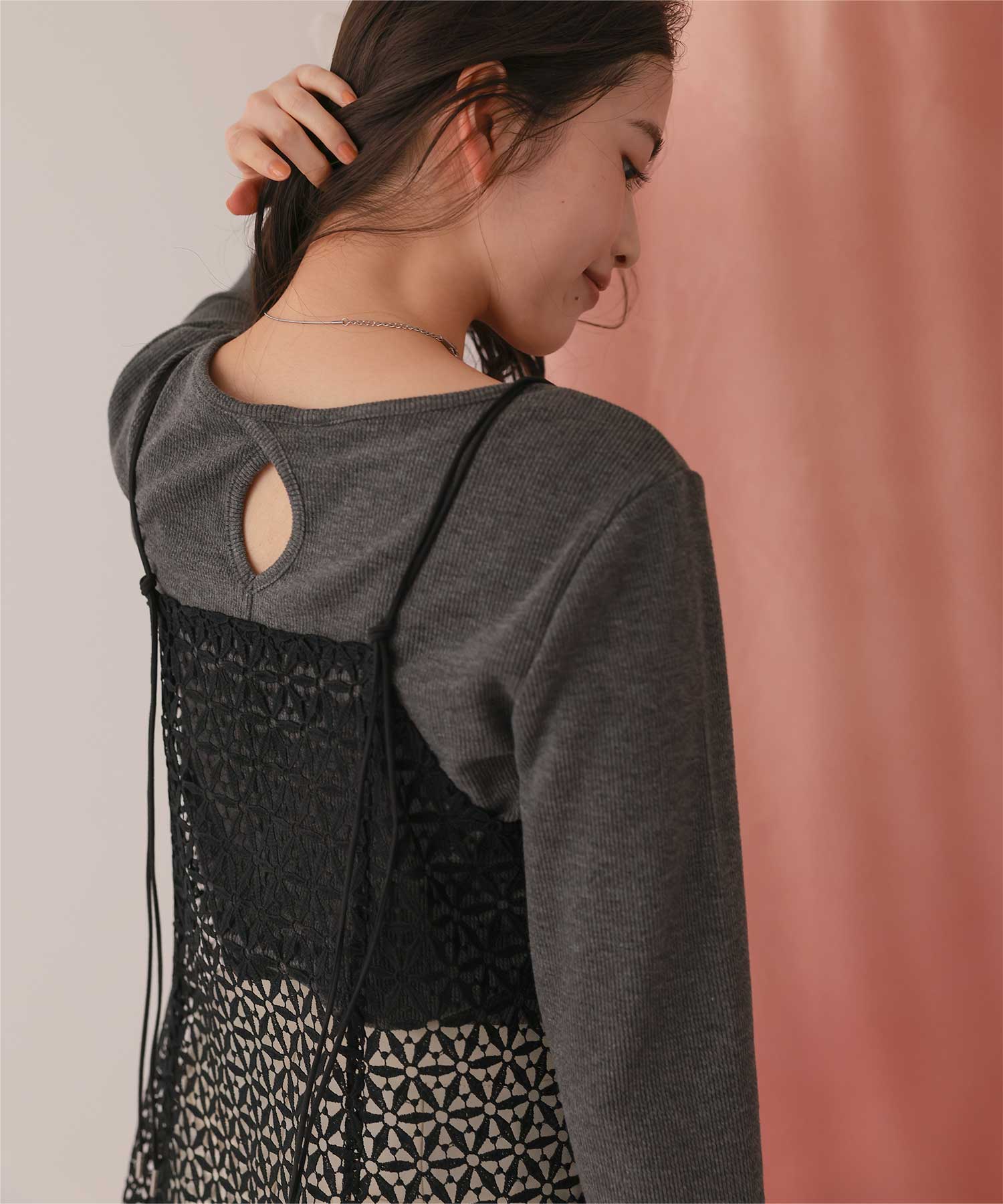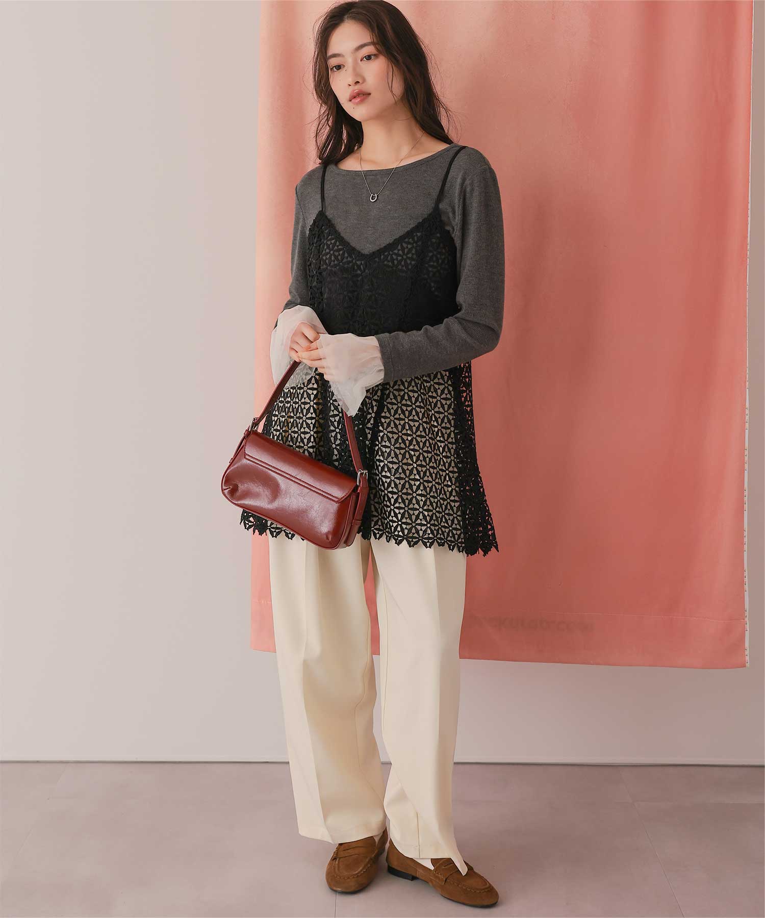 ・華奢な肩紐が女性らしい抜け感を引き立て、インナー次第で印象自在