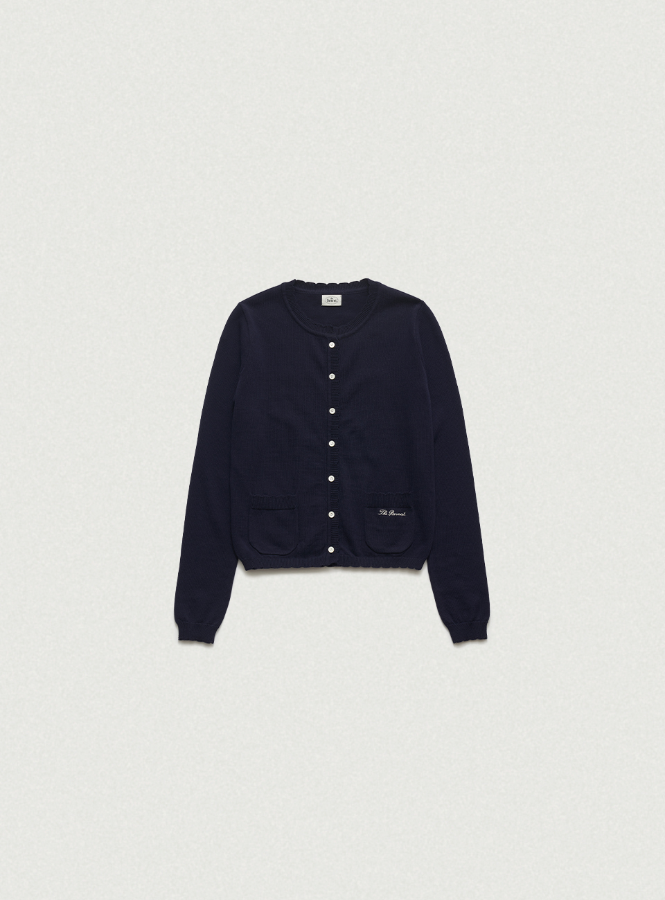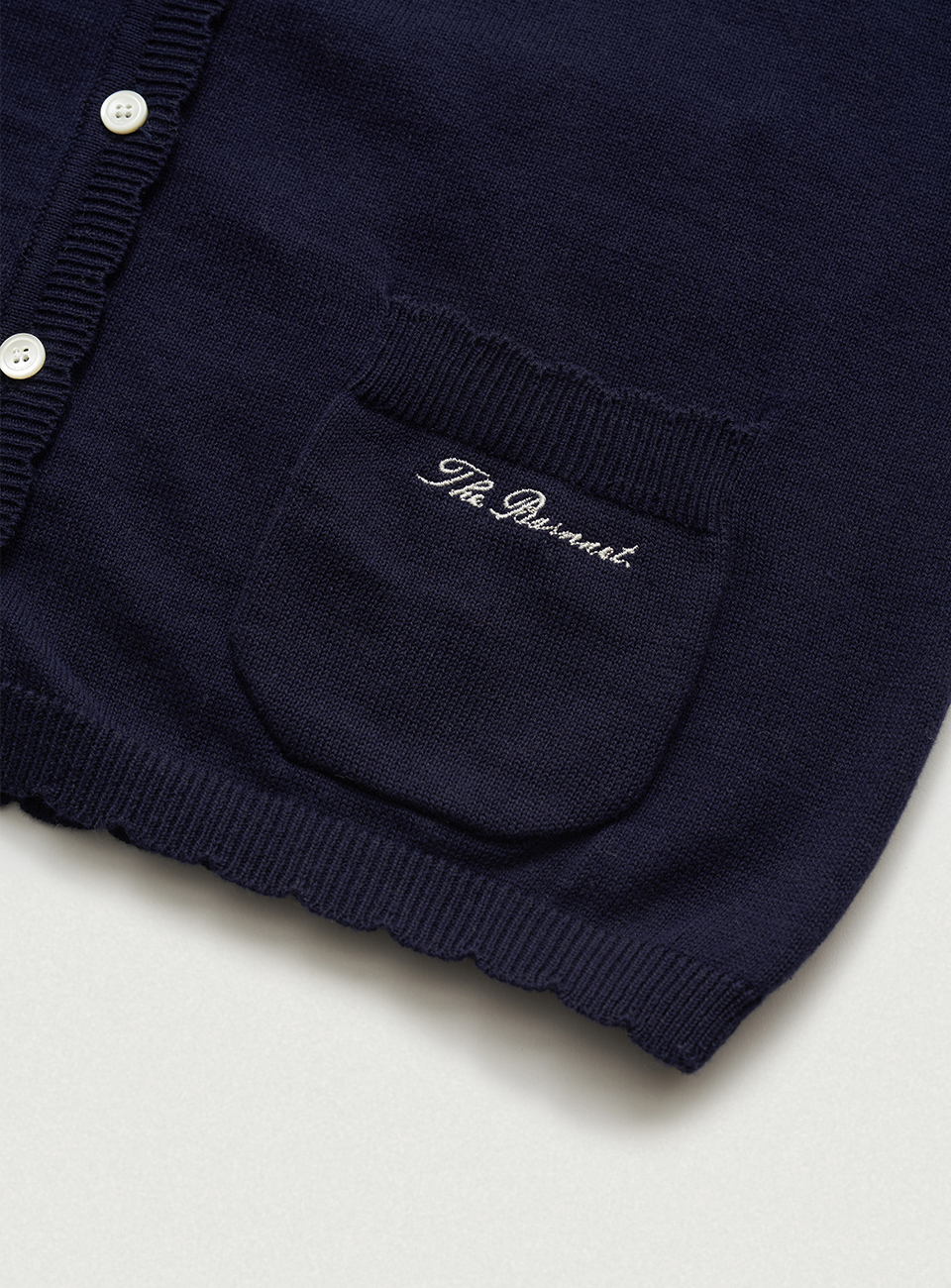 *スカラップ編みを加えたアウトポケットと、筆記体ロゴ刺繍がポイント