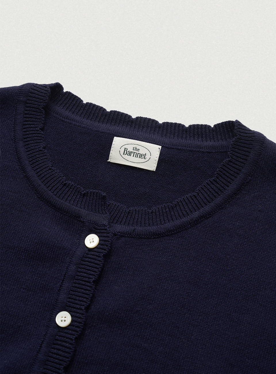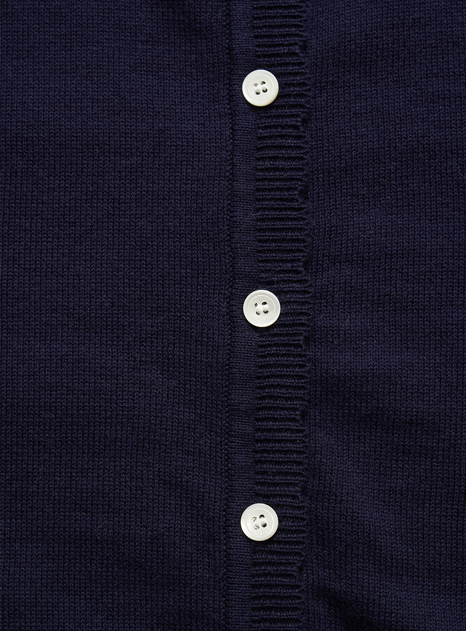 *ロゴ刻印入りの貝ボタンで開閉できるコットンカーディガン