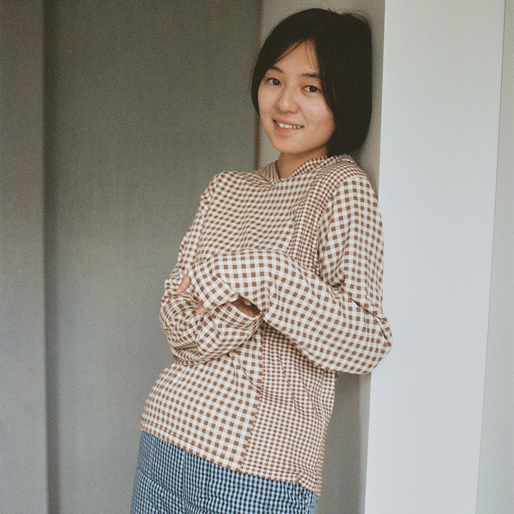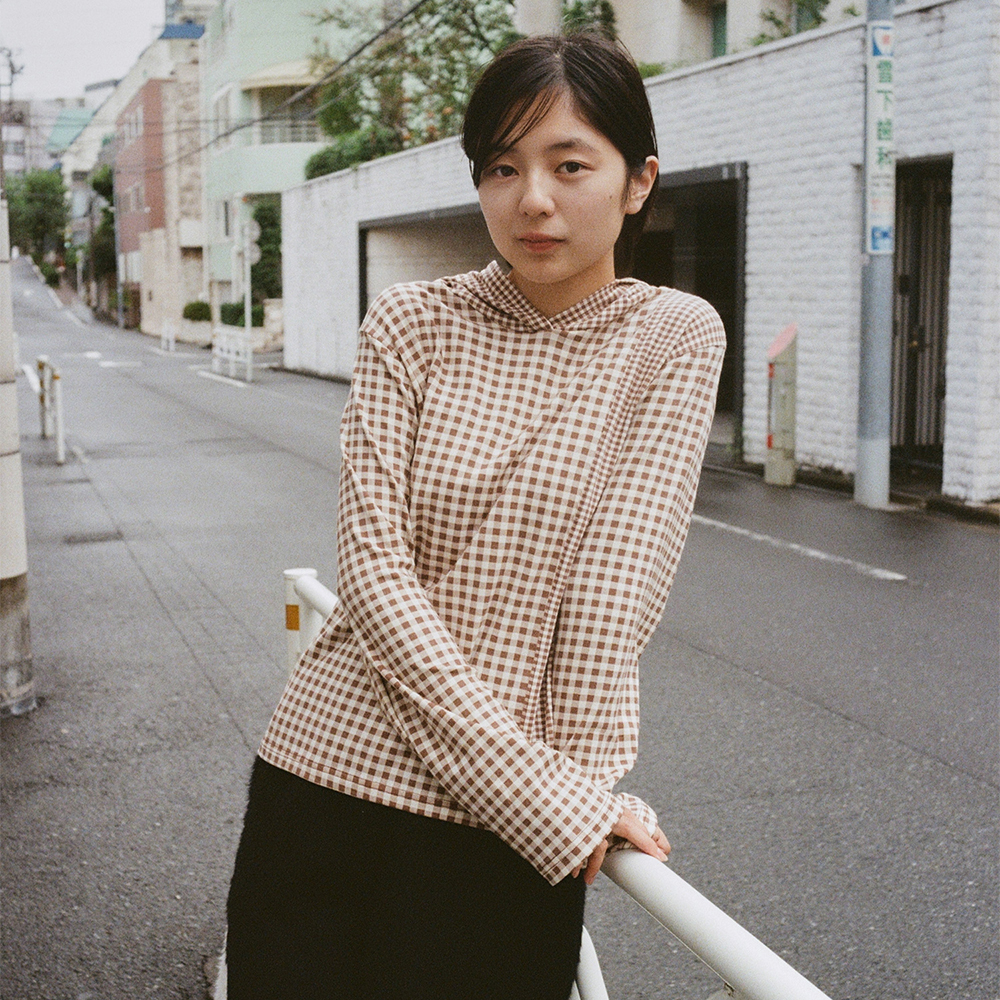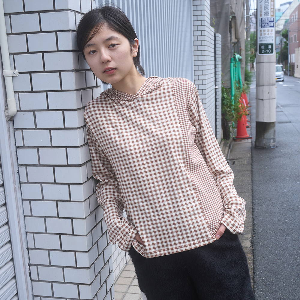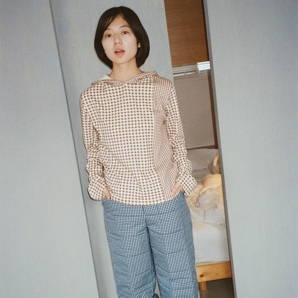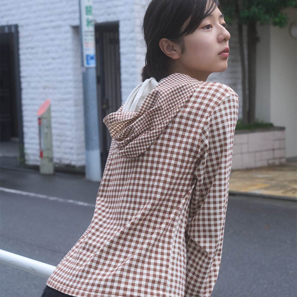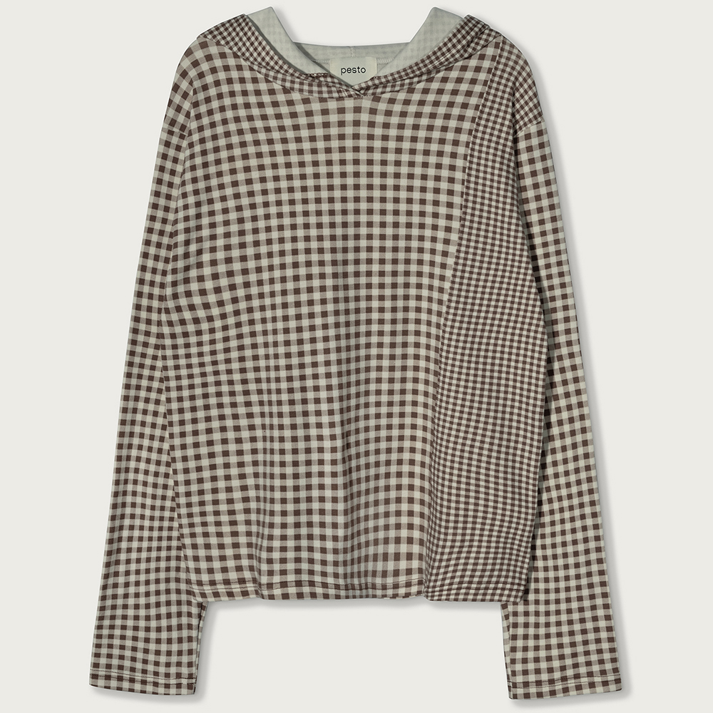 HALF AND HALF CHECK HOODED TOP DARK SOIL