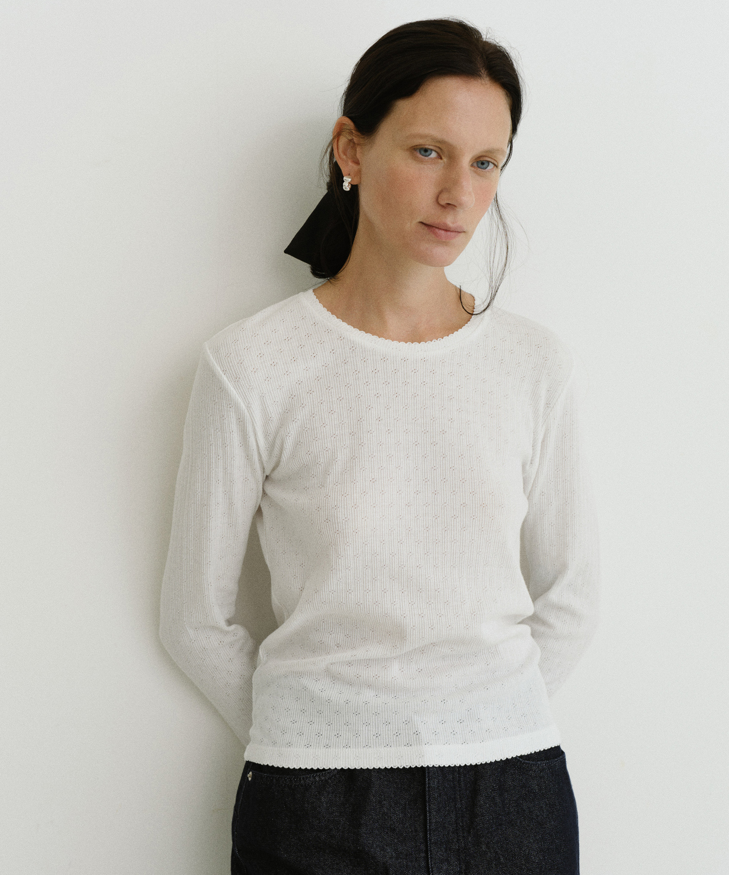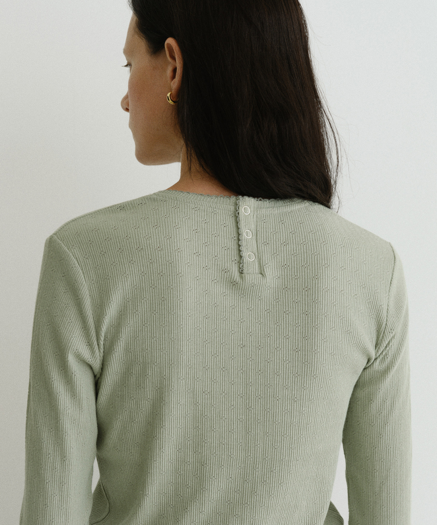 -ラウンドネックの背面にはドットスナップボタンをあしらい、ディテールと実用性を兼ね備えています。生地自体のパンチングディテールがさりげないアクセントに。