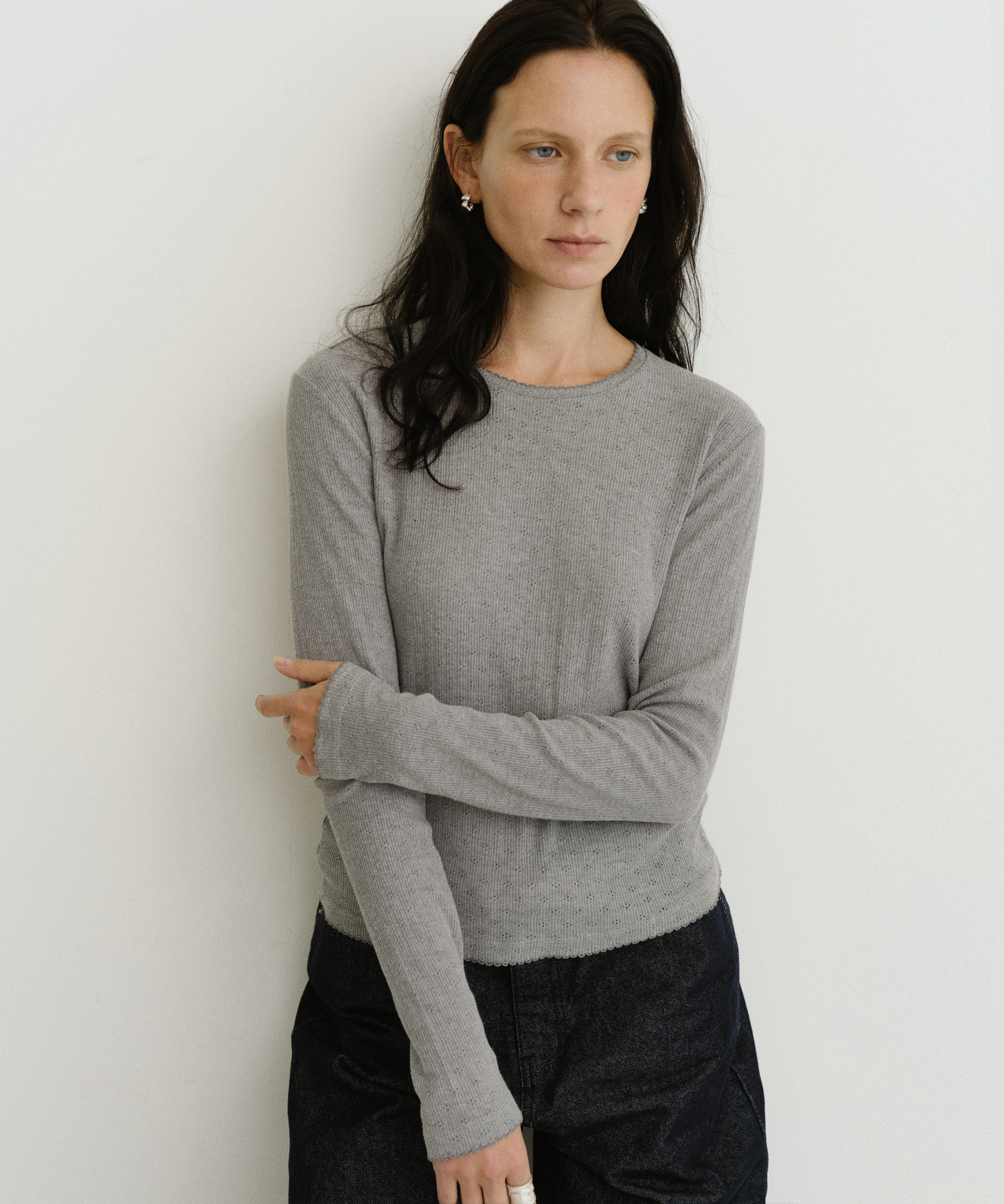 -라운드 넥 라인 뒷면에는 돗도 스냅 단추를 더해 디테일과 편리함을 동시에 담았으며, 원단 자체의 펀칭 디테일이 은은한 포인트가 되어줍니다.