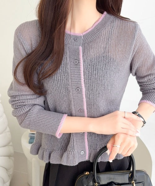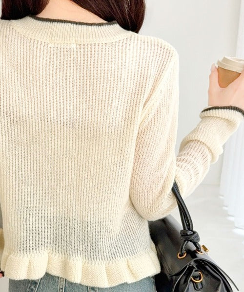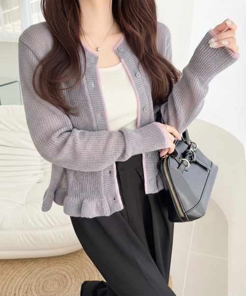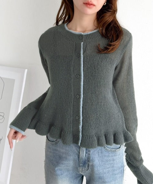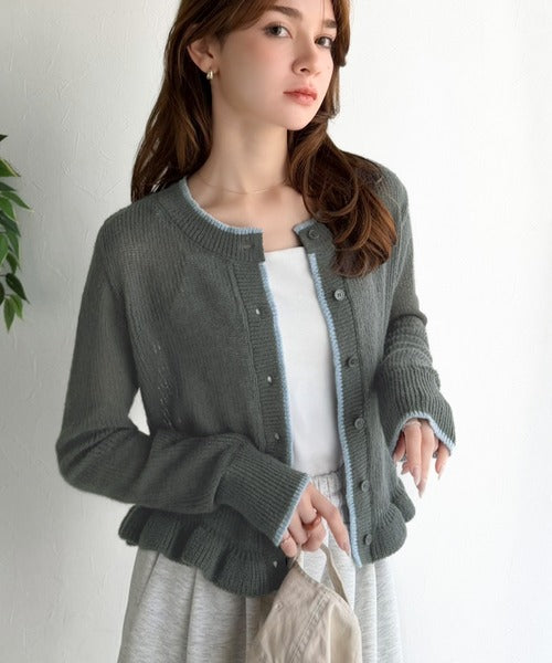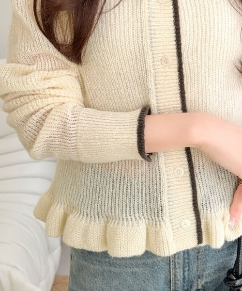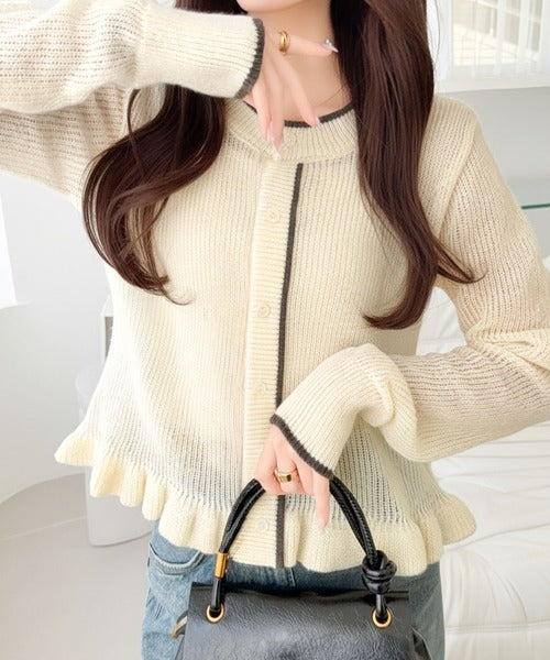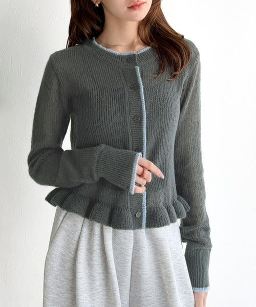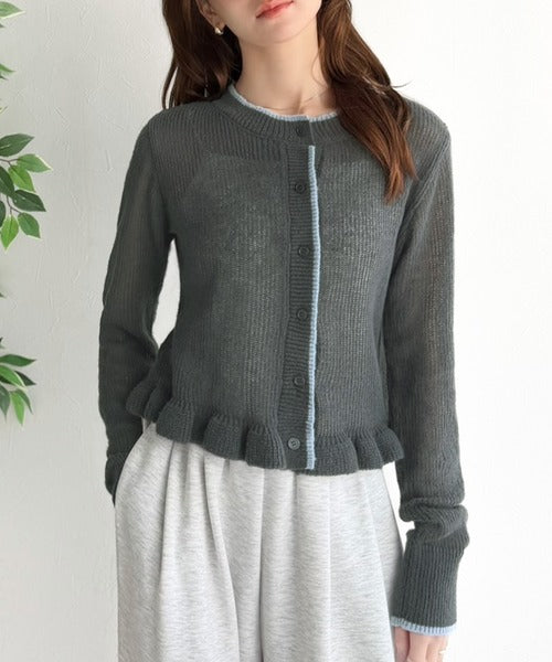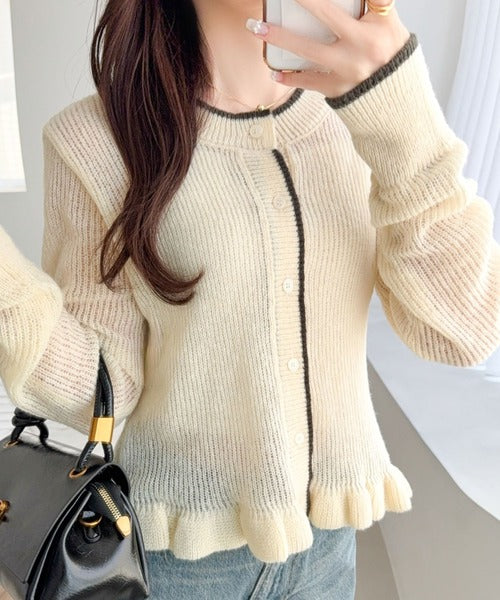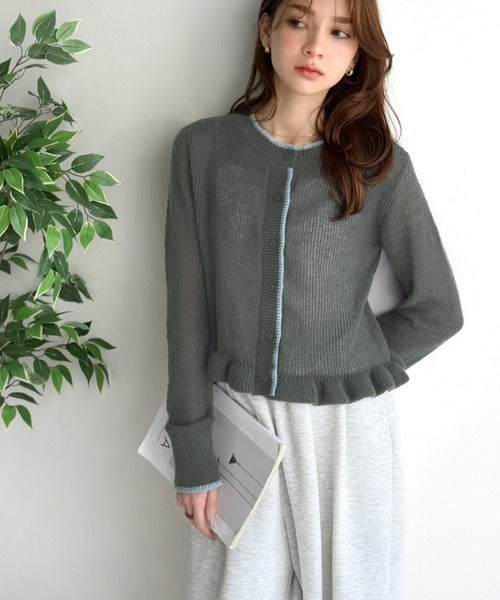 【mily bilet】これ一枚で完成、旬レイヤードスタイル。裾フリルバイカラーデザインシアーニットカーディガン(長袖) mi1029183