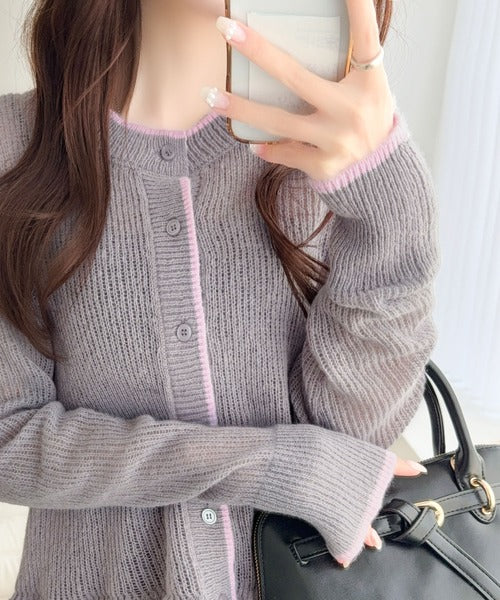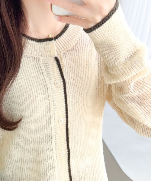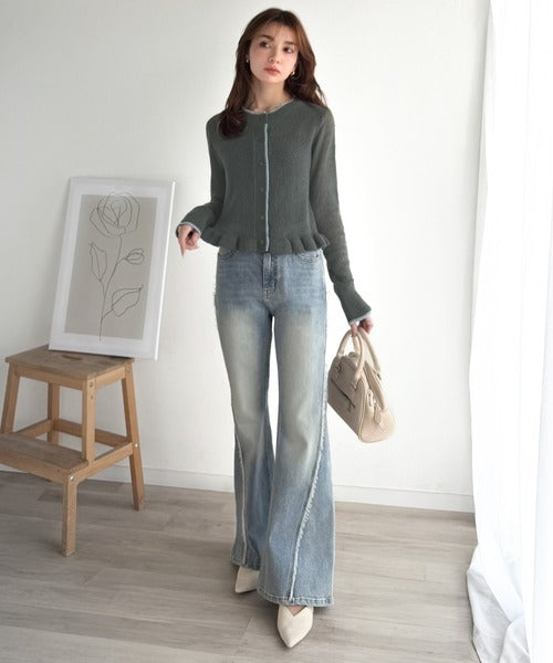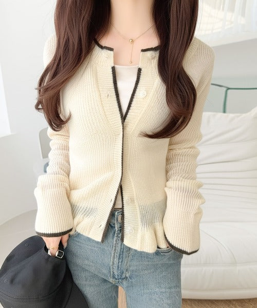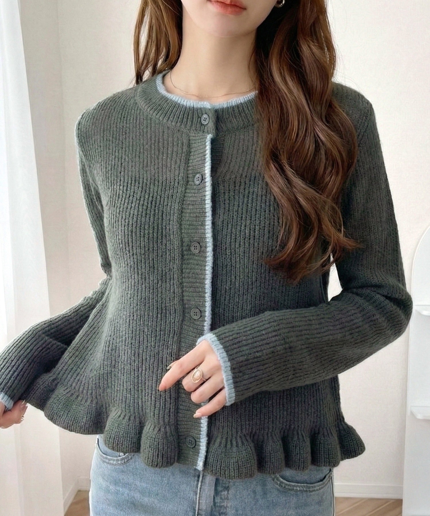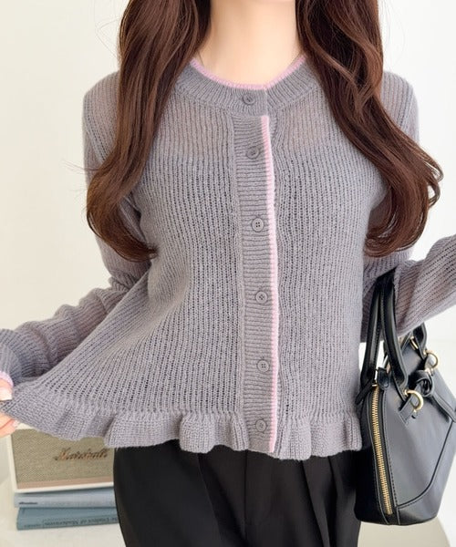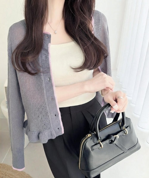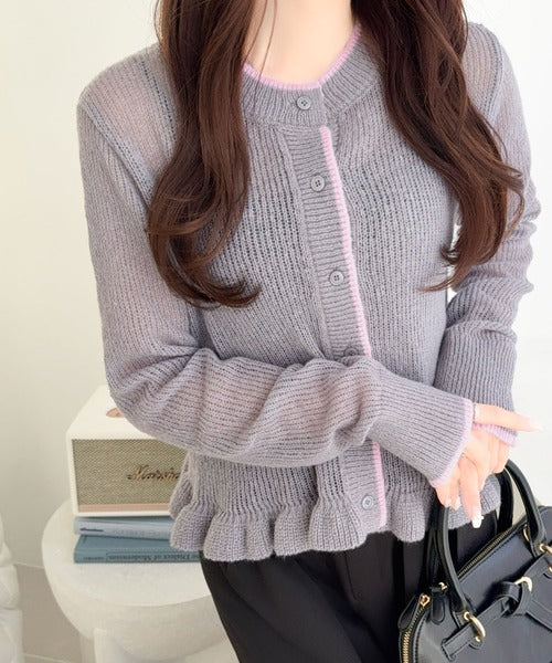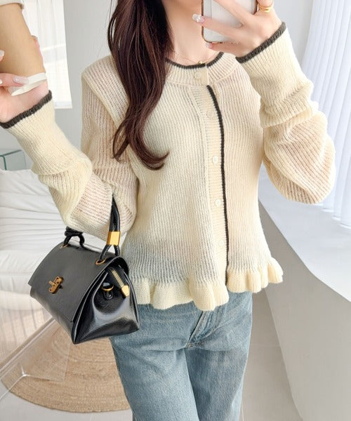 【mily bilet】これ一枚で完成、旬レイヤードスタイル。裾フリルバイカラーデザインシアーニットカーディガン(長袖) mi1029183