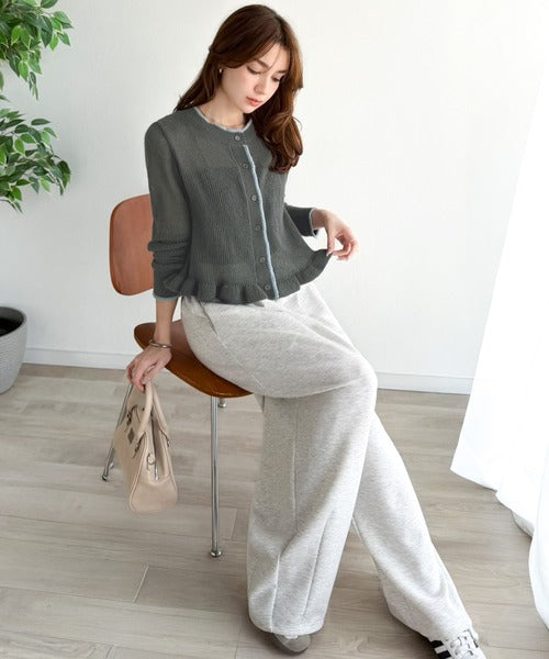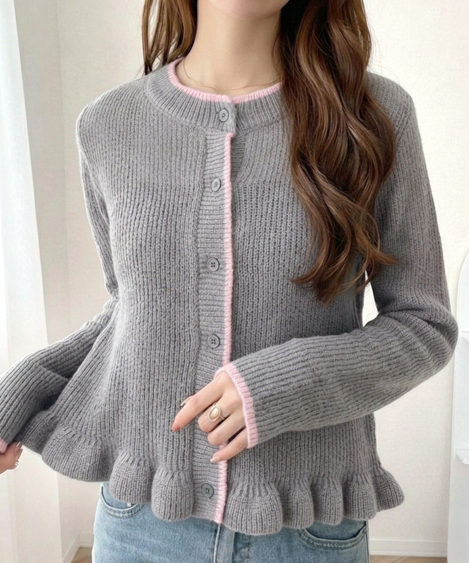 裾フリルで大人可愛いレイヤード風カーディガン。