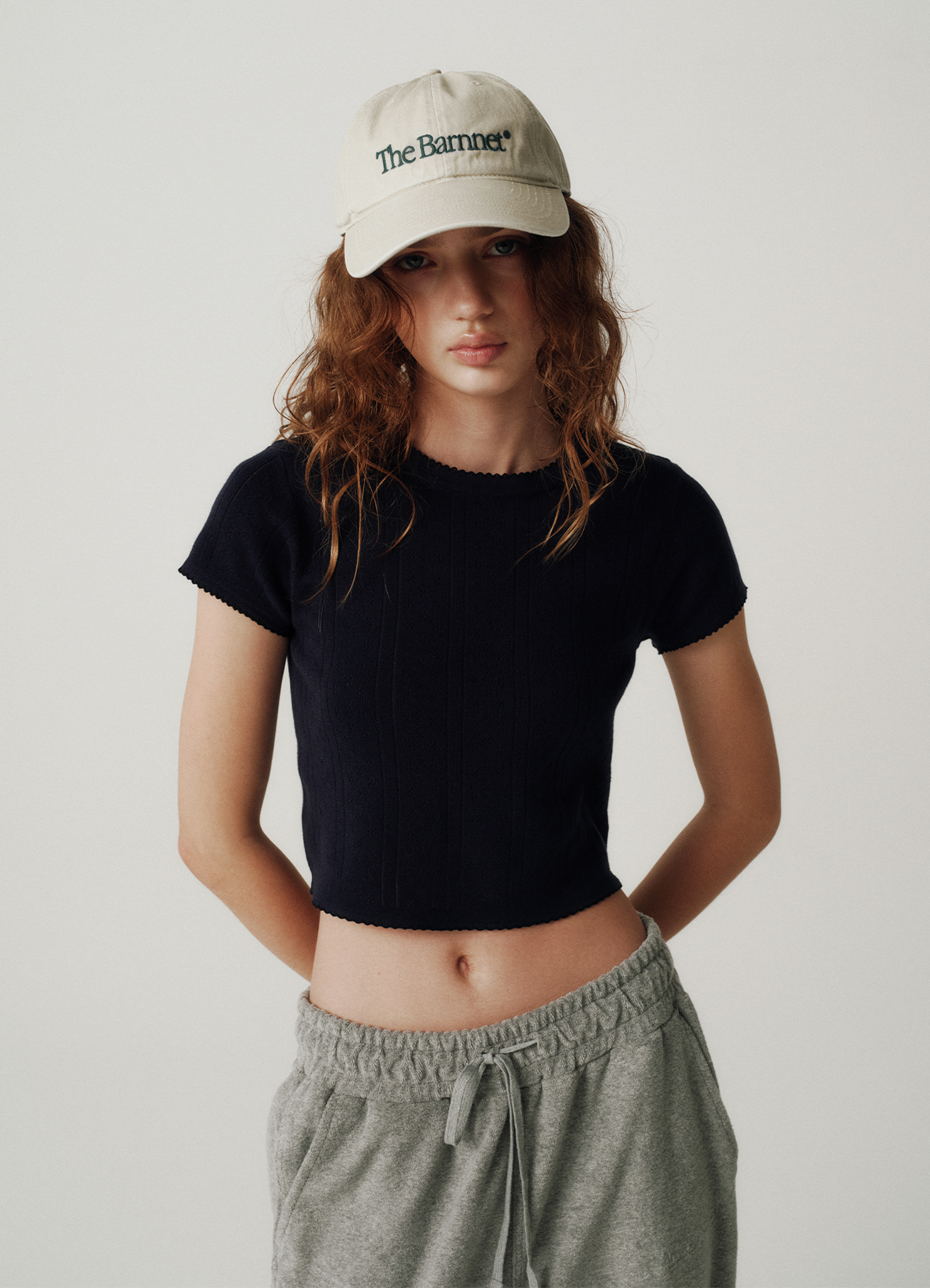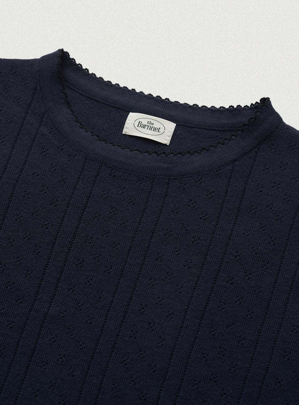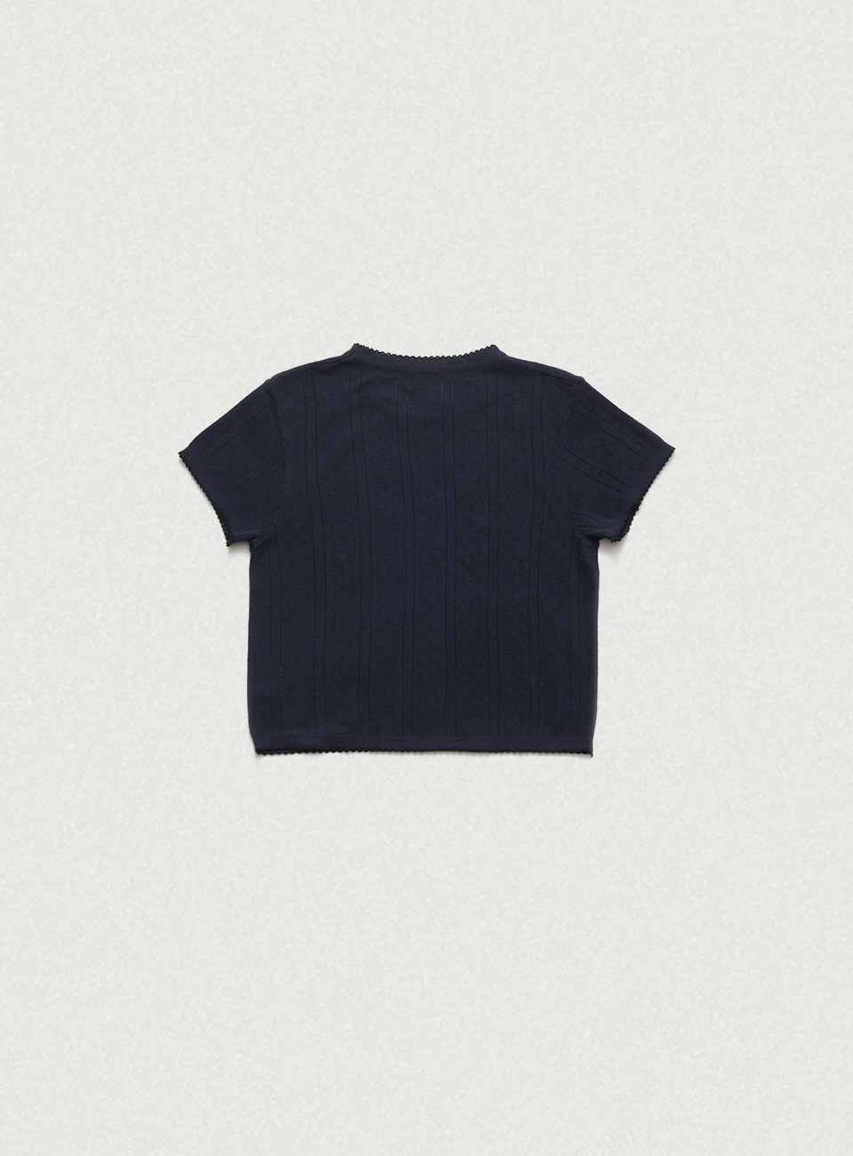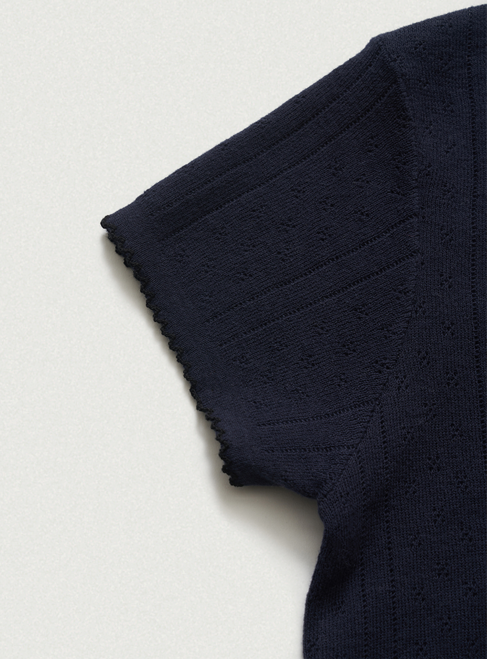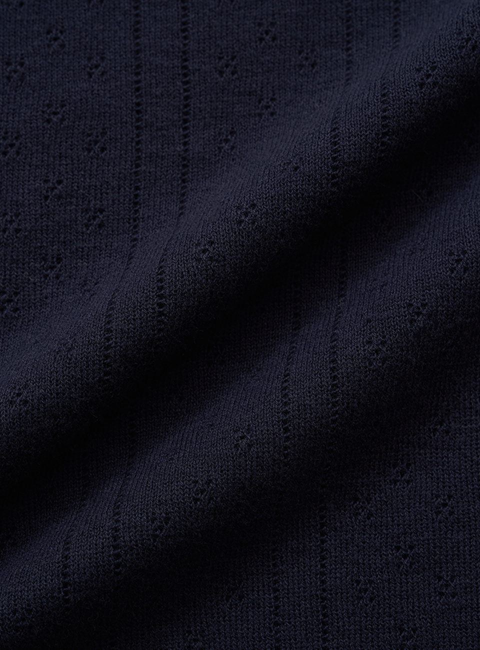 "ネイビーカラーのアイレット特有のテクスチャーと、柔らかく軽やかな質感が際立つコットンニットファブリック。