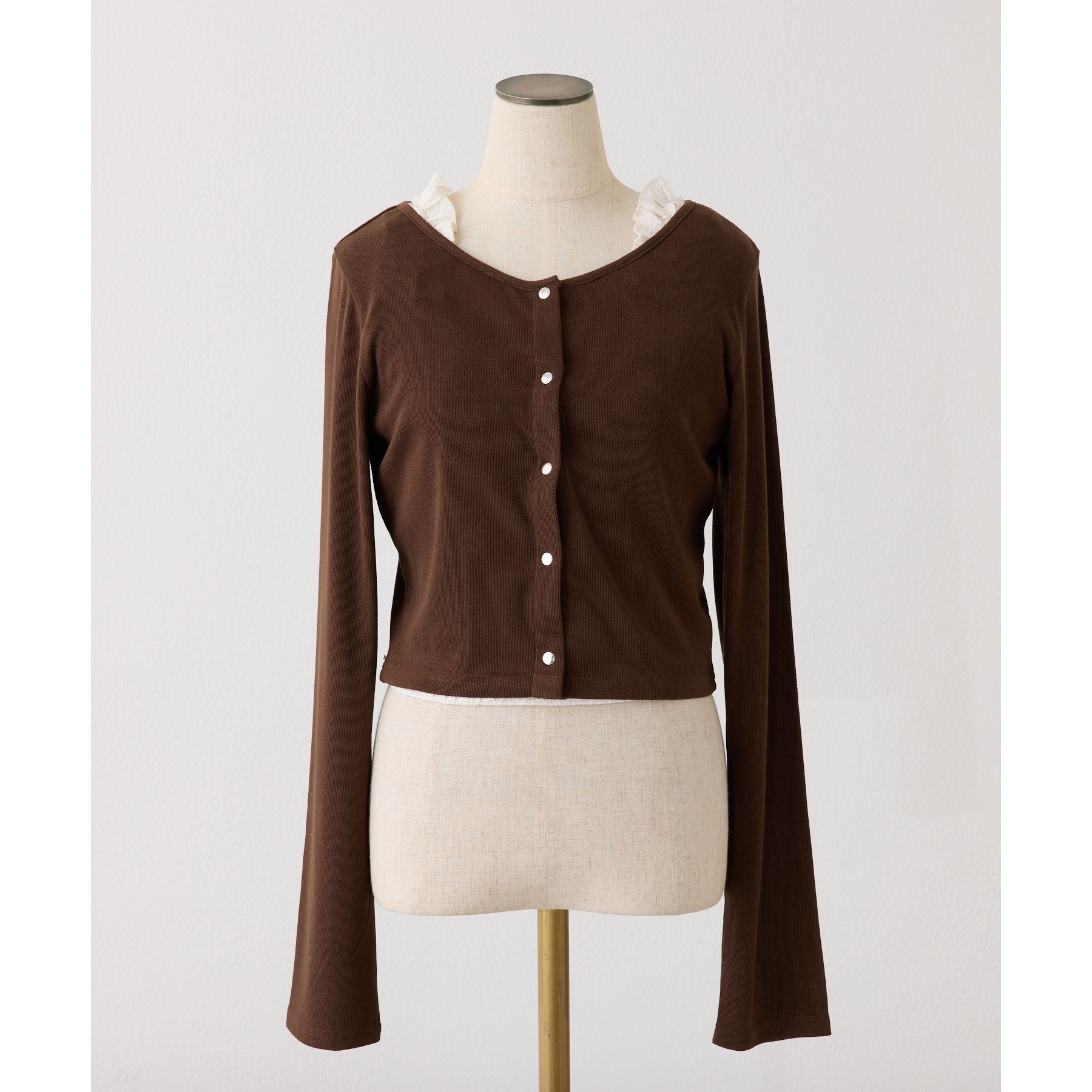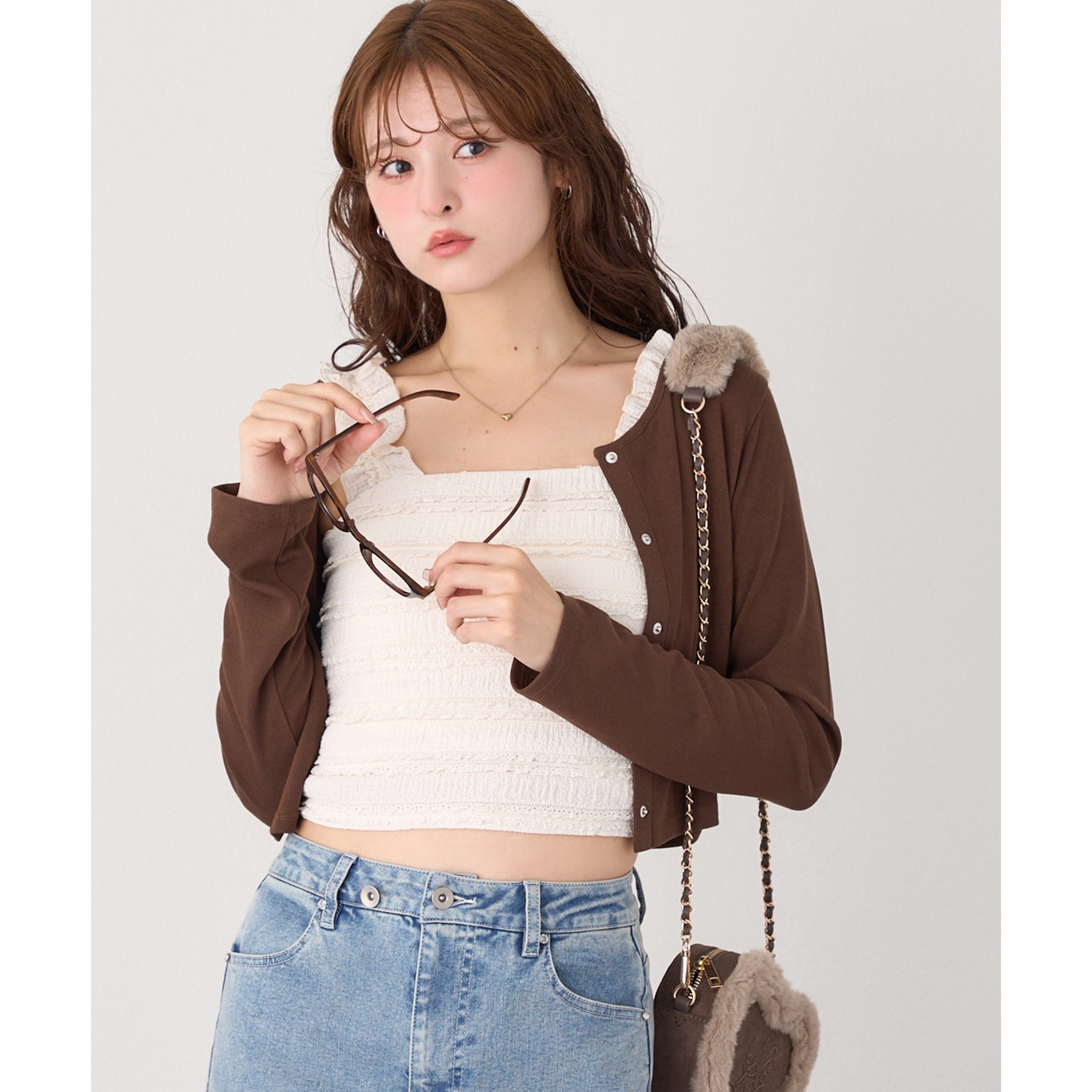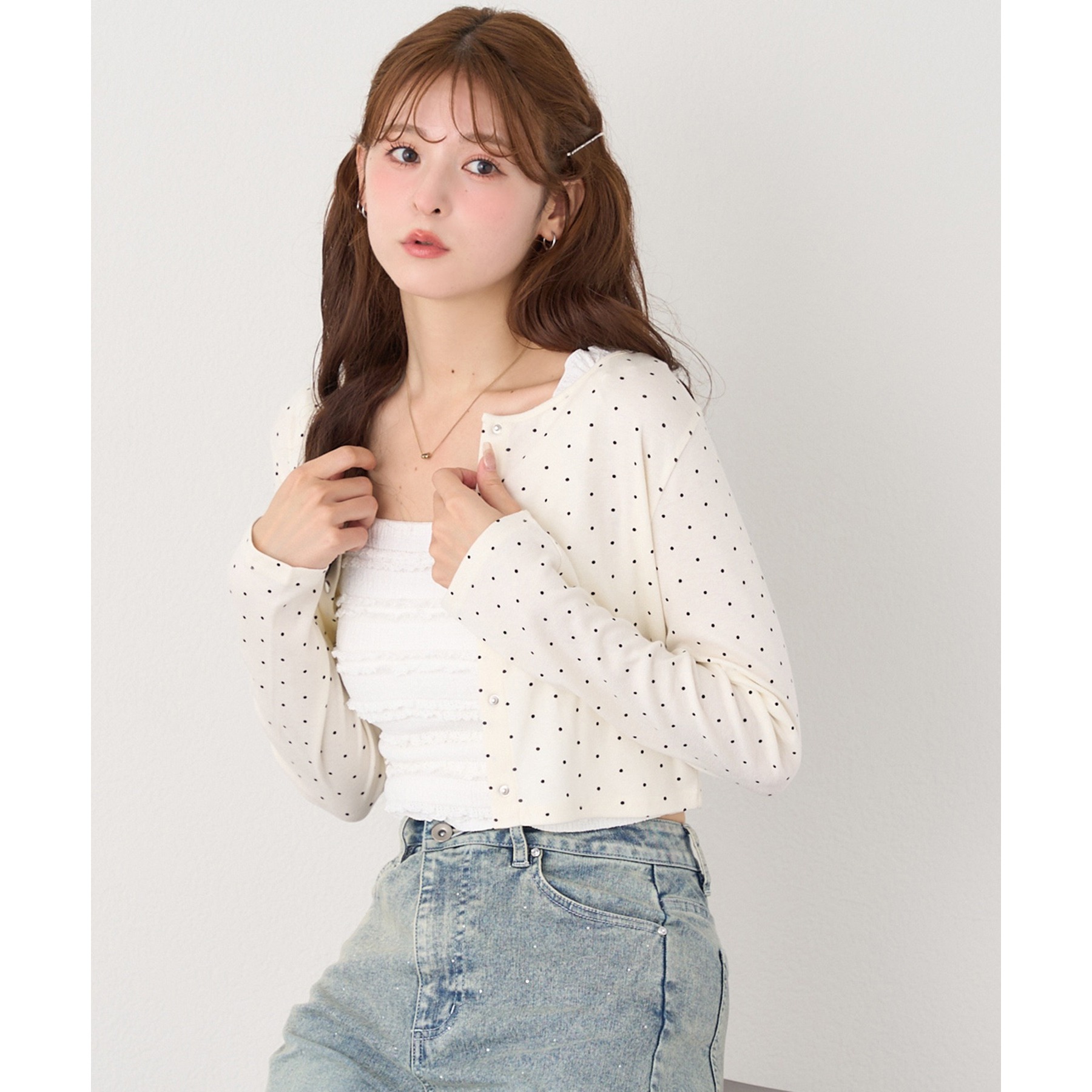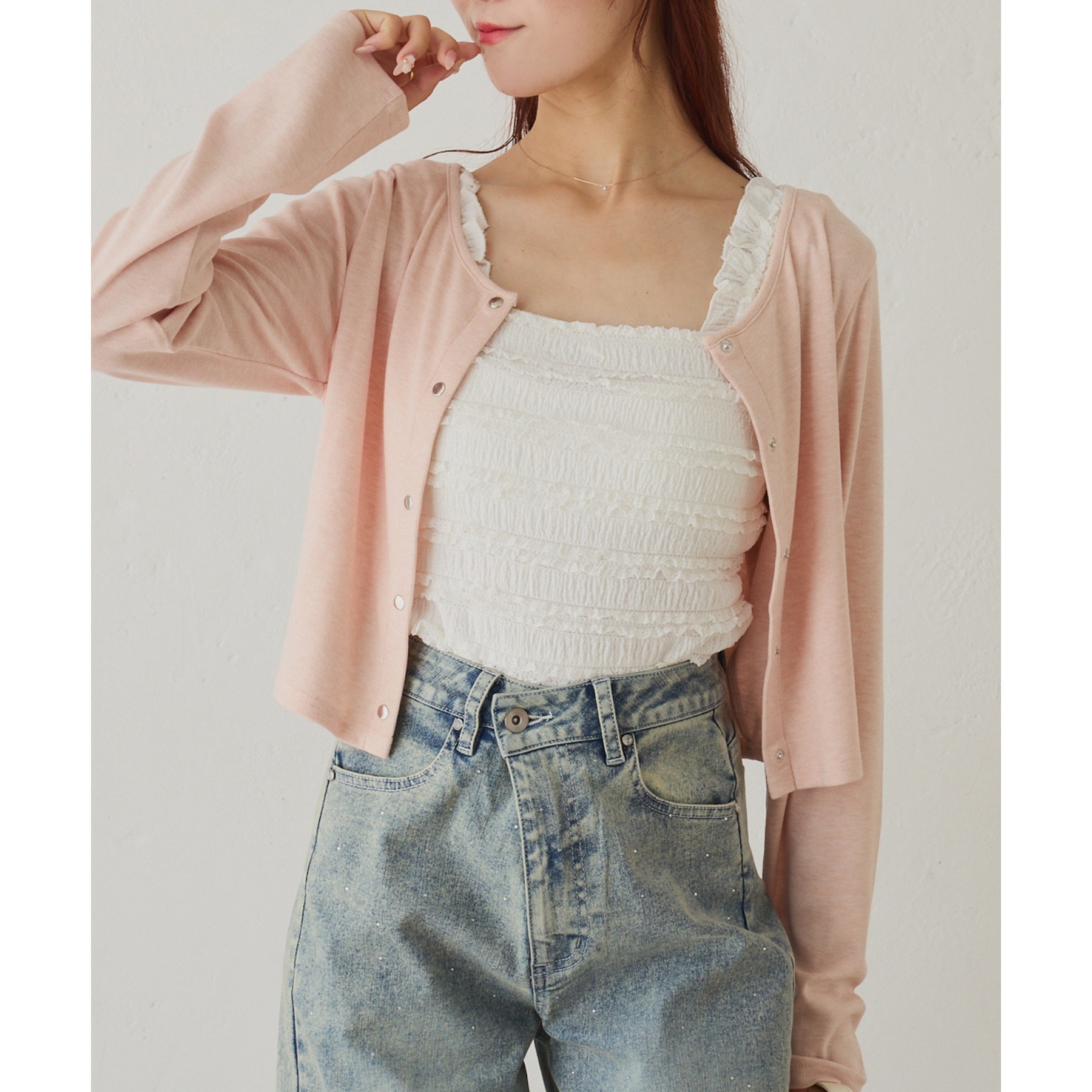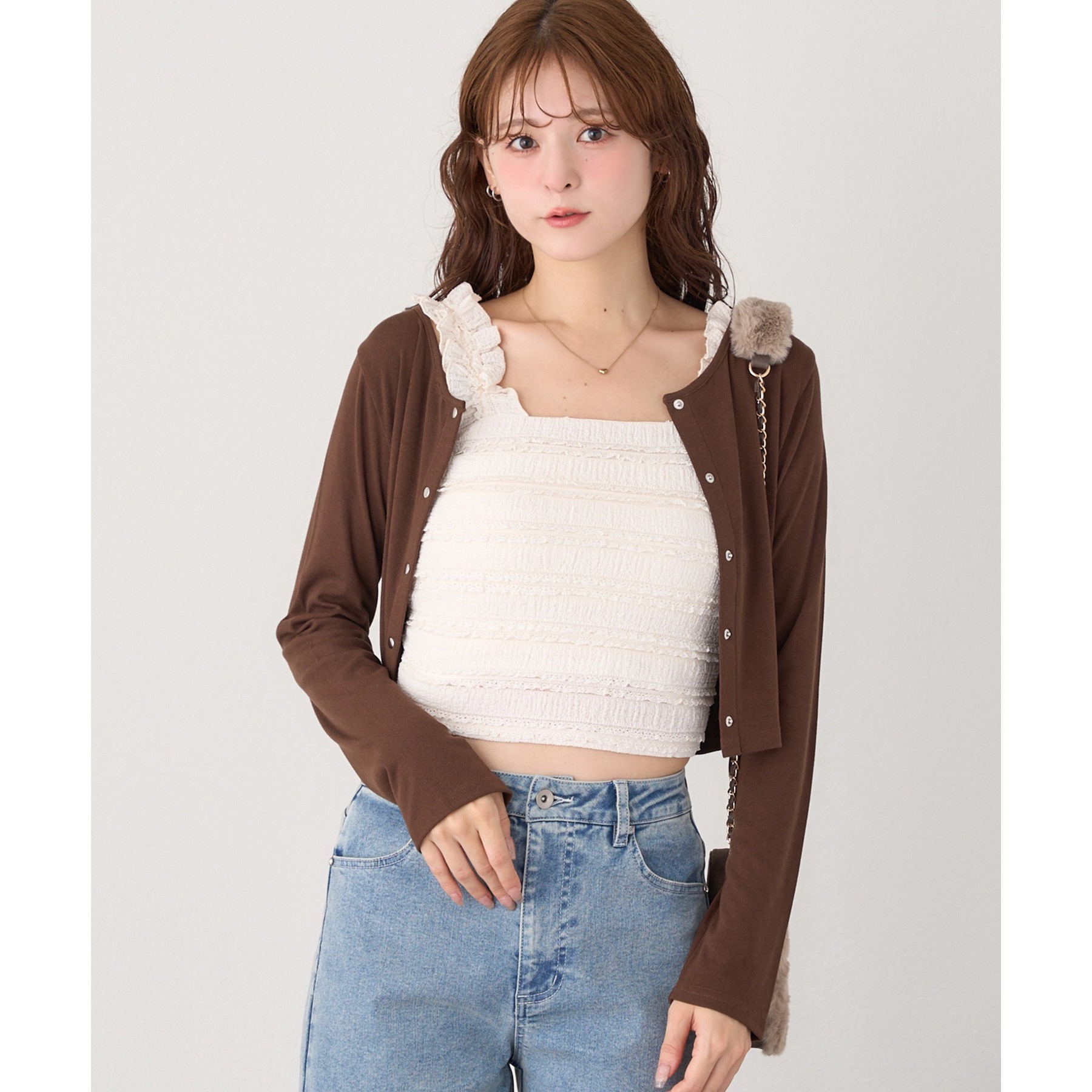 カーディガンはシンプルなデザインなので、ビスチェと合わせるのはもちろん、お手持ちのアイテムとも好相性◎