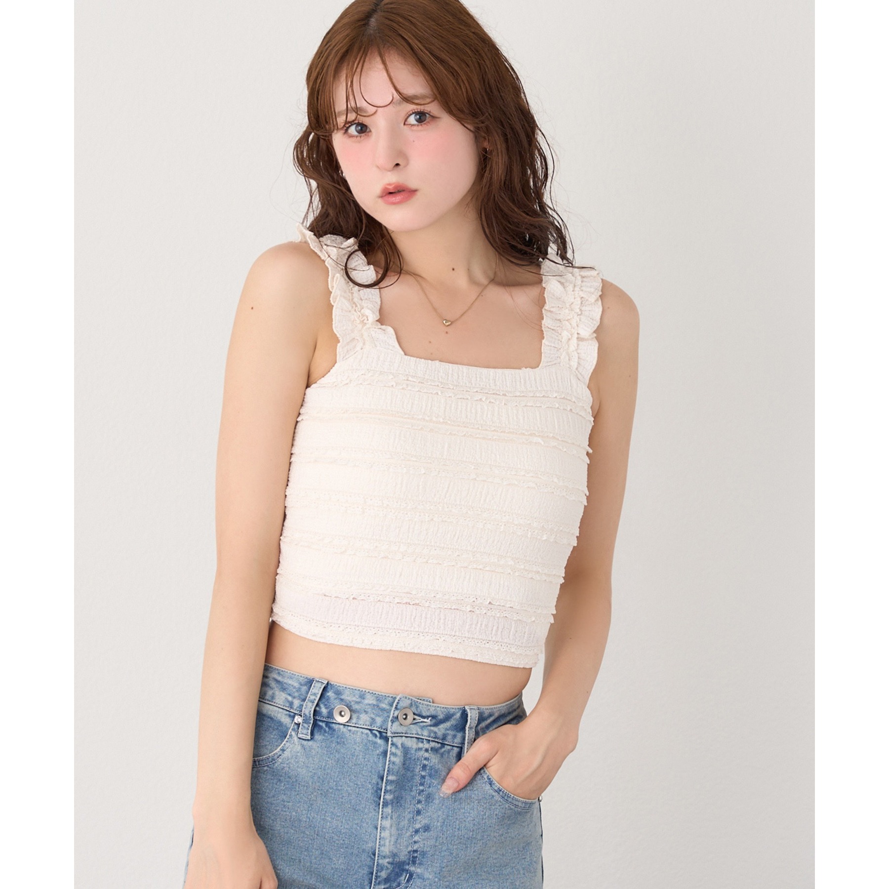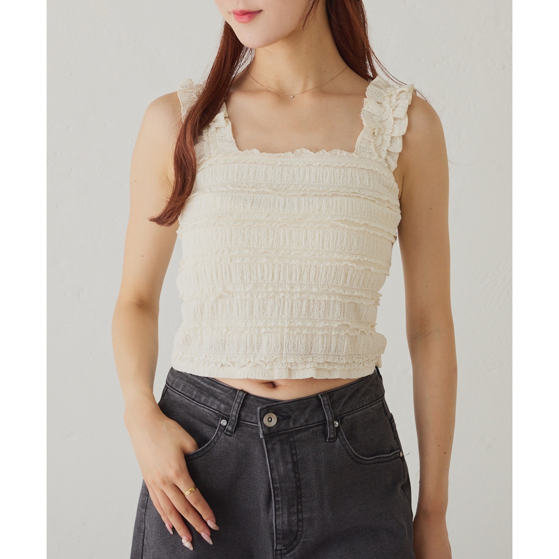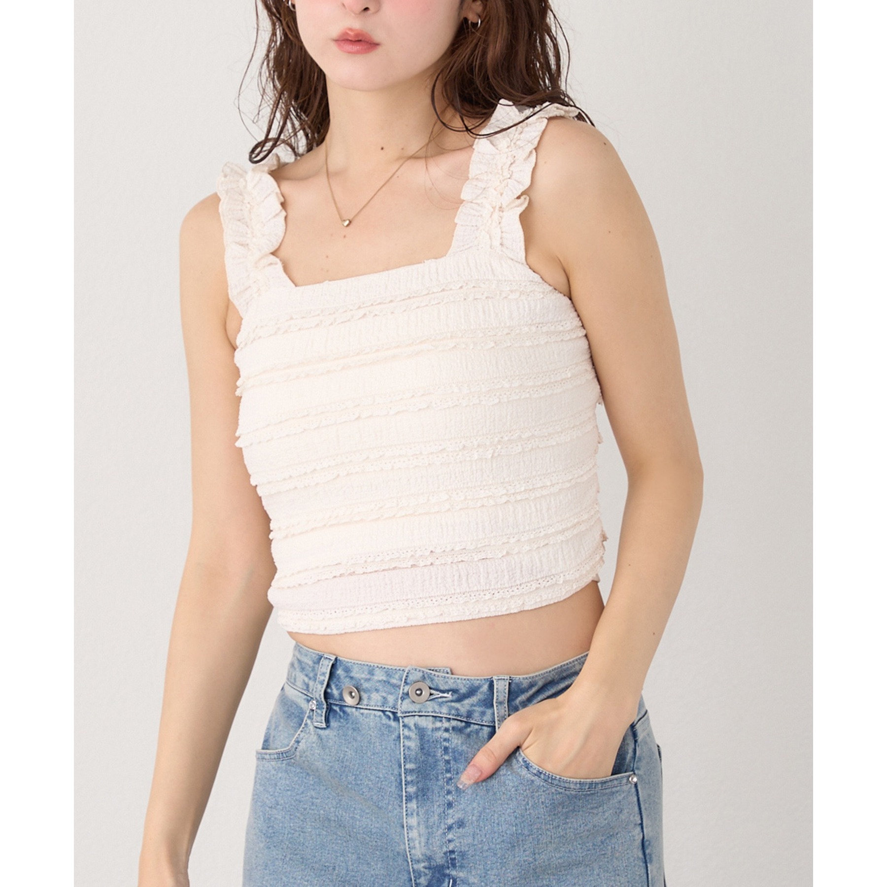 程よくフィット感のあるビスチェは、レイヤードするだけで一気にトレンド感のあるスタイリングに。