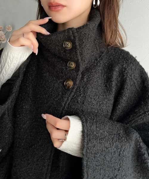 寒い季節にもスタイリッシュに決まるスタンドカラーポンチョショート丈のジャケットコート。