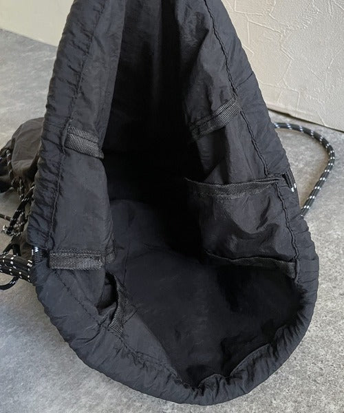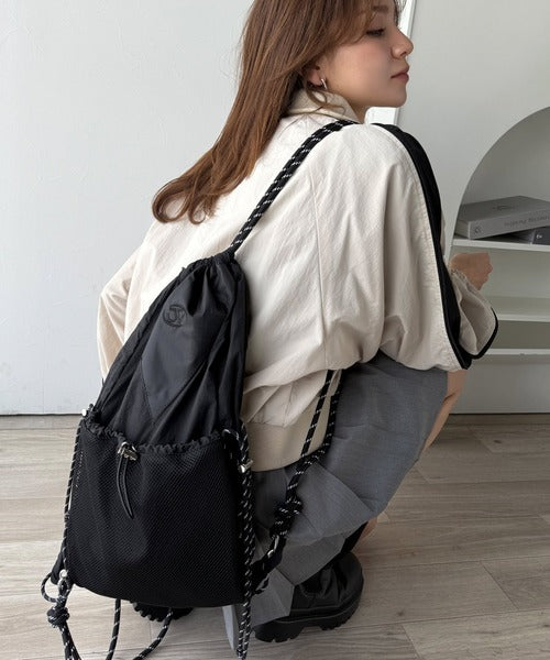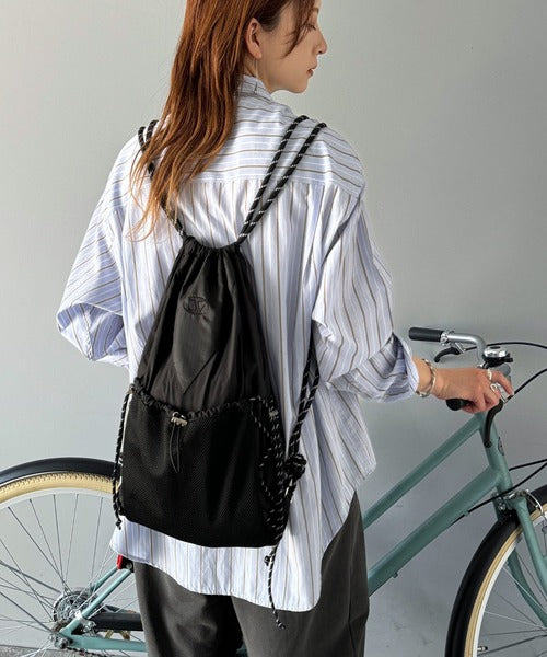 オリジナル刺繍とスポーティーなサイドコードが印象的なナップザック。