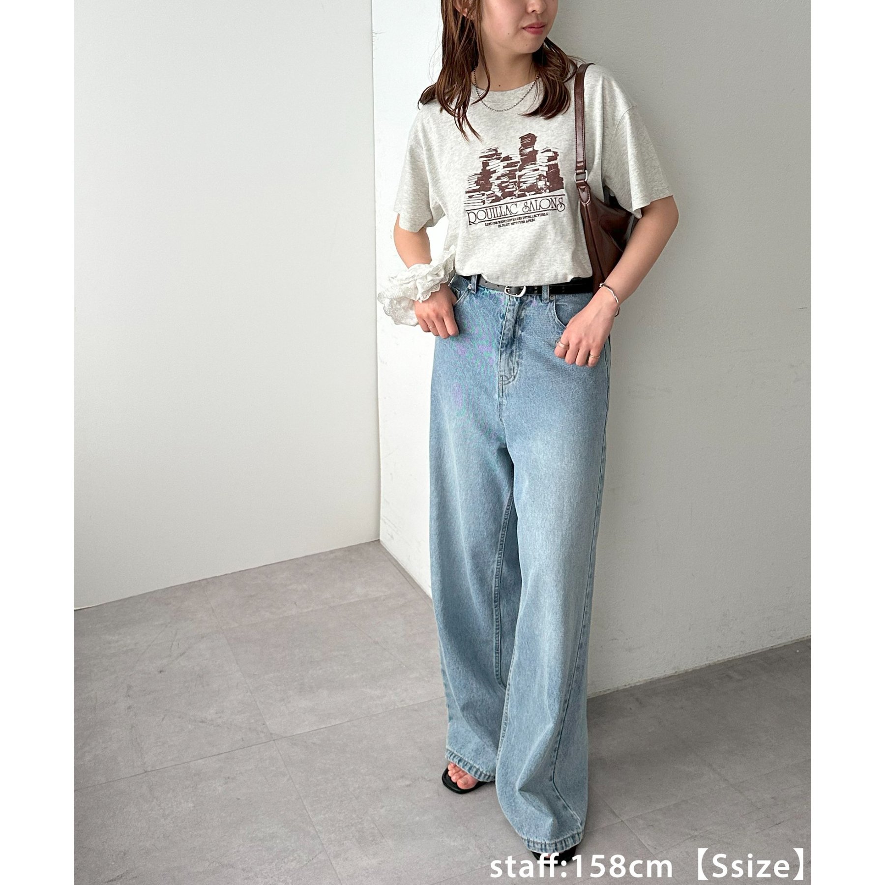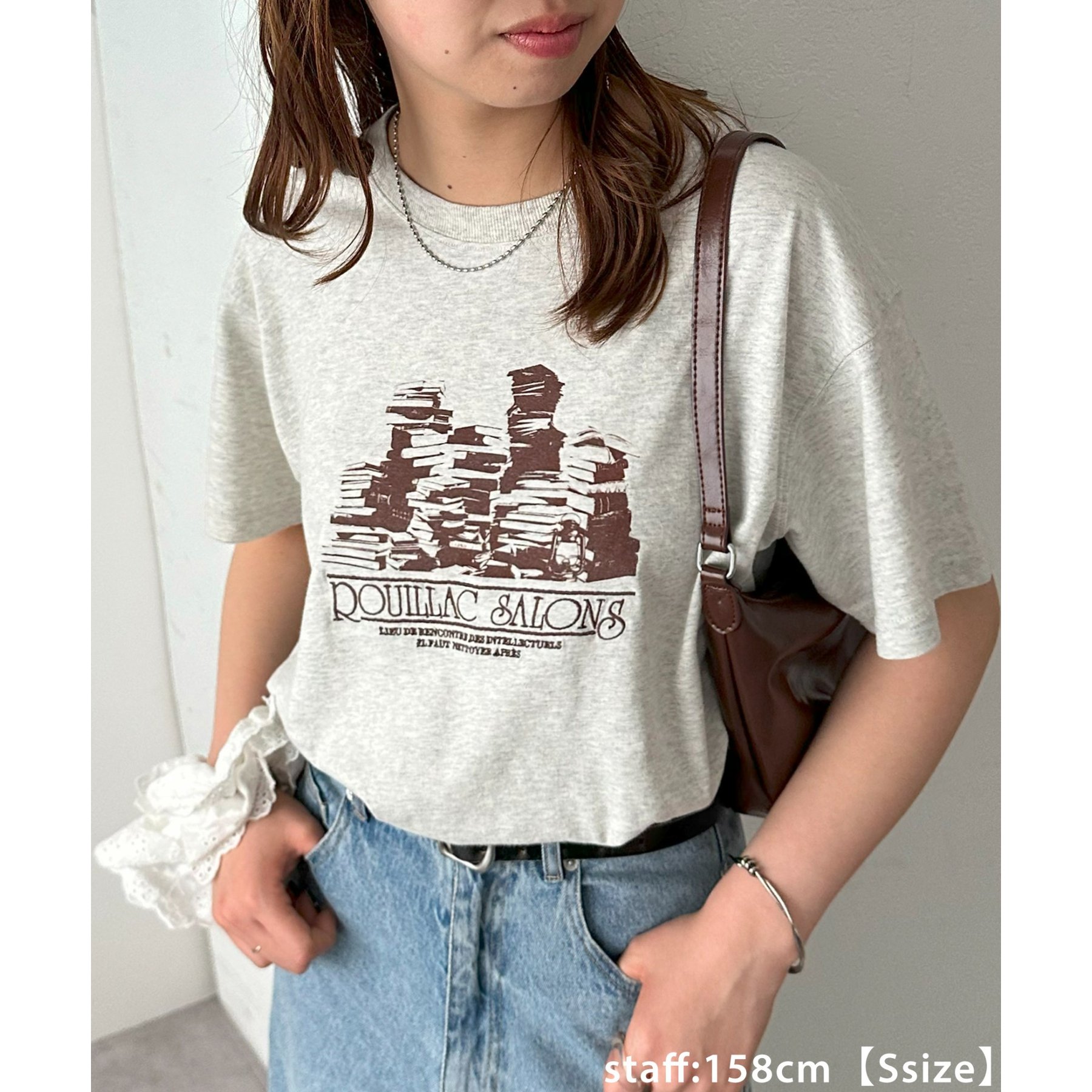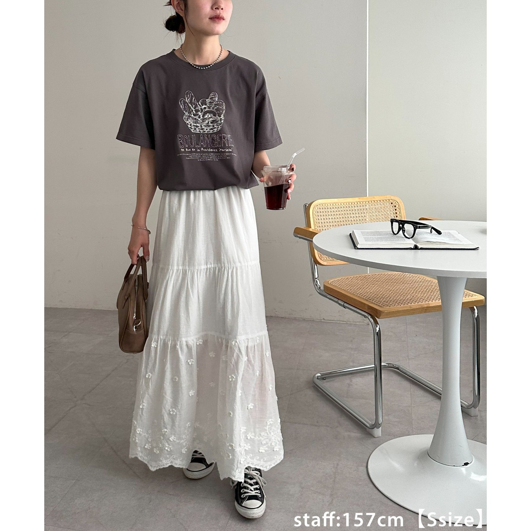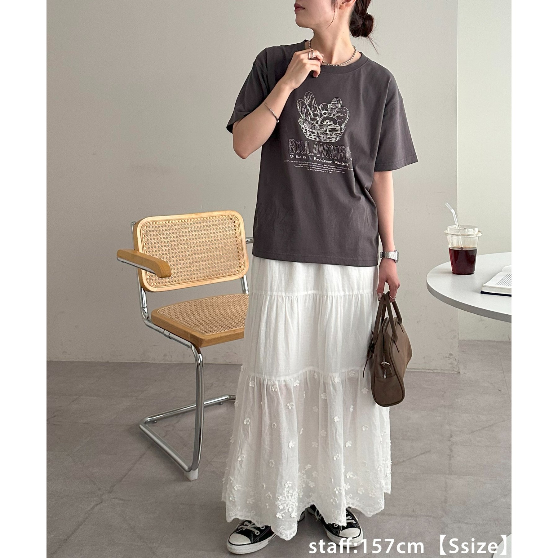 157cmレディーススタッフ(Sサイズ着用):ヒップにかかるくらいの丈感です。刺繍入りのデザインも上品で、大人っぽく着こなせます◎