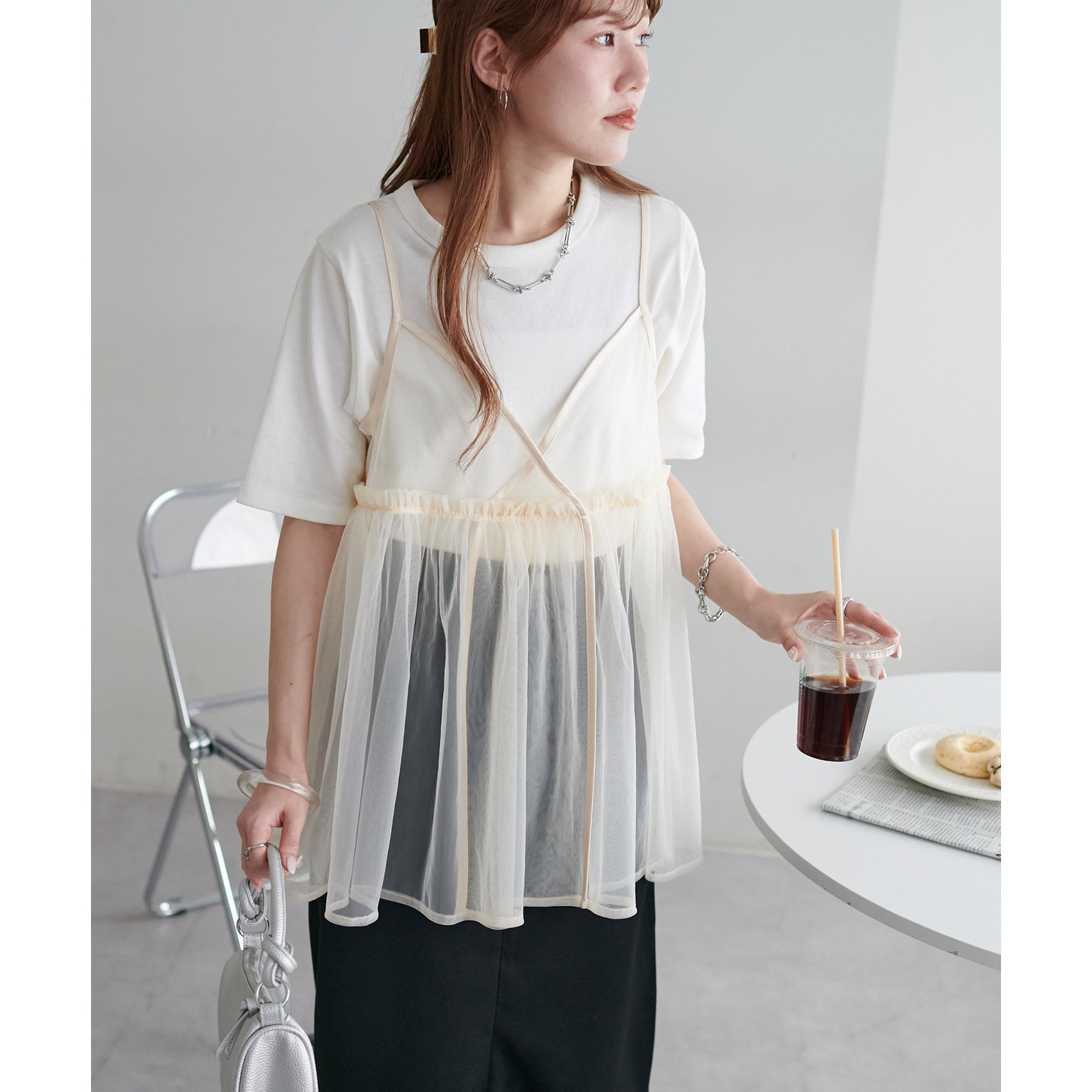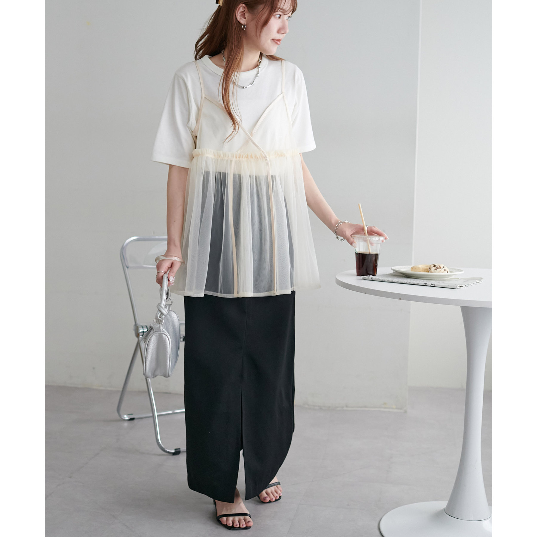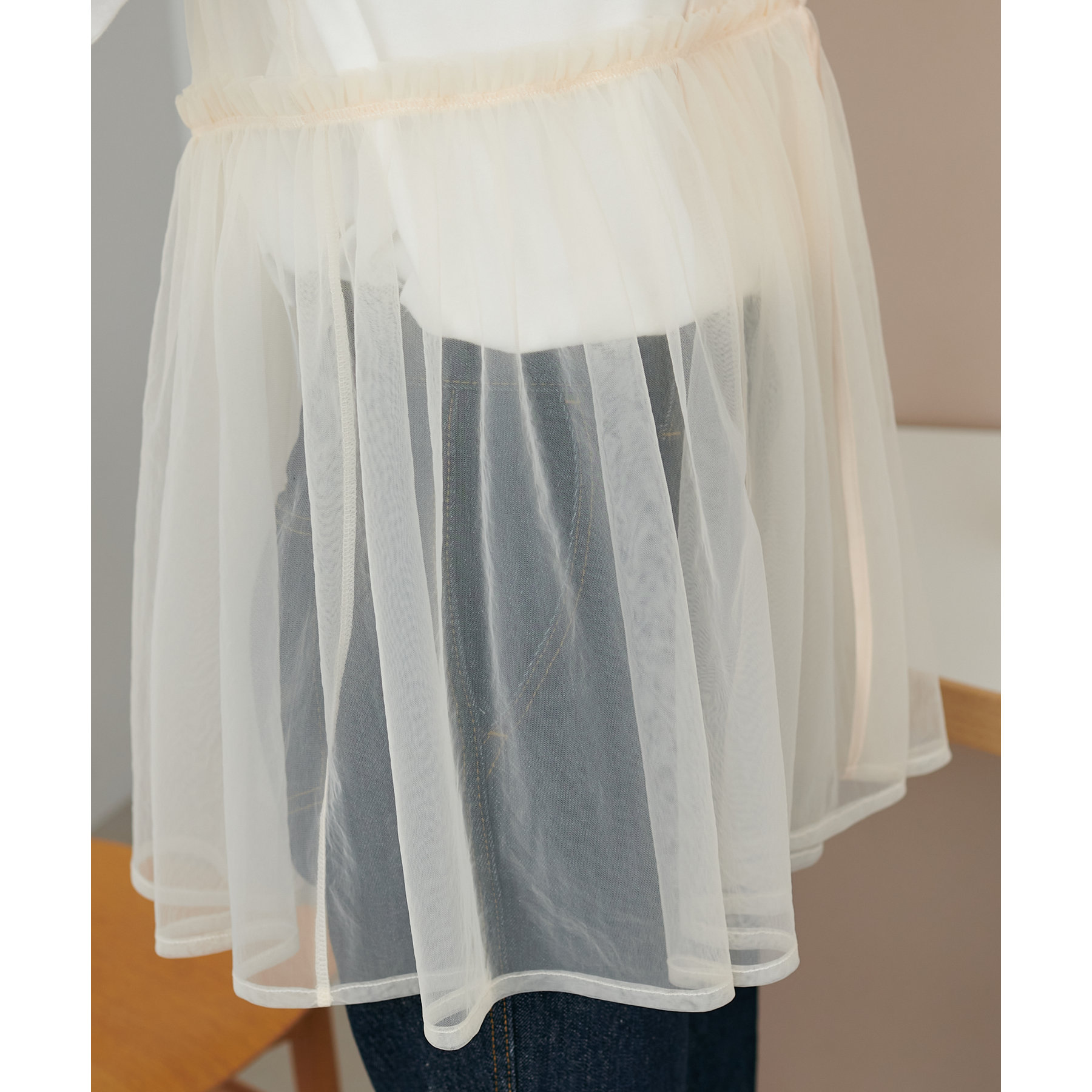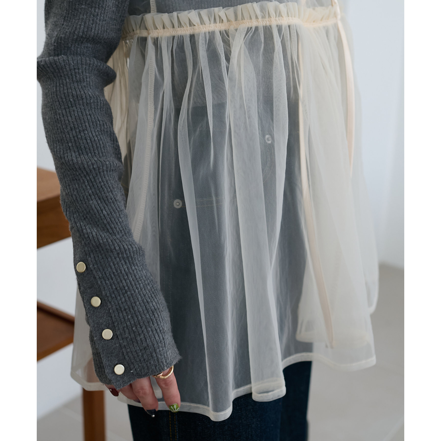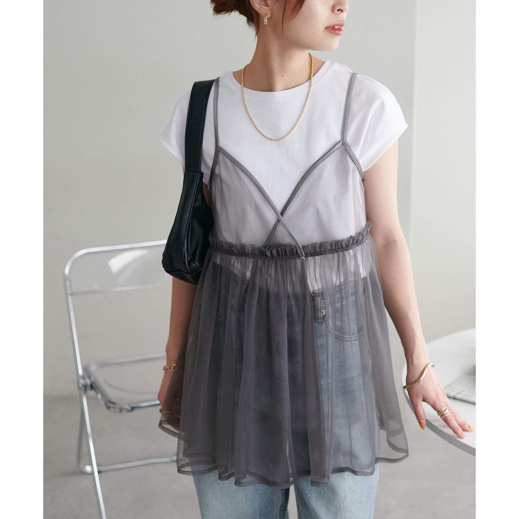 透け感のあるチュール素材なので、シンプルな無地のインナーとはもちろん、あえてプリントTシャツやロゴTシャツを合わせるのもおすすめ。秋冬はニットに重ねて、オールシーズン着て頂けます。