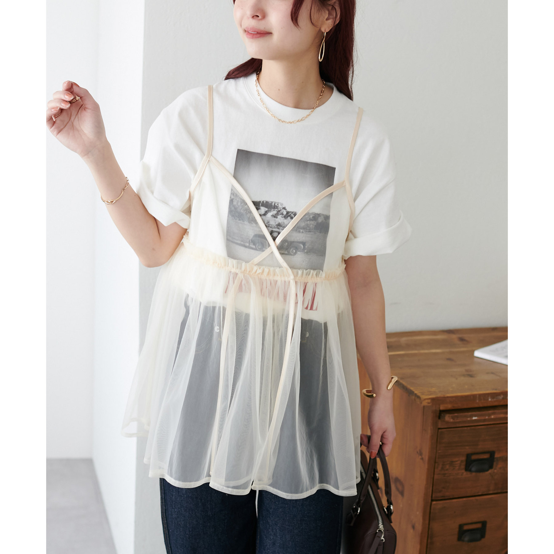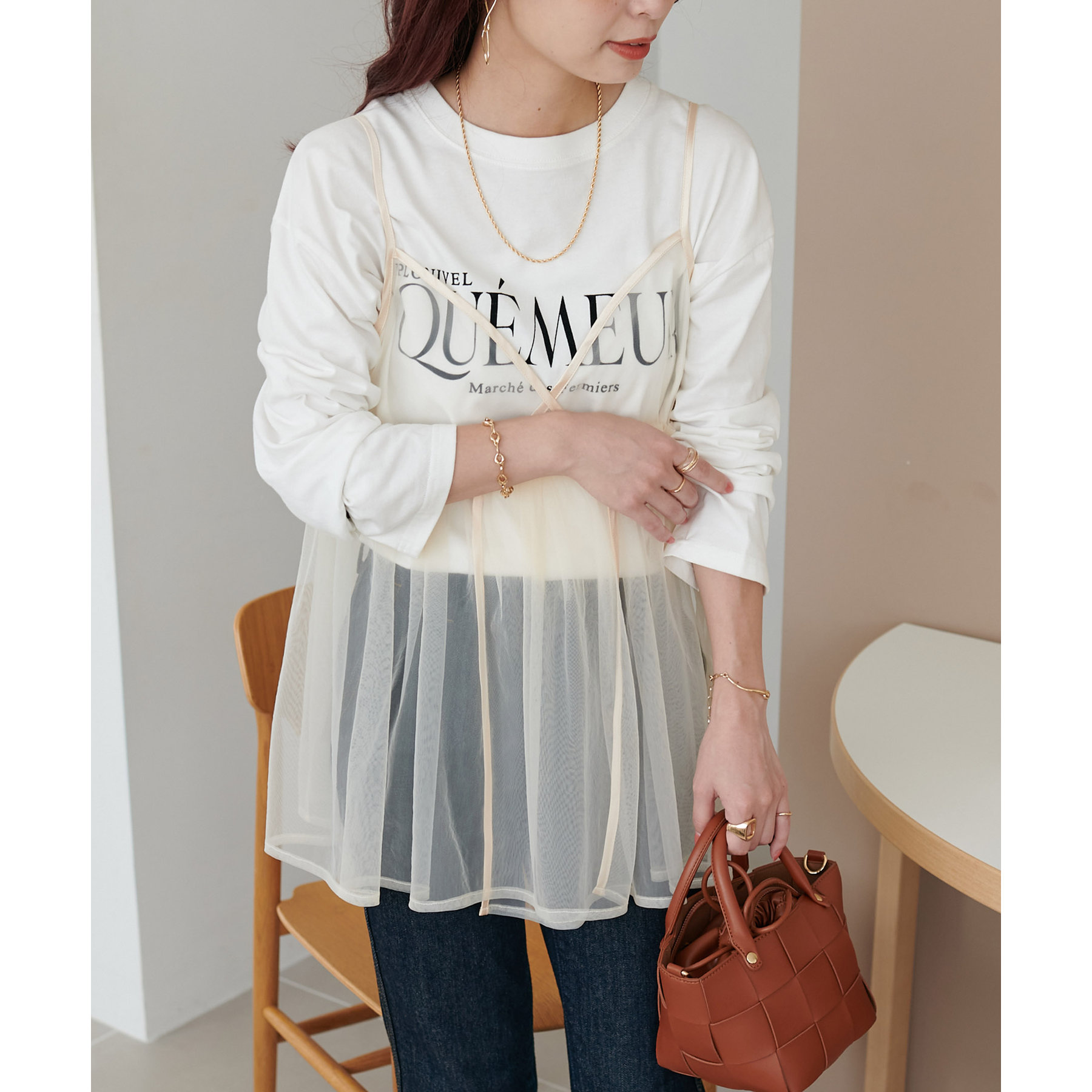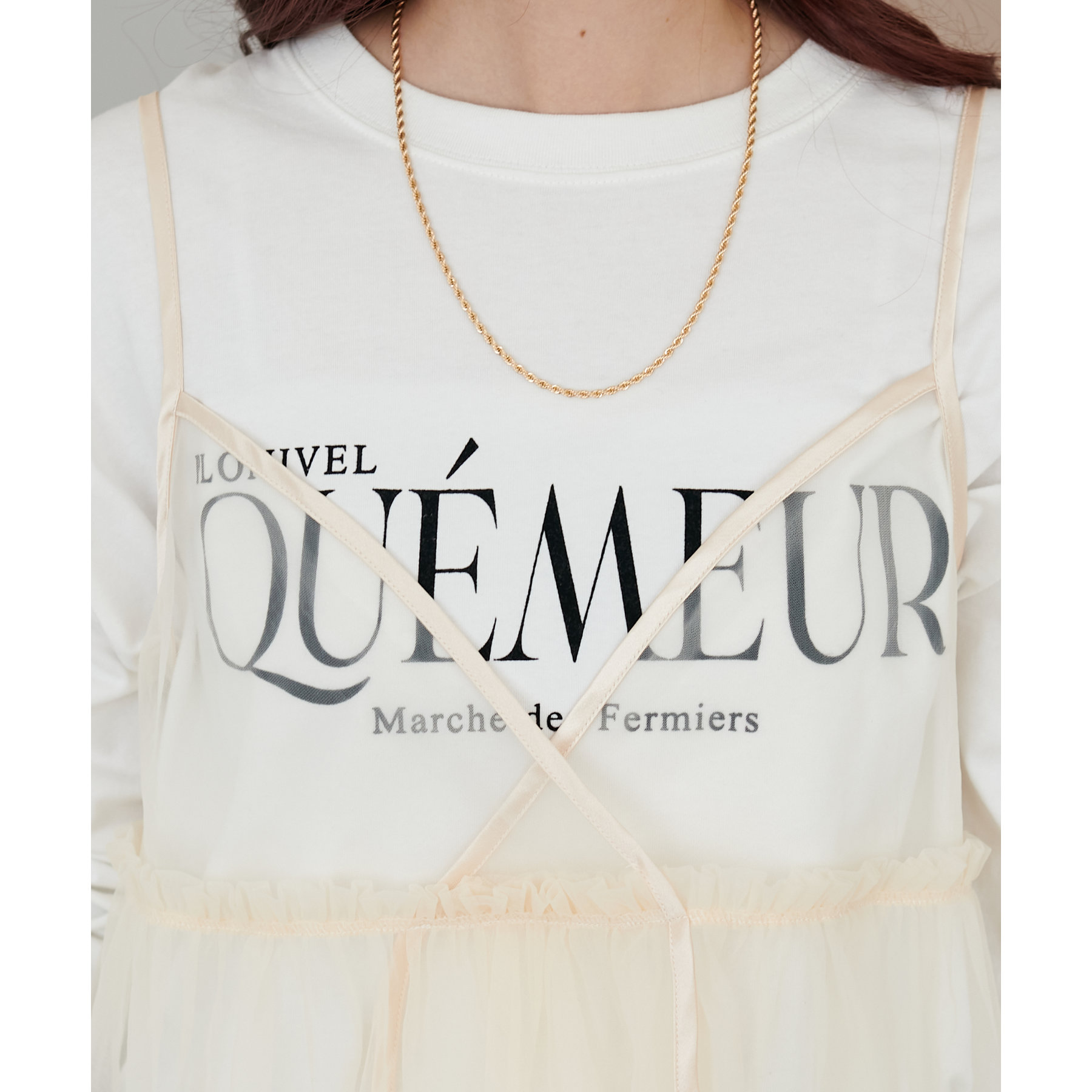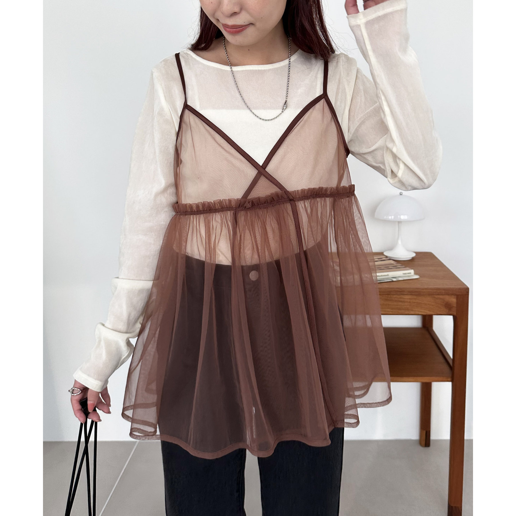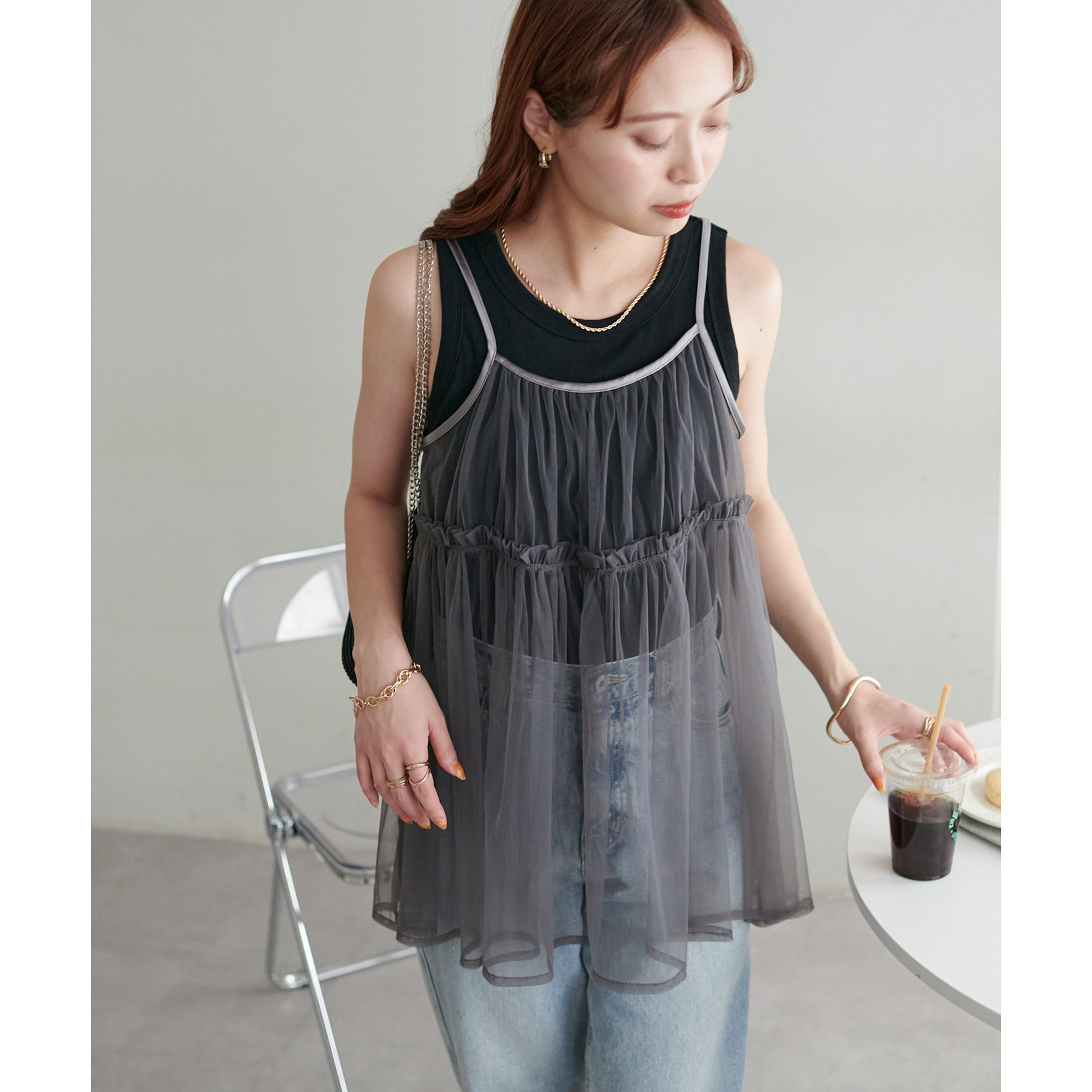 透け感のあるチュール素材なので、シンプルな無地のインナーとはもちろん、あえてプリントTシャツやロゴTシャツを合わせるのもおすすめ。秋冬はニットに重ねて、オールシーズン着て頂けます。