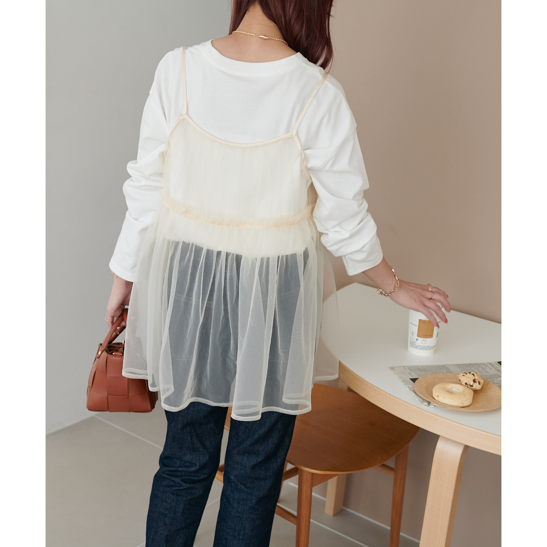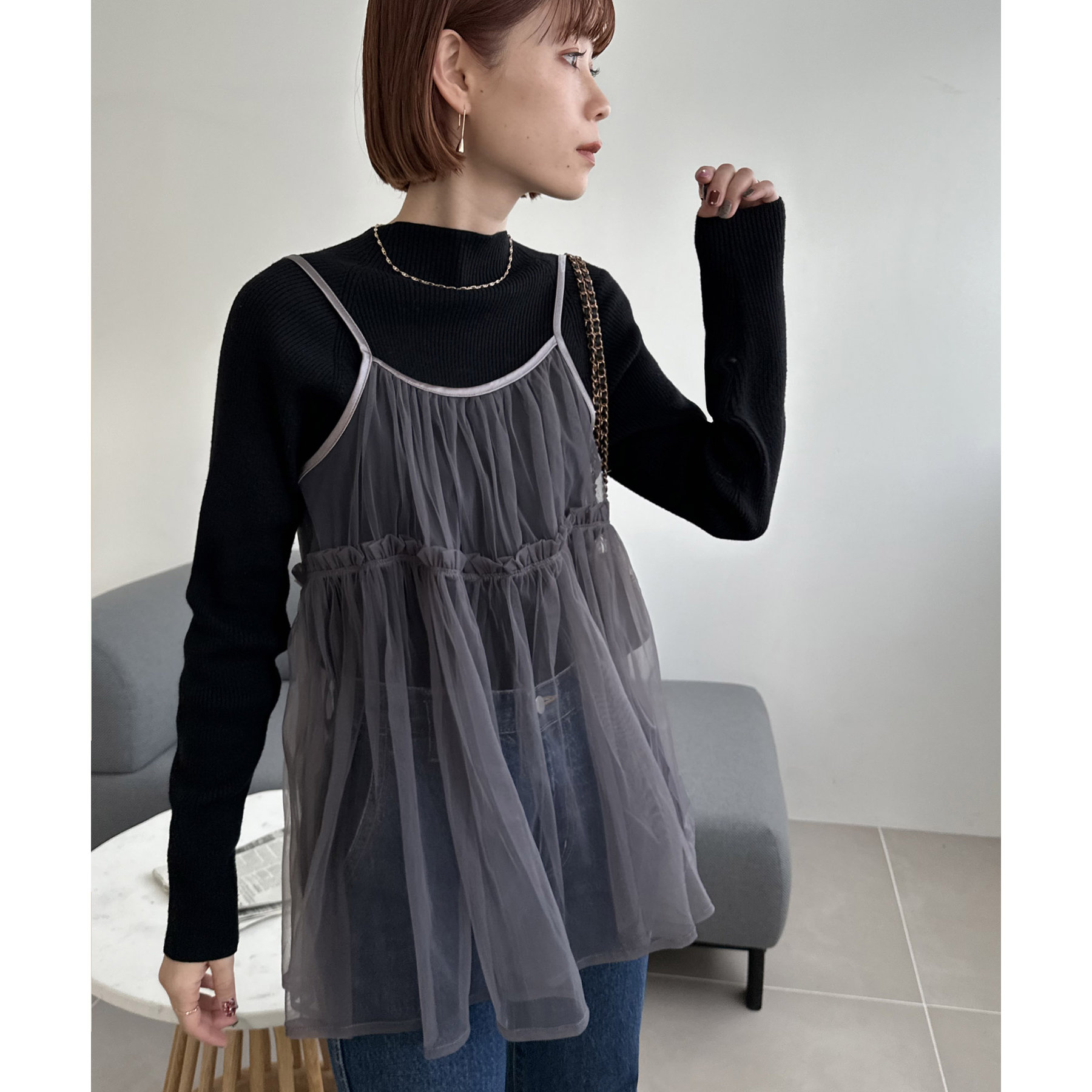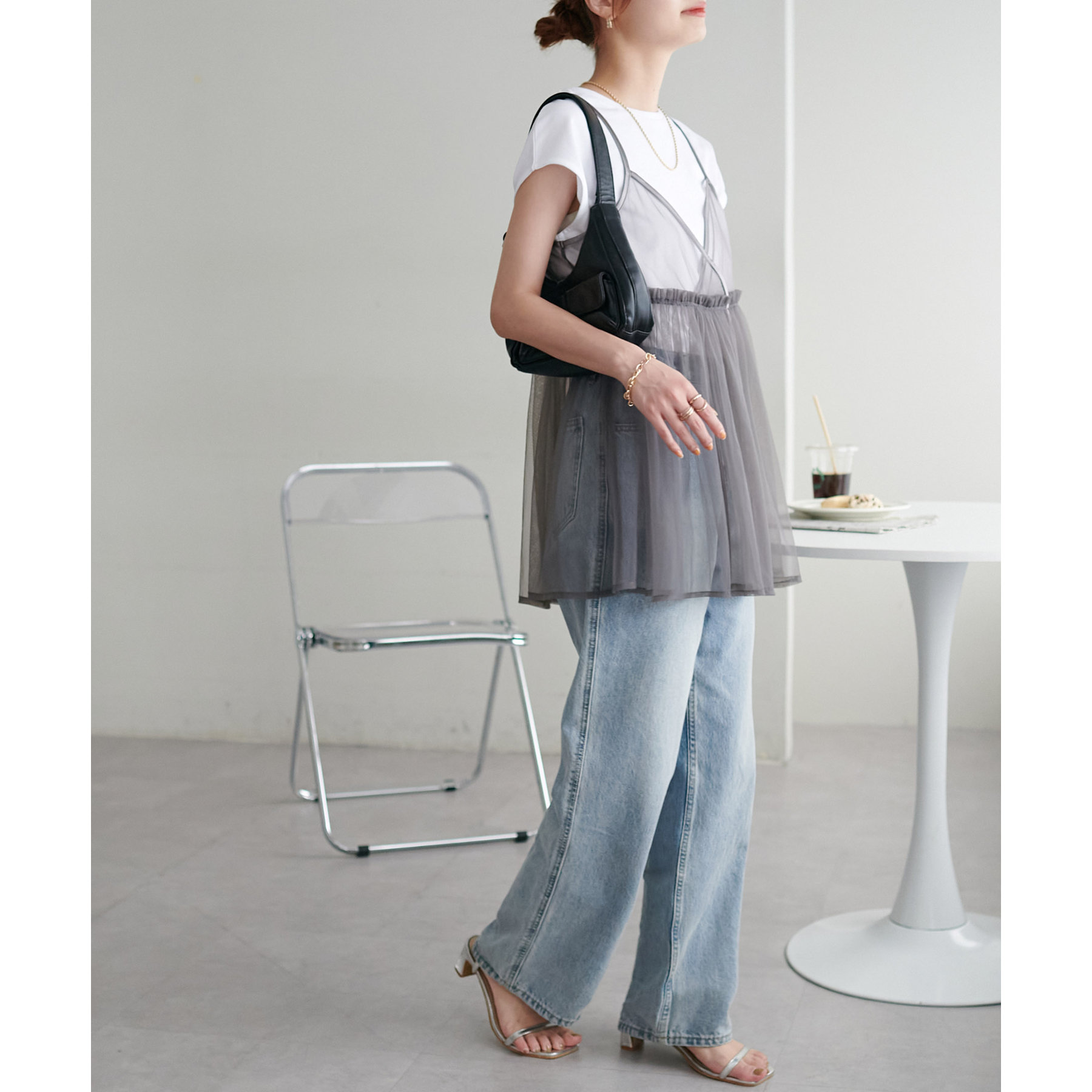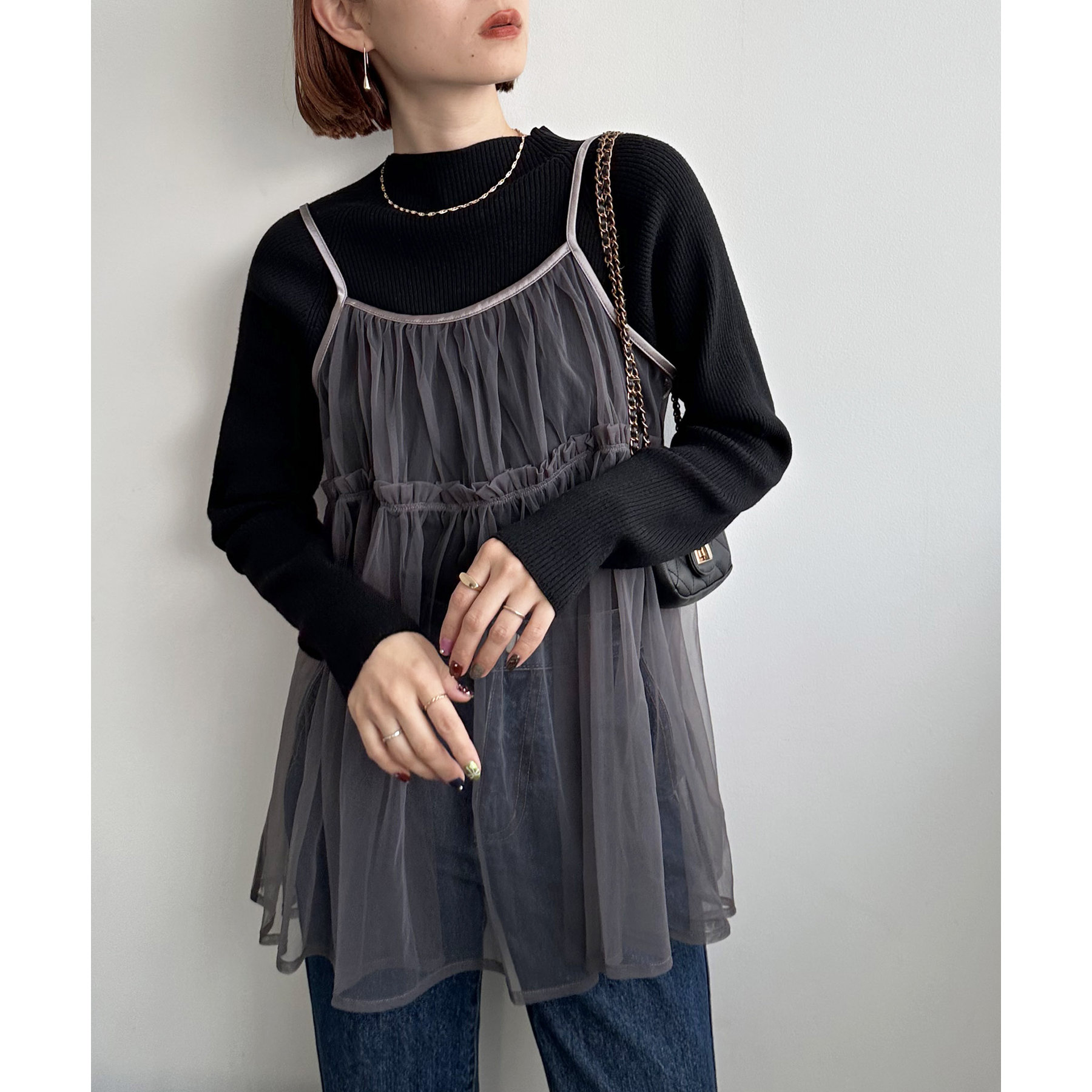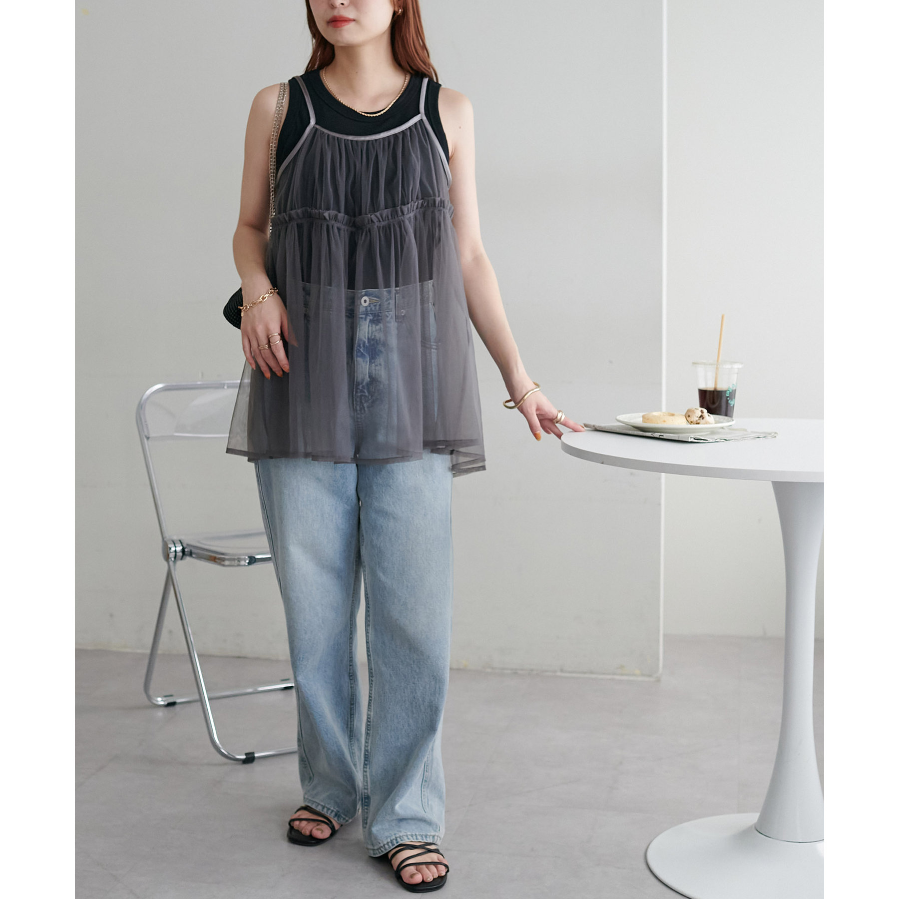透け感のあるチュール素材なので、シンプルな無地のインナーとはもちろん、あえてプリントTシャツやロゴTシャツを合わせるのもおすすめ。秋冬はニットに重ねて、オールシーズン着て頂けます。