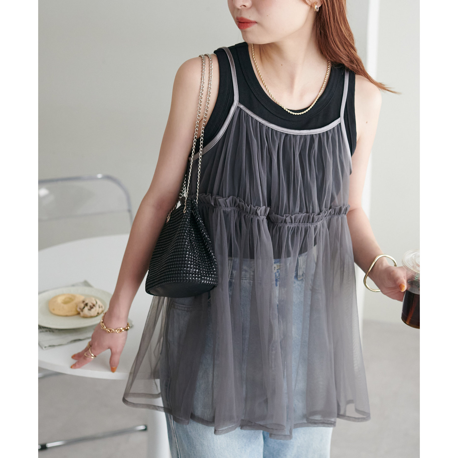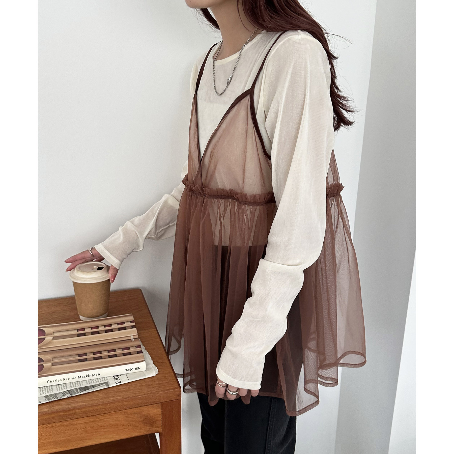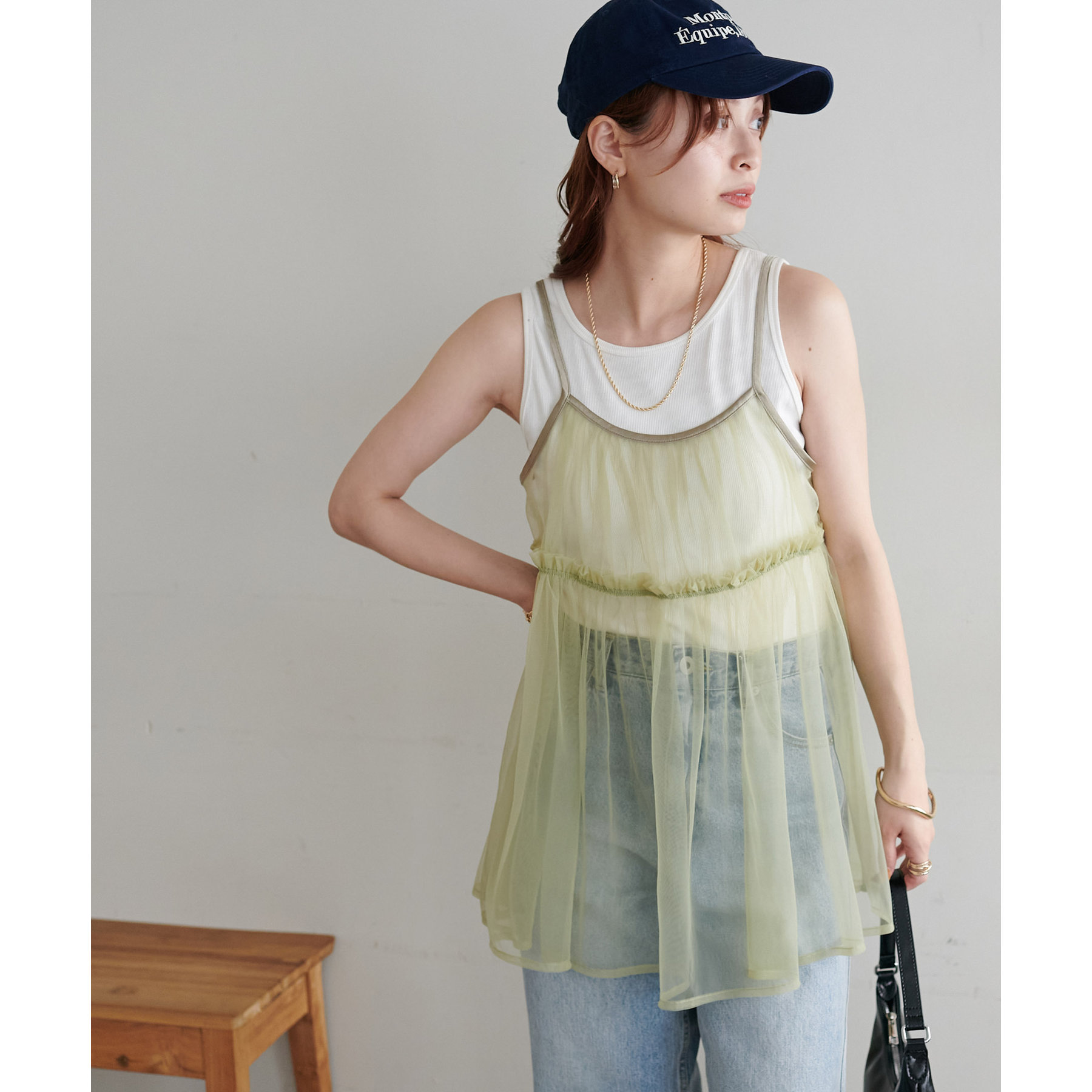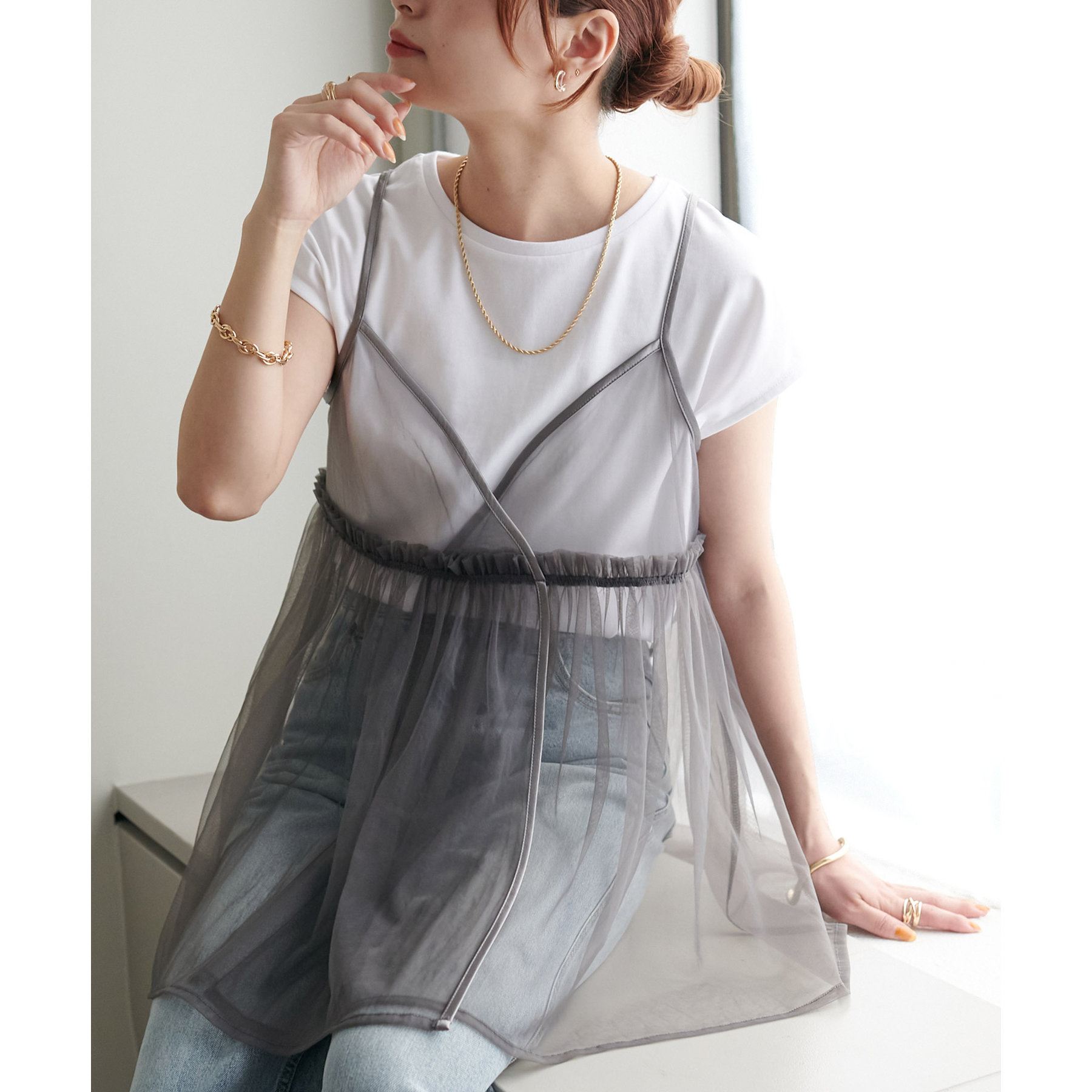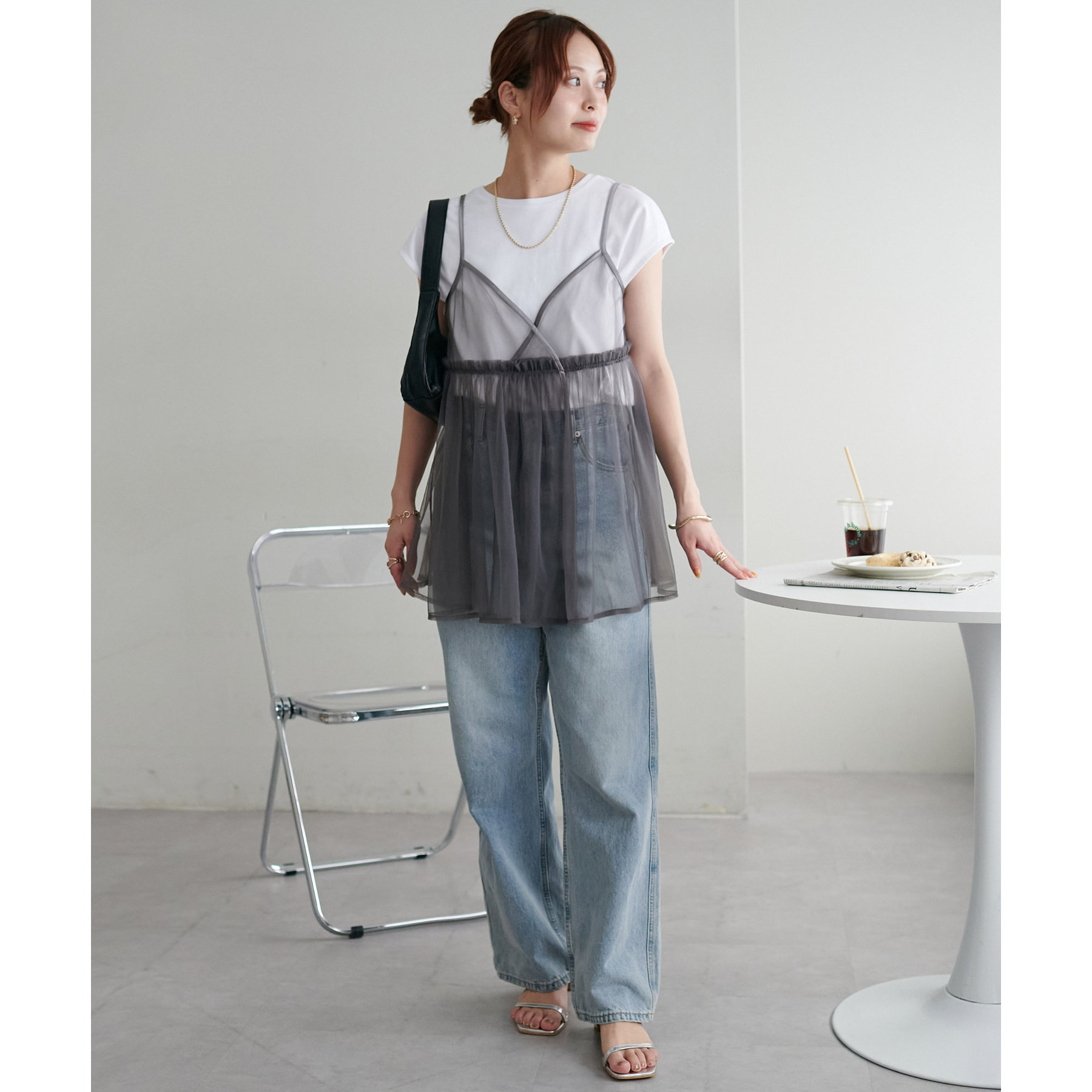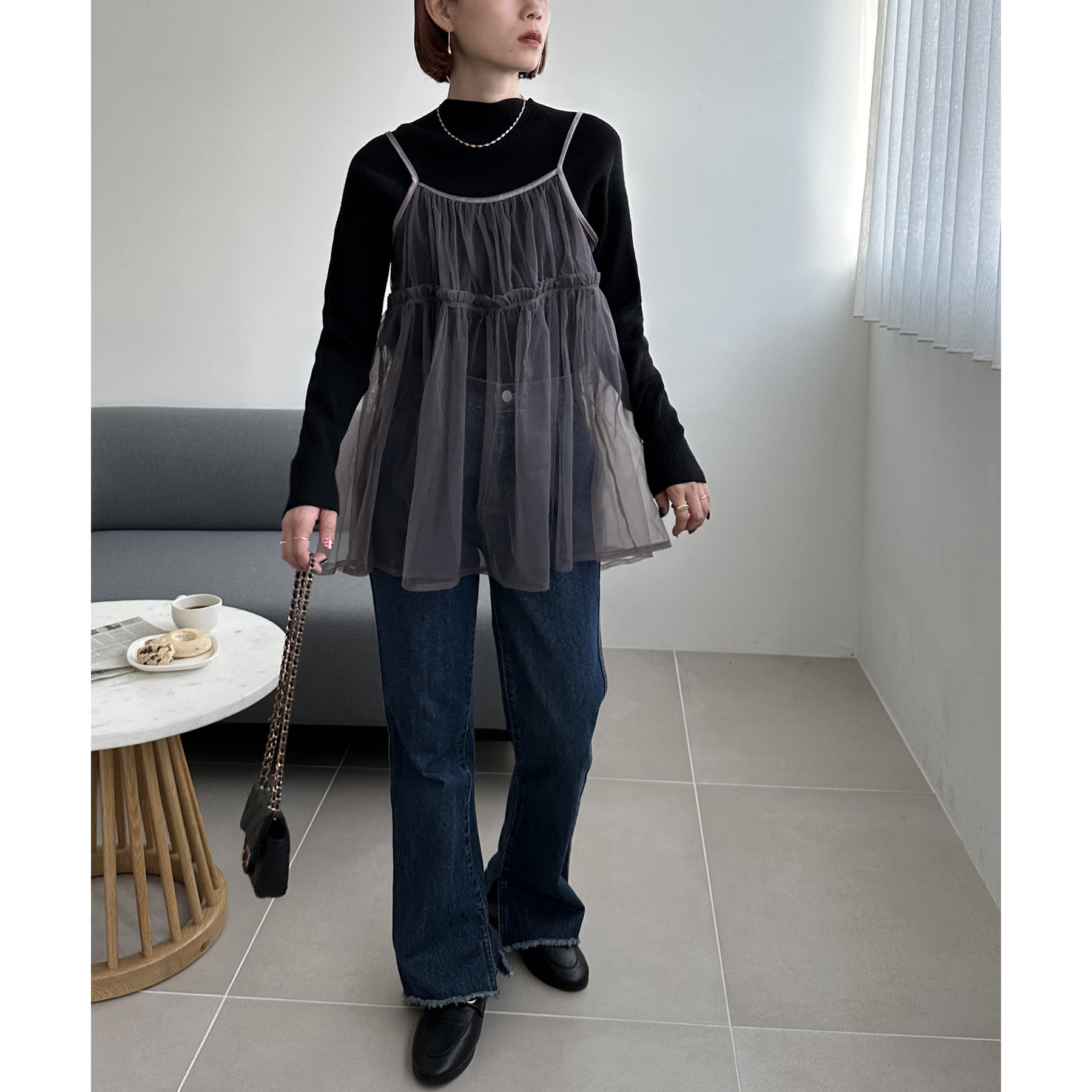 透け感のあるチュール素材なので、シンプルな無地のインナーとはもちろん、あえてプリントTシャツやロゴTシャツを合わせるのもおすすめ。秋冬はニットに重ねて、オールシーズン着て頂けます。