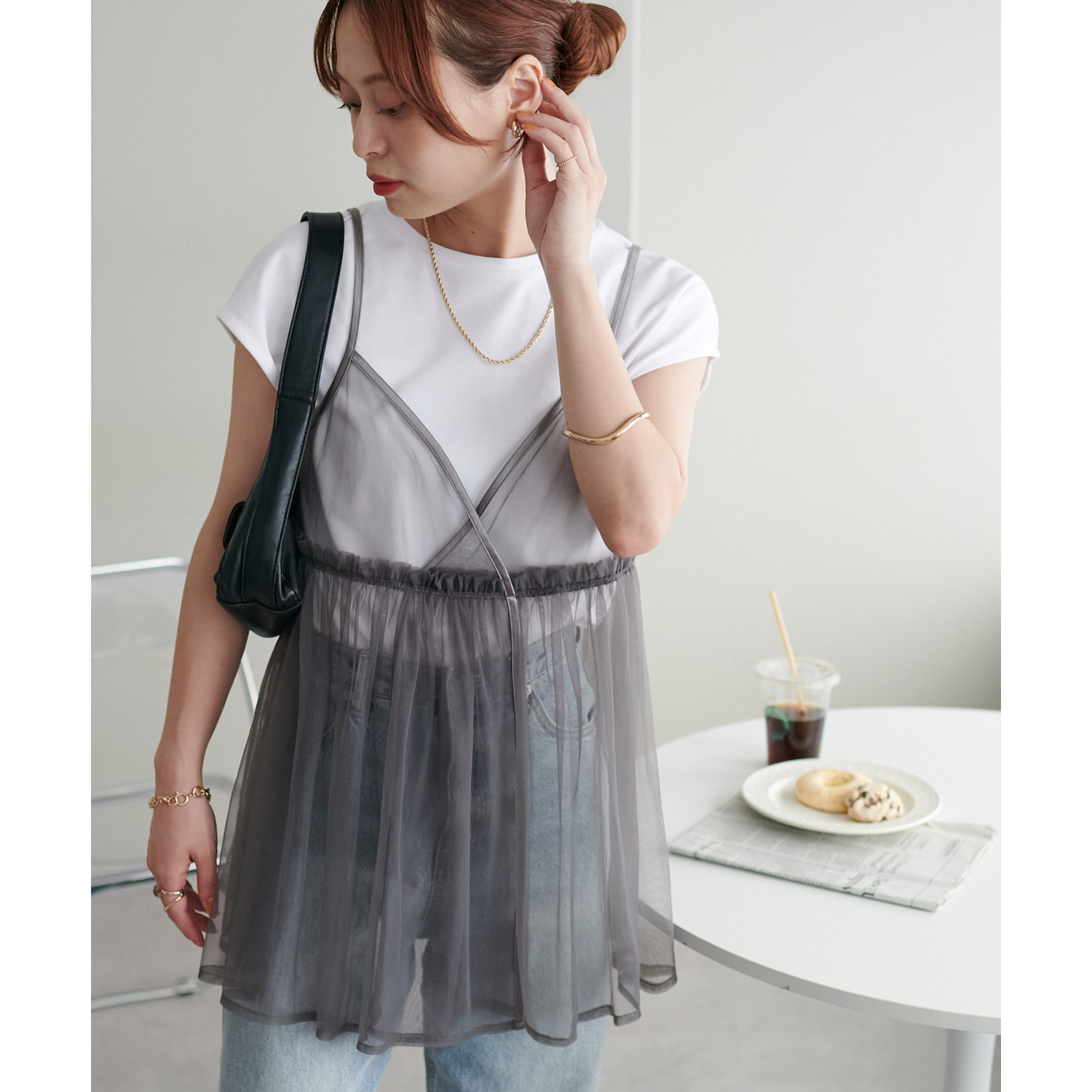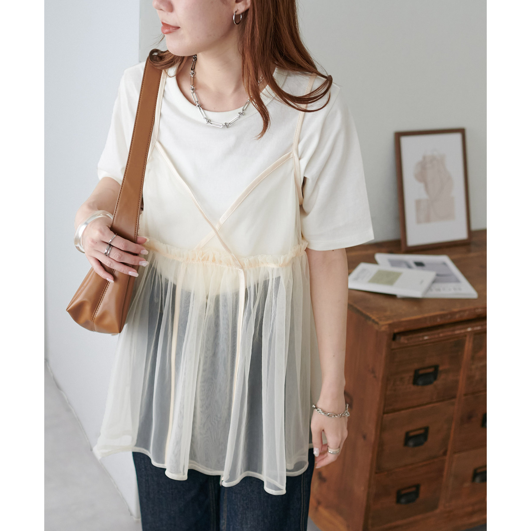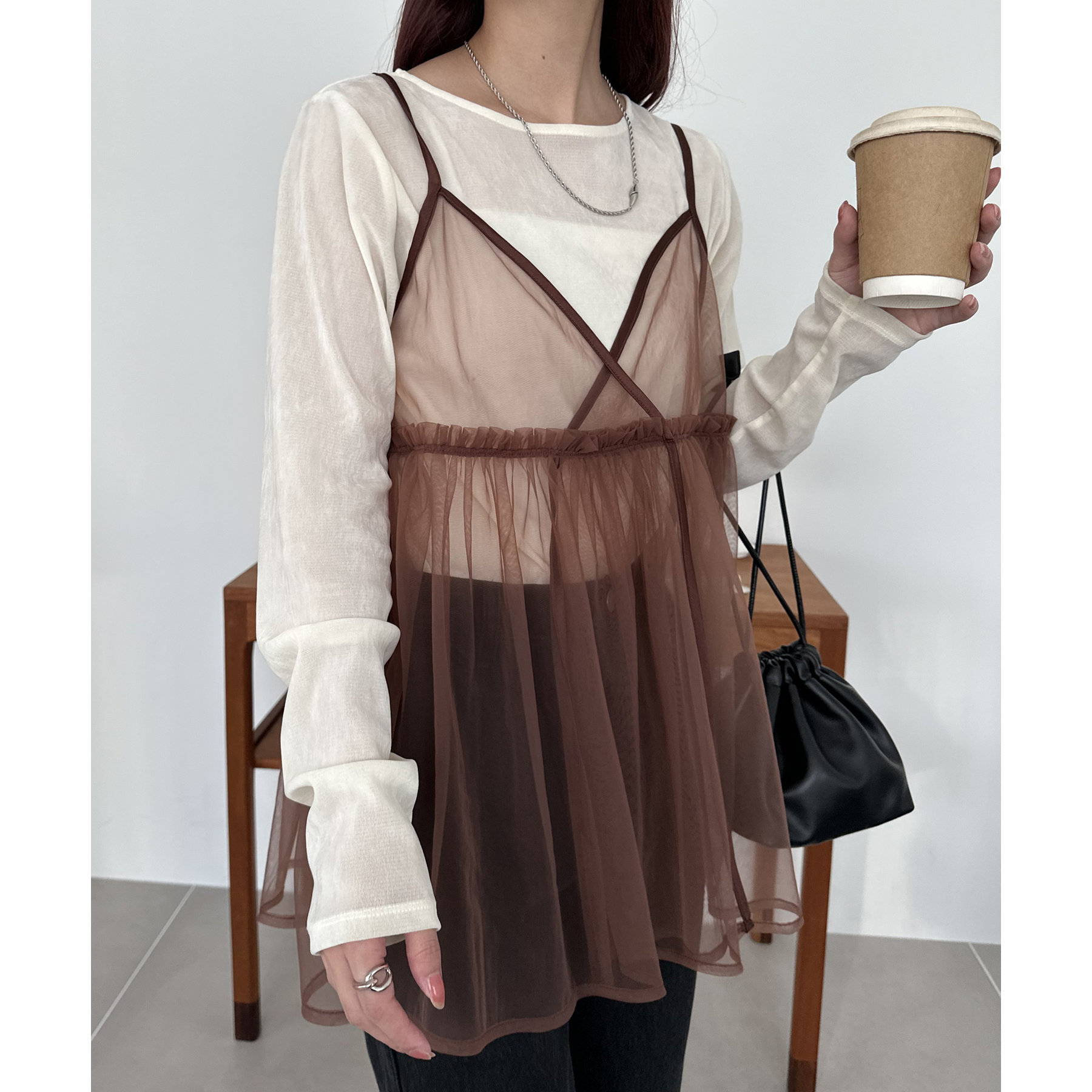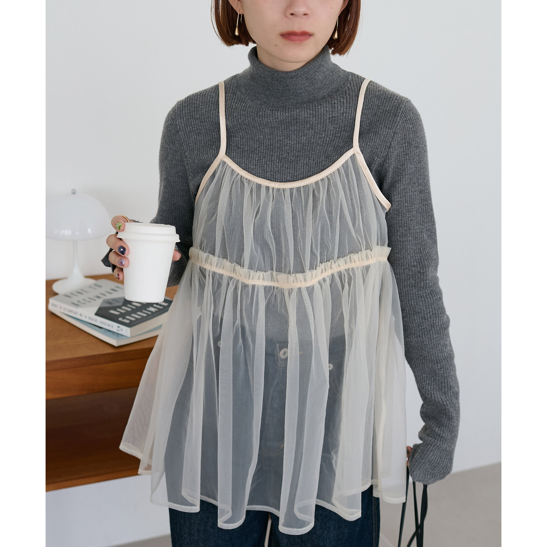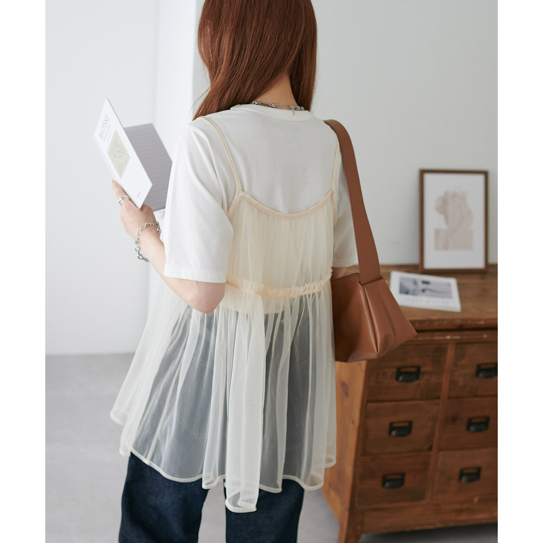 透け感のあるチュール素材なので、シンプルな無地のインナーとはもちろん、あえてプリントTシャツやロゴTシャツを合わせるのもおすすめ。秋冬はニットに重ねて、オールシーズン着て頂けます。