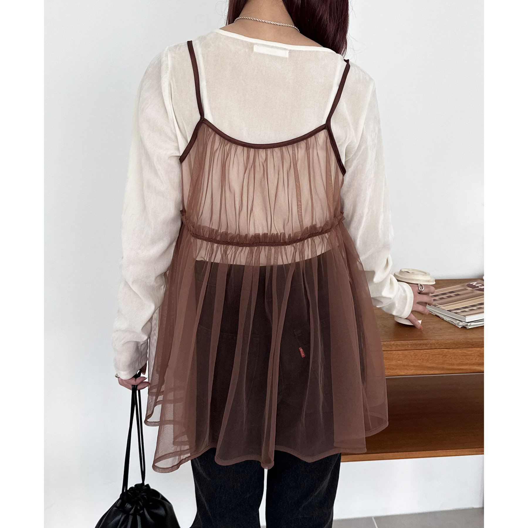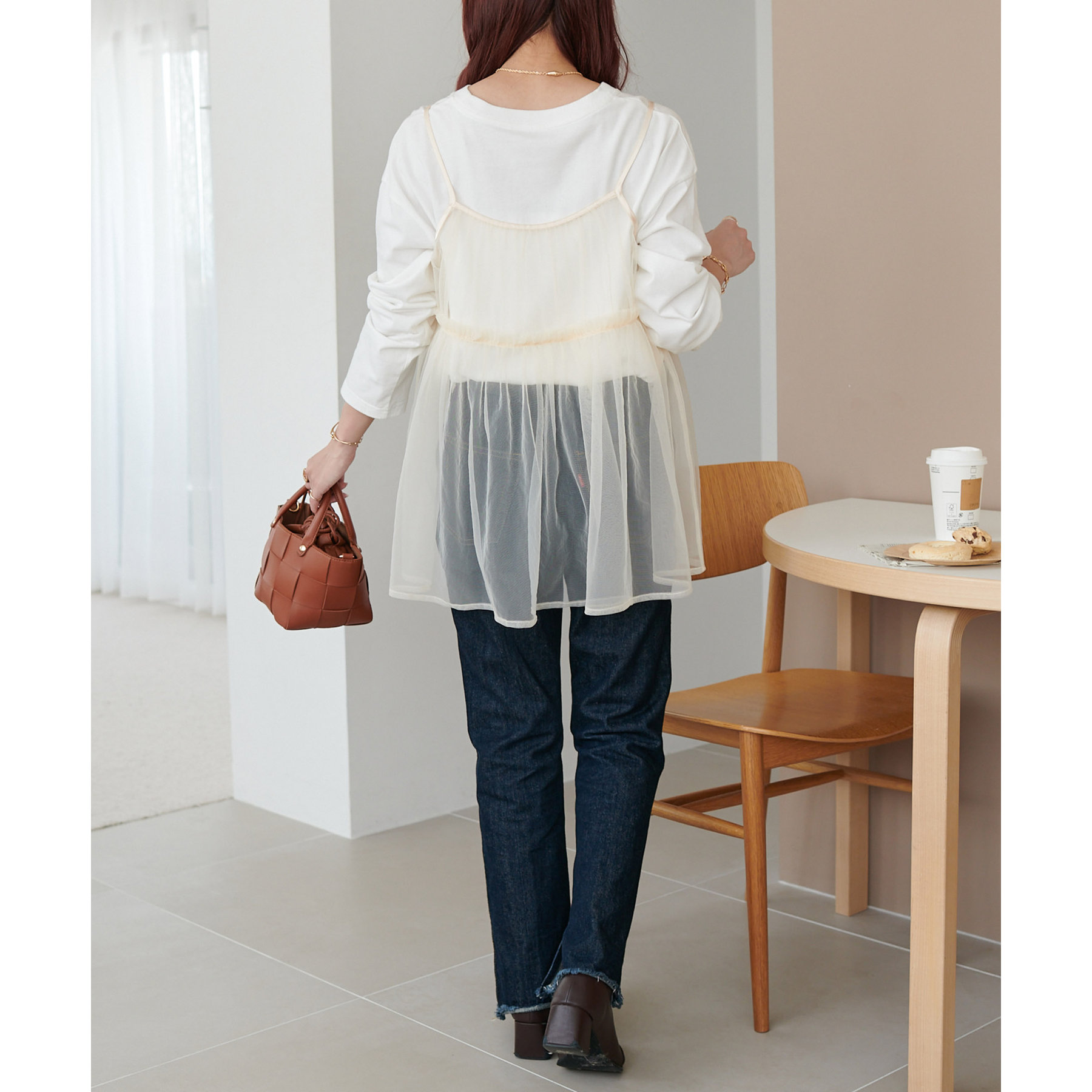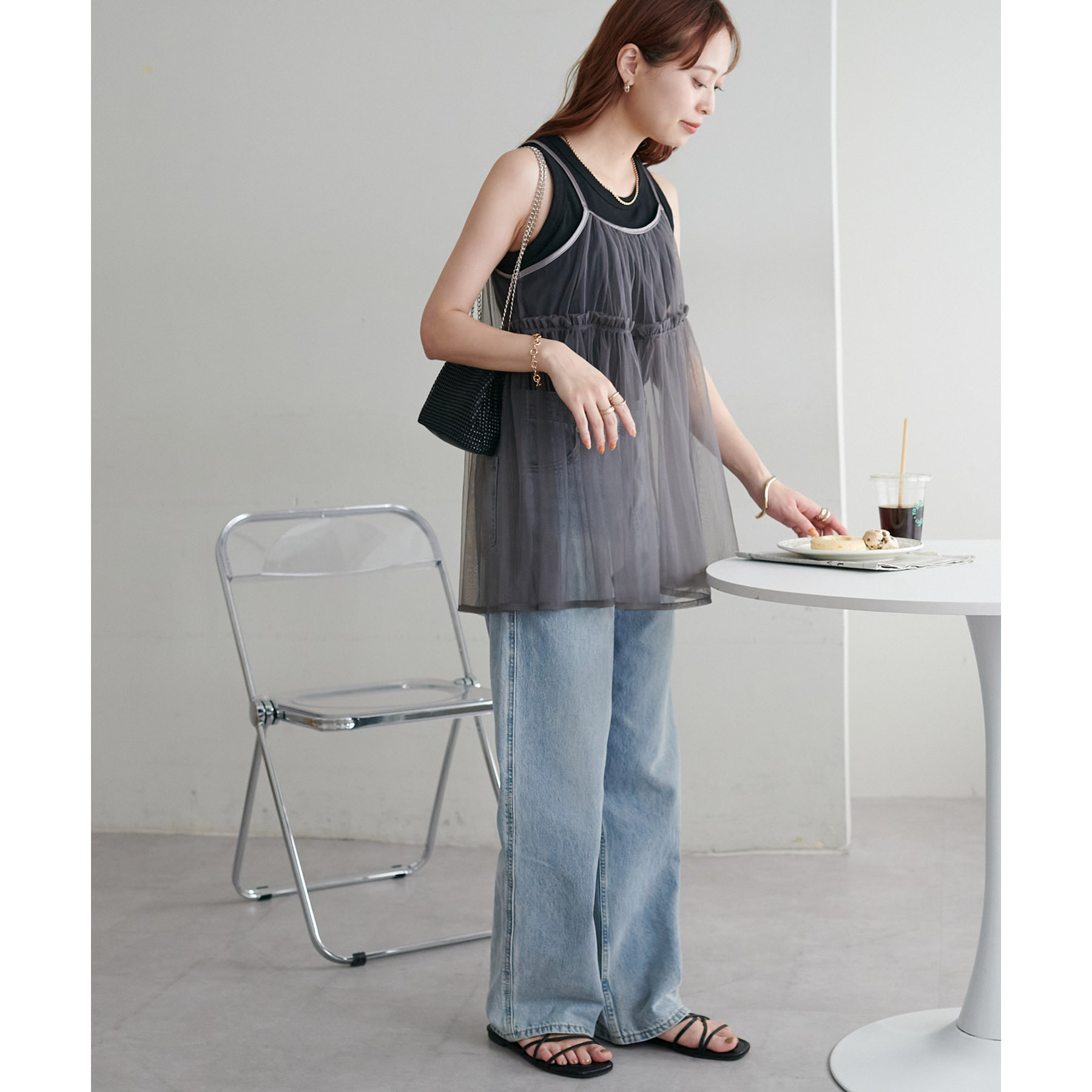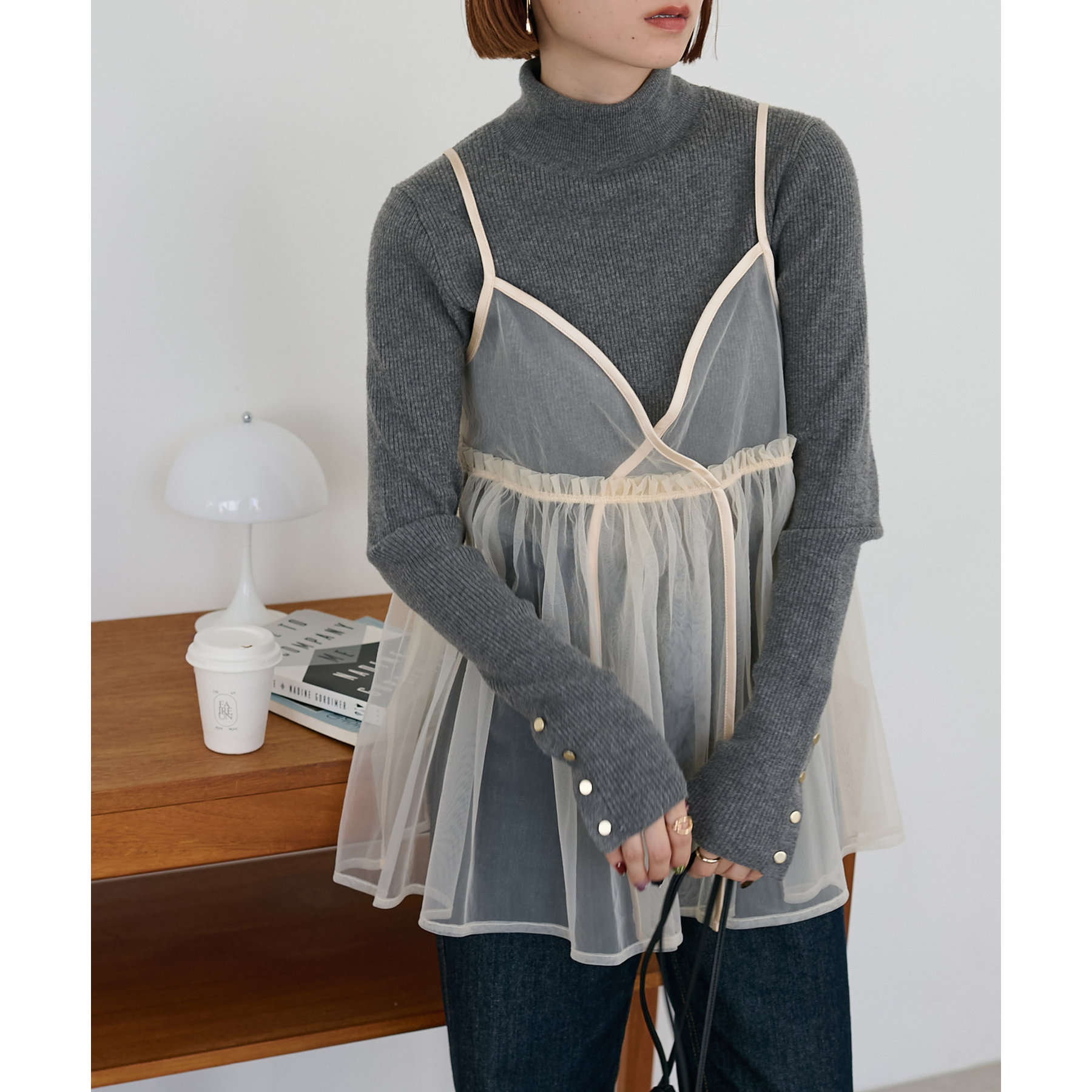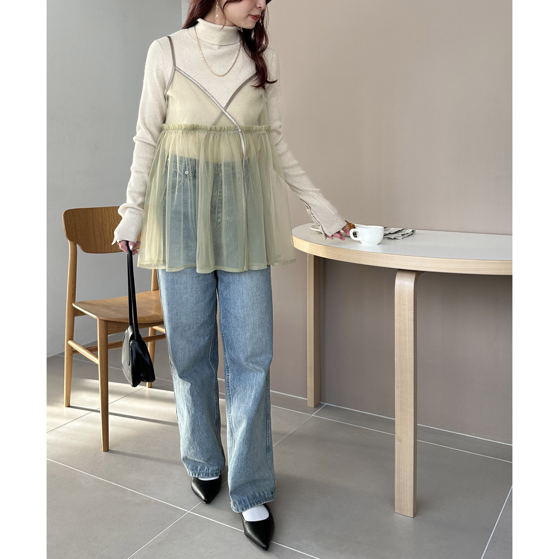 透け感のあるチュール素材なので、シンプルな無地のインナーとはもちろん、あえてプリントTシャツやロゴTシャツを合わせるのもおすすめ。秋冬はニットに重ねて、オールシーズン着て頂けます。