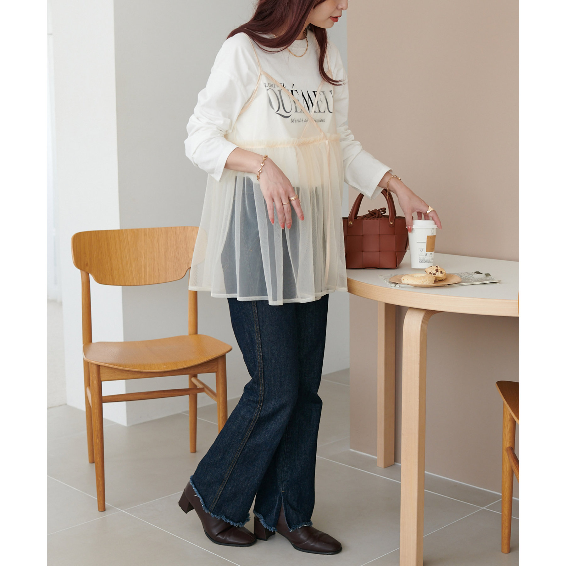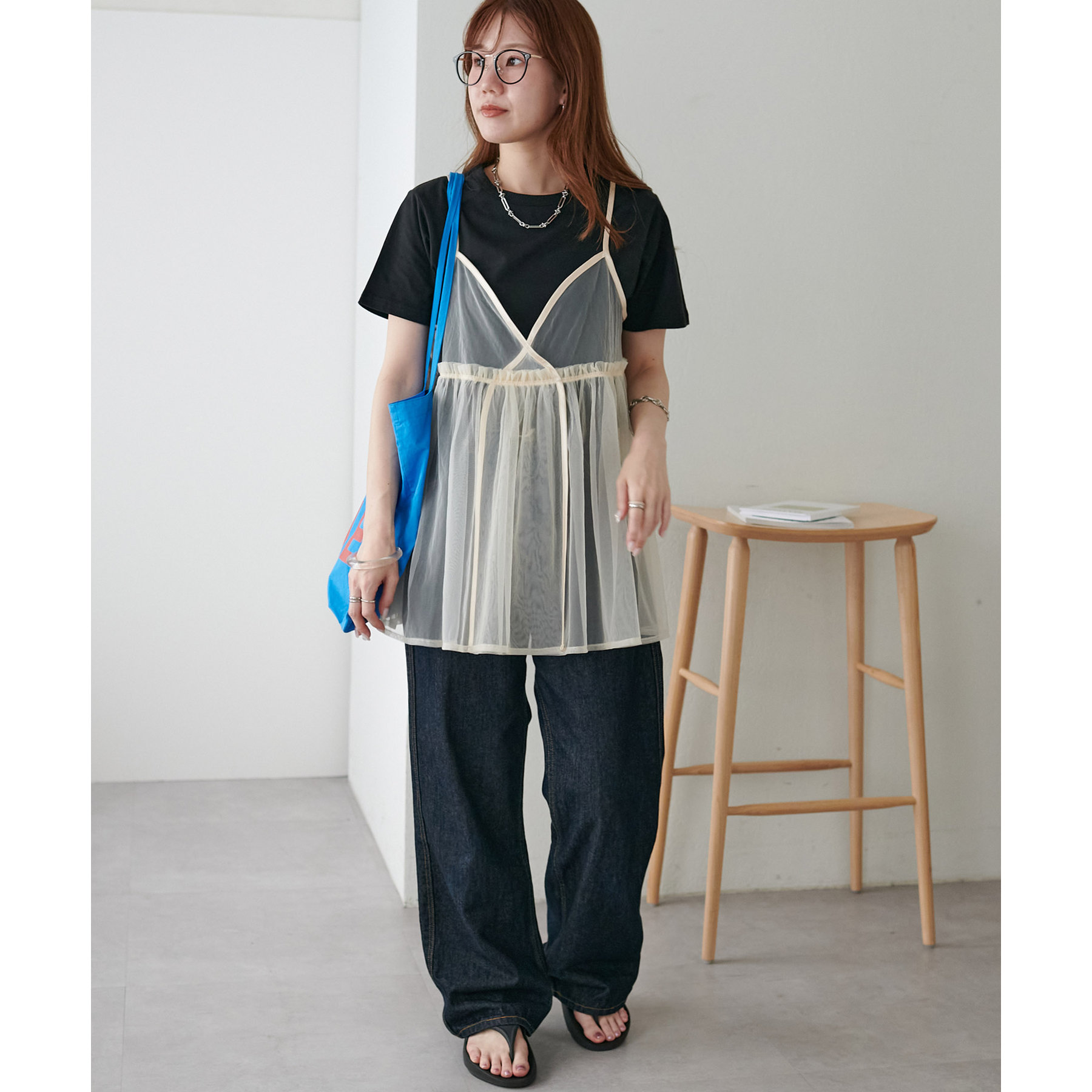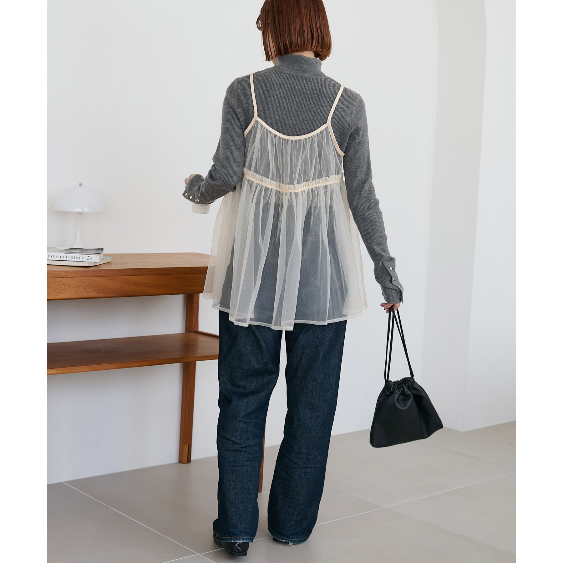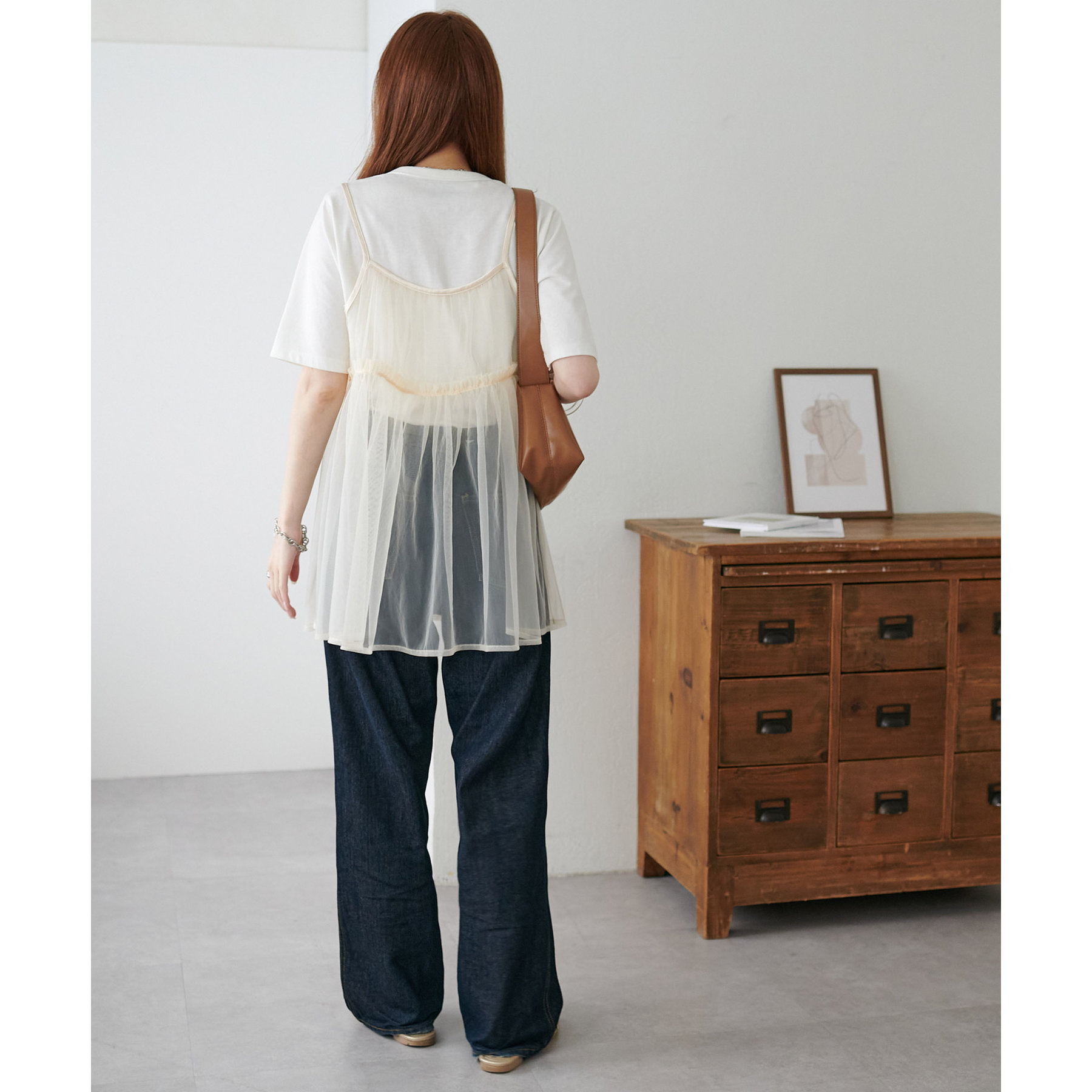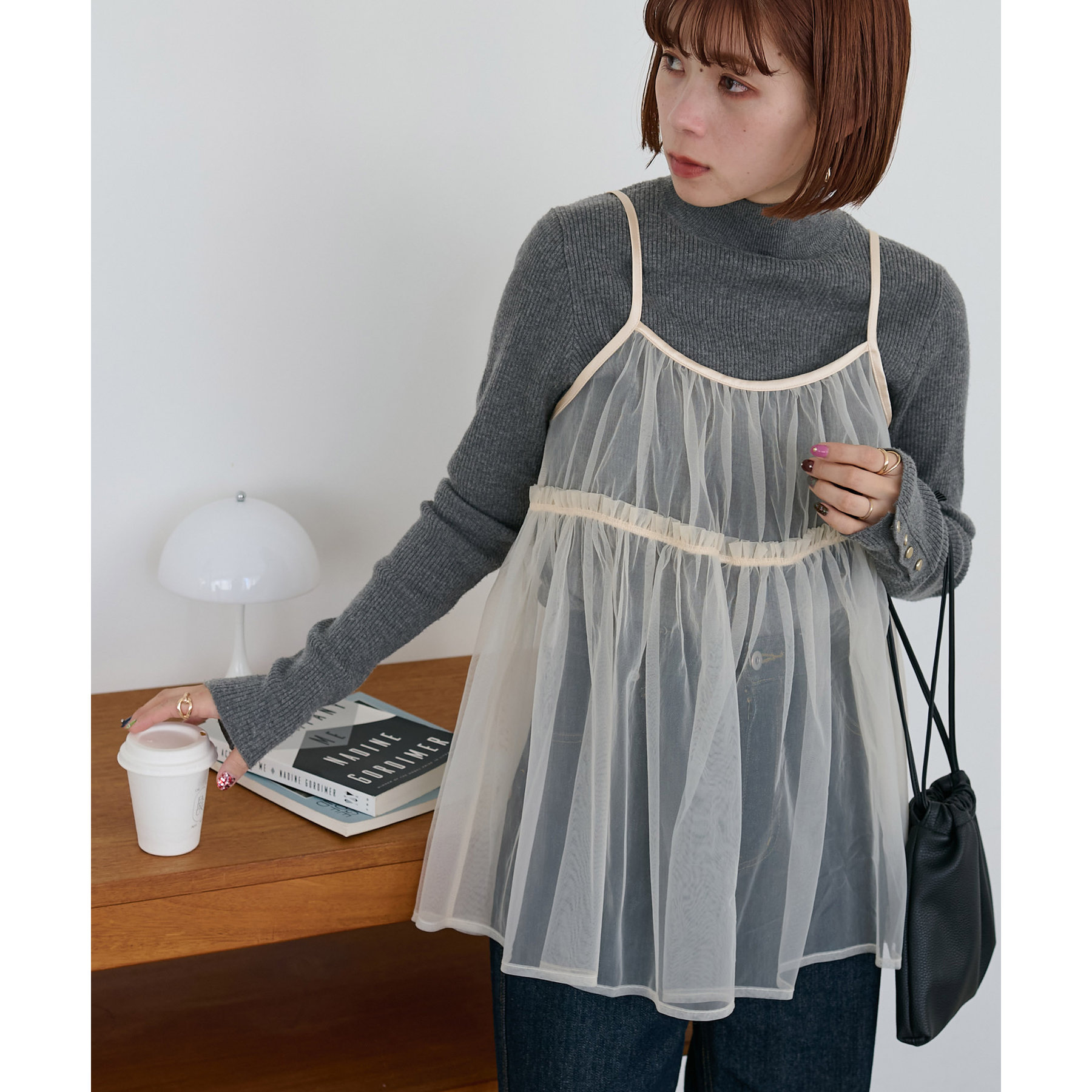透け感のあるチュール素材なので、シンプルな無地のインナーとはもちろん、あえてプリントTシャツやロゴTシャツを合わせるのもおすすめ。秋冬はニットに重ねて、オールシーズン着て頂けます。