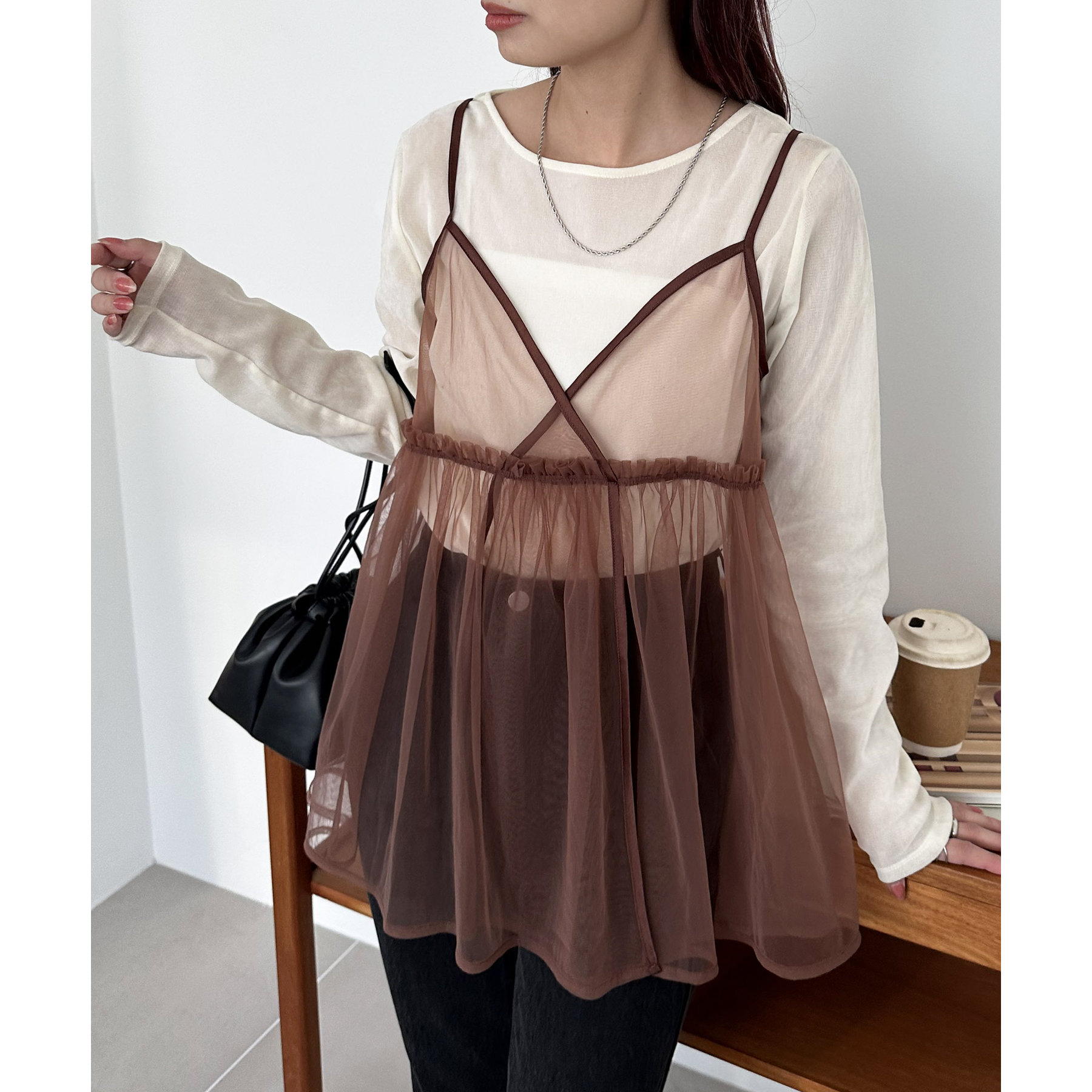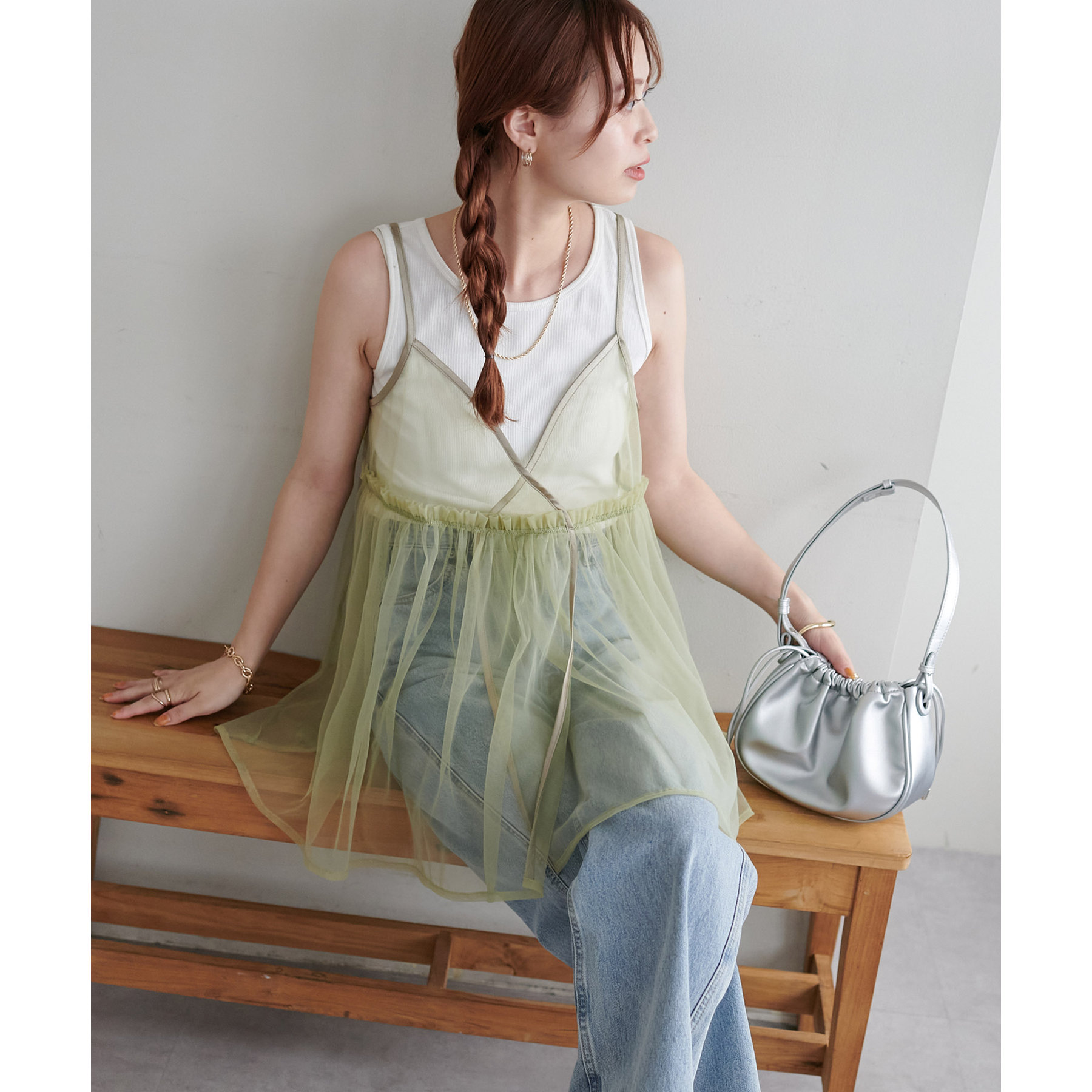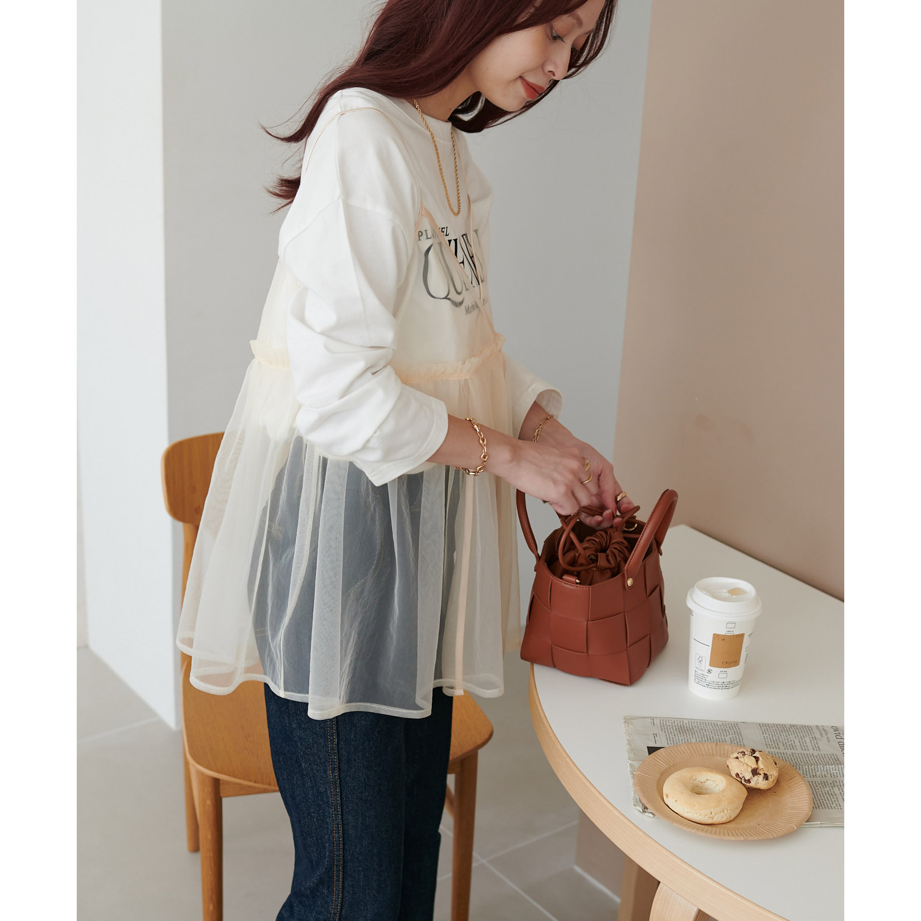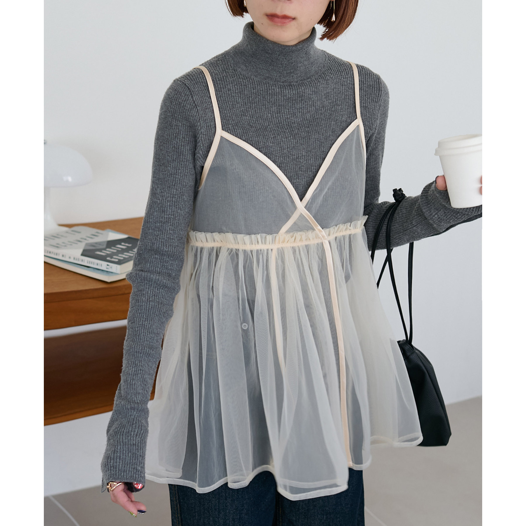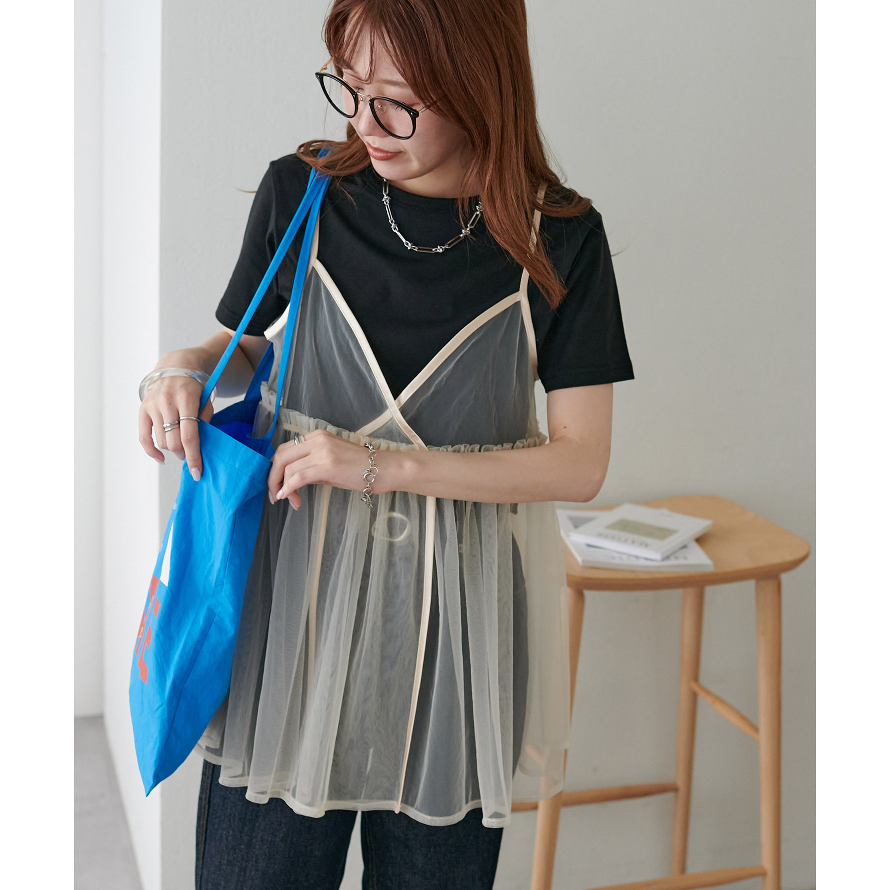 透け感のあるチュール素材なので、シンプルな無地のインナーとはもちろん、あえてプリントTシャツやロゴTシャツを合わせるのもおすすめ。秋冬はニットに重ねて、オールシーズン着て頂けます。