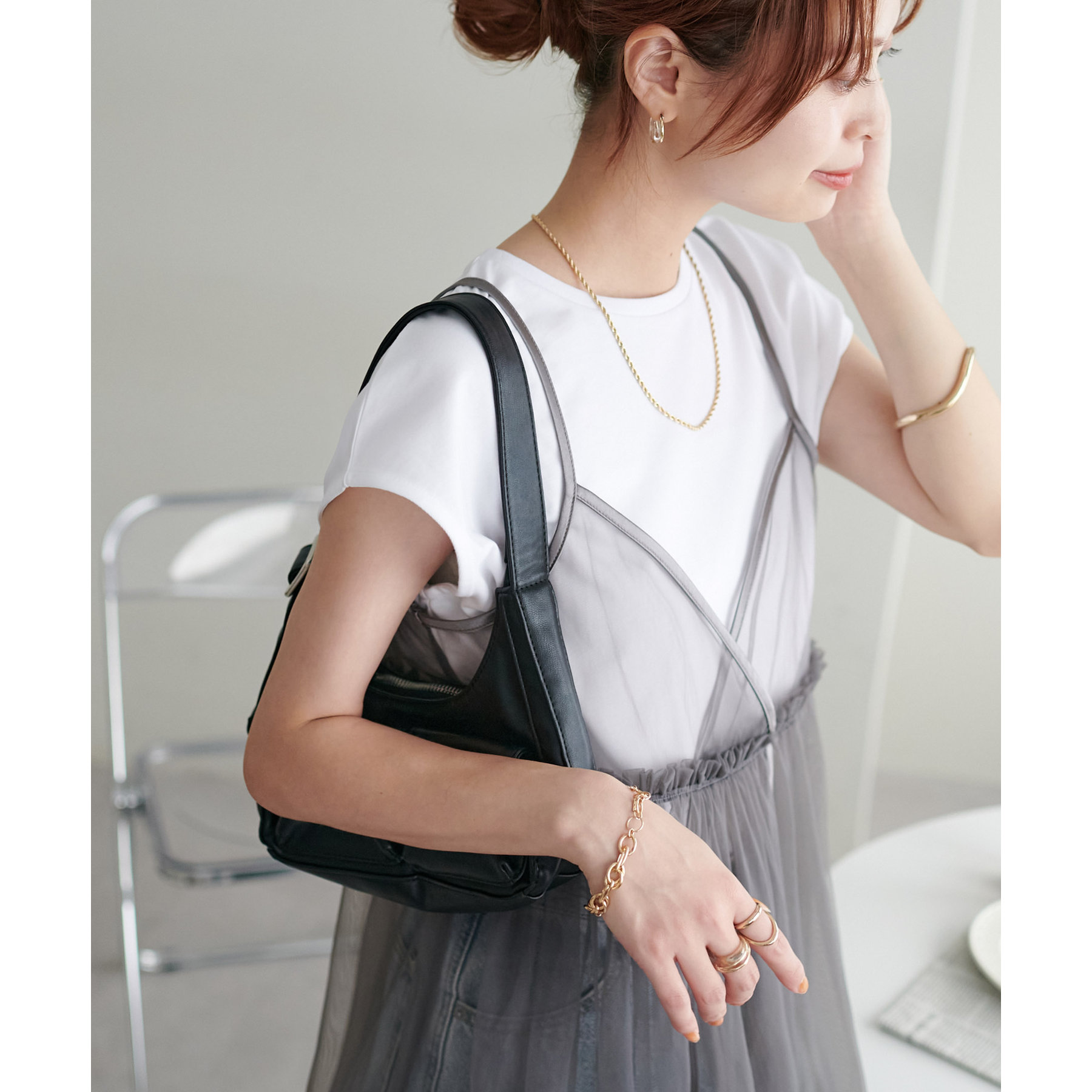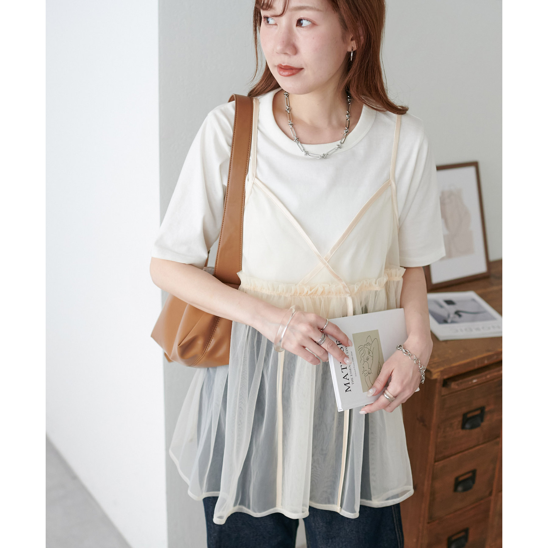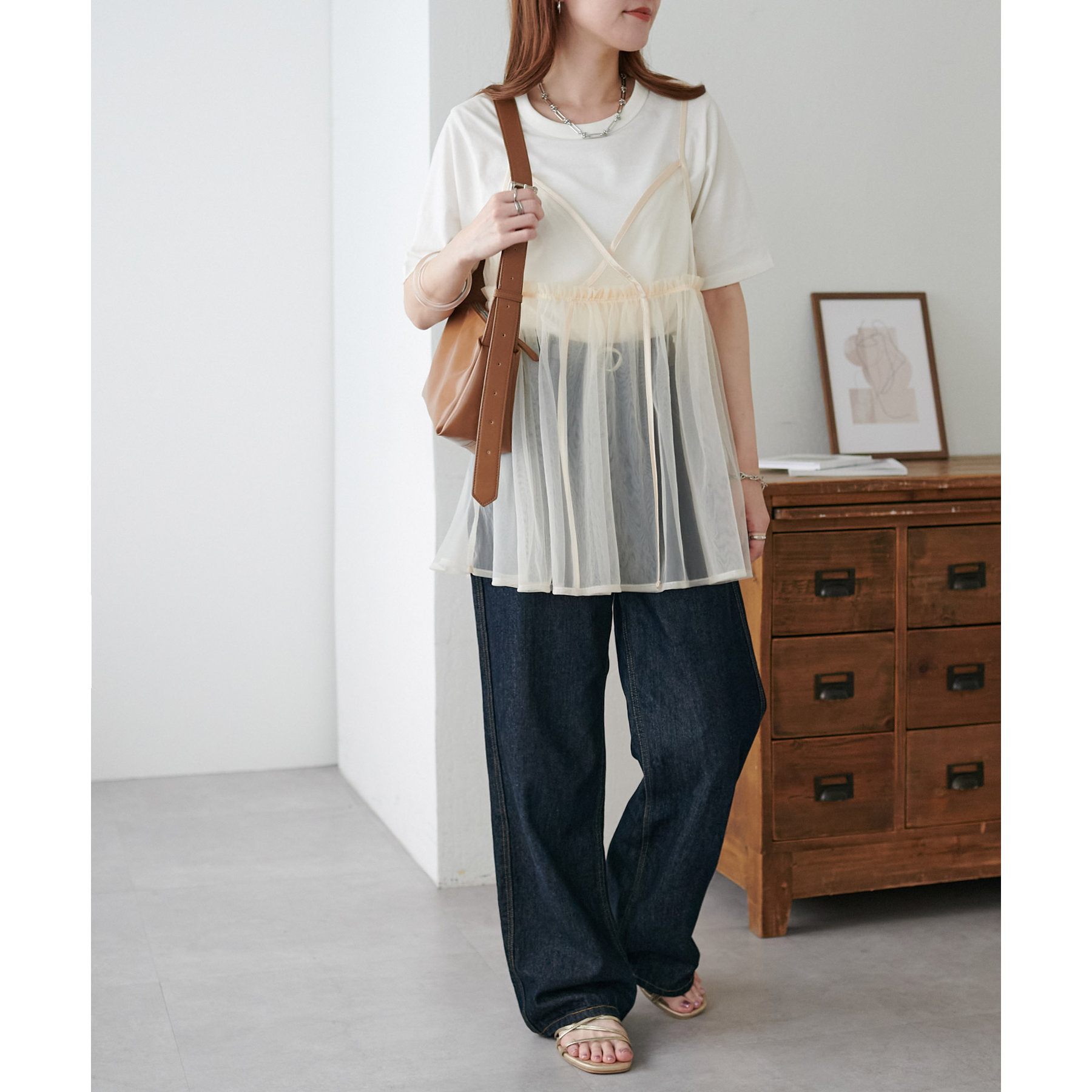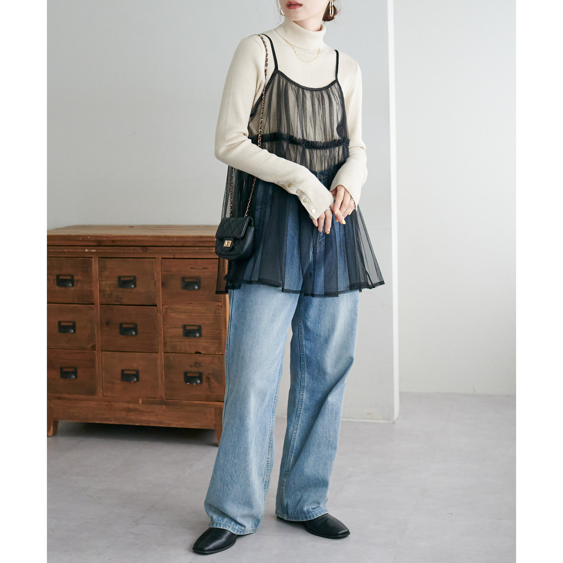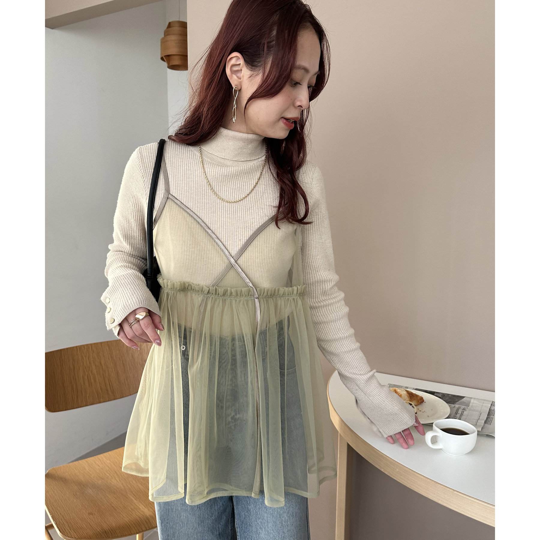 透け感のあるチュール素材なので、シンプルな無地のインナーとはもちろん、あえてプリントTシャツやロゴTシャツを合わせるのもおすすめ。秋冬はニットに重ねて、オールシーズン着て頂けます。