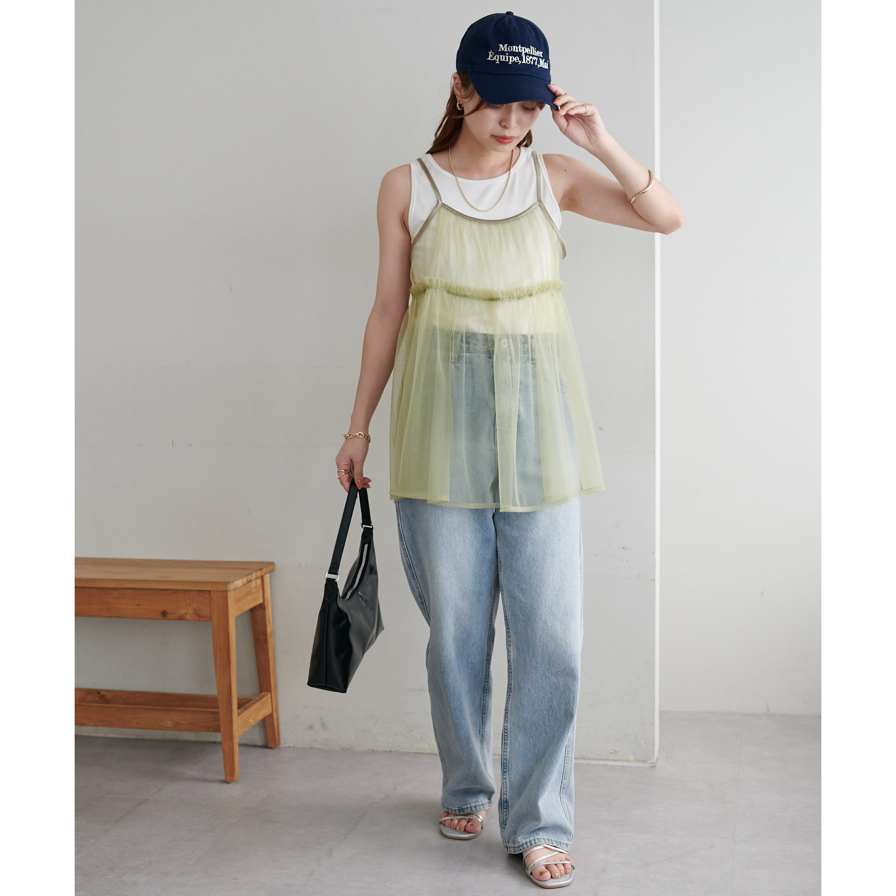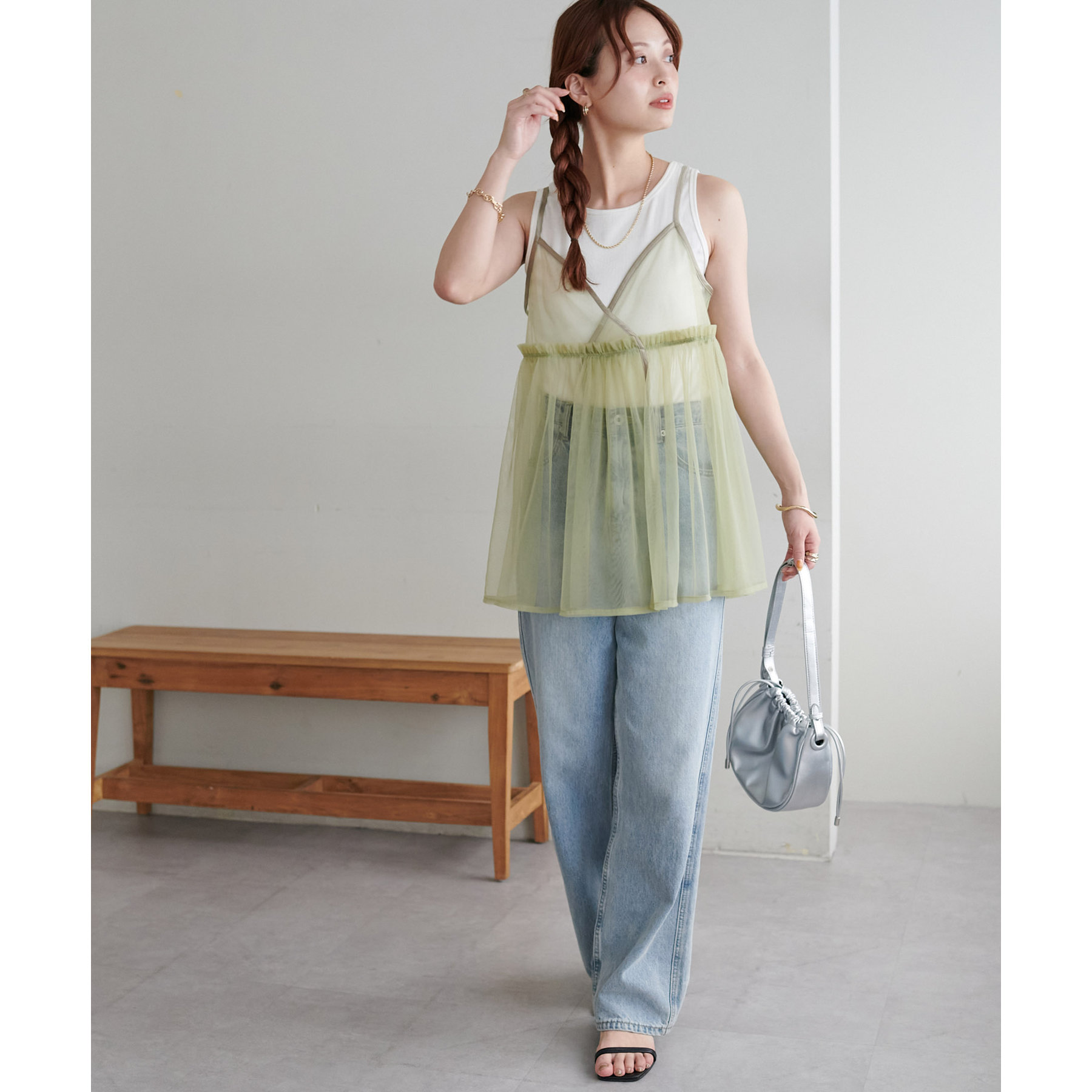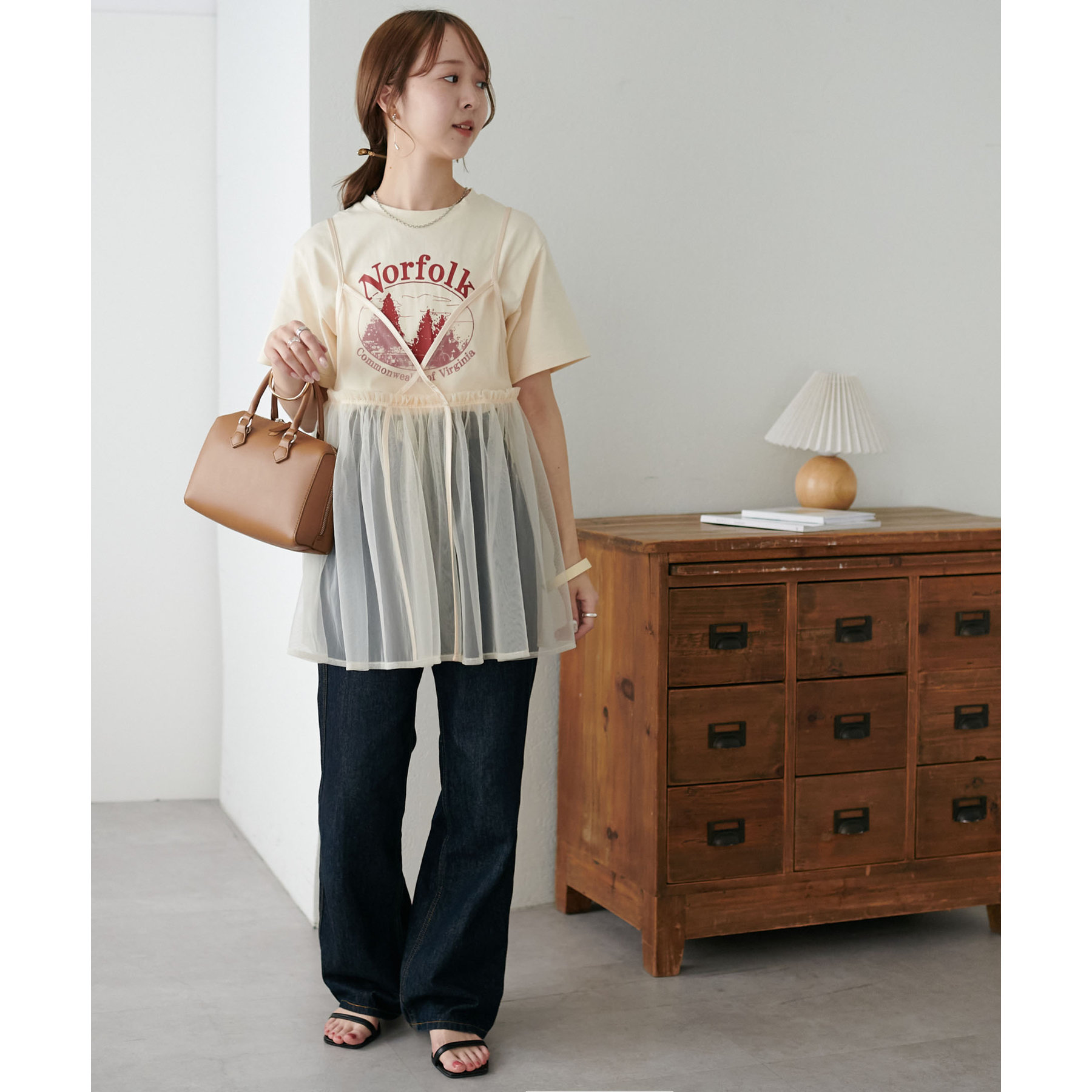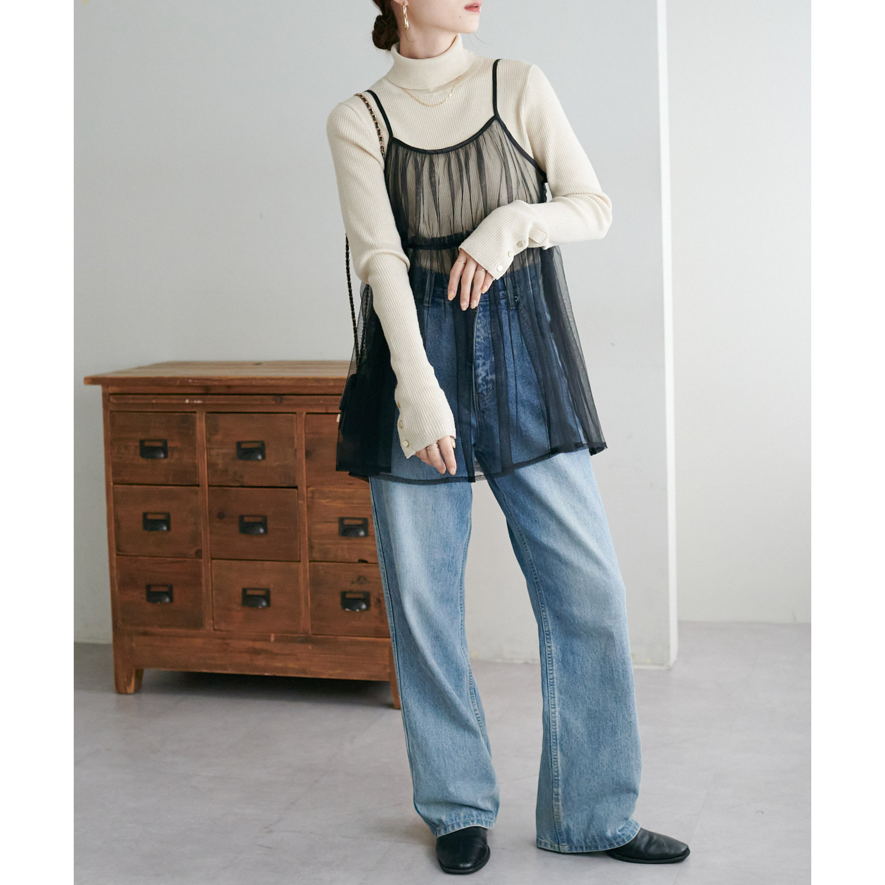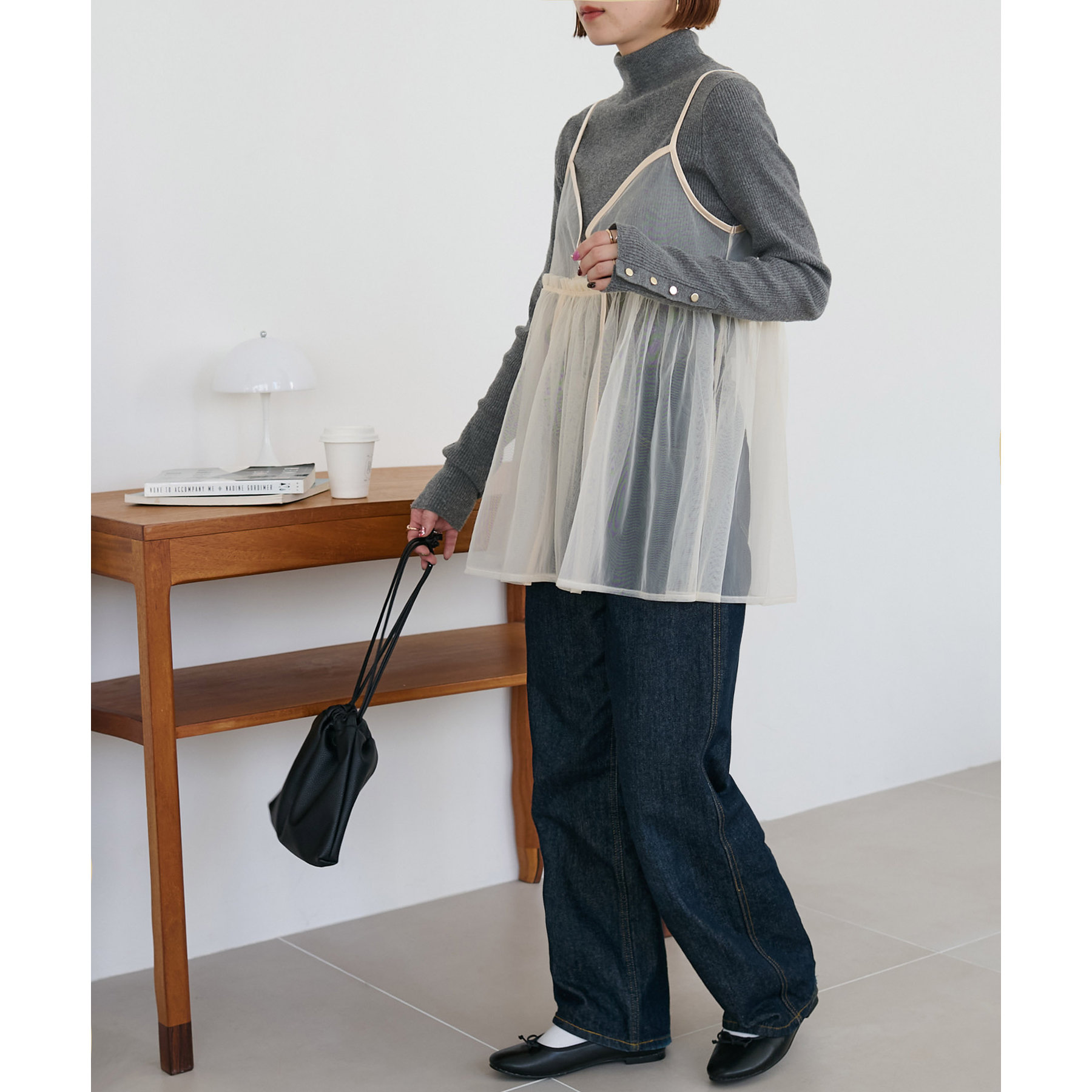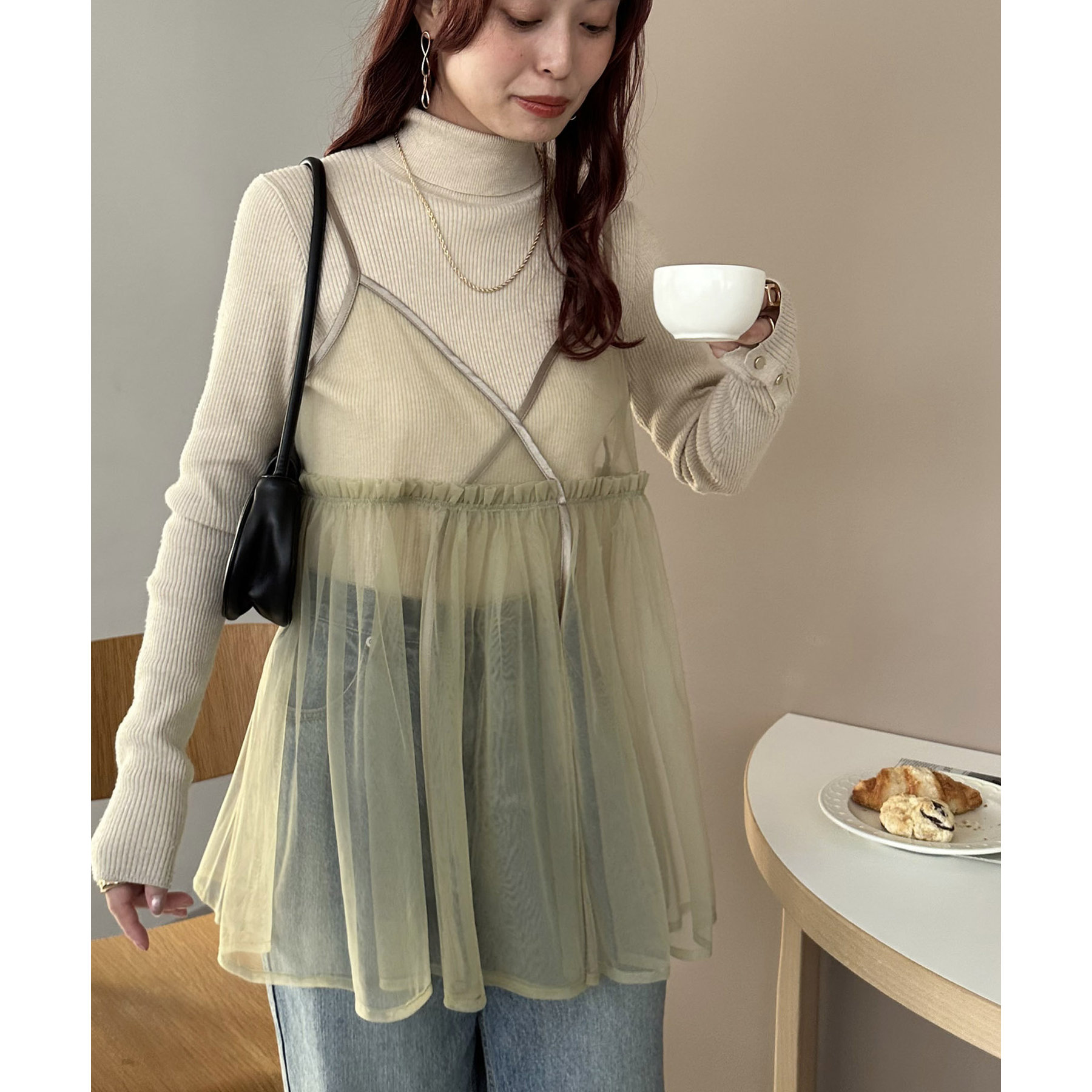透け感のあるチュール素材なので、シンプルな無地のインナーとはもちろん、あえてプリントTシャツやロゴTシャツを合わせるのもおすすめ。秋冬はニットに重ねて、オールシーズン着て頂けます。