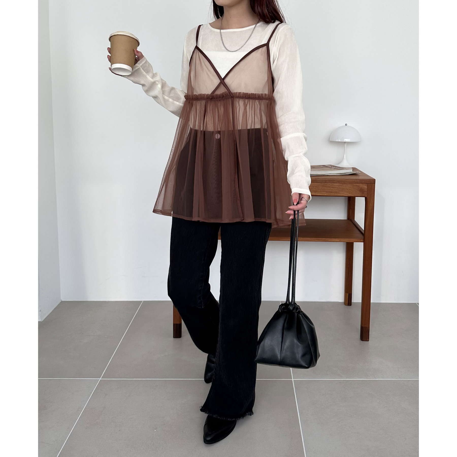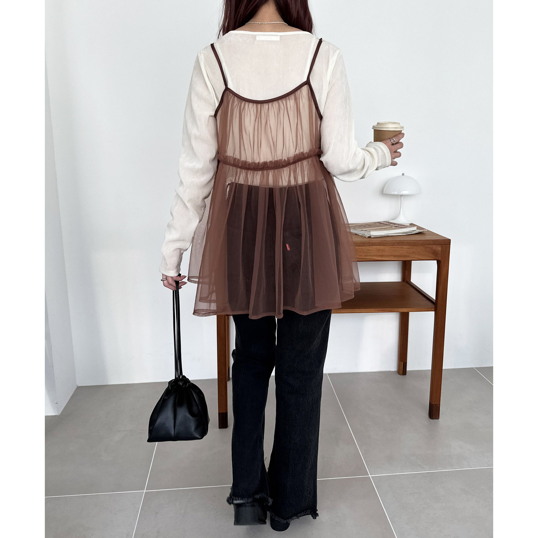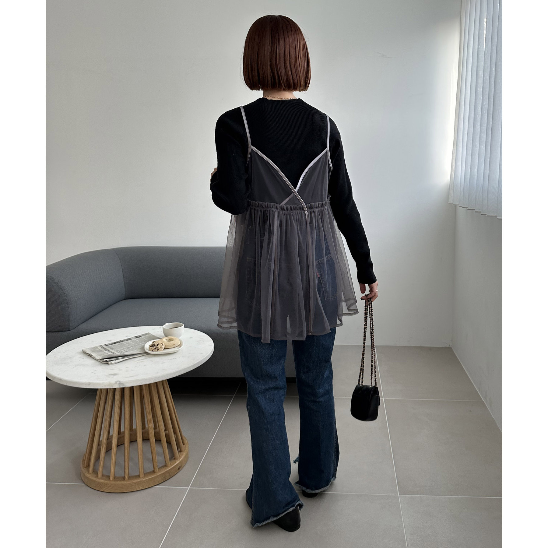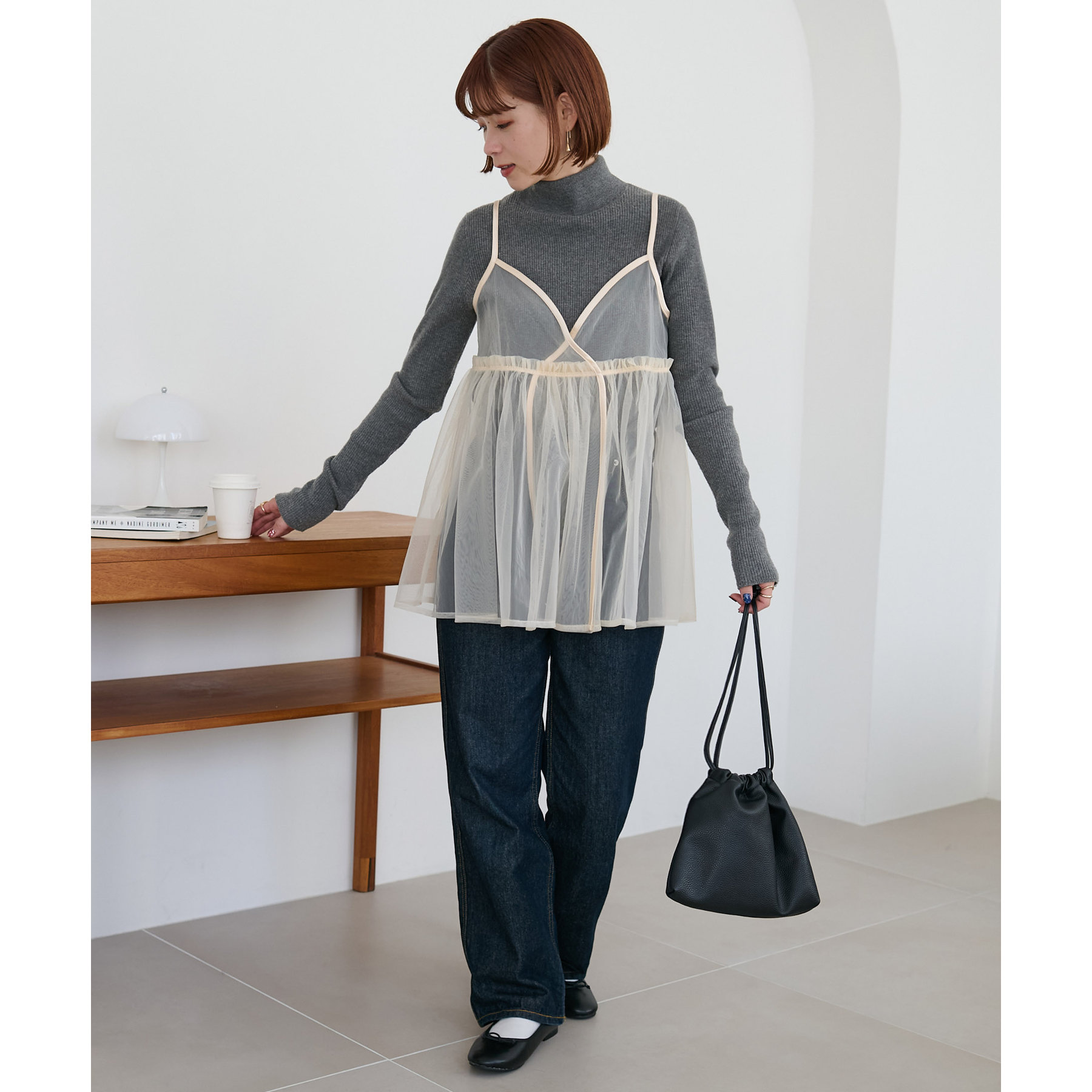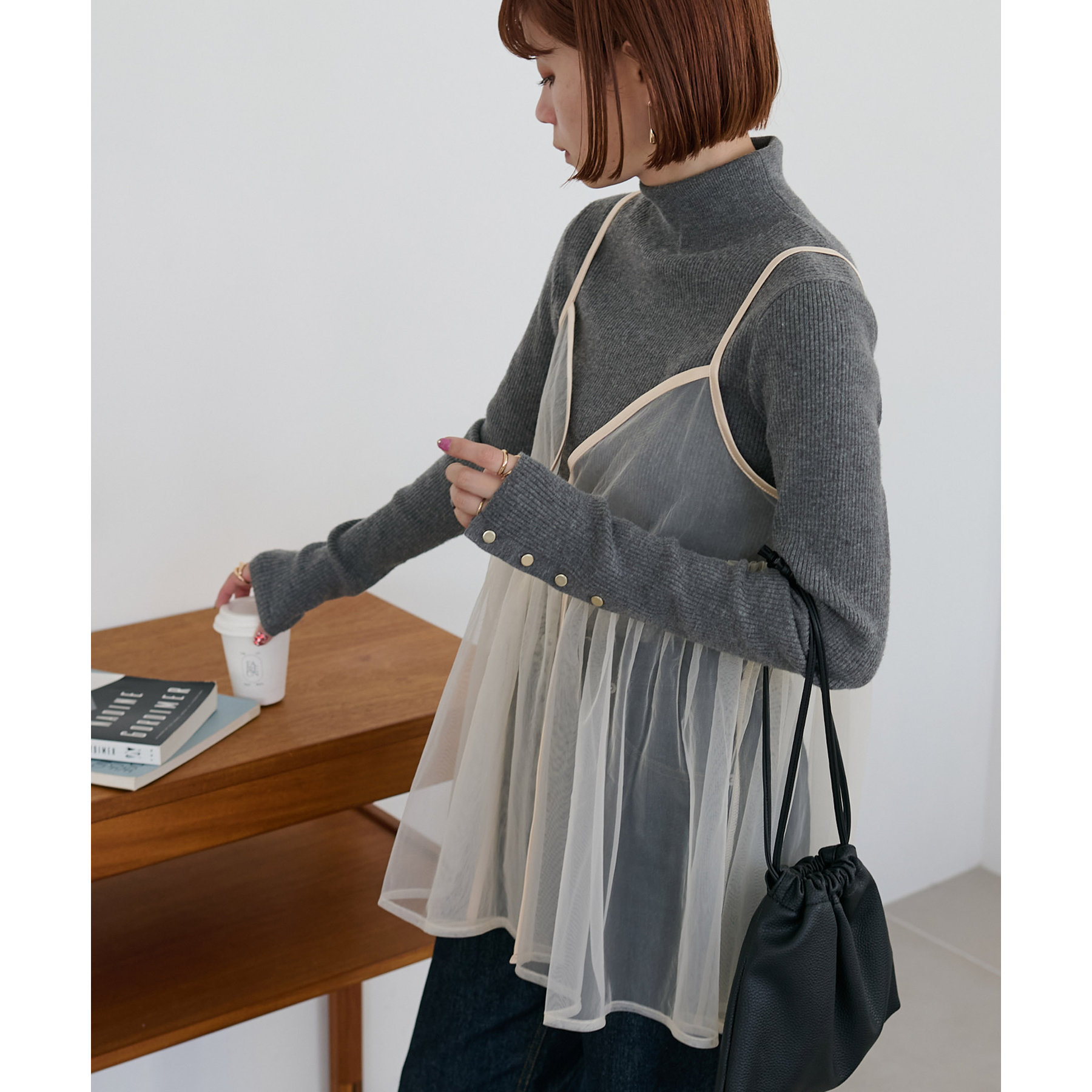 透け感のあるチュール素材なので、シンプルな無地のインナーとはもちろん、あえてプリントTシャツやロゴTシャツを合わせるのもおすすめ。秋冬はニットに重ねて、オールシーズン着て頂けます。