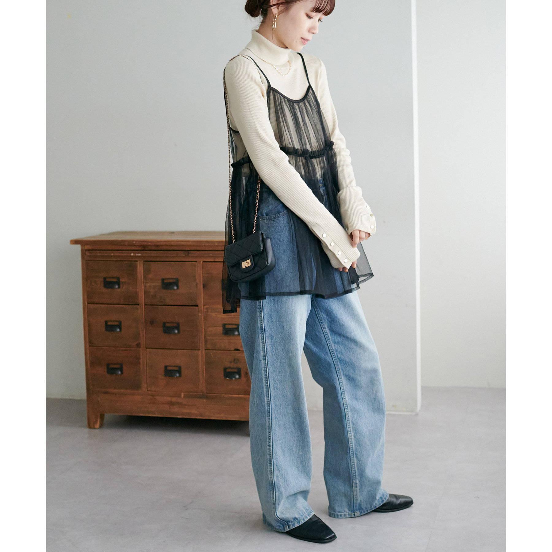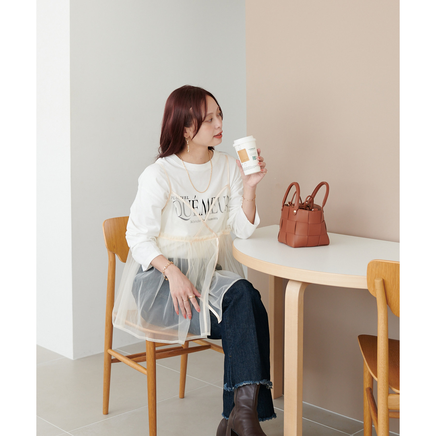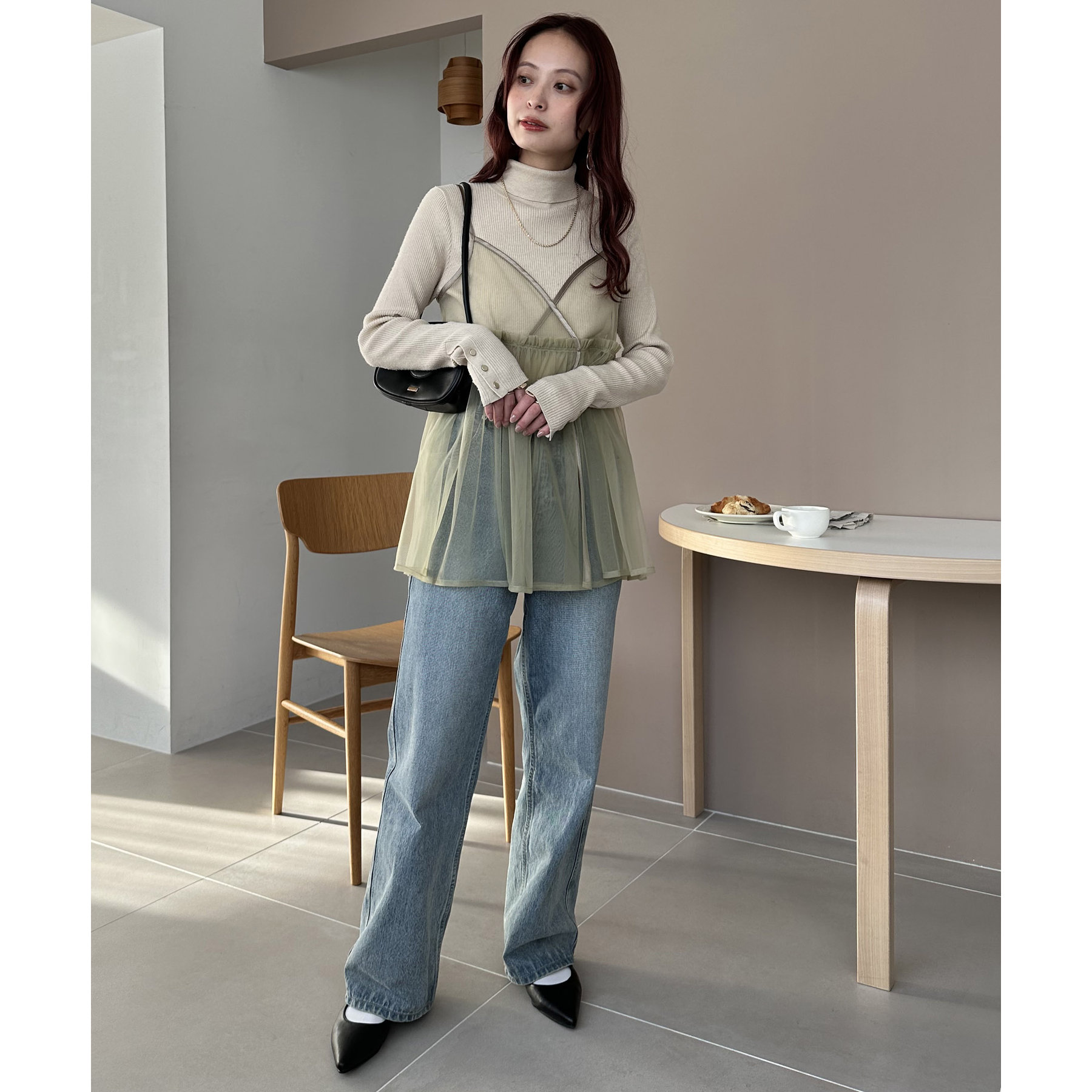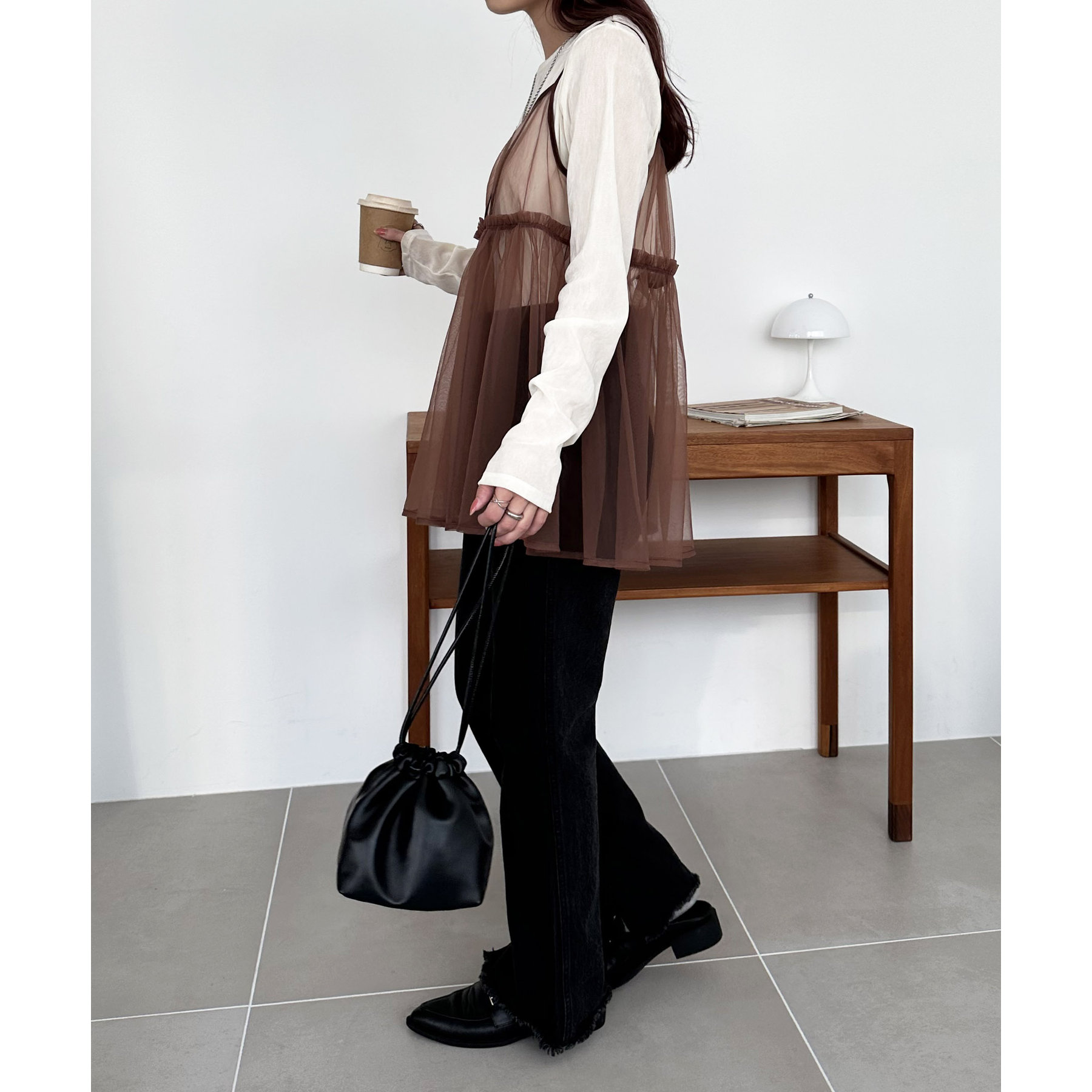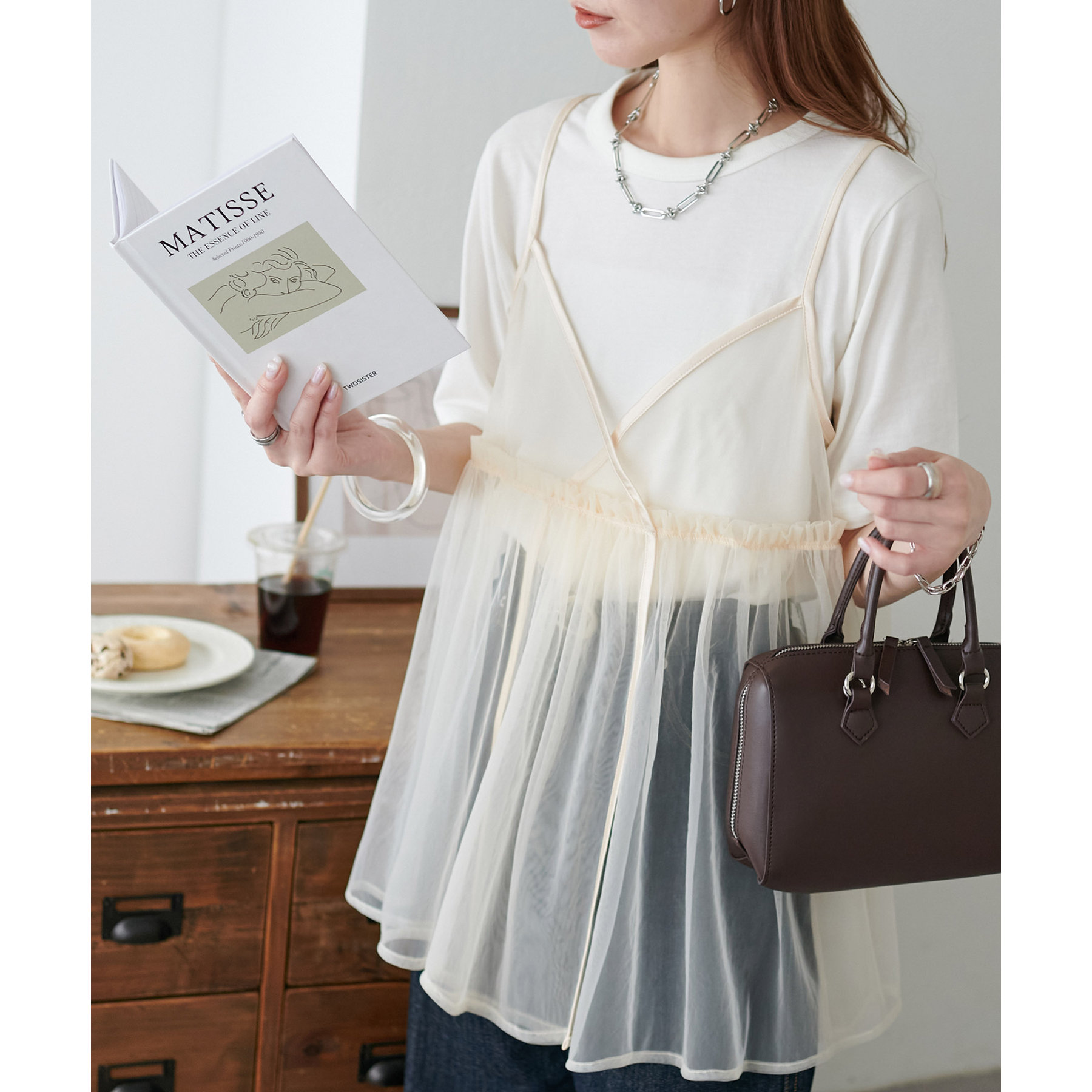透け感のあるチュール素材なので、シンプルな無地のインナーとはもちろん、あえてプリントTシャツやロゴTシャツを合わせるのもおすすめ。秋冬はニットに重ねて、オールシーズン着て頂けます。