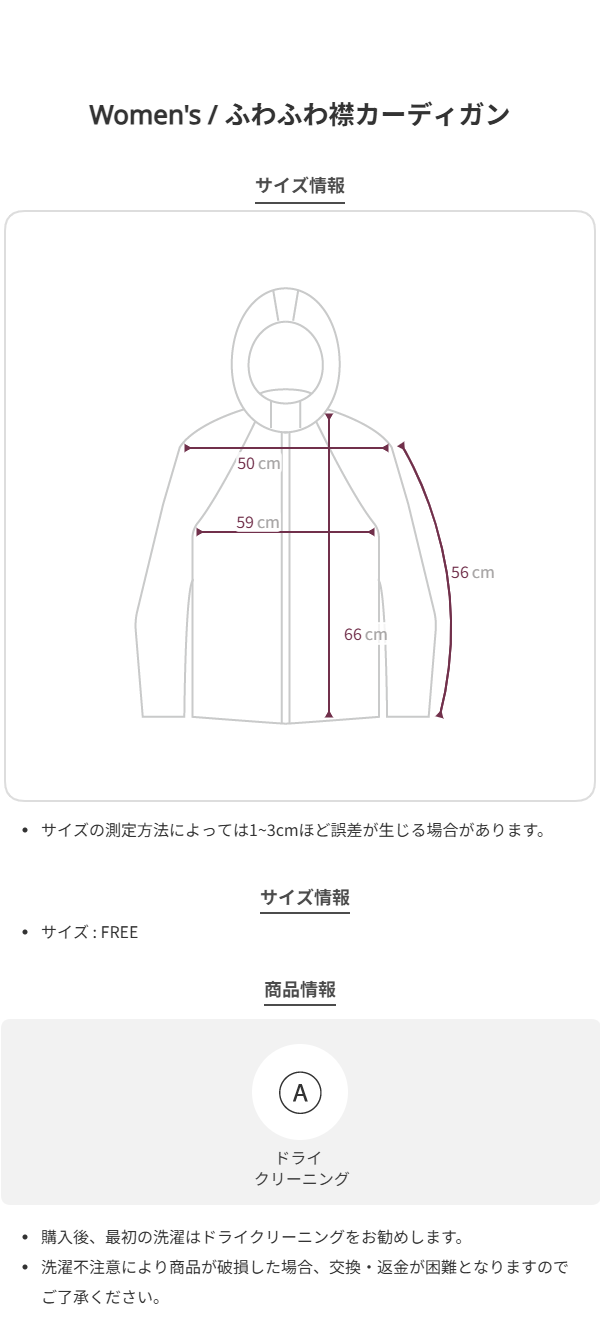 着丈 F:66cm バスト F:118cm 肩幅 F:50cm 袖丈 F:56cm