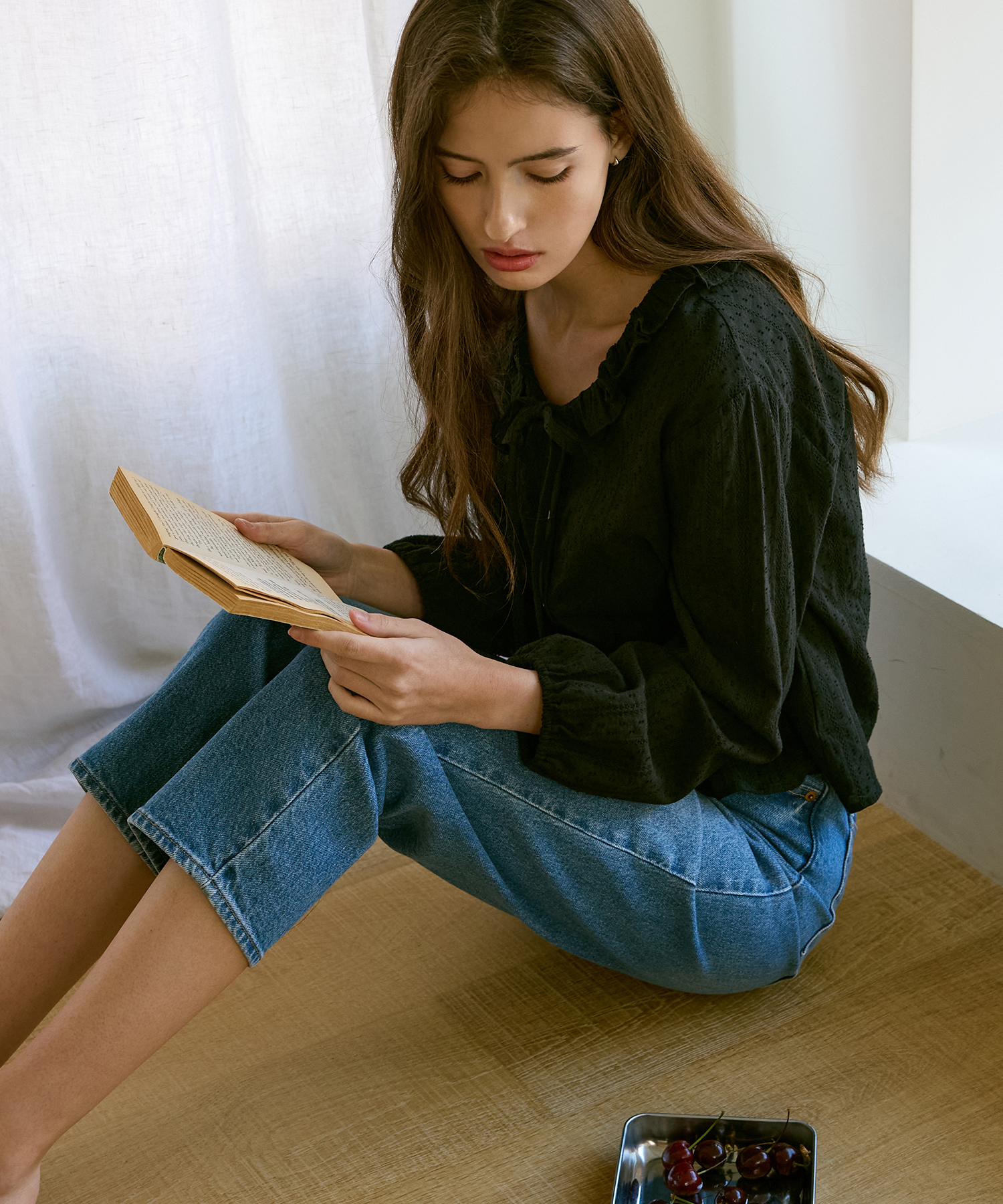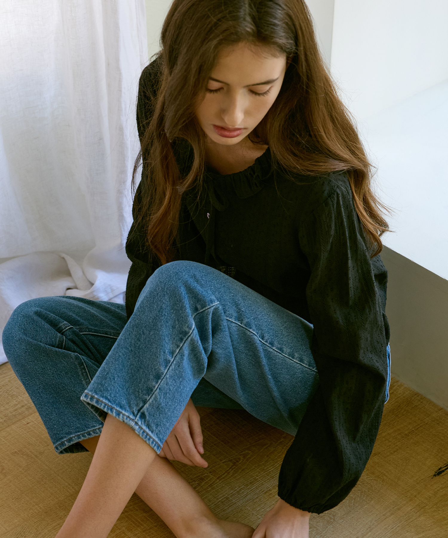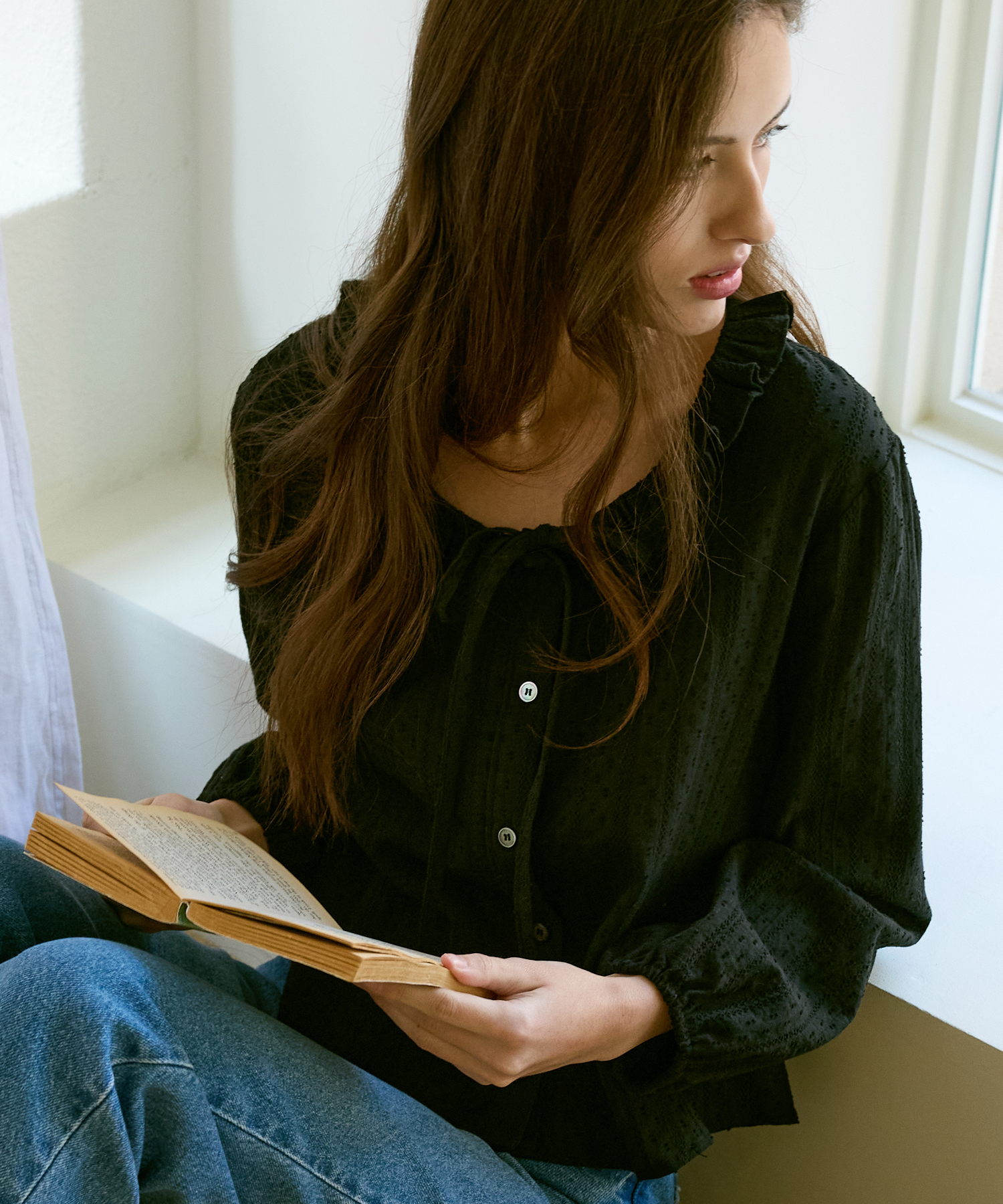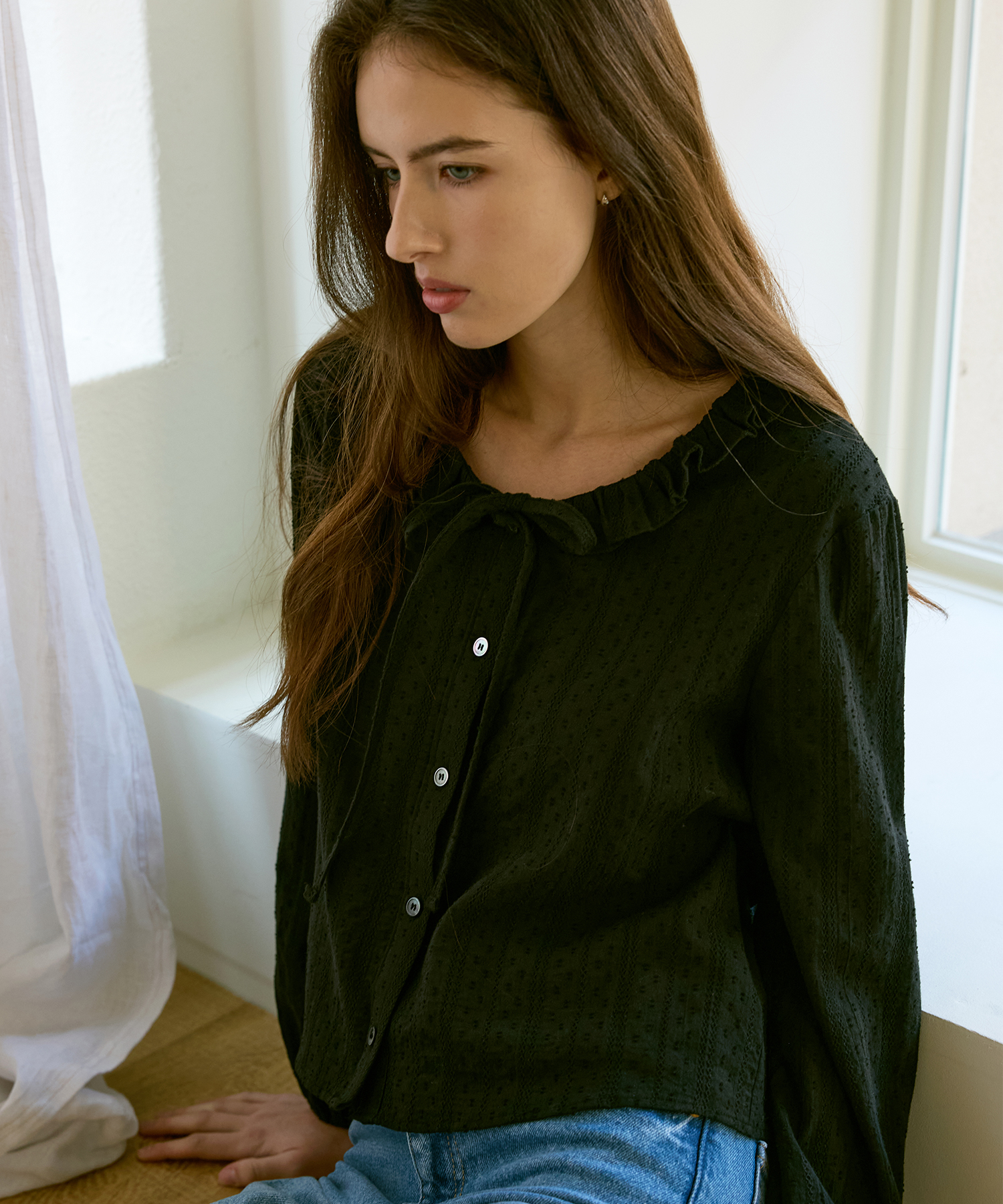 Claire Ribbon Ruffle Balloon Blouse (Black)
