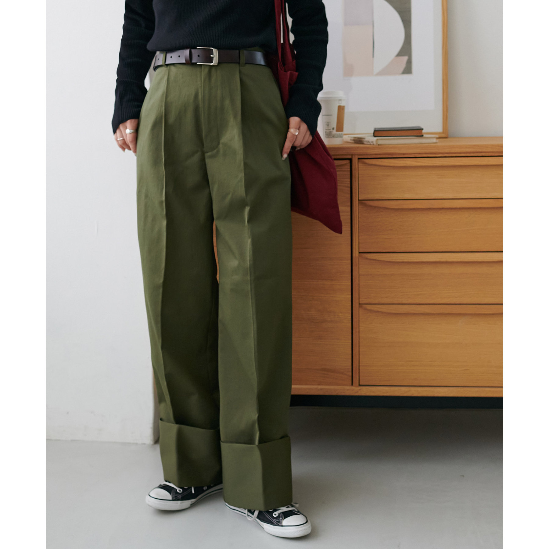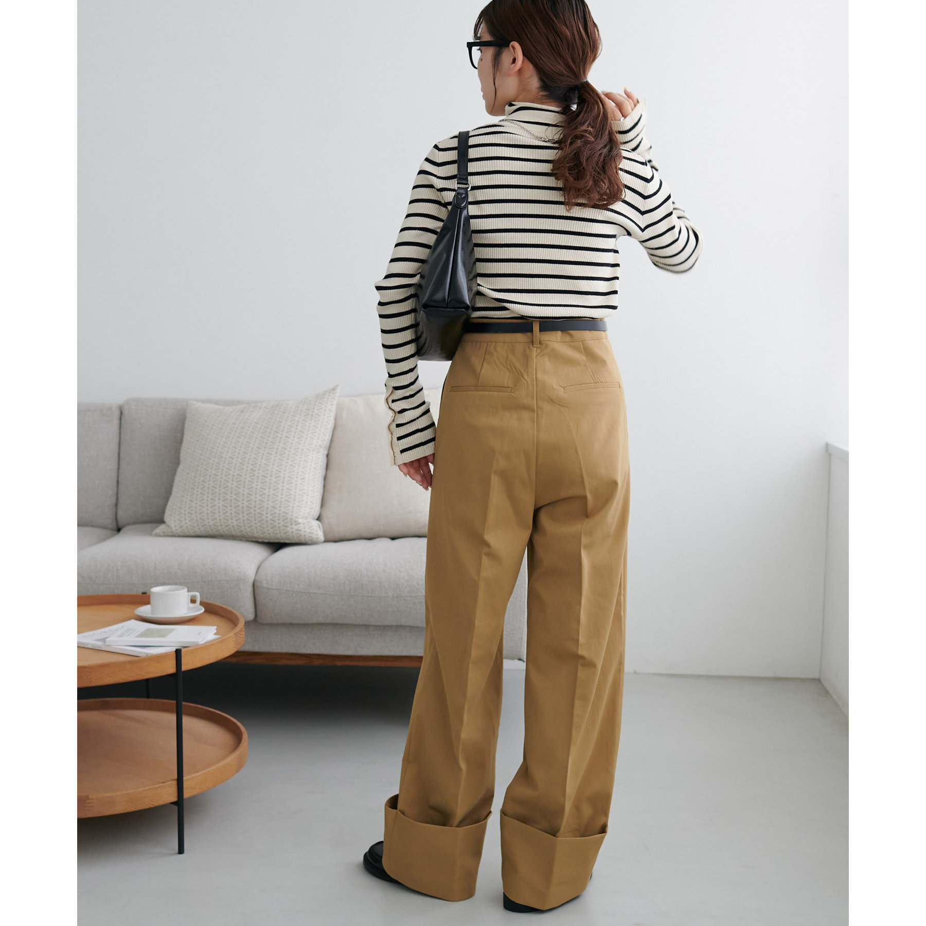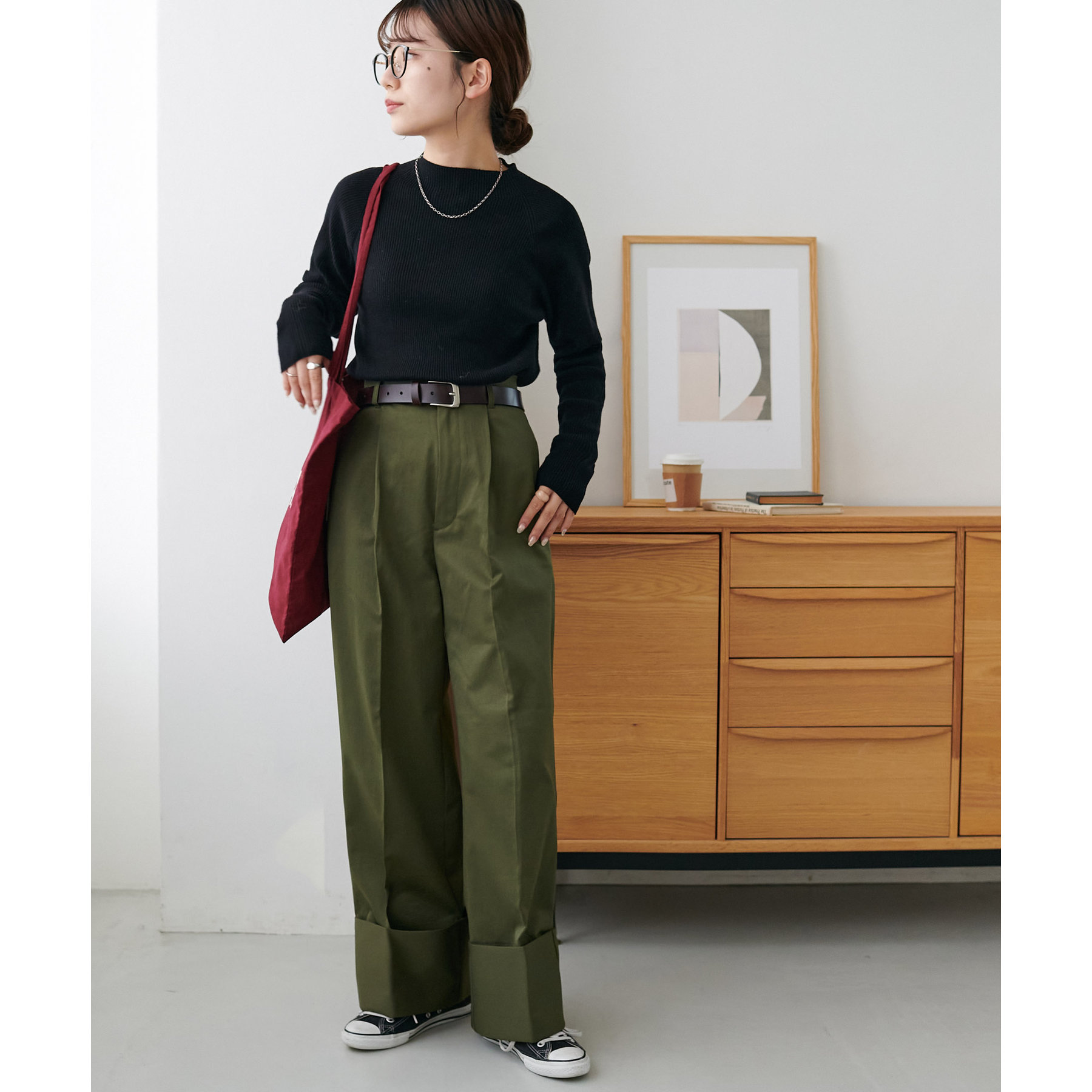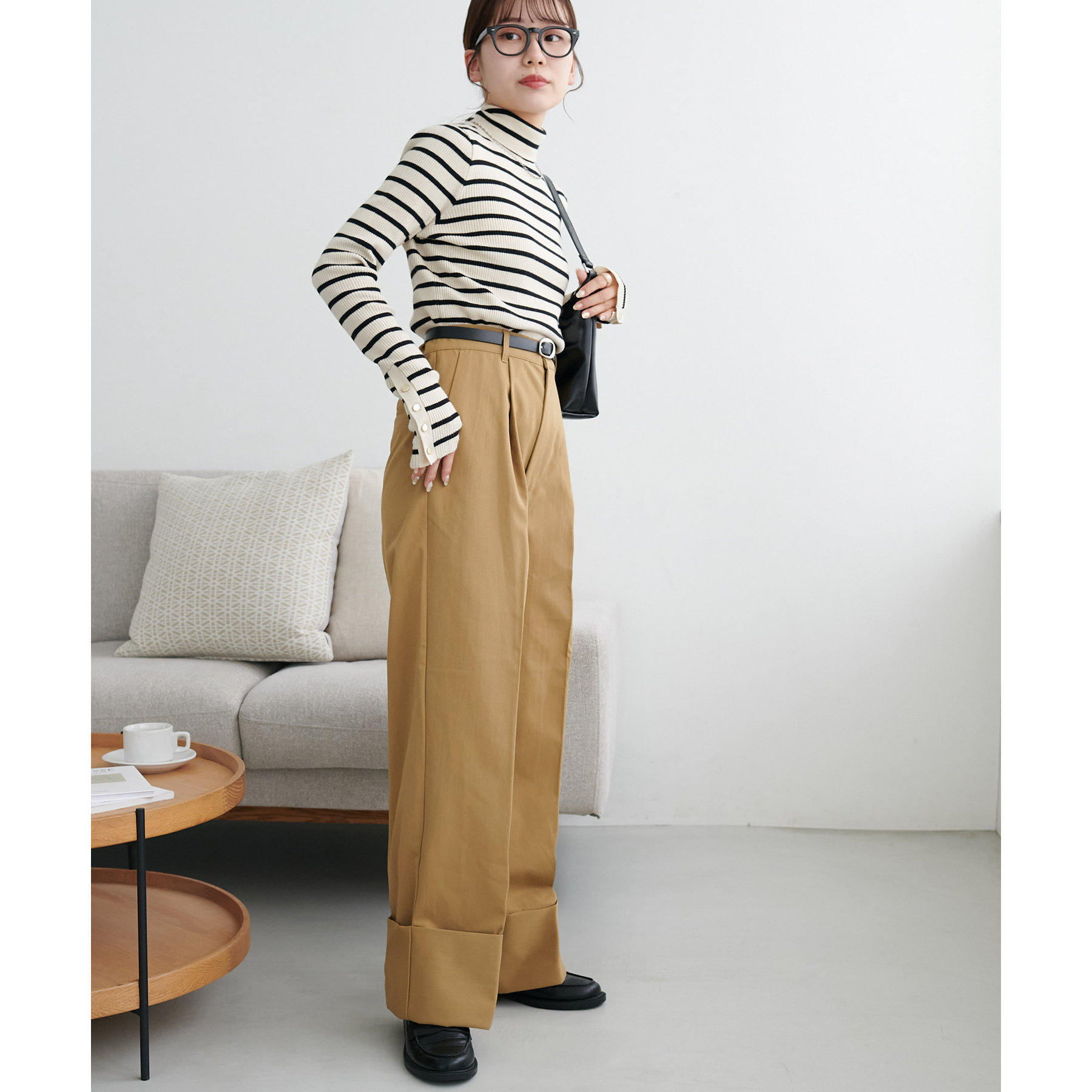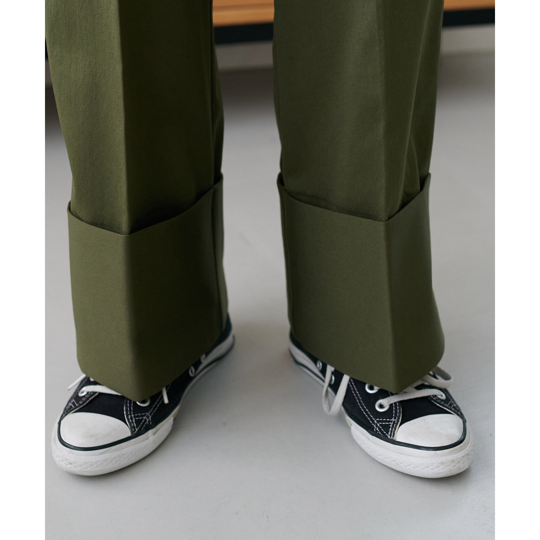 コーディネートのポイントになるロールアップチノパンツ
