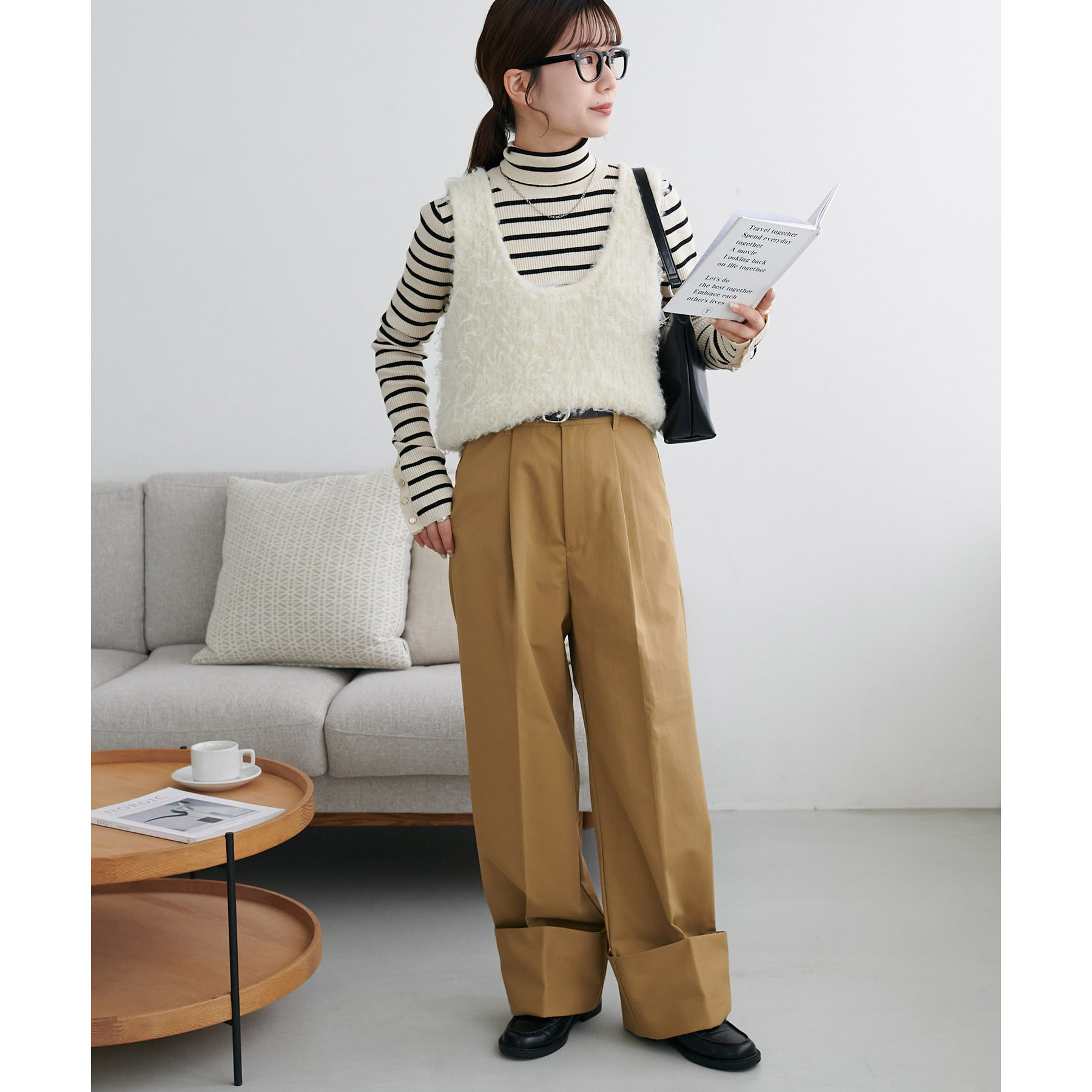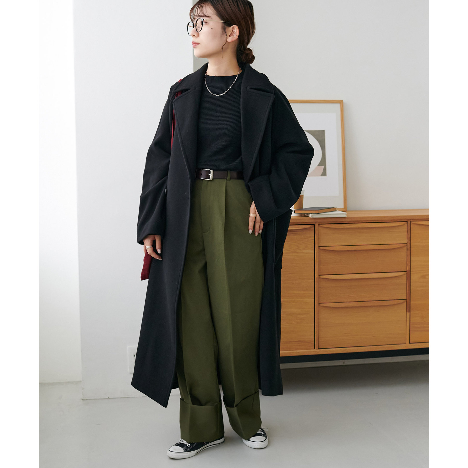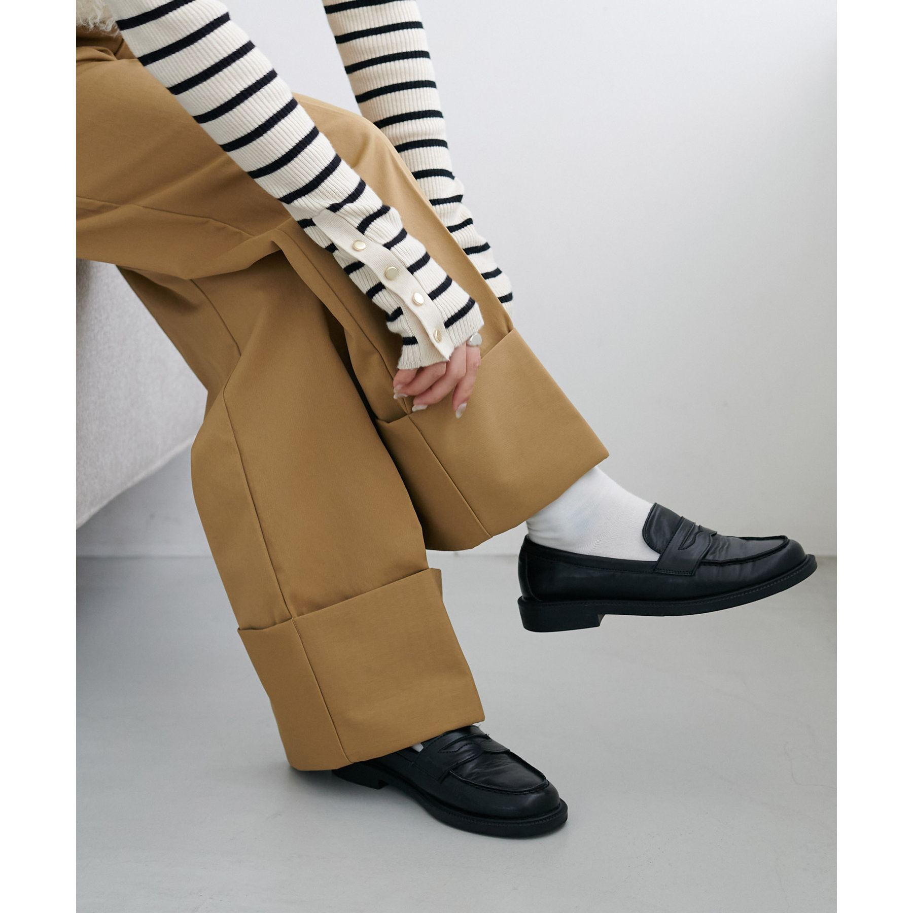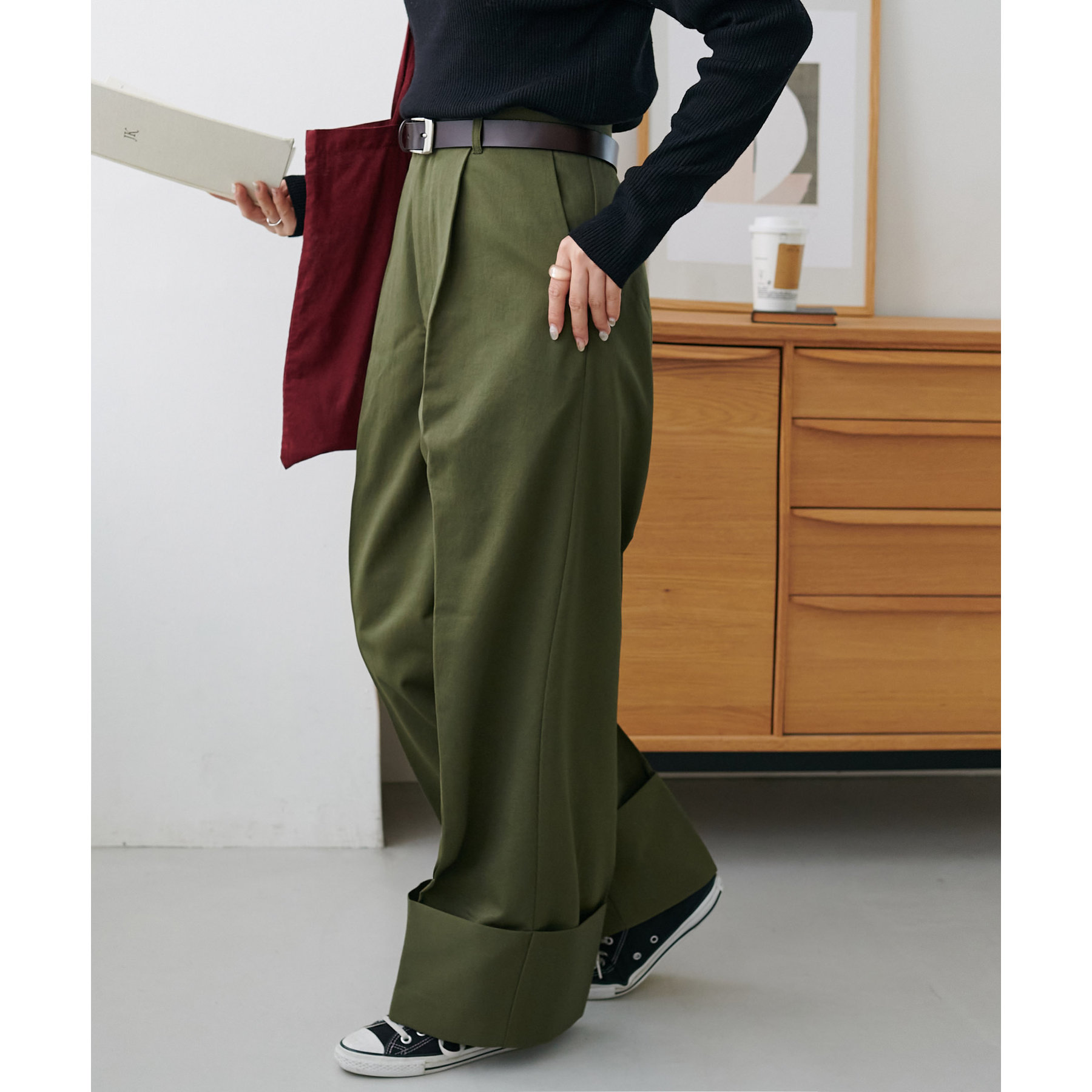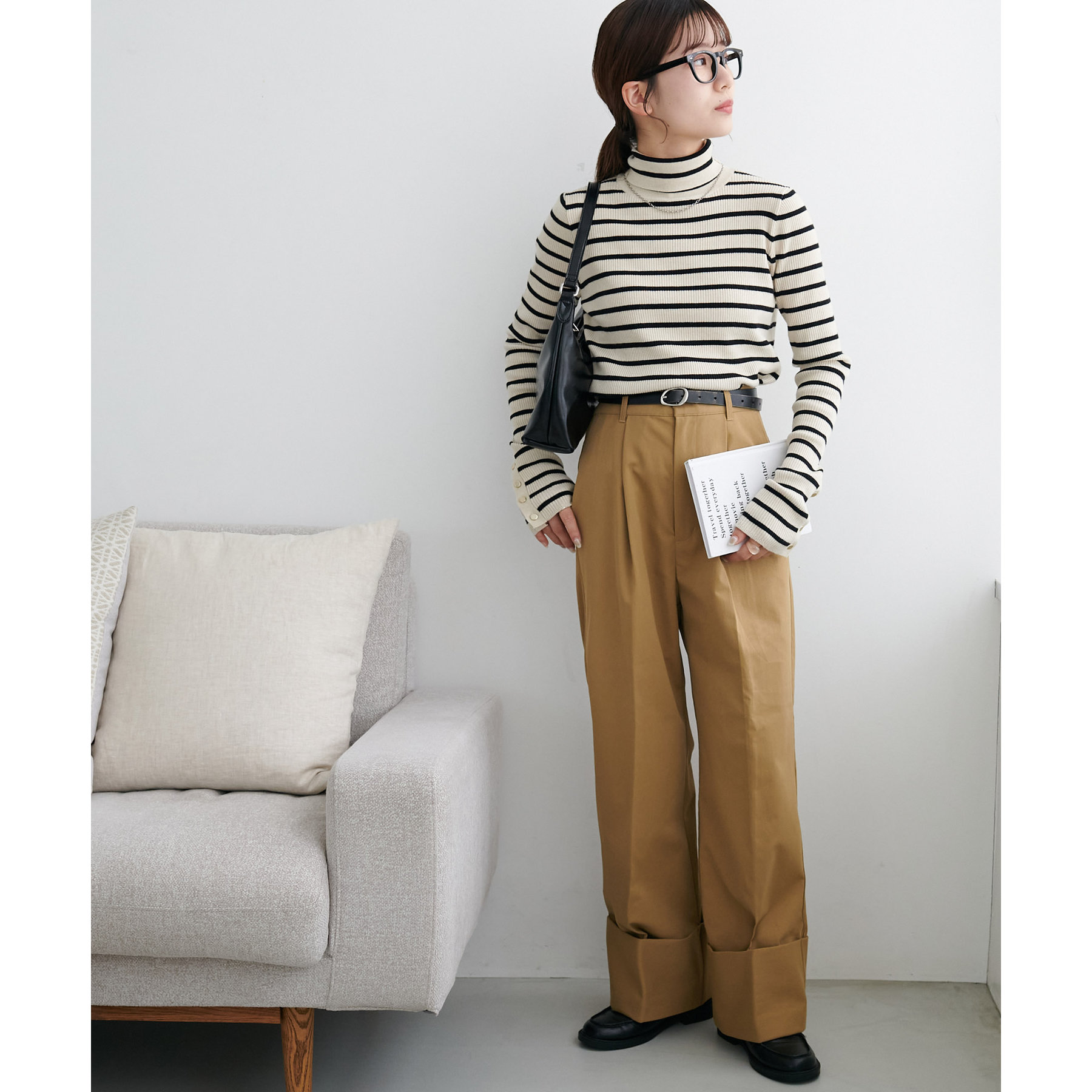 コーディネートのポイントになるロールアップチノパンツ