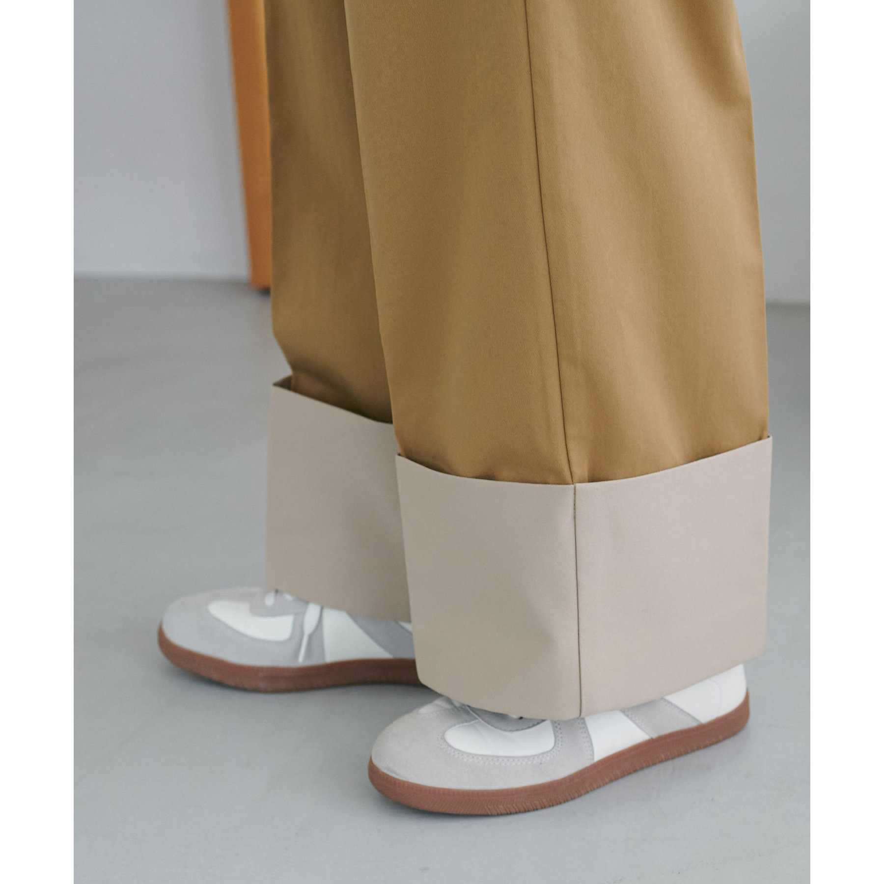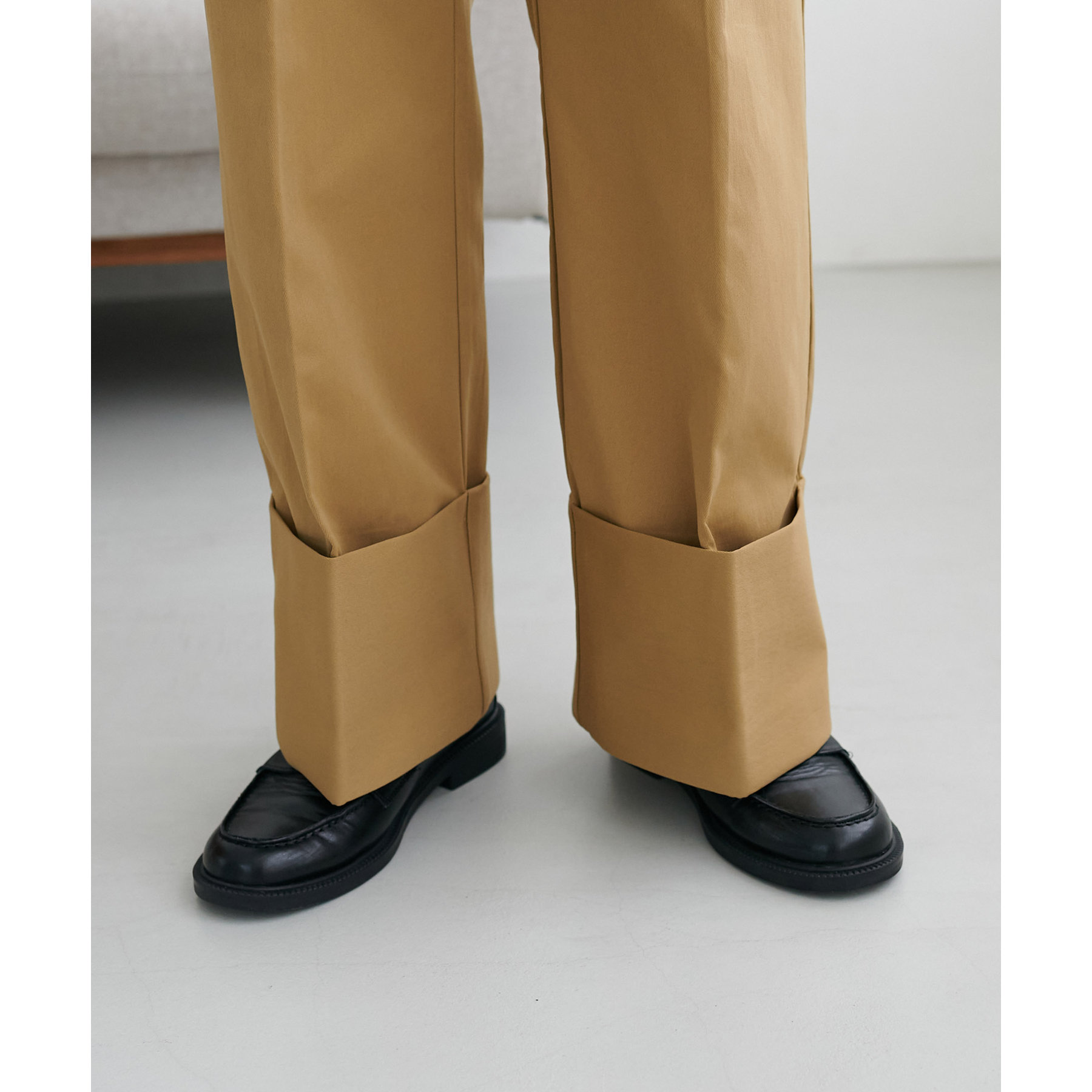 トレンド感溢れるロールアップデザインが特徴的なチノパンツ。