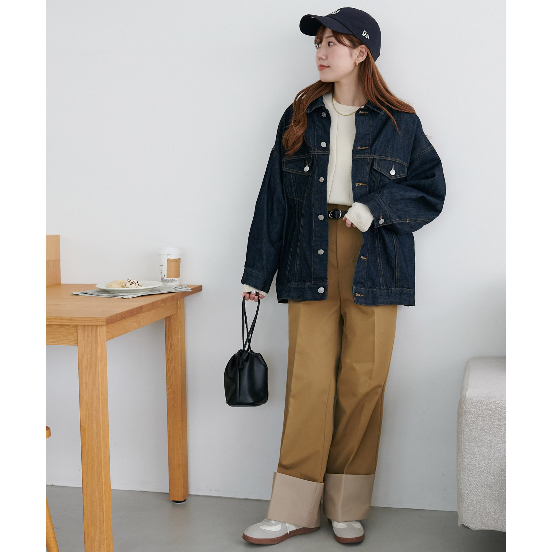 ・160cmスタッフ(Mサイズ着用):程よいワイド感で着心地も抜群!ヒップにもゆとりがあるのでボディラインを拾いにくく、インスタイルも気にせずできます♪