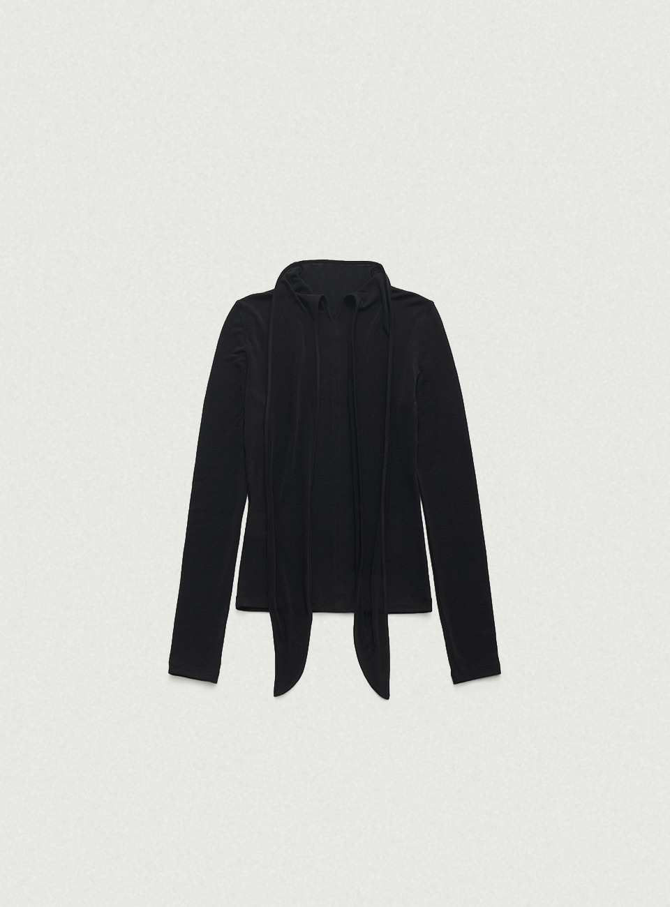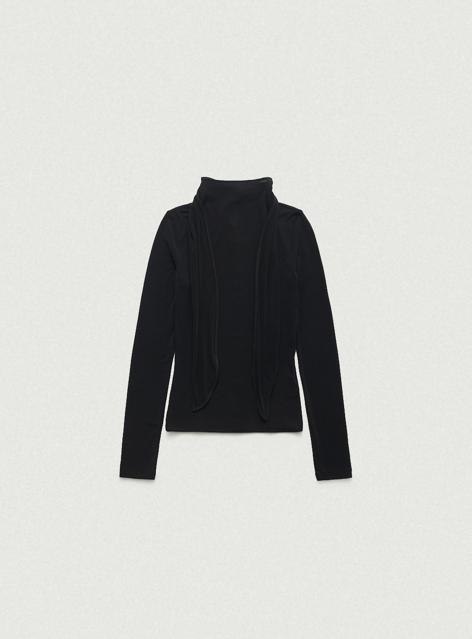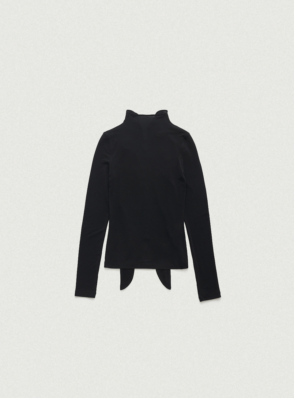ハイネック、ボディとタイが繋がったスリムフィットのTシャツタイプ。