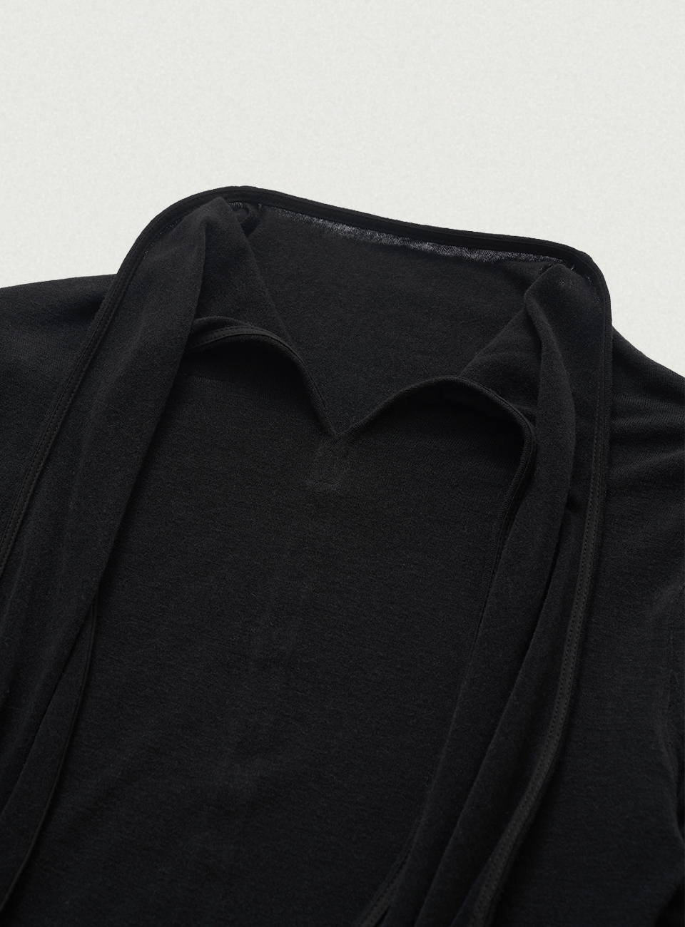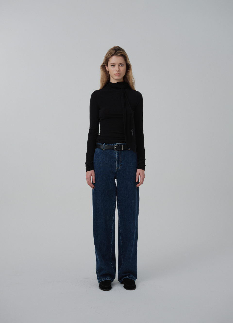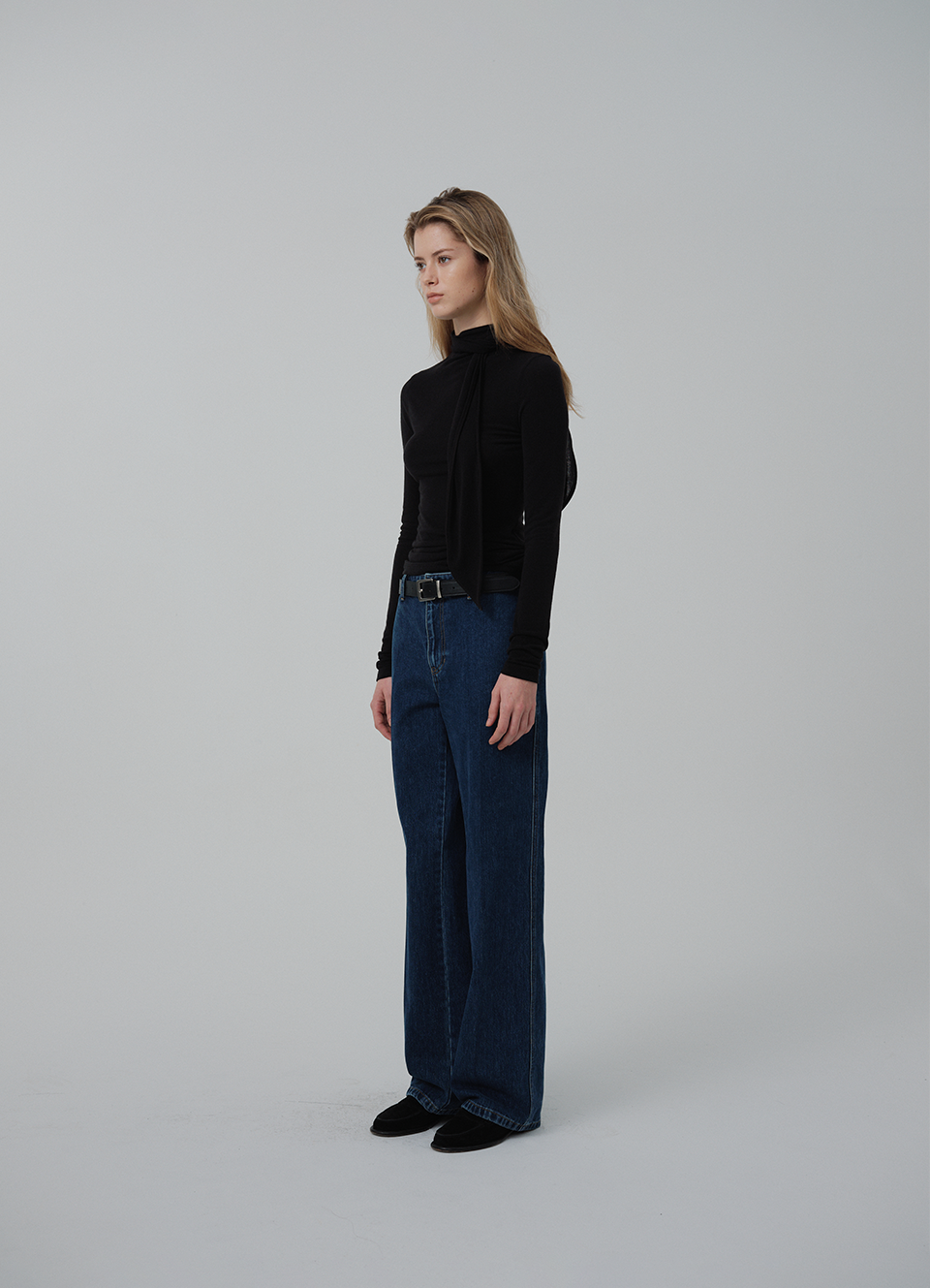 ハイネック、ボディとタイが繋がったスリムフィットのTシャツタイプ。